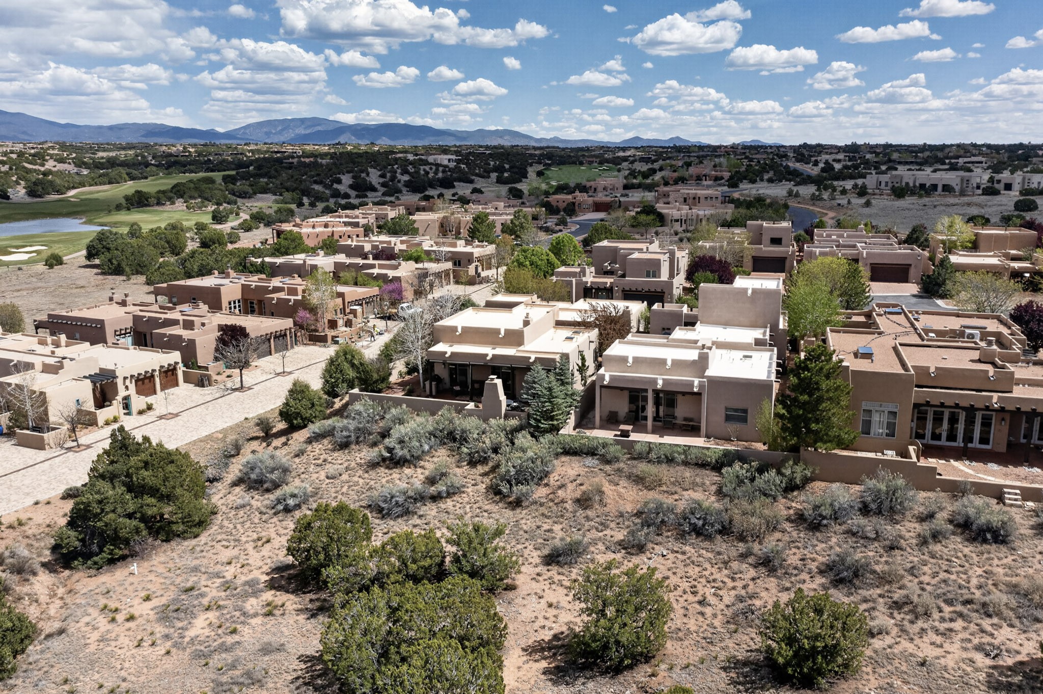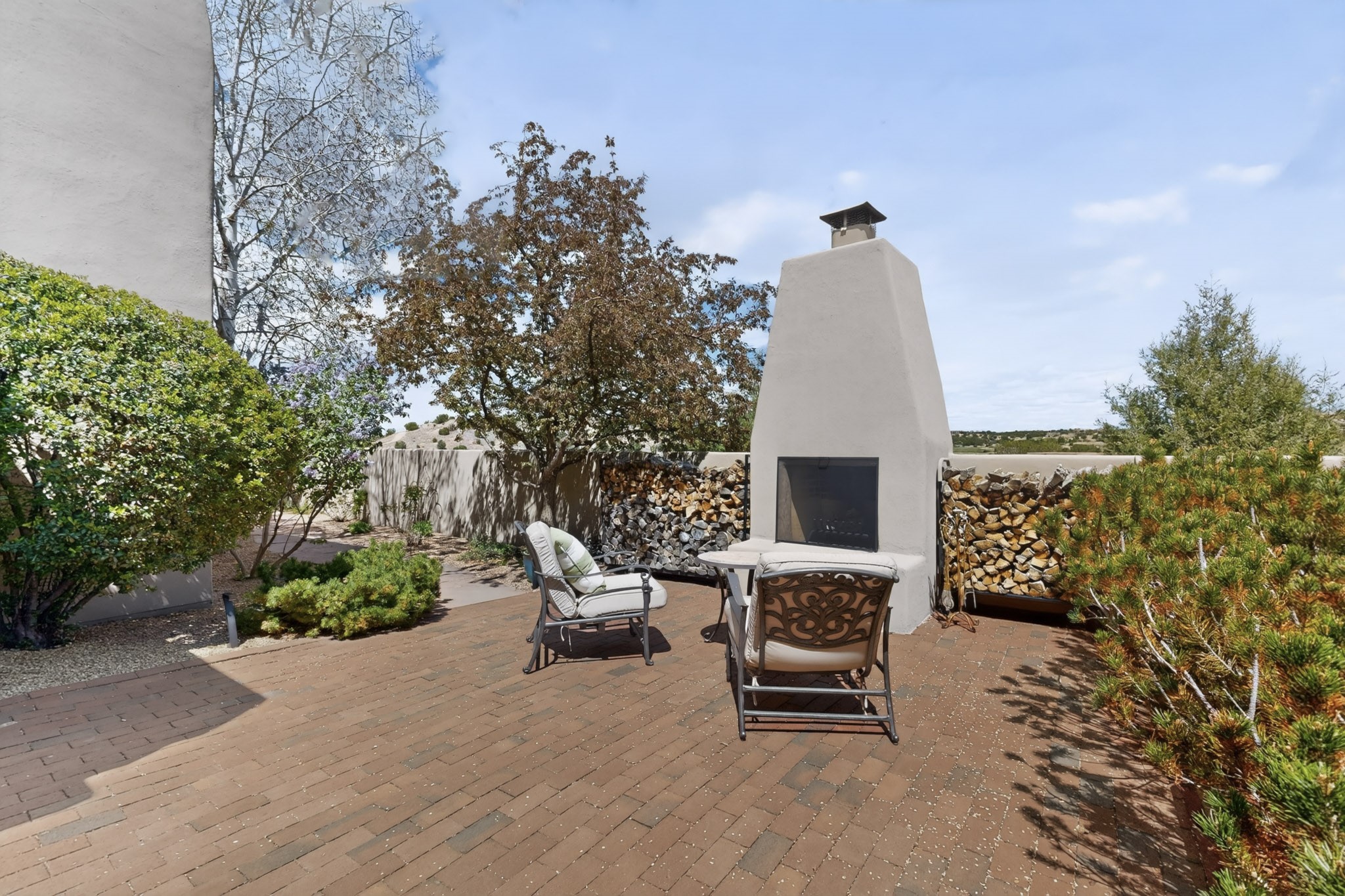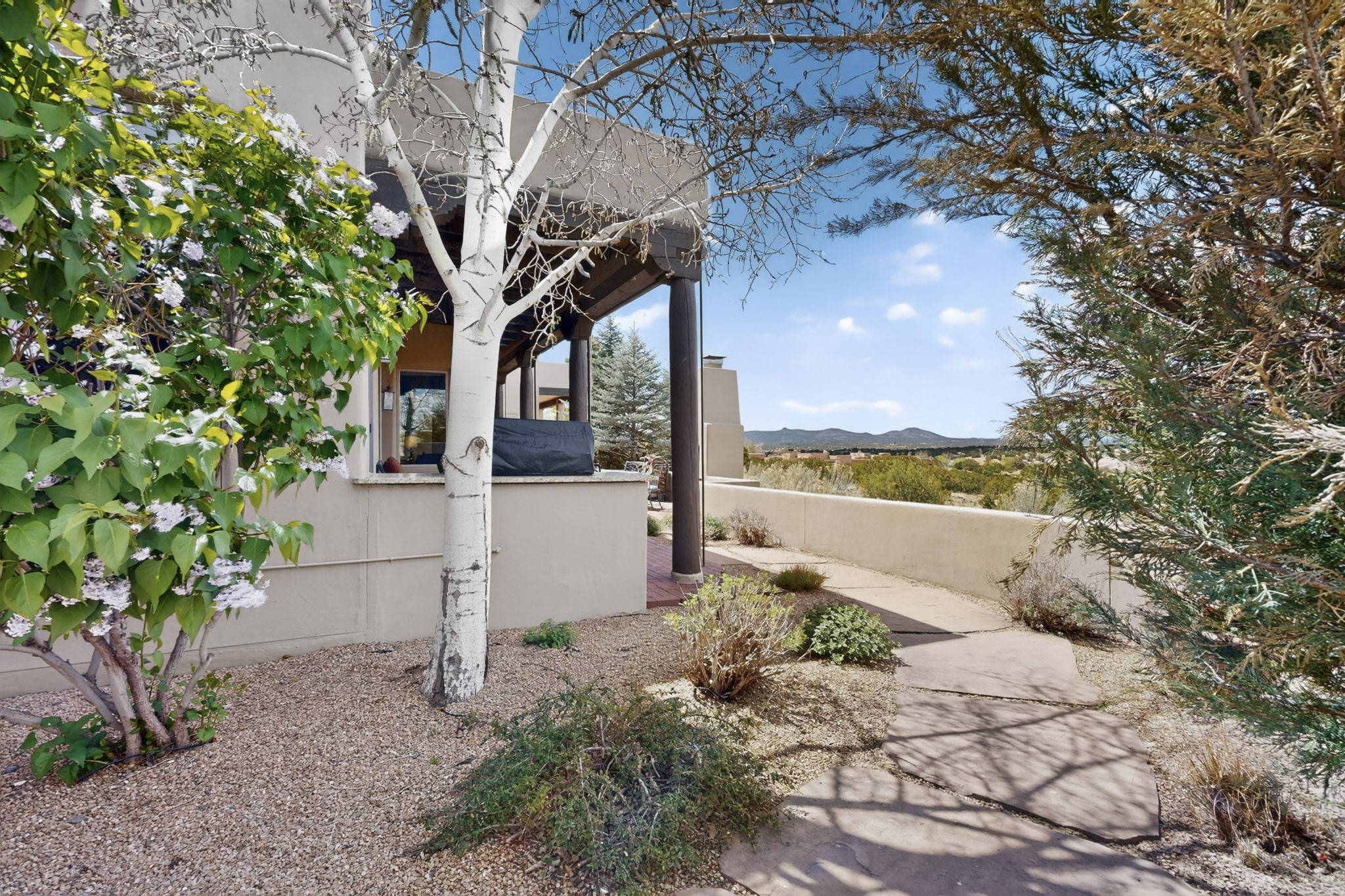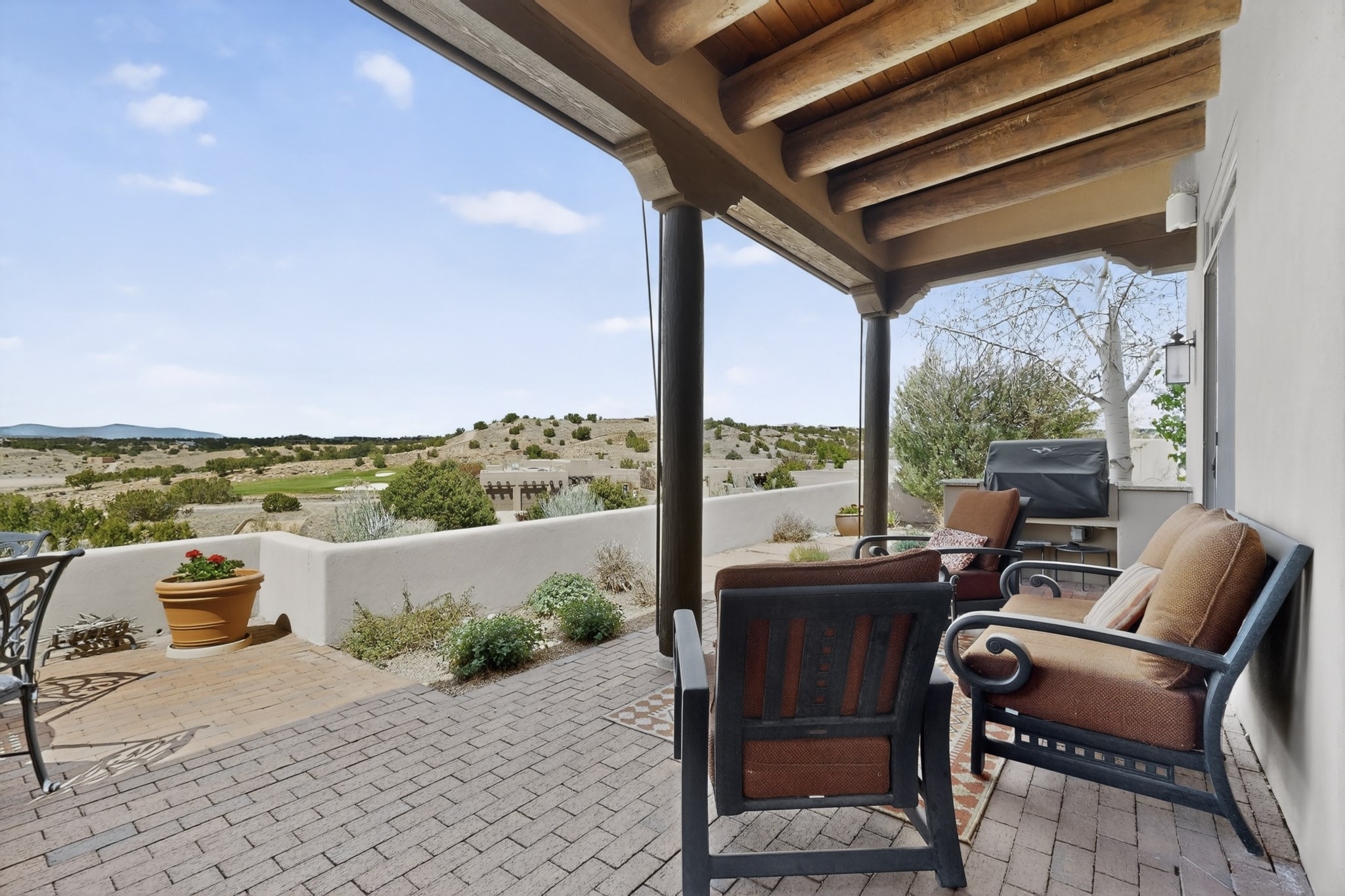 Experience refined living in this stunning three bedroom three bath residence with a private Casita perfectly positioned along the golf course at Las Campanas and showcasing sweeping elevated views of the Jemez and Sangre de Cristo mountains. Designed for both comfort and elegance this home features beautiful outdoor living spaces with classic brick flooring mature plants and trees with flagstone pathways and two outdoor wood-burning fireplaces creating the perfect setting for relaxing evenings or entertaining while taking in the breathtaking scenery. Enter through the striking double doors into a warm and inviting interior. The spacious primary suite offers a peaceful retreat with a walk in closet a generous en suite bath and a private patio ideal for enjoying tranquil surroundings. The open concept kitchen flows effortlessly into the dining and living areas where large windows frame the picturesque golf course views and fill the home with natural light. Recent upgrades add modern conveniences including new tankless water heaters, a new kitchen vent hood, epoxy flooring in the garage, instant hot water faucet at kitchen sink, and a new EV charger. This exceptional "Lock & Leave" Las Campanas property blends luxury, comfort, and spectacular views offering the perfect Santa Fe lifestyle both indoors and out.