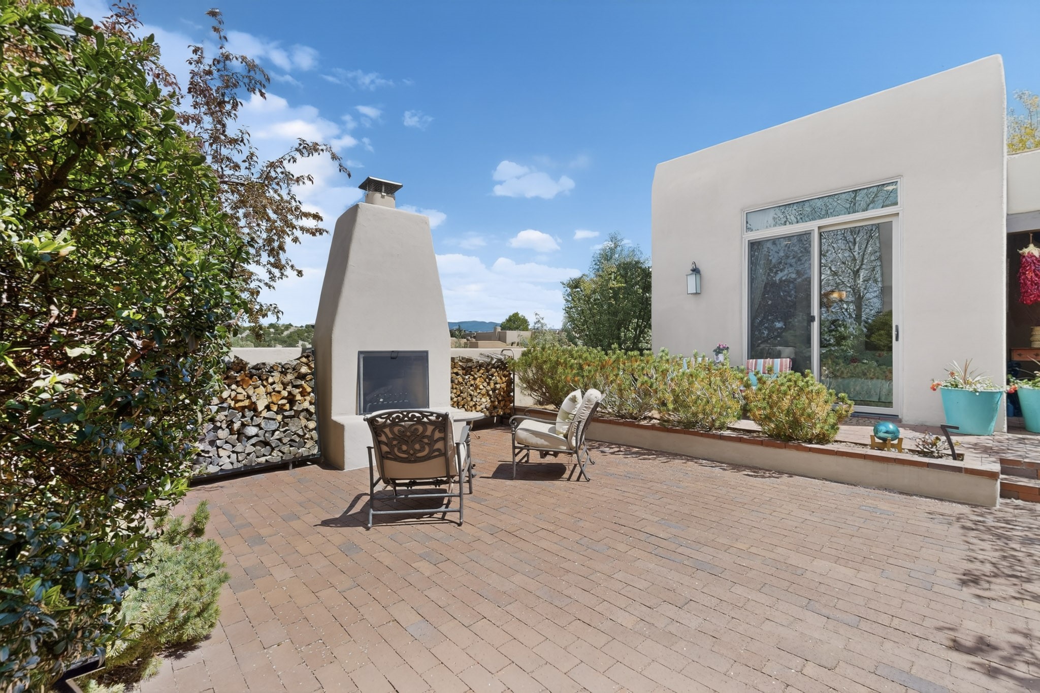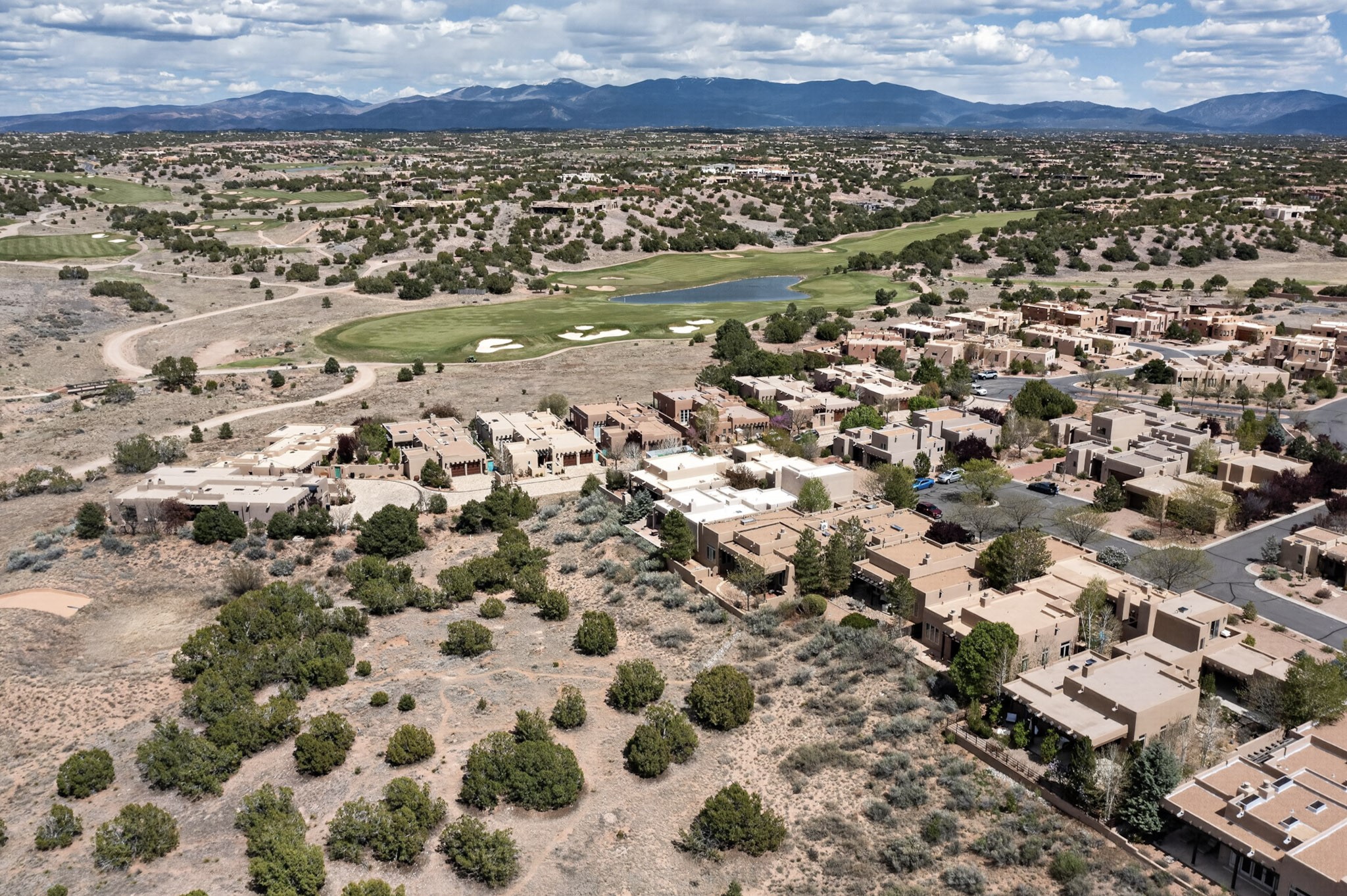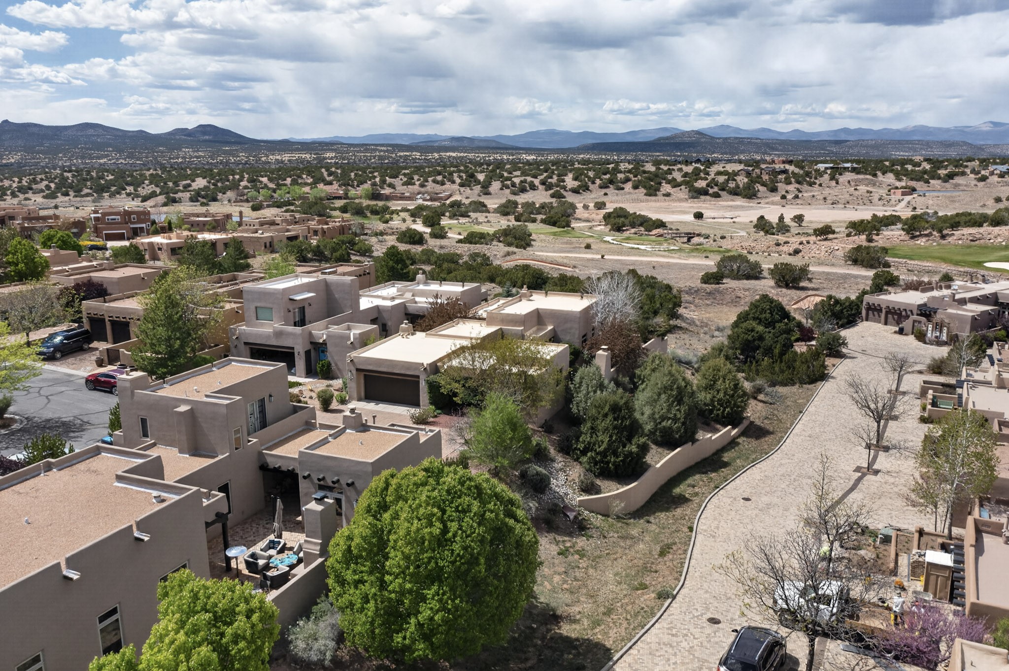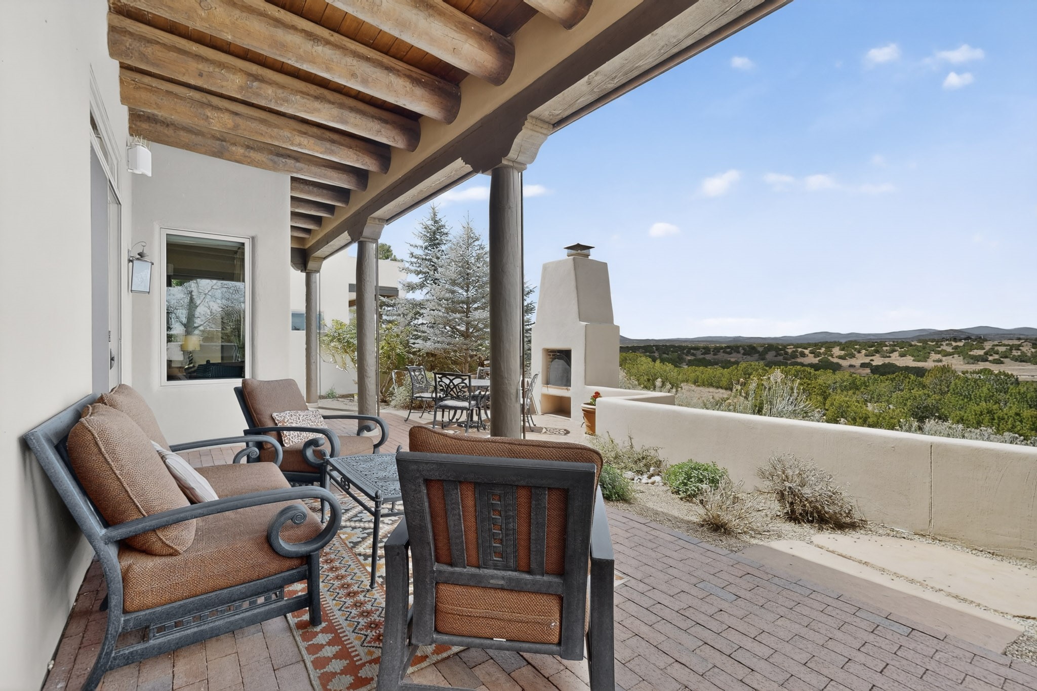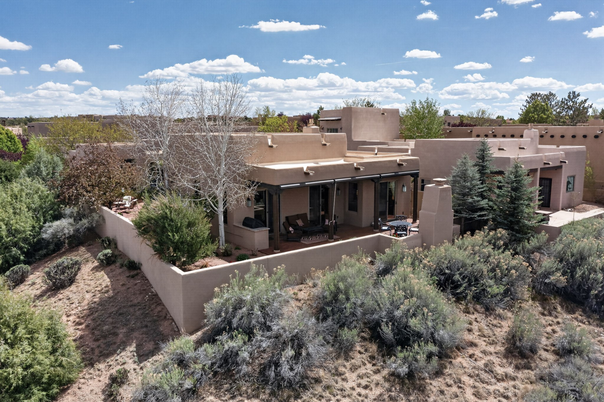 Experience refined living in this stunning three bedroom three bath residence with a private Casita perfectly positioned along the golf course at Las Campanas and showcasing sweeping elevated views of the Jemez and Sangre de Cristo mountains. Designed for both comfort and elegance this home features beautiful outdoor living spaces with classic brick flooring mature plants and trees with flagstone pathways and two outdoor wood-burning fireplaces creating the perfect setting for relaxing evenings or entertaining while taking in the breathtaking scenery. Enter through the striking double doors into a warm and inviting interior. The spacious primary suite offers a peaceful retreat with a walk in closet a generous en suite bath and a private patio ideal for enjoying tranquil surroundings. The open concept kitchen flows effortlessly into the dining and living areas where large windows frame the picturesque golf course views and fill the home with natural light. Recent upgrades add modern conveniences including new tankless water heaters, a new kitchen vent hood, epoxy flooring in the garage, instant hot water faucet at kitchen sink, and a new EV charger. This exceptional "Lock & Leave" Las Campanas property blends luxury, comfort, and spectacular views offering the perfect Santa Fe lifestyle both indoors and out.