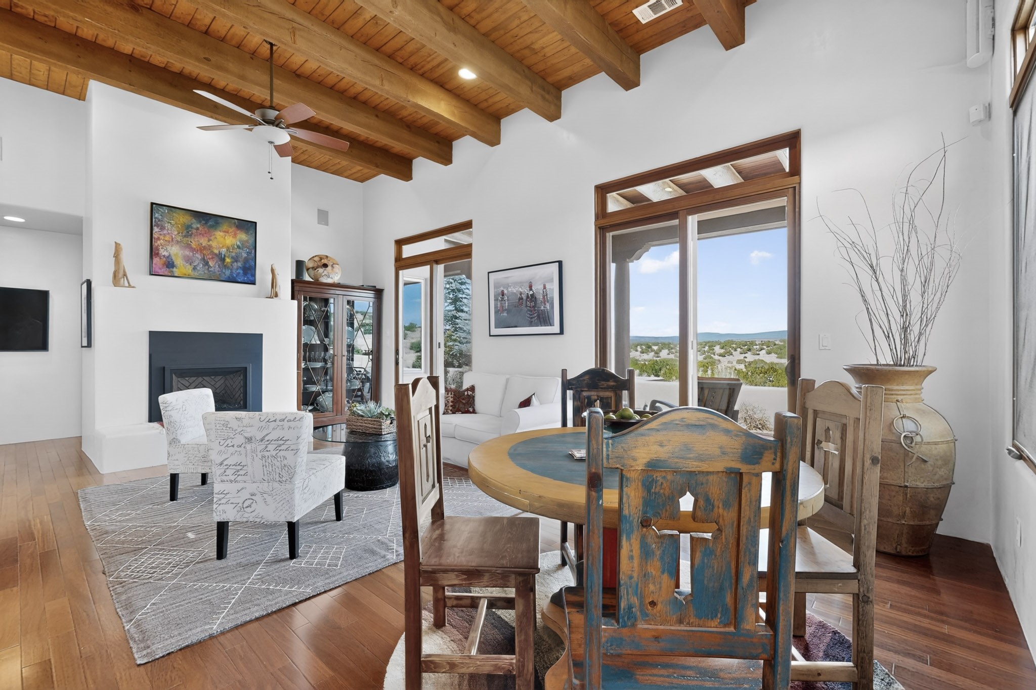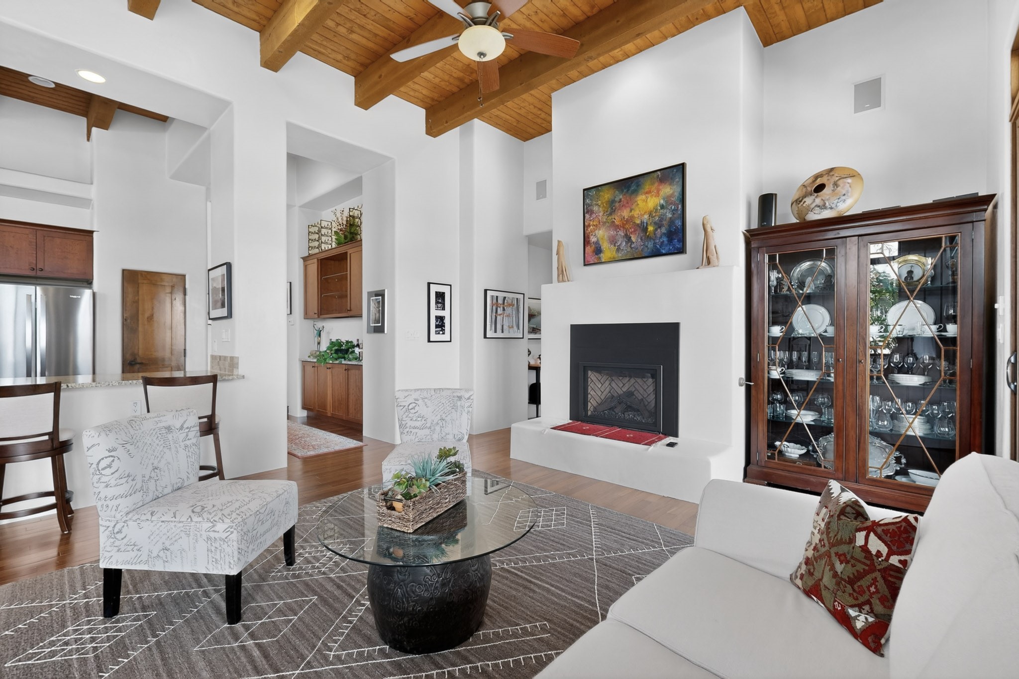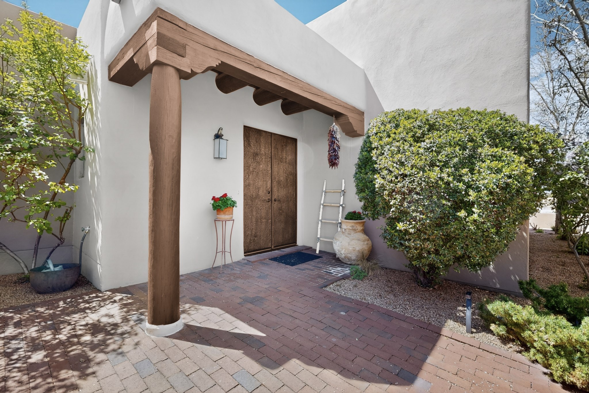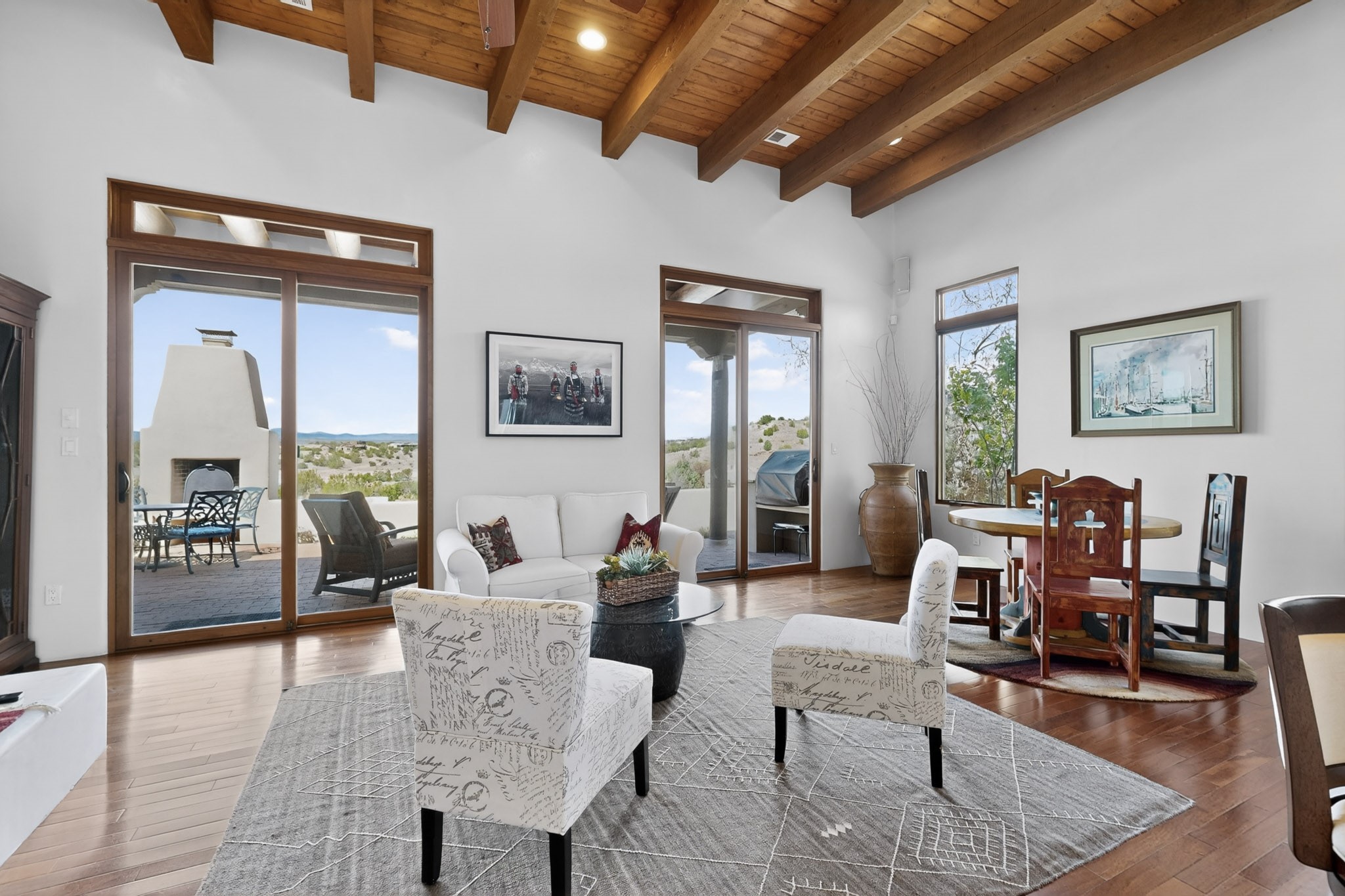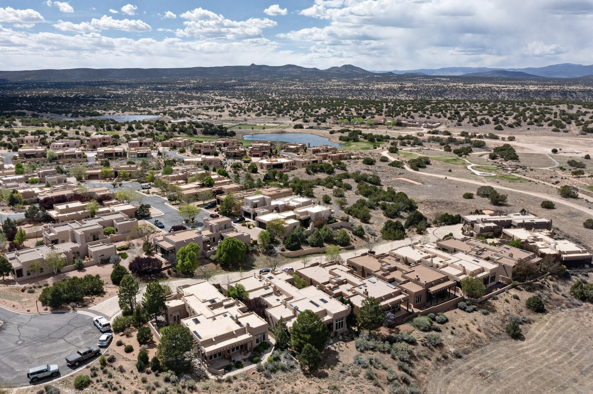 Experience refined living in this stunning three bedroom three bath residence with a private Casita perfectly positioned along the golf course at Las Campanas and showcasing sweeping elevated views of the Jemez and Sangre de Cristo mountains. Designed for both comfort and elegance this home features beautiful outdoor living spaces with classic brick flooring mature plants and trees with flagstone pathways and two outdoor wood-burning fireplaces creating the perfect setting for relaxing evenings or entertaining while taking in the breathtaking scenery. Enter through the striking double doors into a warm and inviting interior. The spacious primary suite offers a peaceful retreat with a walk in closet a generous en suite bath and a private patio ideal for enjoying tranquil surroundings. The open concept kitchen flows effortlessly into the dining and living areas where large windows frame the picturesque golf course views and fill the home with natural light. Recent upgrades add modern conveniences including new tankless water heaters, a new kitchen vent hood, epoxy flooring in the garage, instant hot water faucet at kitchen sink, and a new EV charger. This exceptional "Lock & Leave" Las Campanas property blends luxury, comfort, and spectacular views offering the perfect Santa Fe lifestyle both indoors and out.