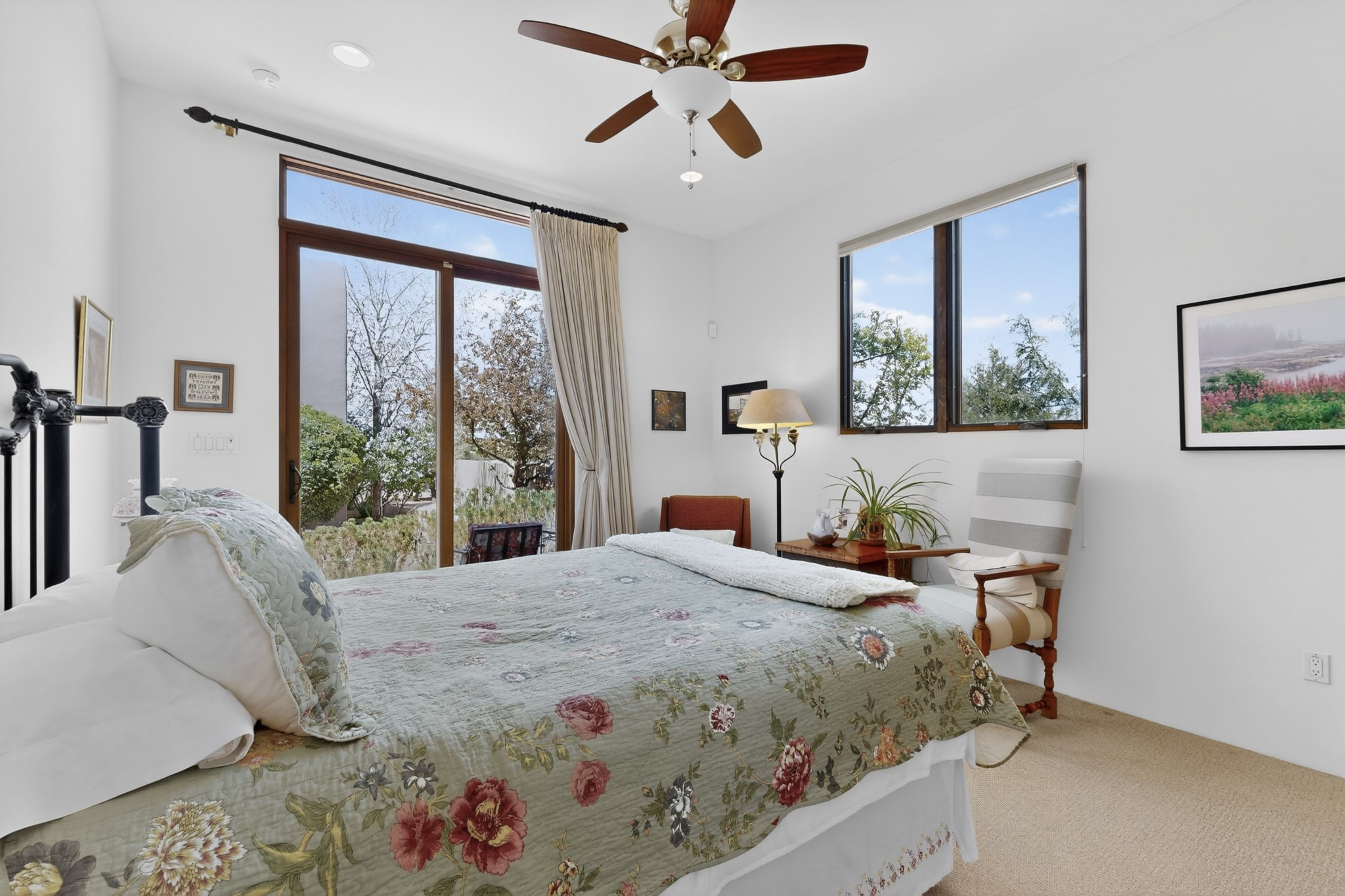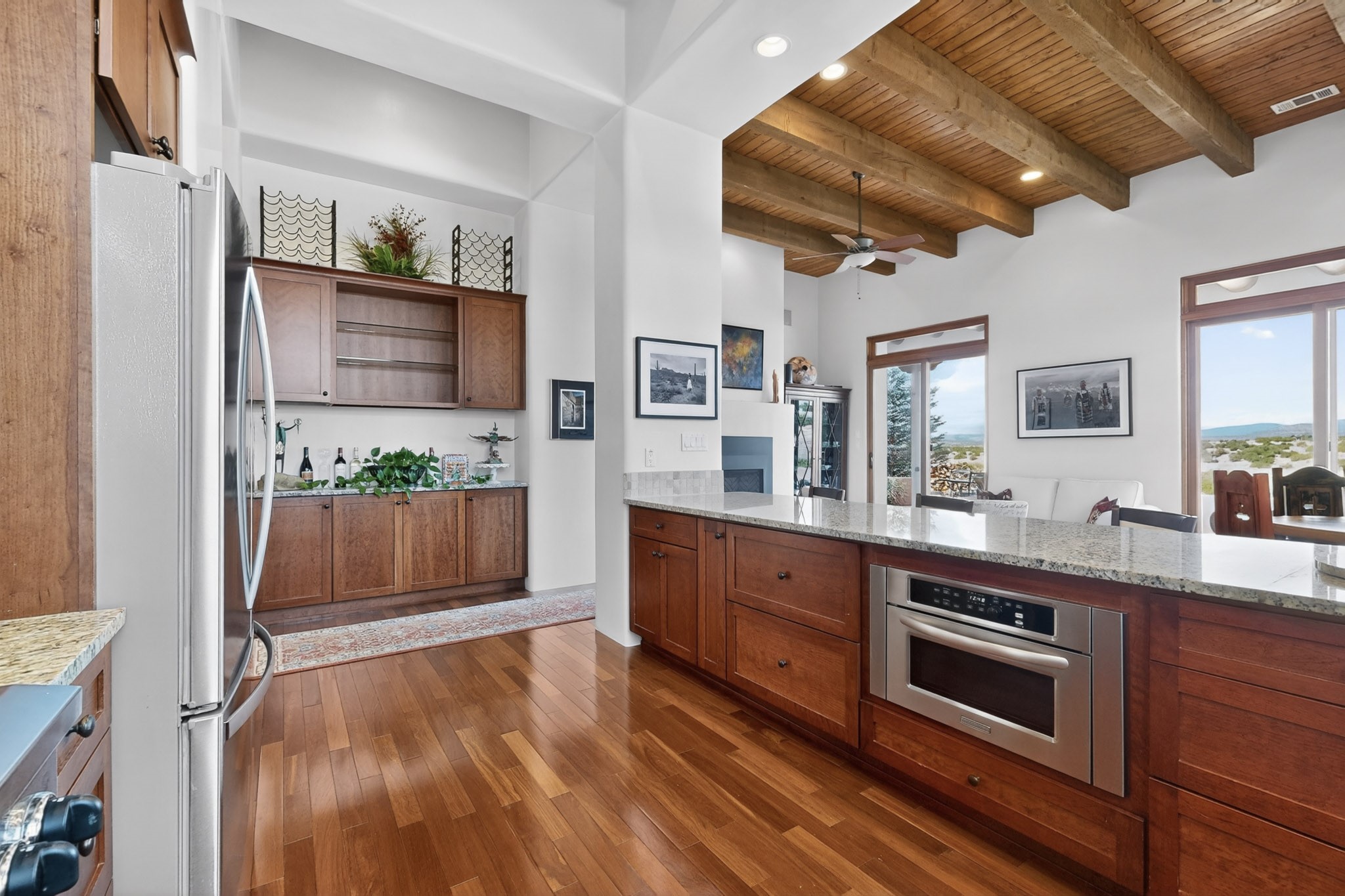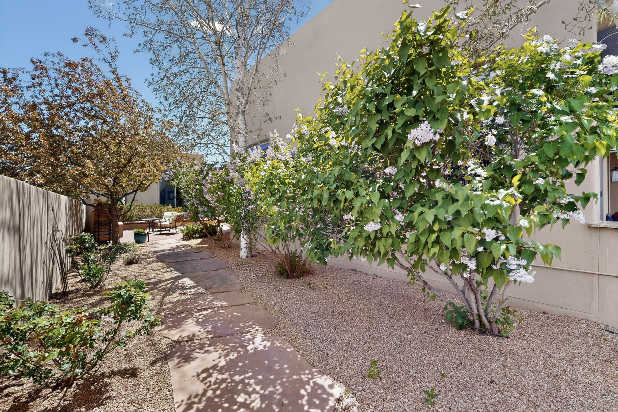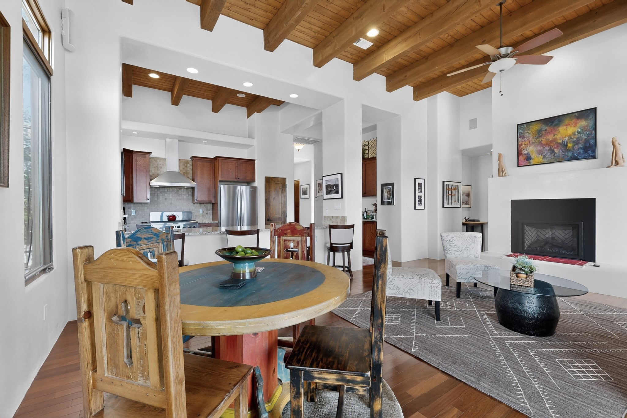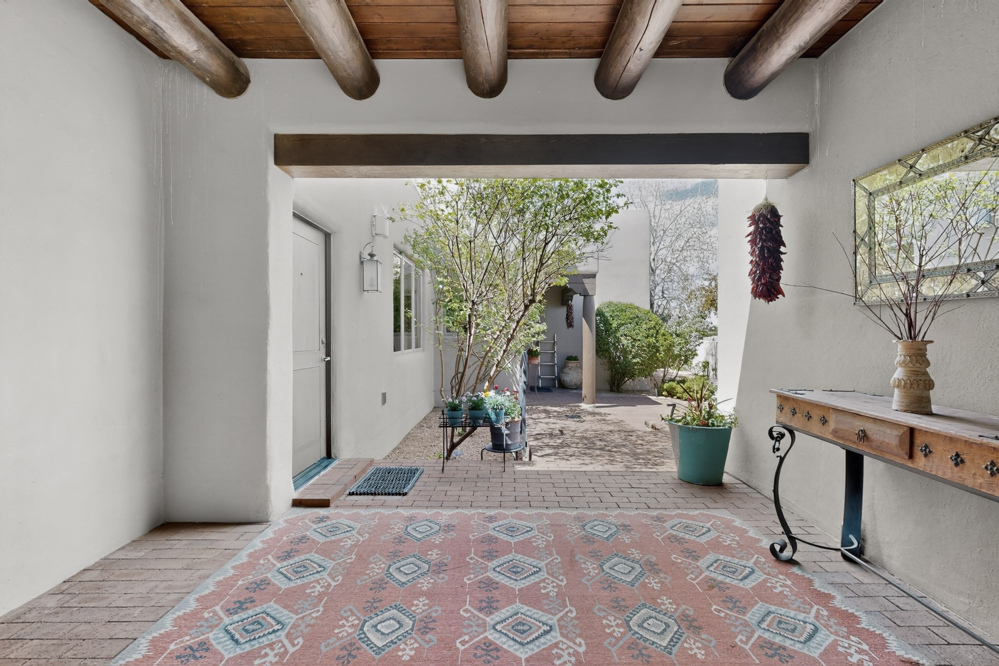 Experience refined living in this stunning three bedroom three bath residence with a private Casita perfectly positioned along the golf course at Las Campanas and showcasing sweeping elevated views of the Jemez and Sangre de Cristo mountains. Designed for both comfort and elegance this home features beautiful outdoor living spaces with classic brick flooring mature plants and trees with flagstone pathways and two outdoor wood-burning fireplaces creating the perfect setting for relaxing evenings or entertaining while taking in the breathtaking scenery. Enter through the striking double doors into a warm and inviting interior. The spacious primary suite offers a peaceful retreat with a walk in closet a generous en suite bath and a private patio ideal for enjoying tranquil surroundings. The open concept kitchen flows effortlessly into the dining and living areas where large windows frame the picturesque golf course views and fill the home with natural light. Recent upgrades add modern conveniences including new tankless water heaters, a new kitchen vent hood, epoxy flooring in the garage, instant hot water faucet at kitchen sink, and a new EV charger. This exceptional "Lock & Leave" Las Campanas property blends luxury, comfort, and spectacular views offering the perfect Santa Fe lifestyle both indoors and out.