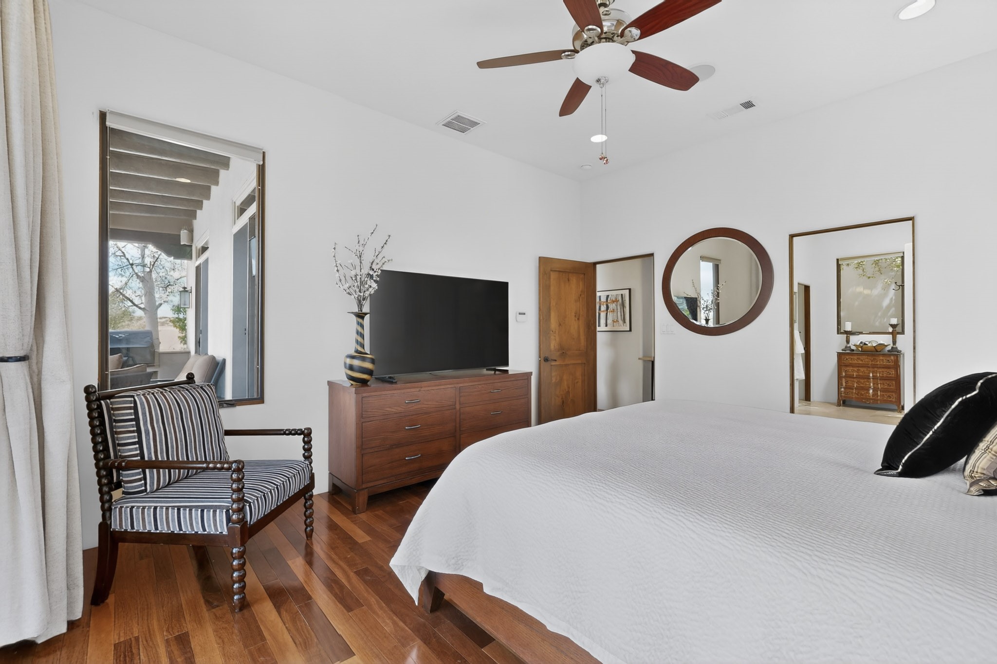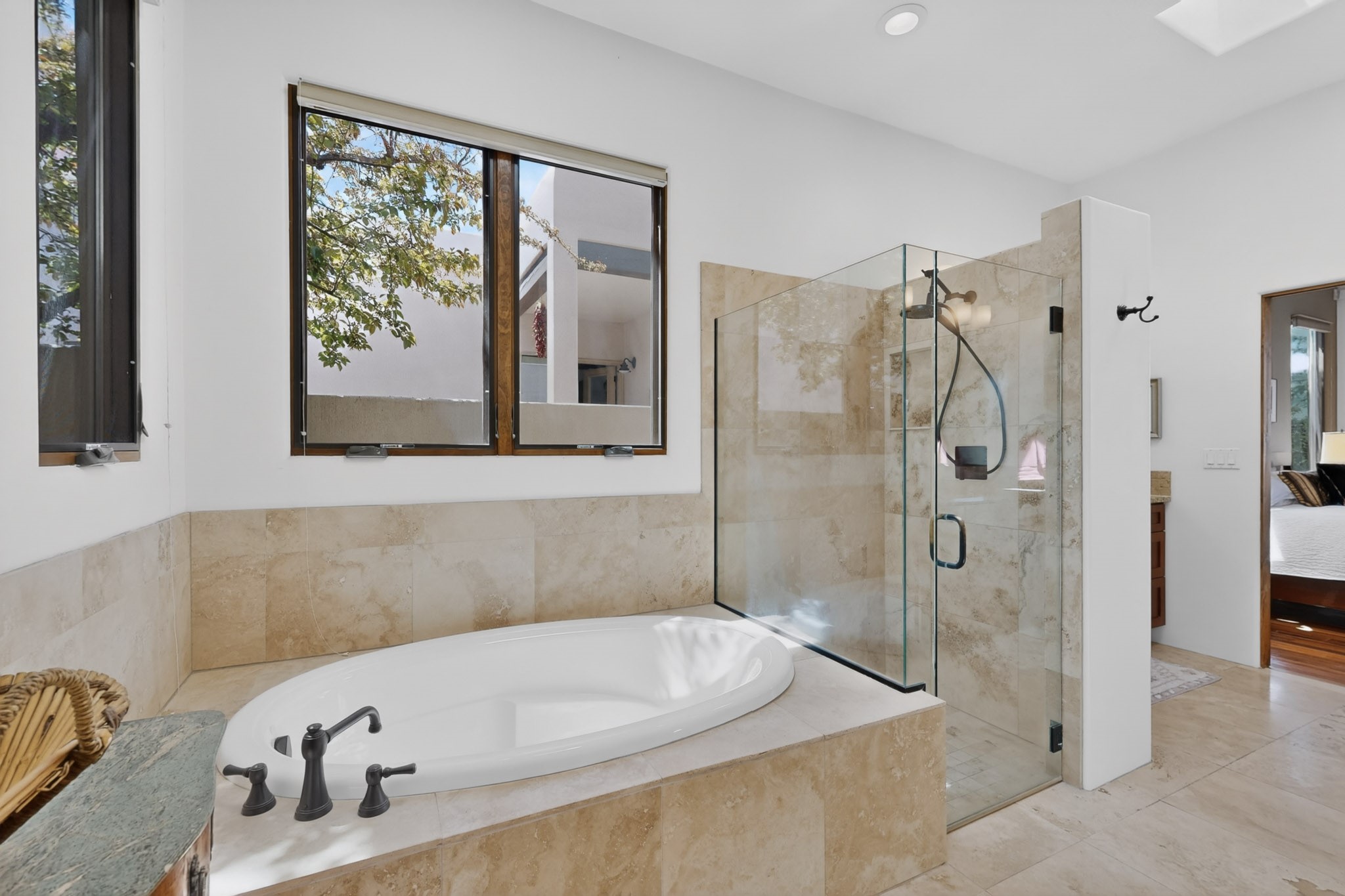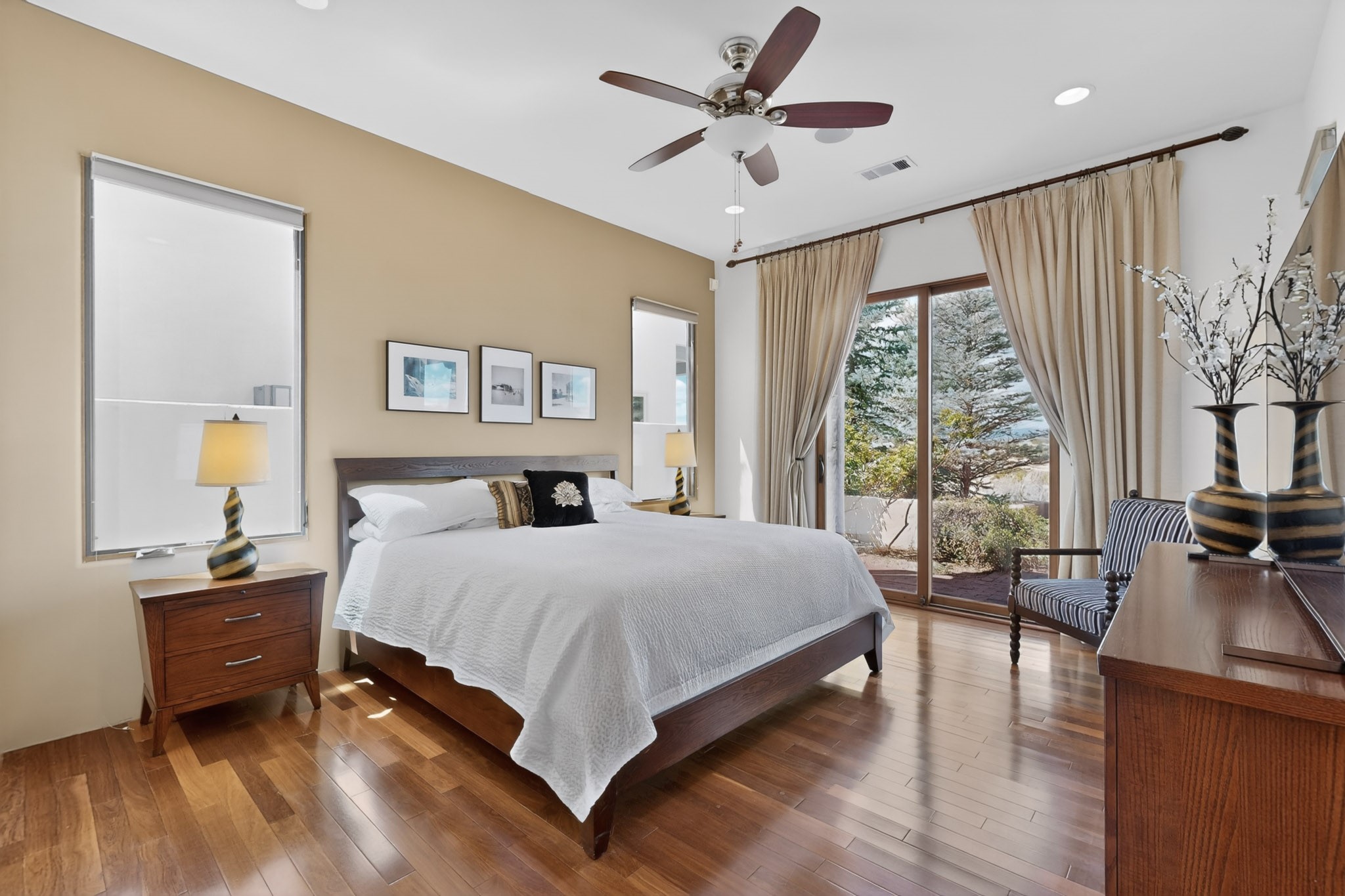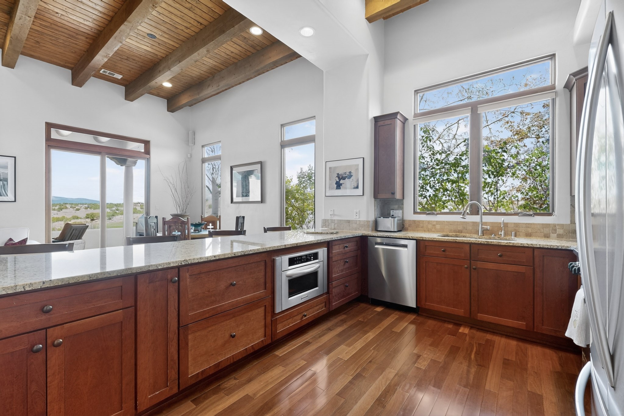 Experience refined living in this stunning three bedroom three bath residence with a private Casita perfectly positioned along the golf course at Las Campanas and showcasing sweeping elevated views of the Jemez and Sangre de Cristo mountains. Designed for both comfort and elegance this home features beautiful outdoor living spaces with classic brick flooring mature plants and trees with flagstone pathways and two outdoor wood-burning fireplaces creating the perfect setting for relaxing evenings or entertaining while taking in the breathtaking scenery. Enter through the striking double doors into a warm and inviting interior. The spacious primary suite offers a peaceful retreat with a walk in closet a generous en suite bath and a private patio ideal for enjoying tranquil surroundings. The open concept kitchen flows effortlessly into the dining and living areas where large windows frame the picturesque golf course views and fill the home with natural light. Recent upgrades add modern conveniences including new tankless water heaters, a new kitchen vent hood, epoxy flooring in the garage, instant hot water faucet at kitchen sink, and a new EV charger. This exceptional "Lock & Leave" Las Campanas property blends luxury, comfort, and spectacular views offering the perfect Santa Fe lifestyle both indoors and out.