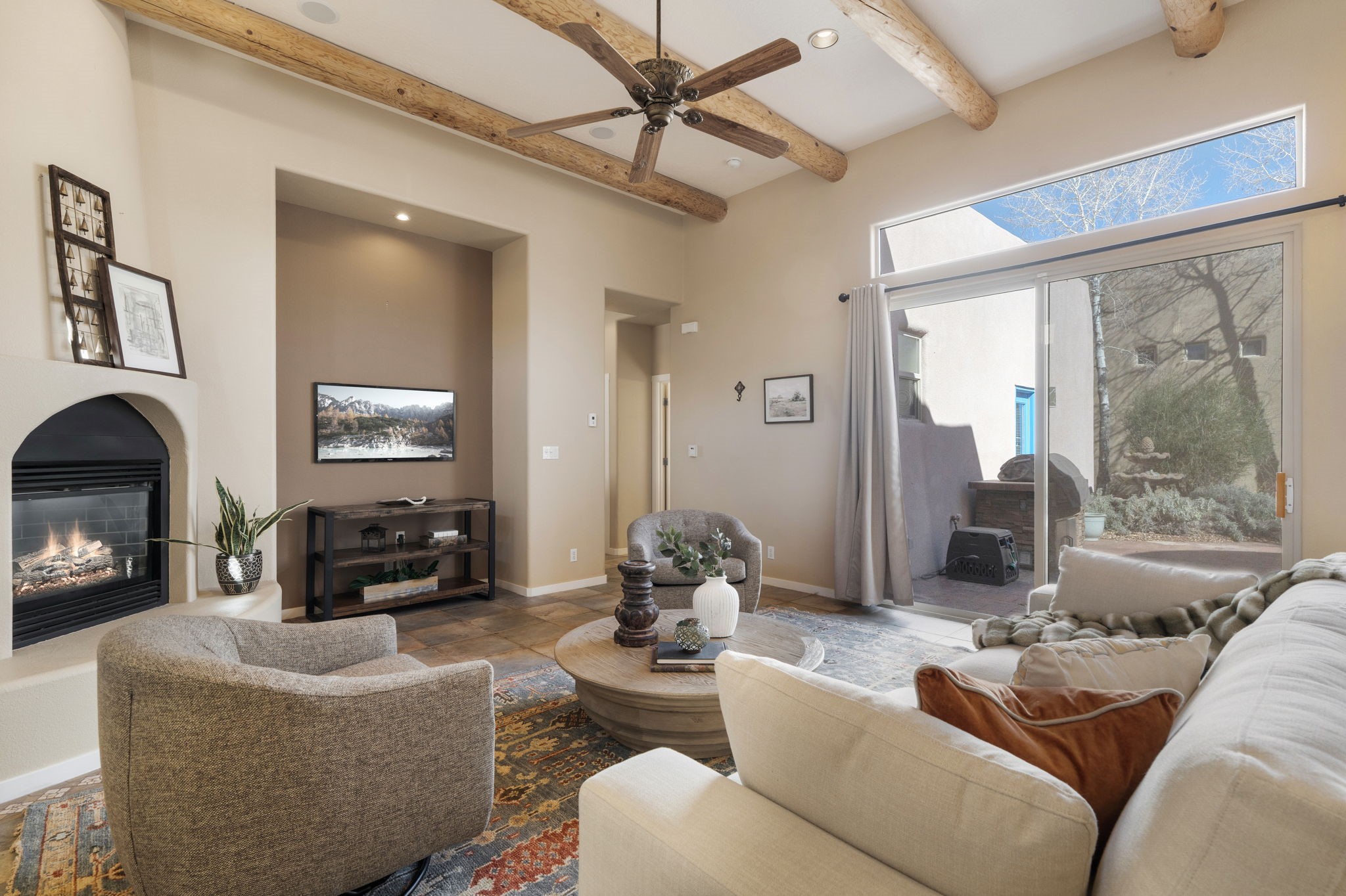 Seller financing available for this gorgeous cozy single-story home in desirable Rancho Viejo, just a couple homes from a park. Three bedrooms, an office, and a bonus room for exercise or play. The home surrounds a private courtyard, accessible from the great room or the primary suite, with a bubbling fountain for serenity. The circular dining room adds sophistication to entertaining, and the private master suite is truly a retreat. A built-in Murphy bed is so efficient in one of the guest bedrooms. Open floor plan with upgraded cabinetry, granite countertops, and stainless appliances. Enjoy a glass of wine in front of your custom fireplace. Take advantage of the paved walking trails, parks, and community amenities. Many upgrades: Roof (2024), stucco (2024-2025), high efficiency boiler (2024). Fresh paint, and new carpet (2026) in the primary suite. Radiant heat and tankless water heater! This home is bathed in natural light, and lends itself to display wonderful art. Move-in ready!