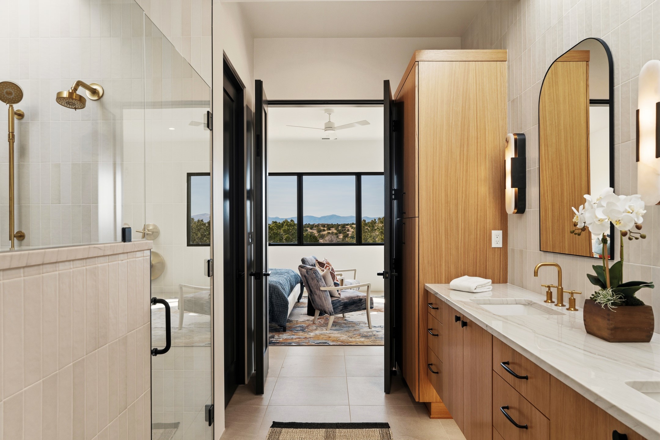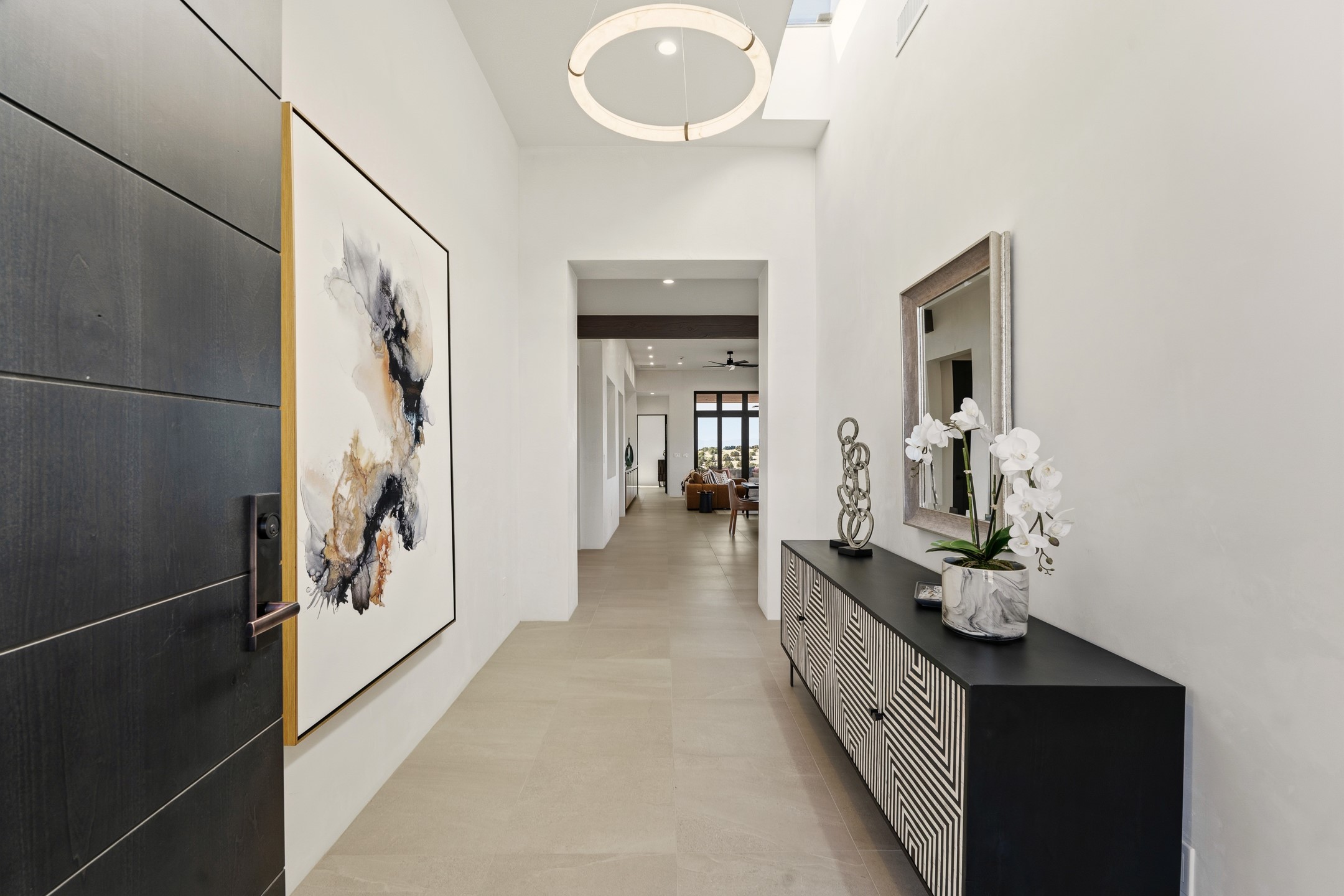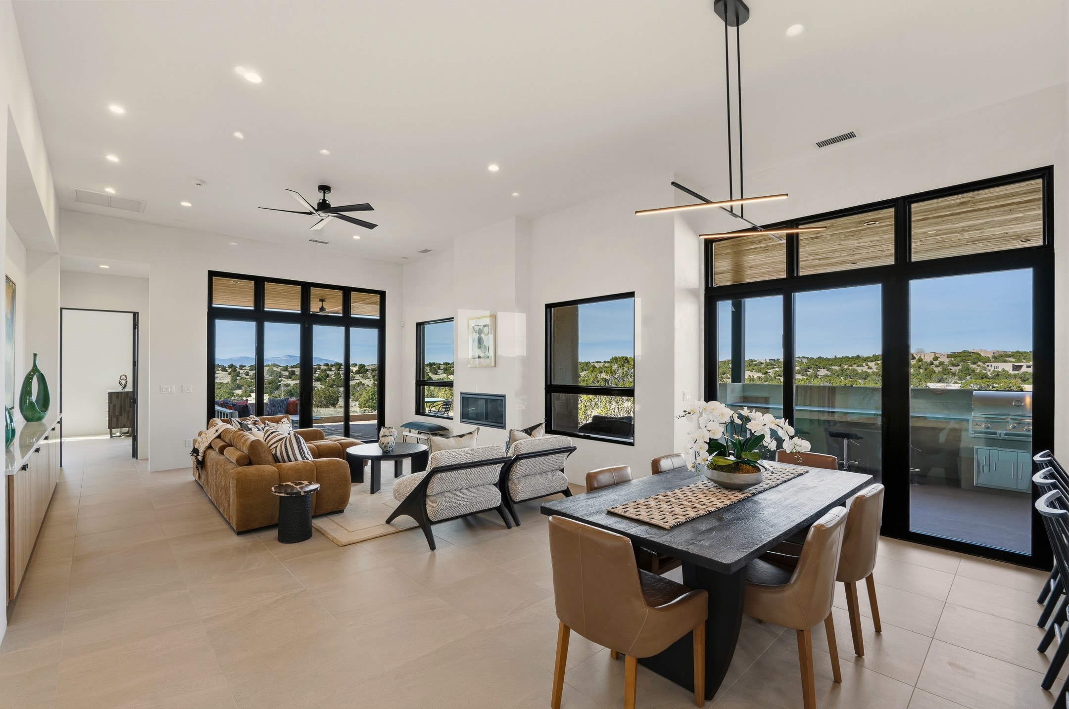 Newly completed and move-in ready, 9 Tierra Antigua (Lot #7) sits within one of Santa Fe's most thoughtfully conceived new communities -- a 44-acre high-desert enclave where more than half the land is preserved as open space, trails wind toward the horizon, and the Sangre de Cristo Mountains frame the morning sky. With homes designed by award-winning firms Five Ten Architecture and studioBOSE, Tierra Antigua honors Northern New Mexico's heritage with a modern eye for light, craft, and quiet luxury. Arete Homes of Santa Fe proudly presents the Stargazer Plan -- a 2,495-square-foot custom residence with 3 bedrooms and 3 baths (including two baths and a powder room). Contemporary Pueblo-style architecture blends seamlessly, capturing sweeping views of both the Jemez and Sangre de Cristo Mountains. A formal entry with expansive art walls and wall-wash skylights creates a gallery-like ambiance. Soaring vaulted ceilings in the great room flow into over 1,100 square feet of covered portal space -- perfect for year-round indoor-outdoor entertaining. The chef's kitchen features natural quartzite countertops, custom white oak cabinetry, a center island with wine refrigerator, and premium GE Monogram appliances including a 48" 6-burner range with griddle and built-in refrigerator. An outdoor kitchen with built-in grill completes the entertaining experience. Luxury finishes throughout include quartzite backsplash, designer sconces, large-format porcelain tile, custom bath tile accents, customized closet systems, and two fireplaces. Located just 15 minutes from downtown Santa Fe and minutes from the Club at Las Campanas, Tierra Antigua offers privacy, natural beauty, and cultural access. Only 23 homesites total. HOA dues are just $167/month. This is more than a home -- it's an entry point into a community designed for those who want to live within Santa Fe's spirit every day. Additional homesites available for custom builds or from five curated plans.