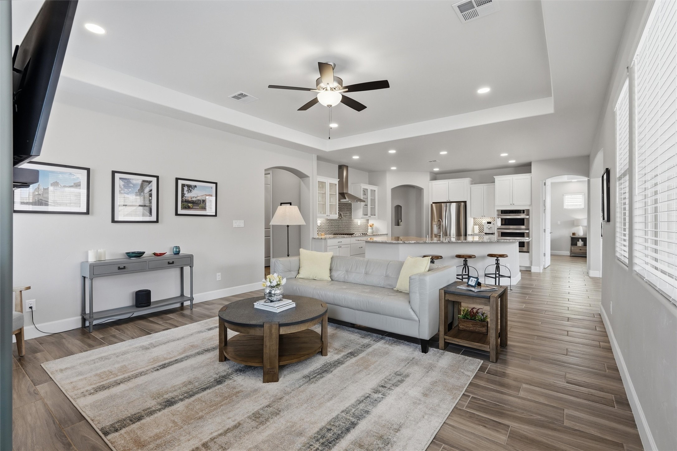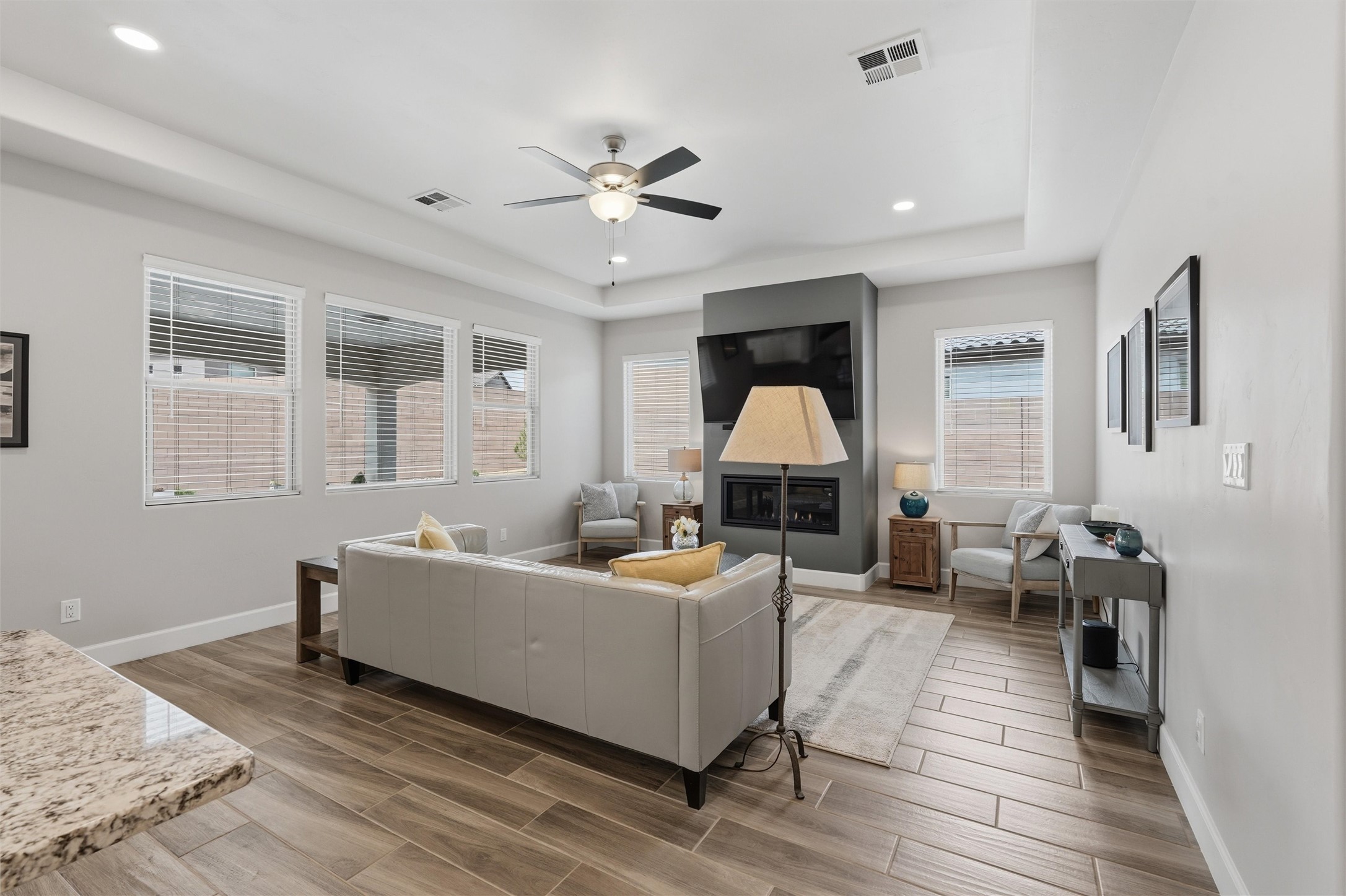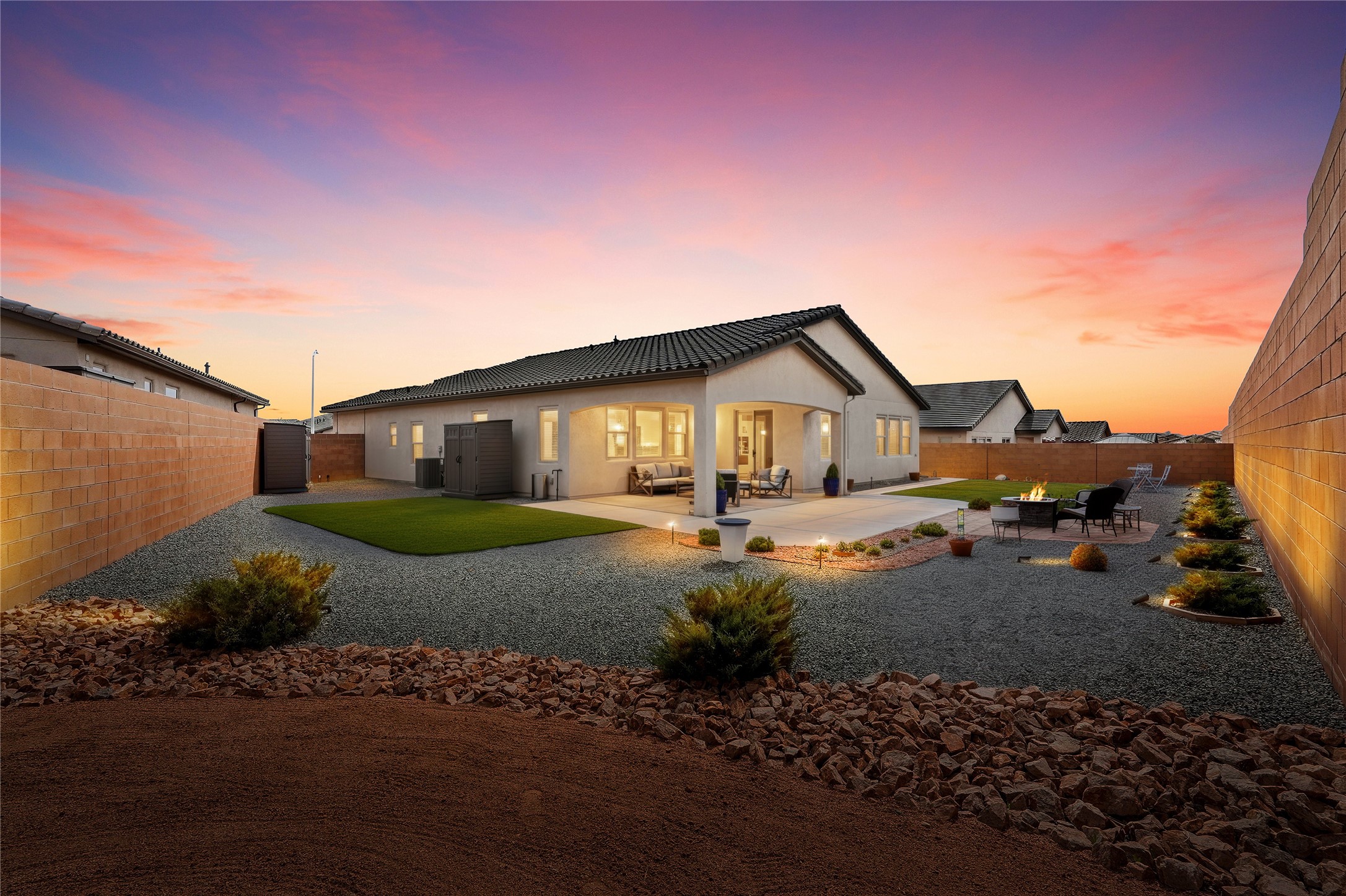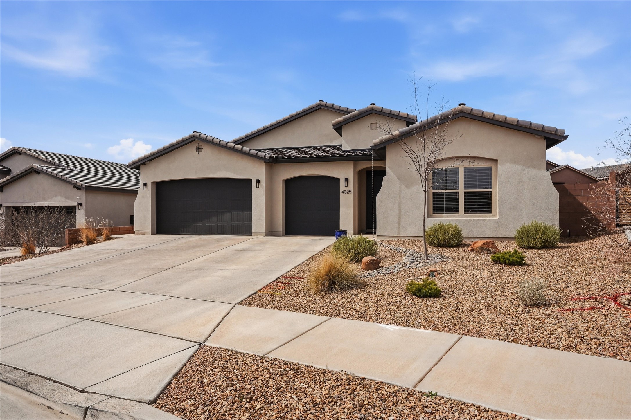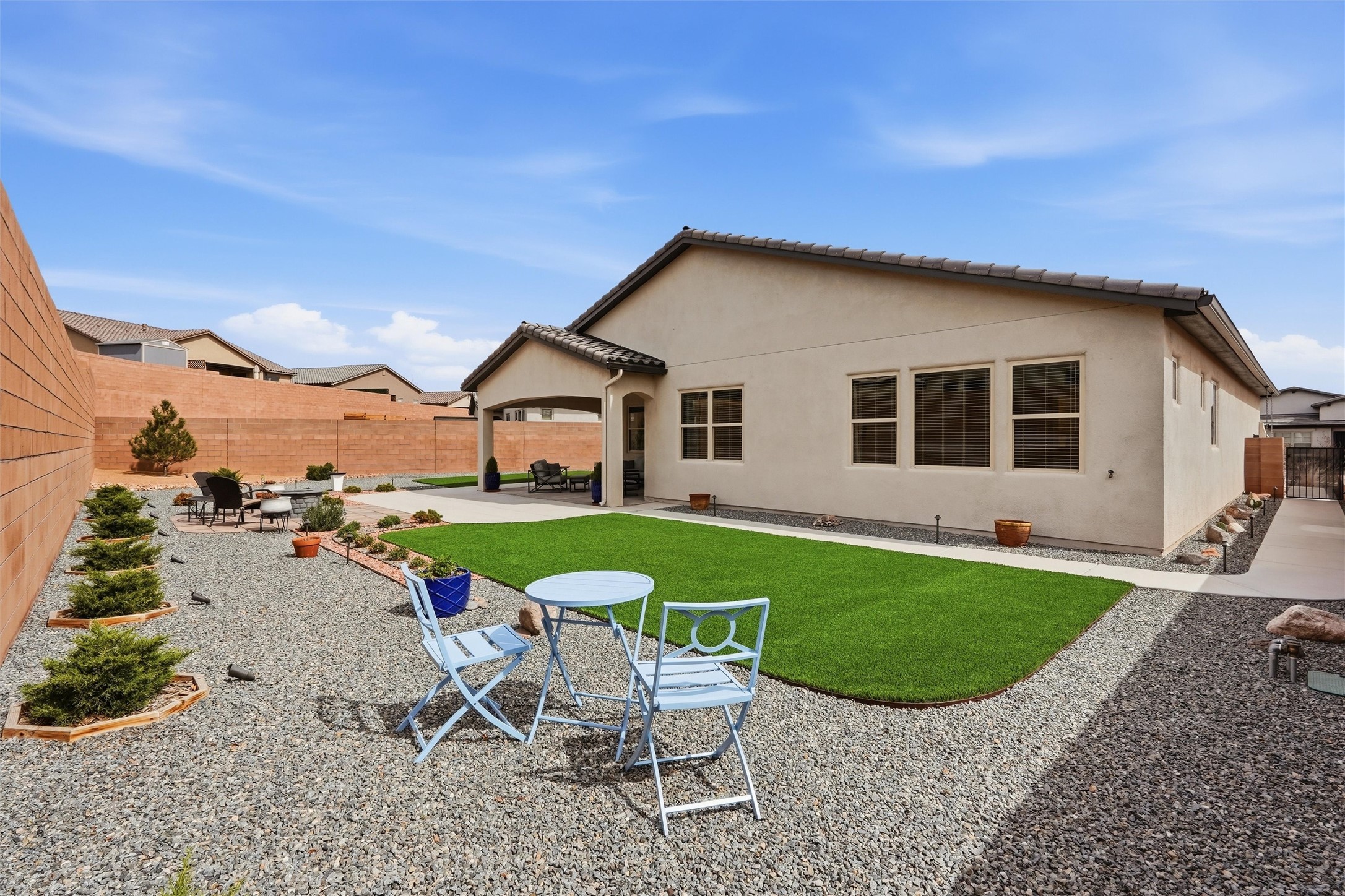 Welcome to this stunning, nearly-new 2022 construction located in the highly desirable Lomas Encantadas community of Northern Rio Rancho. This spacious 2,077 sq. ft. residence offers a perfect blend of modern design and functional living, featuring 3 bedrooms, 2 bathrooms, and a versatile 3-car garage. As you enter, the 8' interior doors and elegant tray ceilings in both the living room and owner's suite immediately enhance the open and airy floor plan, which is designed to maximize natural light throughout the home. The heart of the home is a gourmet chef's kitchen, fully equipped with premium stainless steel appliances, a built-in gas stove, and a built-in convection microwave and oven. Sophisticated granite countertops are beautifully accented by under-cabinet lighting, while soft-close cabinets and drawers add a touch of everyday luxury. A standout feature of this residence is the custom walk-in butler's pantry, providing exceptional storage and organization for the modern household. In the living area, a cozy gas fireplace with an automatic blower ensures comfort during the winter months. Extensive custom upgrades continue outside to a fully landscaped backyard, offering a beautiful, move-in-ready retreat. Situated with convenient access to local parks and highly-rated schools like Sandia Vista Elementary and Mountain View Middle School, this property represents a fantastic opportunity for buyers looking for the benefits of new construction without the wait. Its location in a growing area makes it a solid choice for long-term value and a must-see for those seeking a turn-key lifestyle.