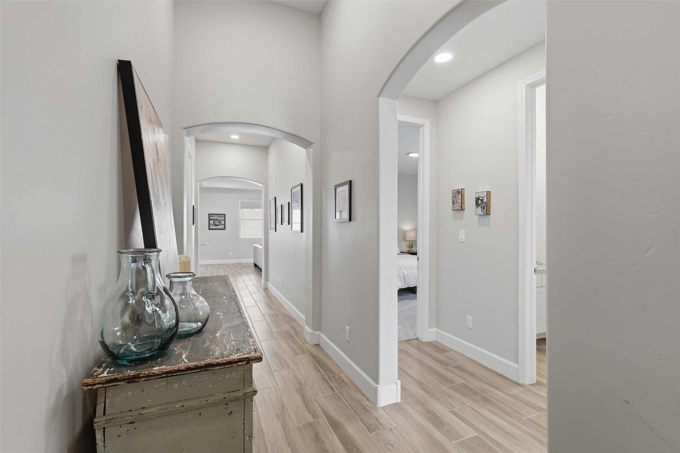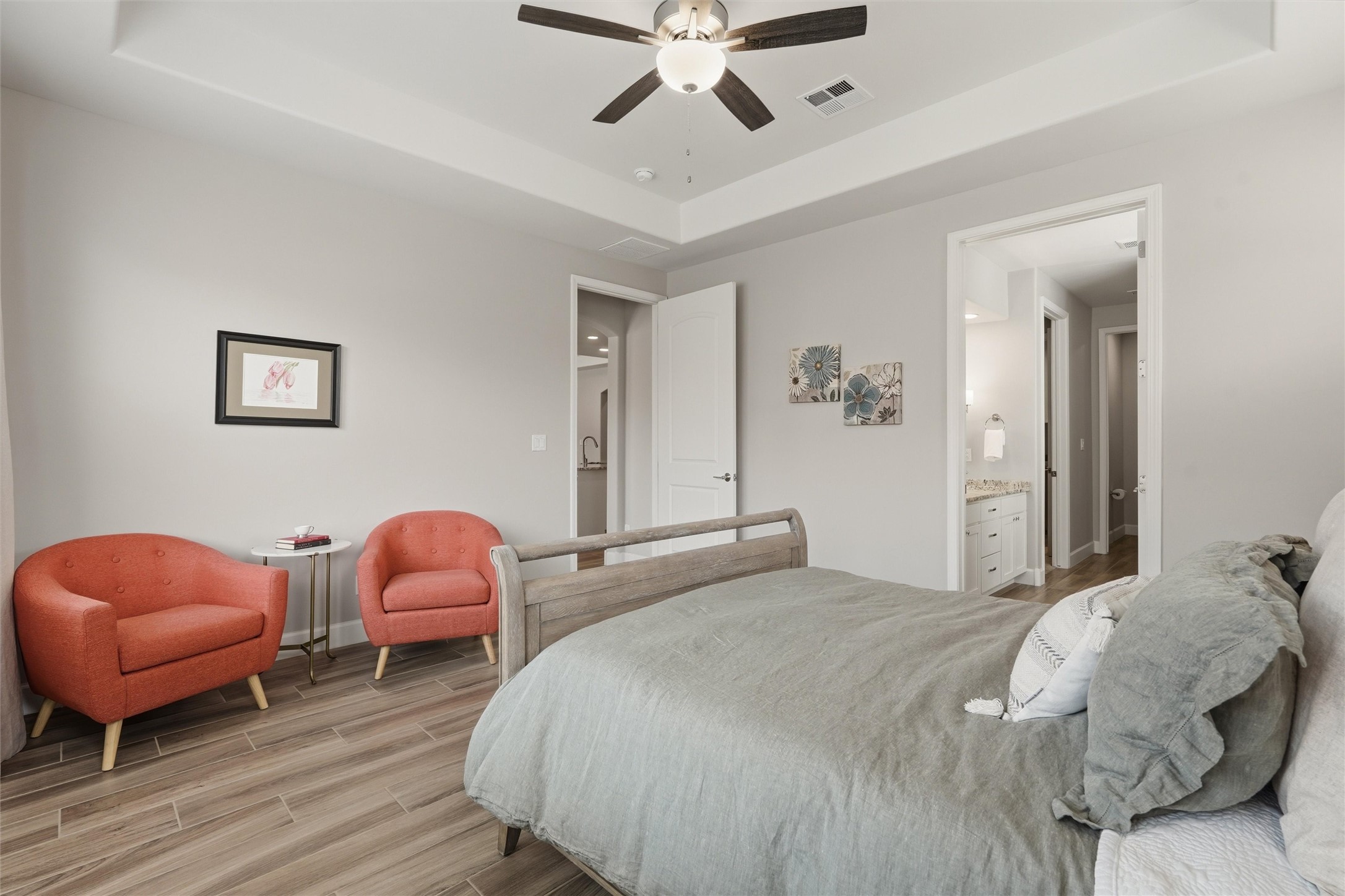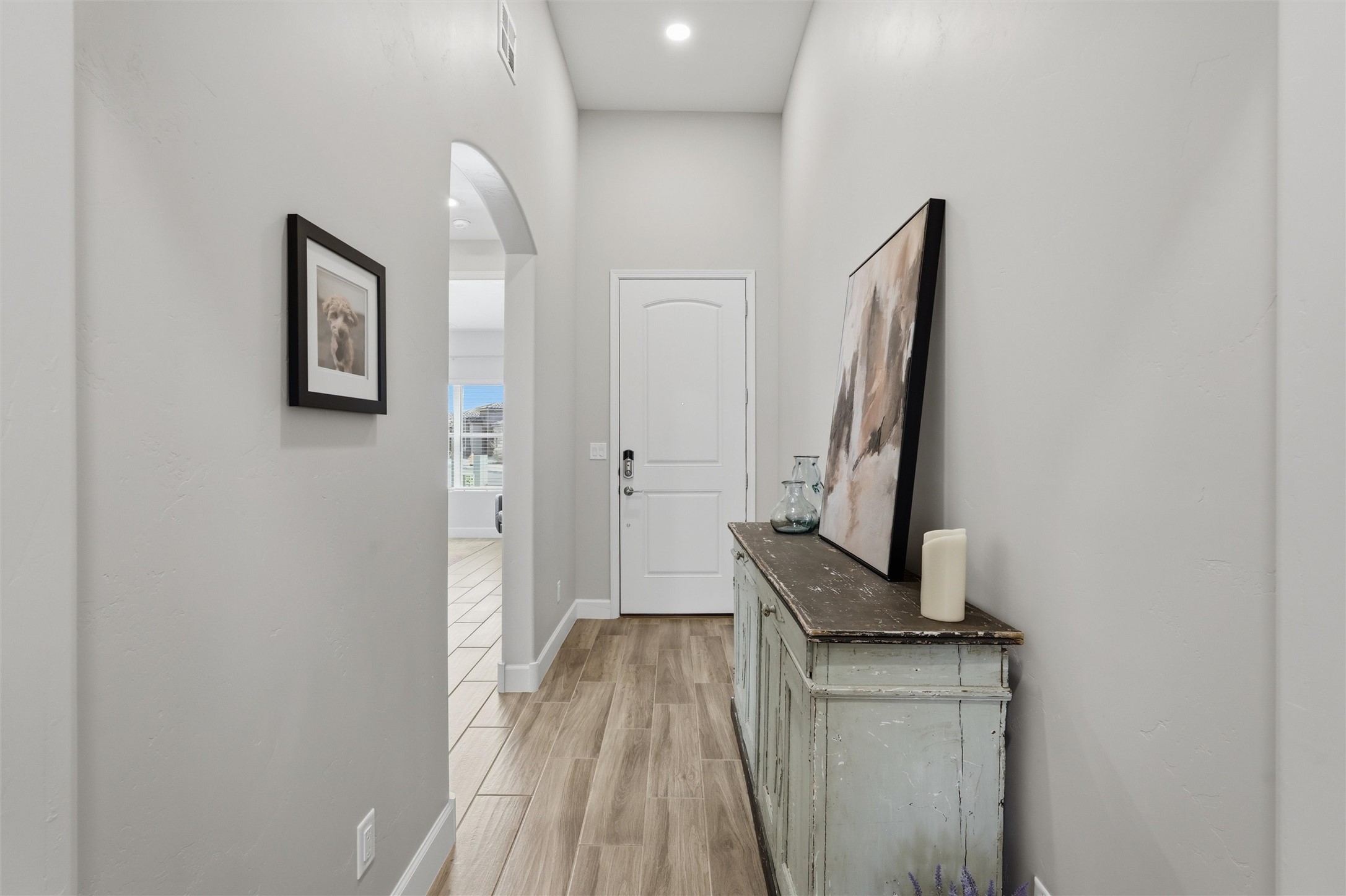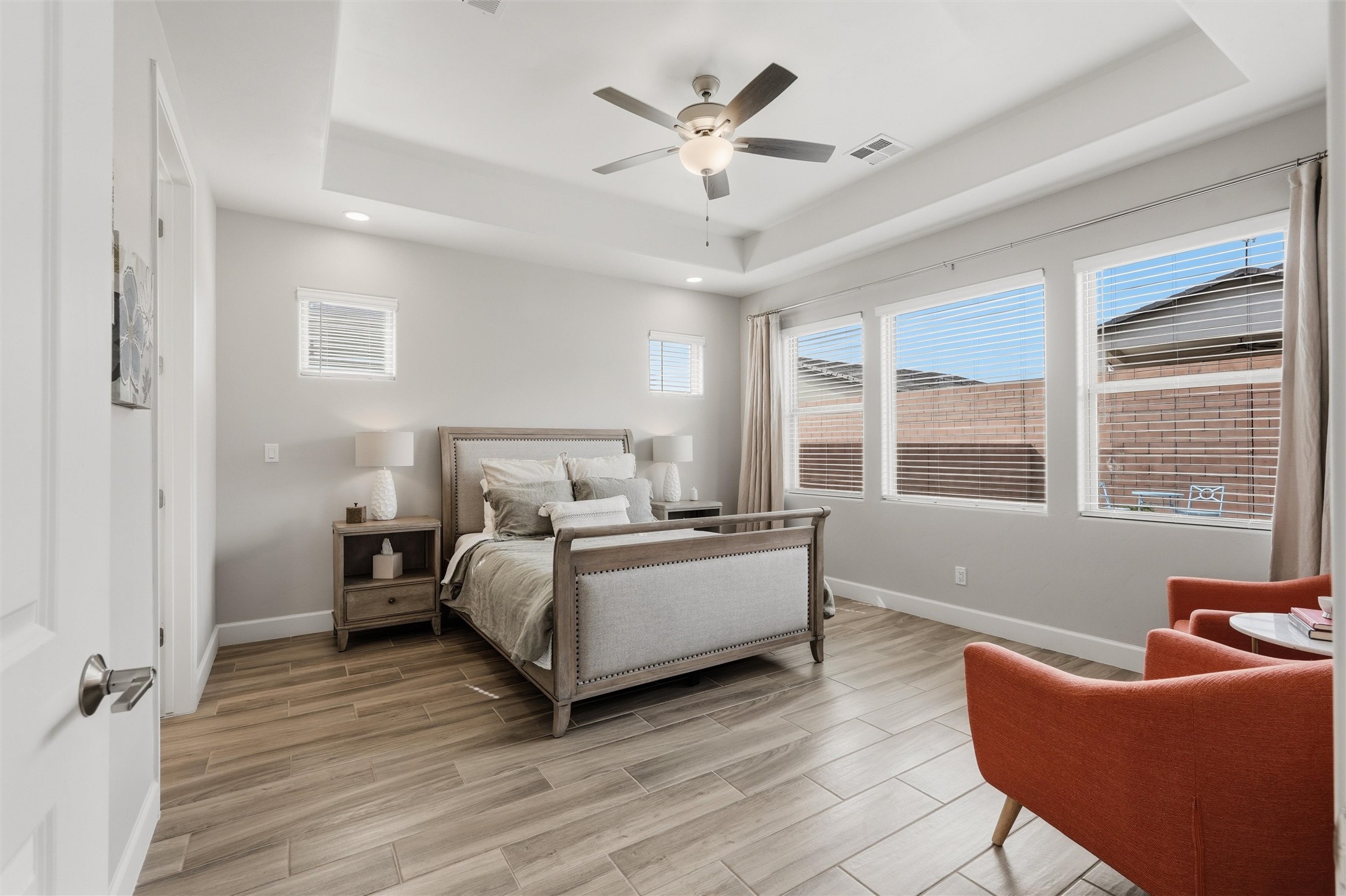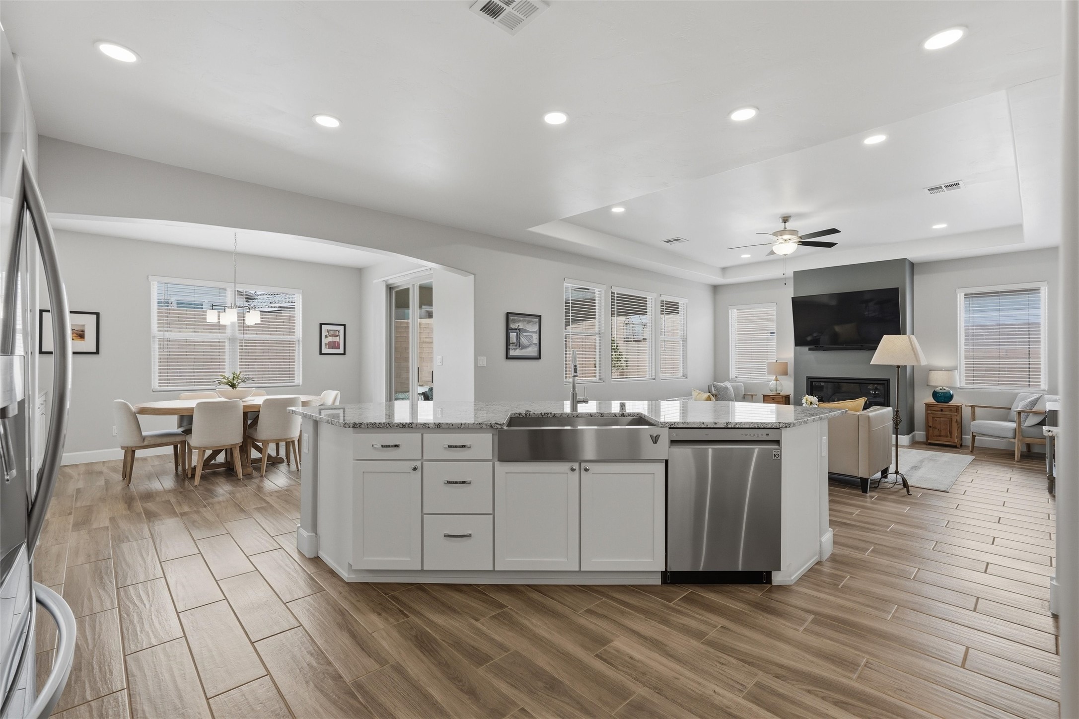 Welcome to this stunning, nearly-new 2022 construction located in the highly desirable Lomas Encantadas community of Northern Rio Rancho. This spacious 2,077 sq. ft. residence offers a perfect blend of modern design and functional living, featuring 3 bedrooms, 2 bathrooms, and a versatile 3-car garage. As you enter, the 8' interior doors and elegant tray ceilings in both the living room and owner's suite immediately enhance the open and airy floor plan, which is designed to maximize natural light throughout the home. The heart of the home is a gourmet chef's kitchen, fully equipped with premium stainless steel appliances, a built-in gas stove, and a built-in convection microwave and oven. Sophisticated granite countertops are beautifully accented by under-cabinet lighting, while soft-close cabinets and drawers add a touch of everyday luxury. A standout feature of this residence is the custom walk-in butler's pantry, providing exceptional storage and organization for the modern household. In the living area, a cozy gas fireplace with an automatic blower ensures comfort during the winter months. Extensive custom upgrades continue outside to a fully landscaped backyard, offering a beautiful, move-in-ready retreat. Situated with convenient access to local parks and highly-rated schools like Sandia Vista Elementary and Mountain View Middle School, this property represents a fantastic opportunity for buyers looking for the benefits of new construction without the wait. Its location in a growing area makes it a solid choice for long-term value and a must-see for those seeking a turn-key lifestyle.