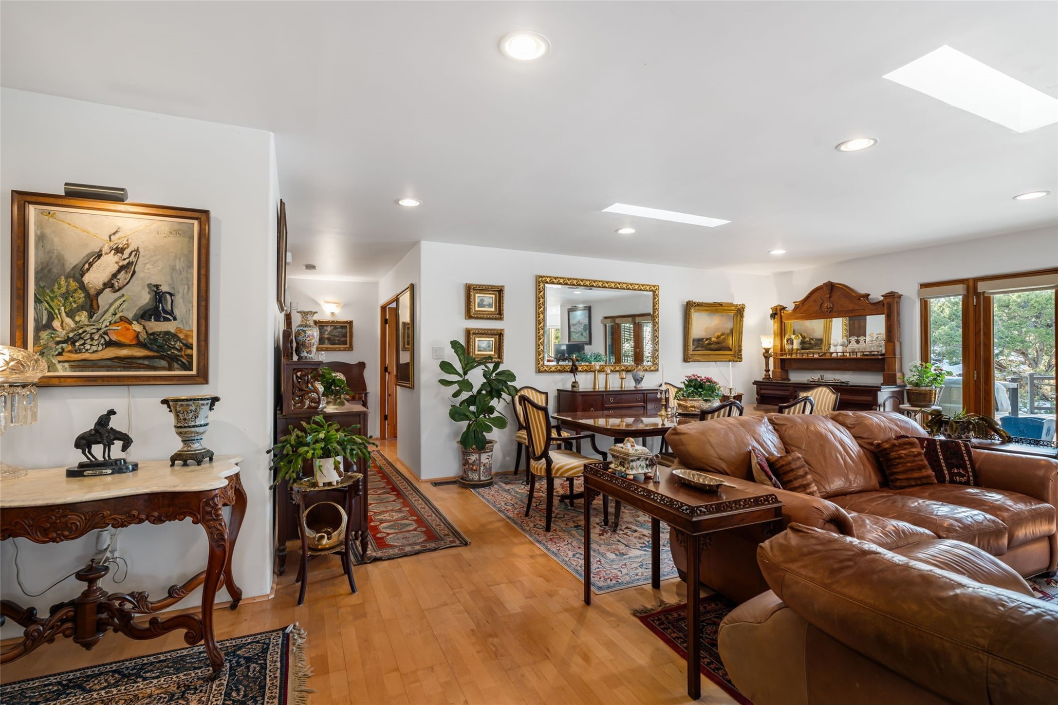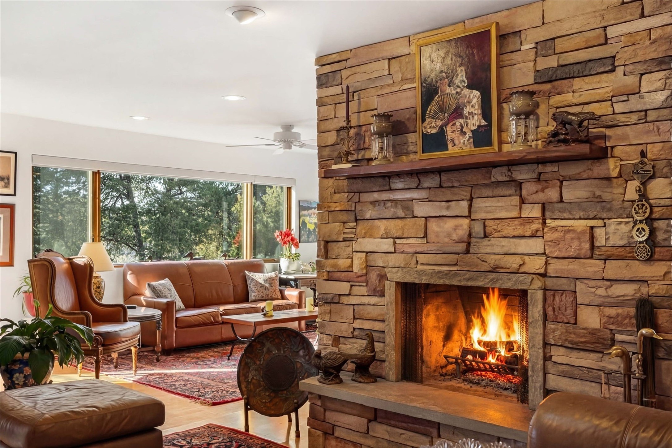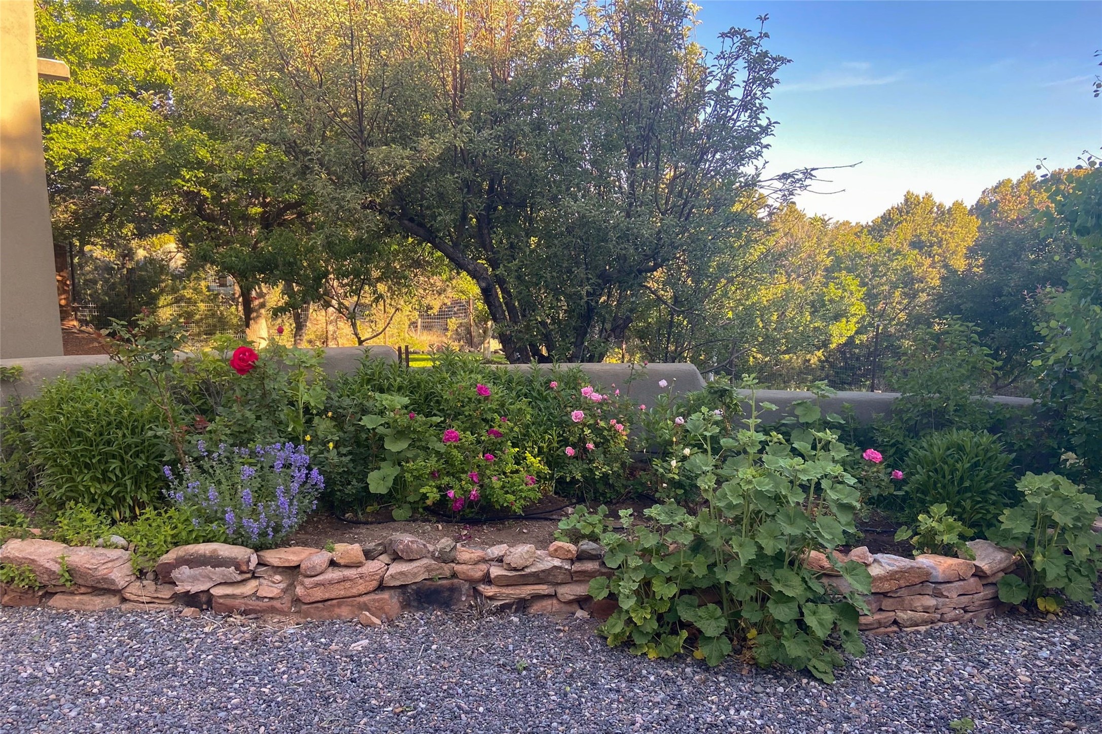 Light and Sky - where Santa Fe light meets endless sky, this enchanting 3 BR / 2BA single-level home reveals itself with effortless elegance. Set on apx 2.14 acres and offering apx 2,520 sqft of luminous living, it is a sanctuary of quiet refinement - rooms that welcome the day, frame the horizon, and inspire reflection and imagination. Warm and gracious, this home was designed to be lived in, admired, and remembered. Expansive windows and skylights draw abundant sunlight inward, illuminating blonde wood floors and interiors anchored by a sculptural stacked-stone fireplace. The living spaces embrace light and landscape with subtlety and sophistication, offering a calm serenity while effortlessly accommodating small and large gatherings. Outdoors, a generous entertaining deck extends the living space beneath vast skies. A manicured grass lawn, mature trees, and thoughtfully planted gardens create a private setting. There are abundant pinon trees, aspens, Japanese maples, and fruit trees, including apricot, pear, and apple. Also, annuals and perennials of Shasta daisies, hollyhocks, cosmos, iris, morning glories, a variety of roses and Russian sage. An ancillary structure provides for versatility - ideal as a private office, yoga or fitness studio, artist's atelier, or intimate library. An efficient HVAC system provides comfort year-round for heat and refrigerated air-conditioning. There is also an attached two-car garage. Moments from Harry's Roadhouse, El Gancho, nearby amenities and shopping with easy access to I-25, the home offers serene privacy while remaining effortlessly suited for entertaining. More than a residence, this is a home of quiet distinction, reflecting a lifestyle of beauty and serenity.