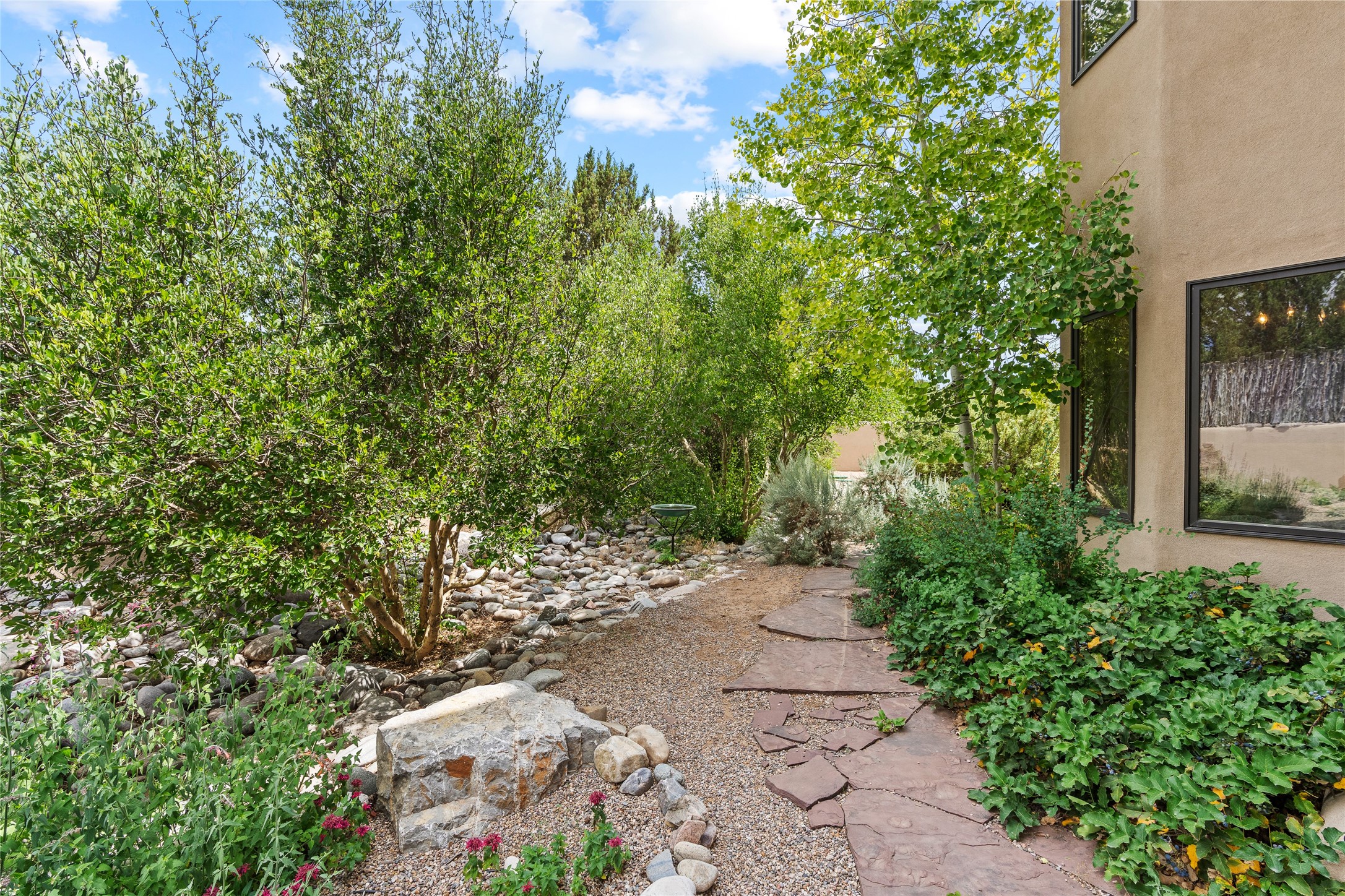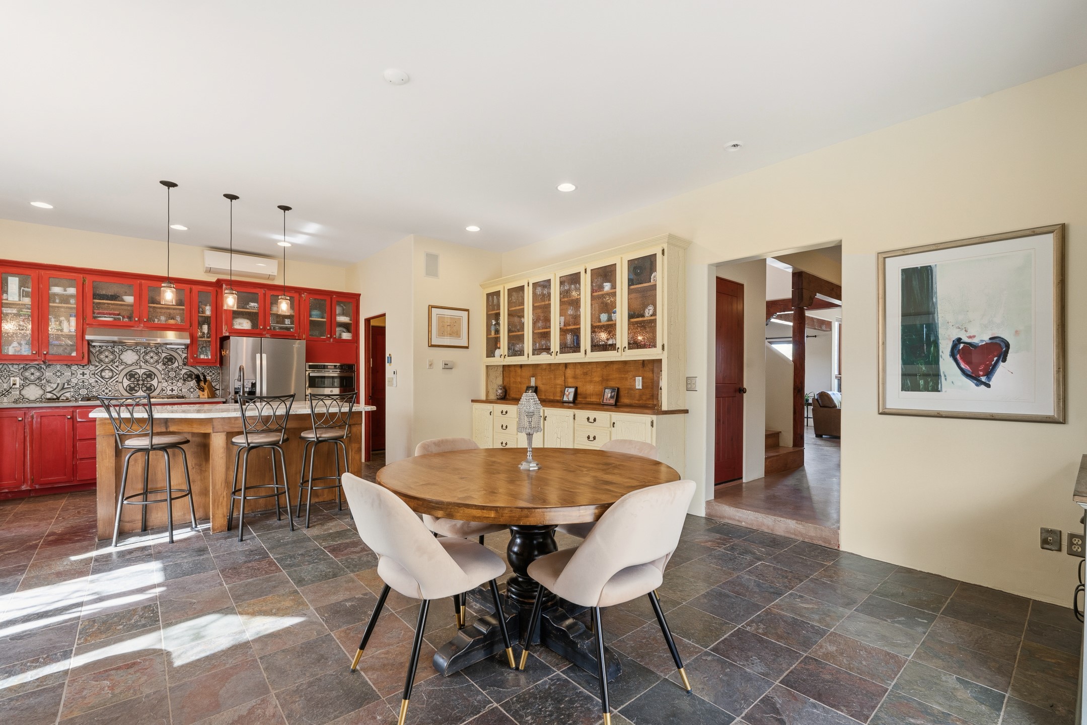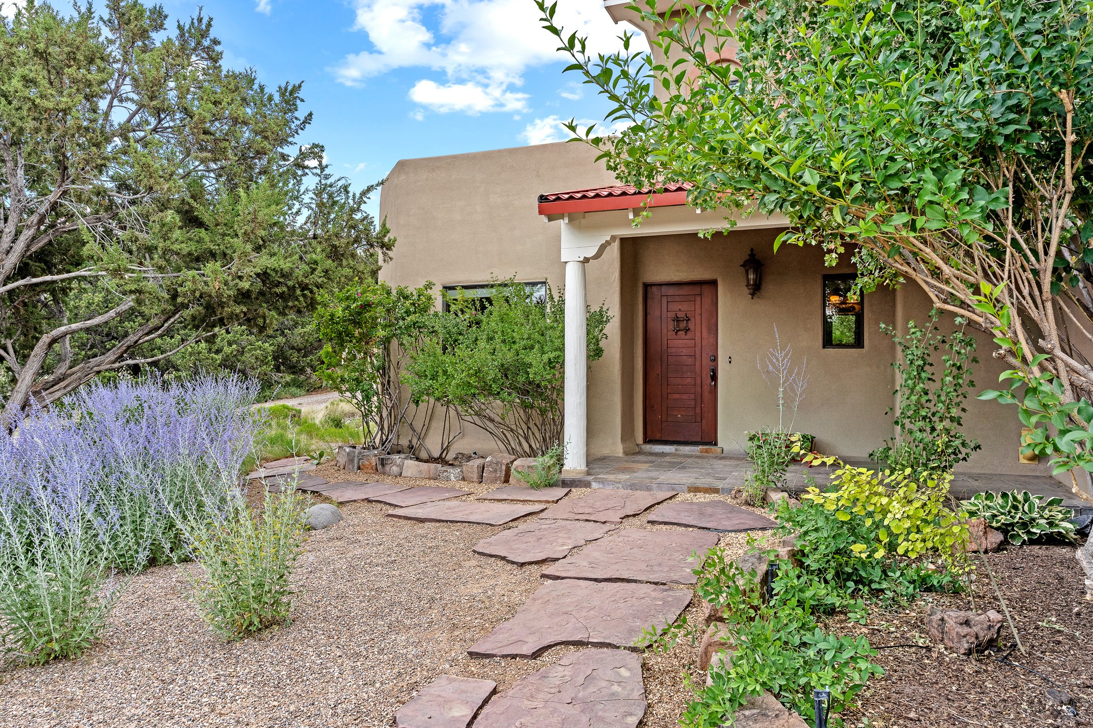 Just 15 minutes from downtown Santa Fe, this 2,670 sq. ft. residence offers privacy, views, and a warm blend of contemporary and Southwestern design. Set on 2.5 acres and backing to a peaceful arroyo and walking trail--perfect for morning walks or sunset strolls--the property is both serene and connected to the surrounding landscape.The 3-bedroom, 2.5-bath home features high ceilings with vigas, a kiva fireplace, and richly stained concrete floors that lend a modern edge. The main living area, anchored by a kiva fireplace as a dramatic focal point, includes two flexible spaces that flow easily for entertaining or everyday living.The cheerful country kitchen brings color and charm with antiqued red cabinetry, a banco breakfast nook, and a generous island with prep sink and bar seating--ideal for casual gatherings.Two guest bedrooms on the main level share a lovely full bath, while the second floor is devoted entirely to the primary suite. This private retreat includes a light-filled bedroom with a cozy reading nook, a loft that functions beautifully as a home office, and access to a secluded portal with expansive mountain views. The ensuite bath is a soothing sanctuary, with soft blue tile and natural light evoking the calm of water and sky. Infused with character and surrounded by natural beauty, this home offers relaxed elegance and an unmistakable Santa Fe spirit.