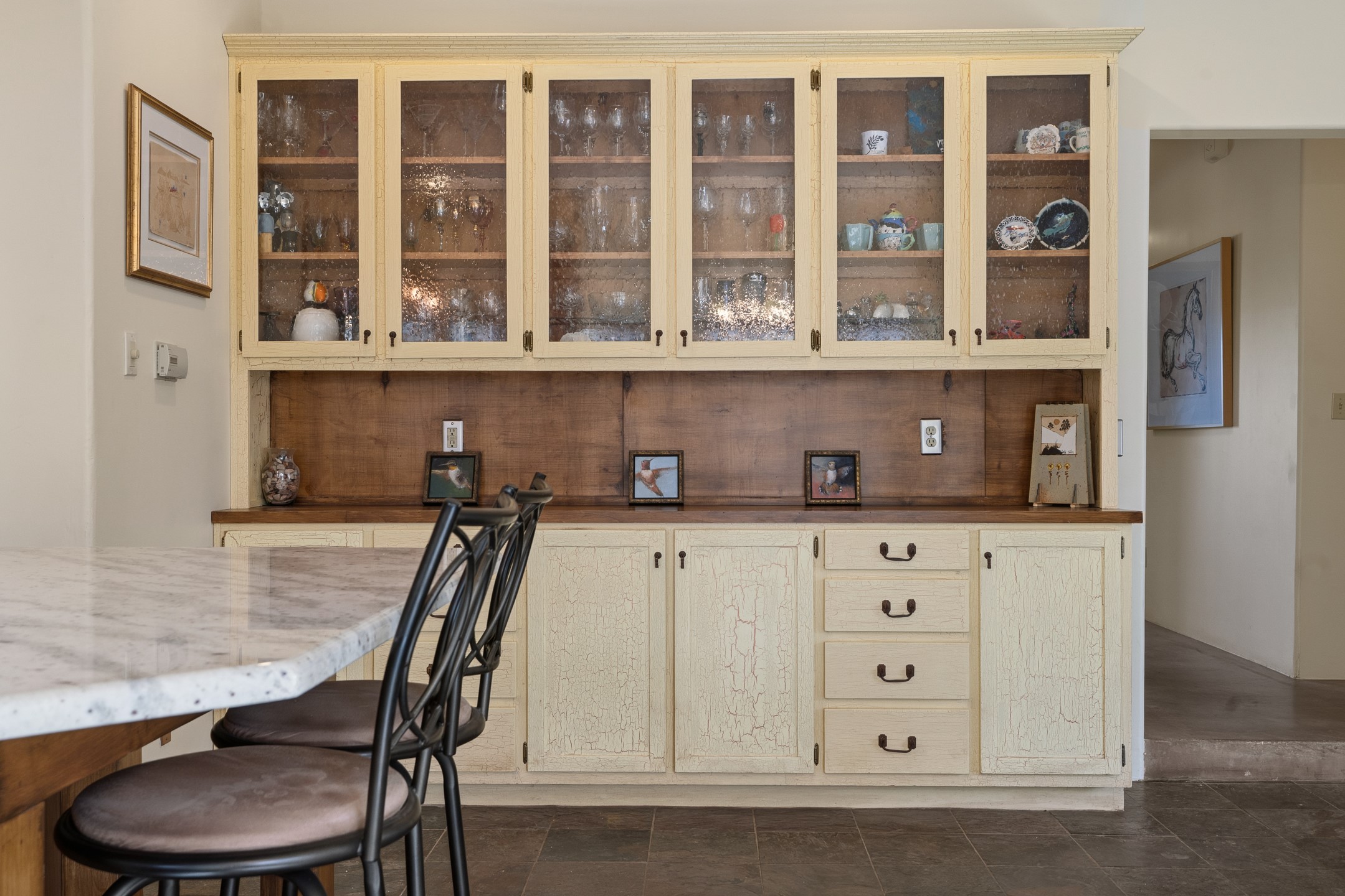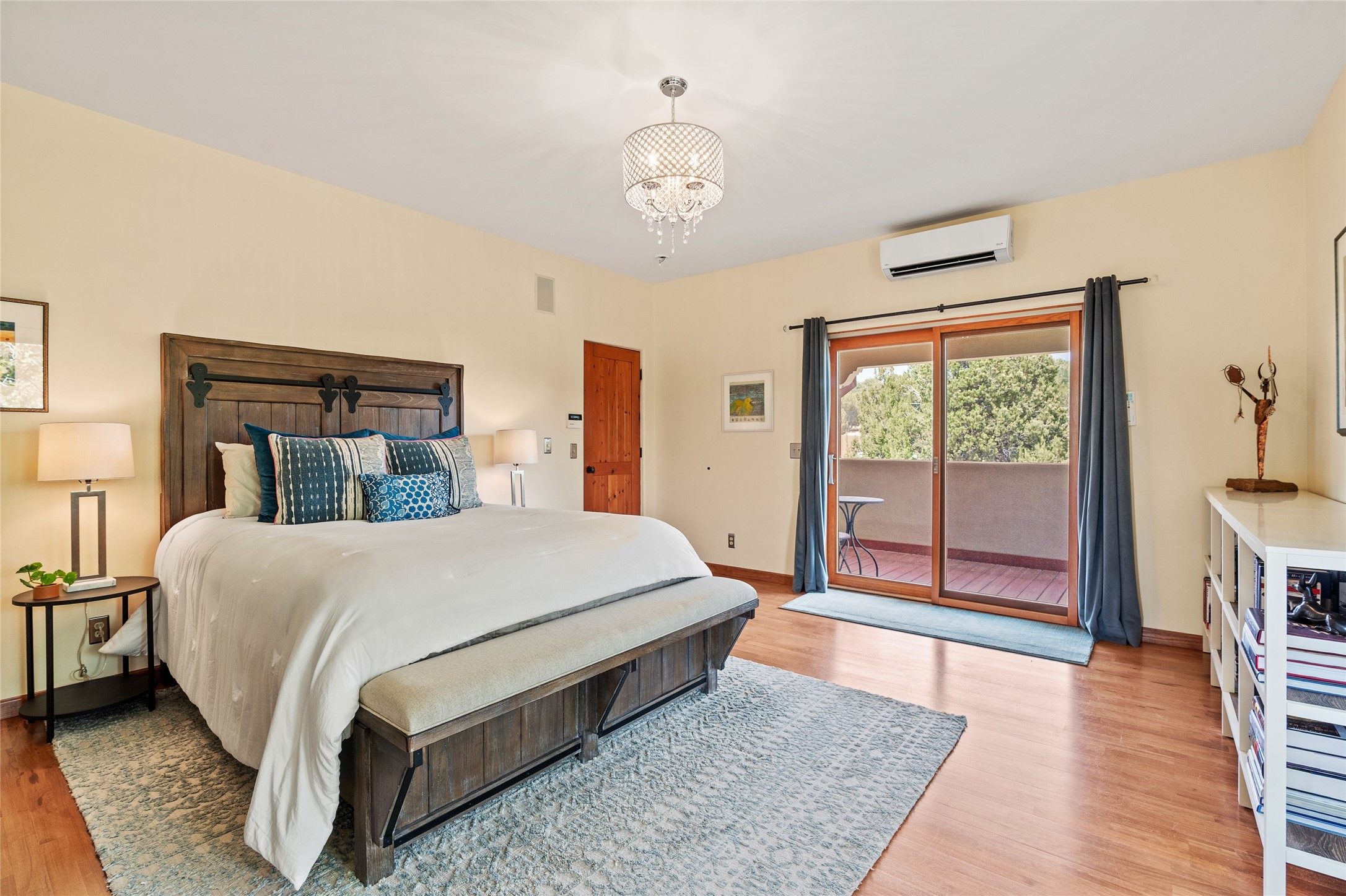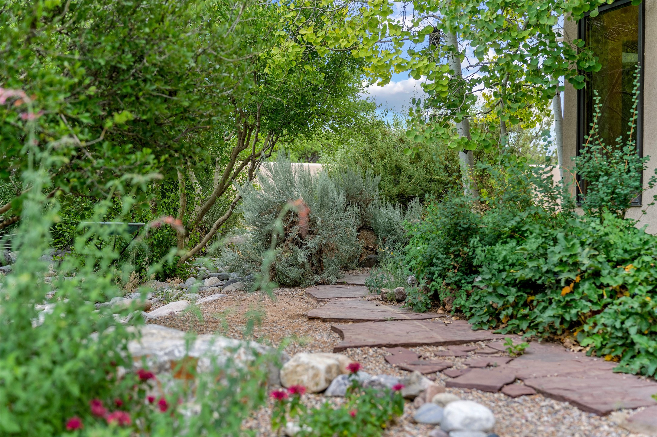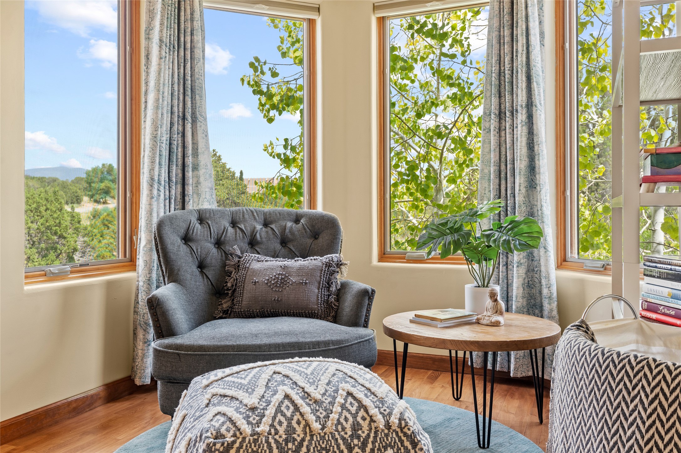 Just 15 minutes from downtown Santa Fe, this 2,670 sq. ft. residence offers privacy, views, and a warm blend of contemporary and Southwestern design. Set on 2.5 acres and backing to a peaceful arroyo and walking trail--perfect for morning walks or sunset strolls--the property is both serene and connected to the surrounding landscape.The 3-bedroom, 2.5-bath home features high ceilings with vigas, a kiva fireplace, and richly stained concrete floors that lend a modern edge. The main living area, anchored by a kiva fireplace as a dramatic focal point, includes two flexible spaces that flow easily for entertaining or everyday living.The cheerful country kitchen brings color and charm with antiqued red cabinetry, a banco breakfast nook, and a generous island with prep sink and bar seating--ideal for casual gatherings.Two guest bedrooms on the main level share a lovely full bath, while the second floor is devoted entirely to the primary suite. This private retreat includes a light-filled bedroom with a cozy reading nook, a loft that functions beautifully as a home office, and access to a secluded portal with expansive mountain views. The ensuite bath is a soothing sanctuary, with soft blue tile and natural light evoking the calm of water and sky. Infused with character and surrounded by natural beauty, this home offers relaxed elegance and an unmistakable Santa Fe spirit.