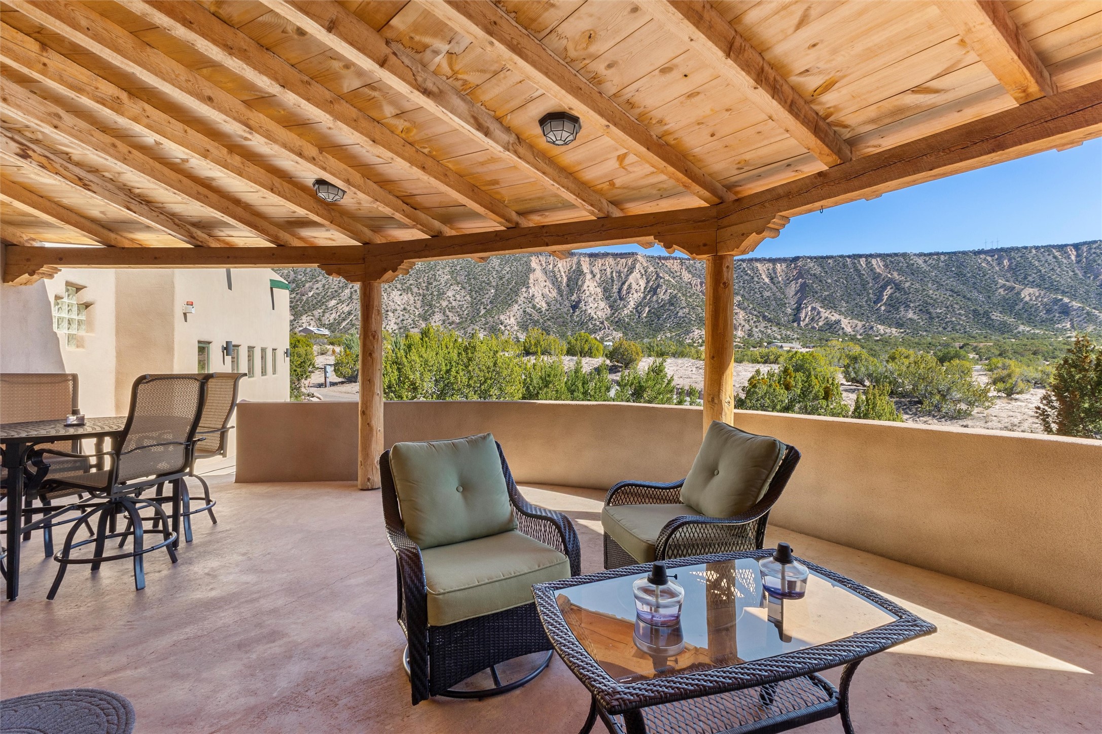 Heart-stopping views and truly astonishing vistas define this exceptional 2007 custom home set on 5+ private acres, including its own hoodoo rock formation. Built with highly insulated R-32 Rastra construction, this residence offers a rare blend of efficiency, comfort, and luxury just 13 minutes south of Ojo Caliente Hot Springs, 35 minutes to Los Alamos, 45 minutes to the Santa Fe Plaza, and an hour to Taos. A 5-zone ductless mini-split system added in 2024 provides year-round comfort.Located within the gated community of Rio Ojo Caliente, this home welcomes you with a covered portal entry and a hand-carved arched door. Inside, the grand living room features diamond-finish plaster walls, exposed wooden beams, and distinctive architectural details. The home has also benefited from recent stucco maintenance, full canales repair, sealing, and repainting, a freshly re-sealed roof in 2026 with warranty, and septic system servicing completed.Designed for comfort and privacy, the home offers excellent bedroom separation. The spacious primary suite opens to a wraparound covered composite deck portal with sweeping views of the Ojo Caliente River Valley, cottonwoods, Sierra Negra, Black Mesa, and the Pajarito ski area. The en-suite bath includes dual walk-in closets, soaking tub, and walk-in shower.The kitchen flows to the rear portal through French doors, ideal for entertaining or enjoying New Mexico sunsets. Both front and rear portals feature metal roofing added in 2023, offering 815 square feet of covered outdoor living.Additional highlights include 2 living areas, a formal dining room, oversized heated garage with two storage closets, and a 30-amp RV connection. The driveway was improved with new base course and grading in 2025.Private and quiet yet less than an hour from the restaurants, galleries, and culture of Santa Fe and Taos, with nearby hiking, biking, fishing, rafting and wildlife viewing.