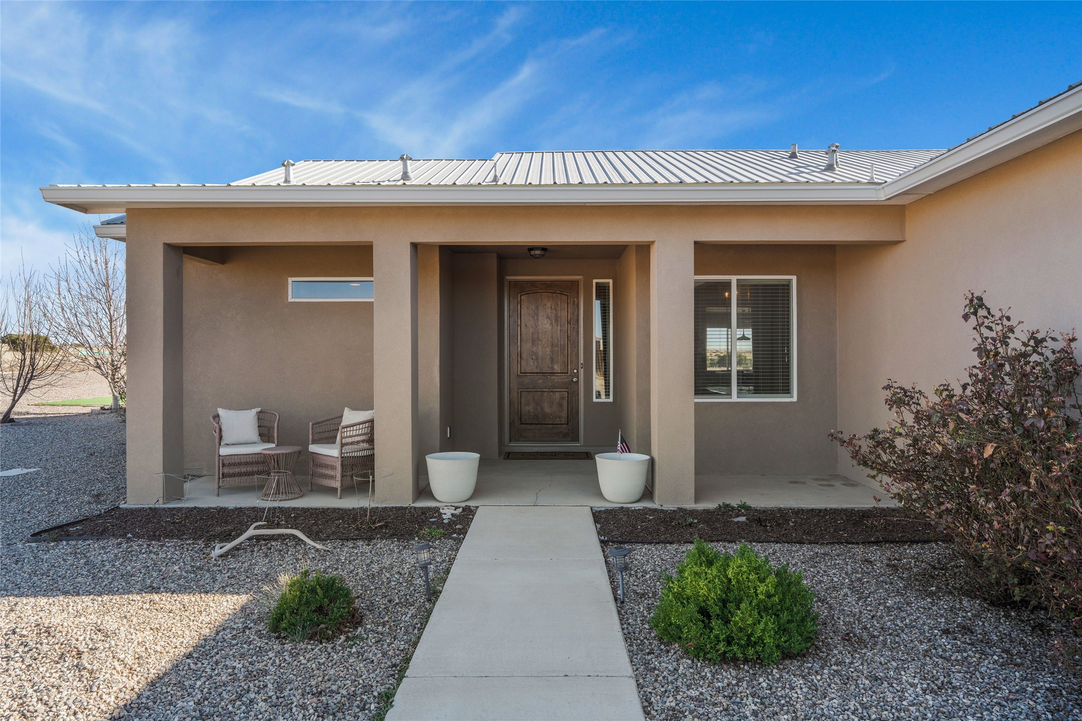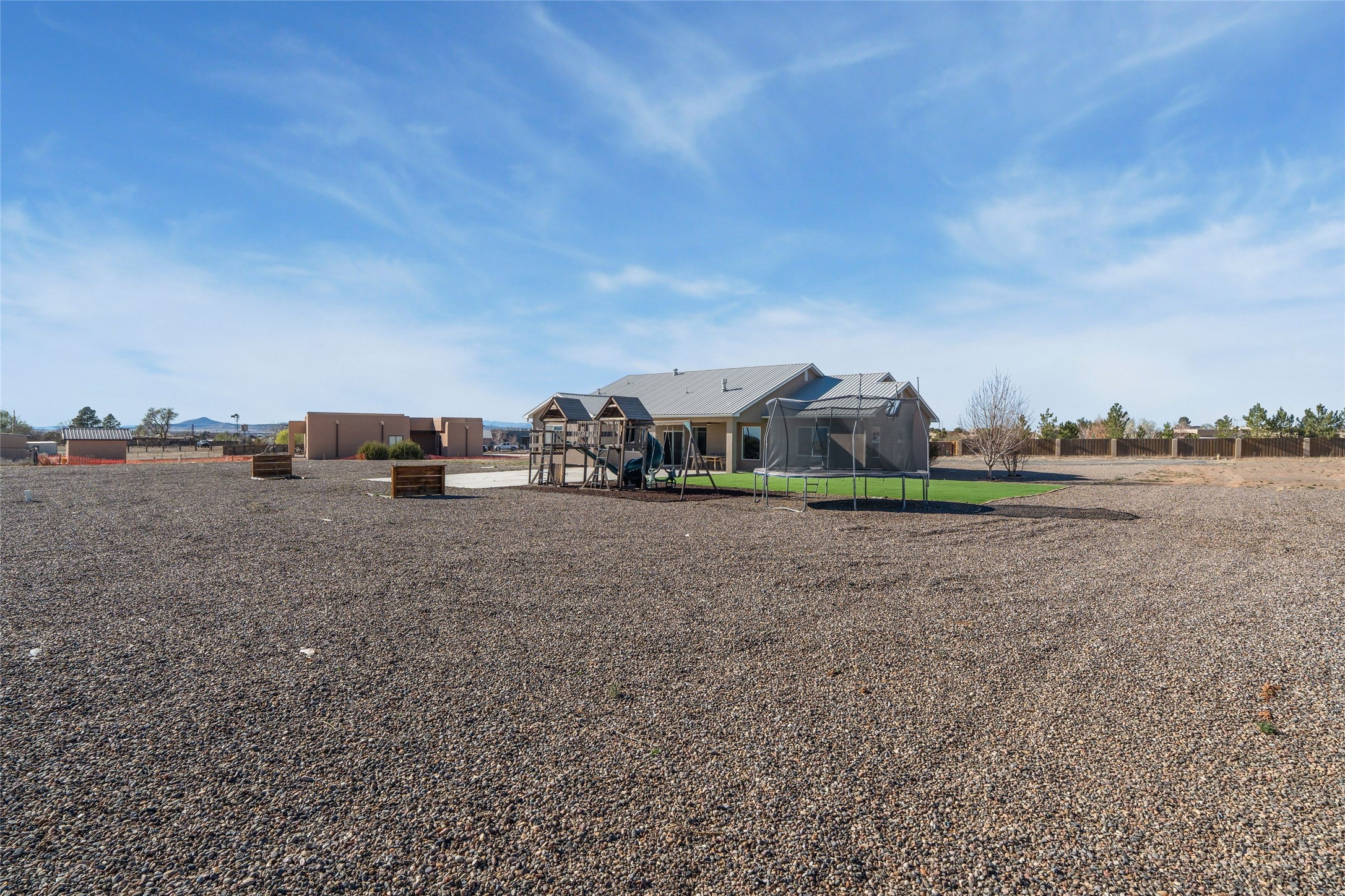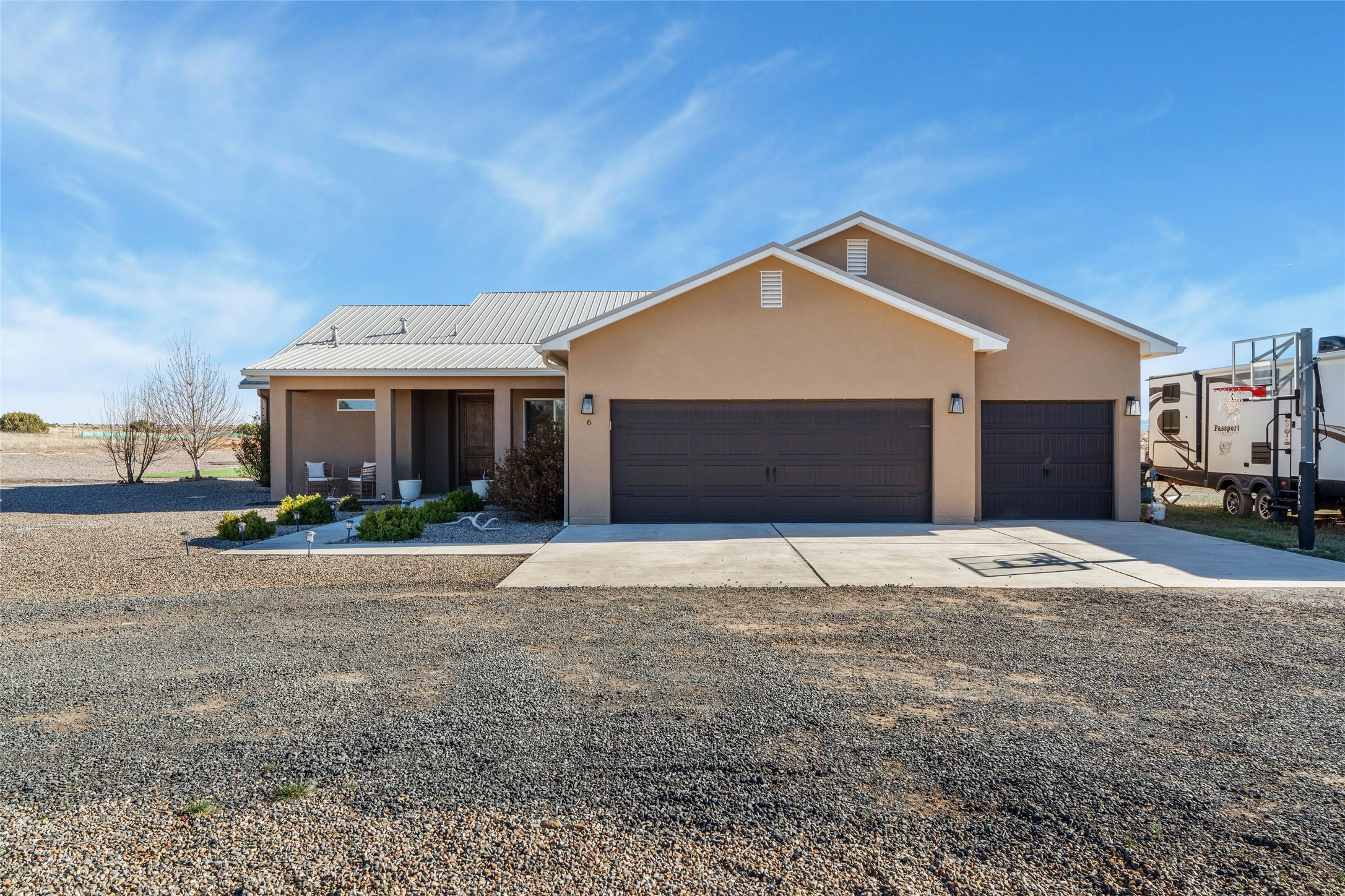 A true entertainer's delight, aesthetically stunning, in a gated community, Valle Serena, built in 2017. This single level home with a pro-panel roof has it all....VIEWS, 1.3 acre lot to spread out, light and bright with high ceilings, 3 bedrooms, including a spacious primary suite with an additional oversized entertaining/studio/ office space (multi purpose room), 3 baths, 3 designated eating areas: Separate Dining Room, Breakfast Nook and Kitchen Island. The meticulously designed home offers the perfect balance of comfort, luxury & livability. CHEF'S KITCHEN is a culinary haven outfitted with premier appliances, custom cabinetry, large island with seating and a generous walk in pantry. The entertainment room has a service bar and is wired for a projection screen. This open concept home shows pride of ownership and has been very well maintained. The attached finished 3 car garage offers 2 oversized spaces as well as additional storage/work space. This home is great for Los Alamos commuters, it's minutes from Hwy 599. There are several Los Alamos commuters in the subdivision! The road to the subdivision, Avenida Del Sur is scheduled to be paved. Quiet and private setting. Move-in ready and waiting for you and your family.