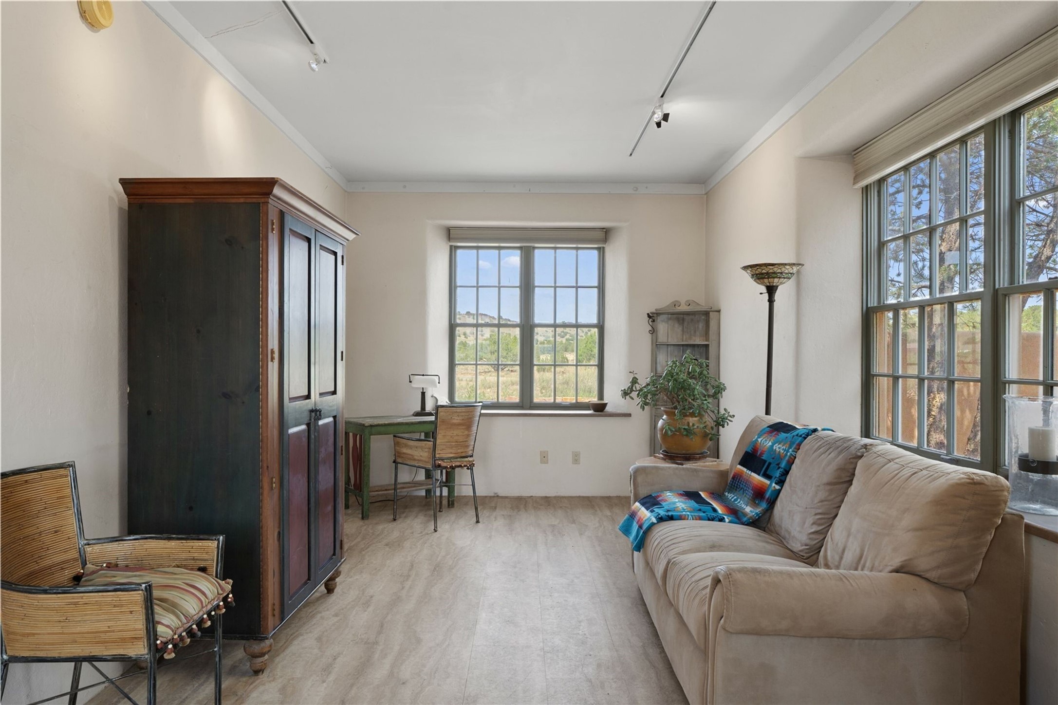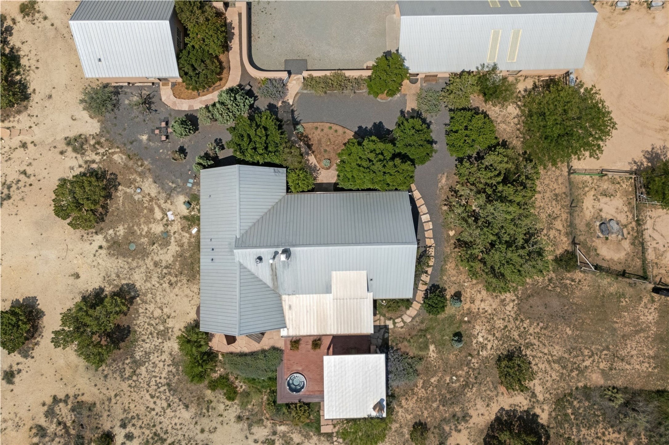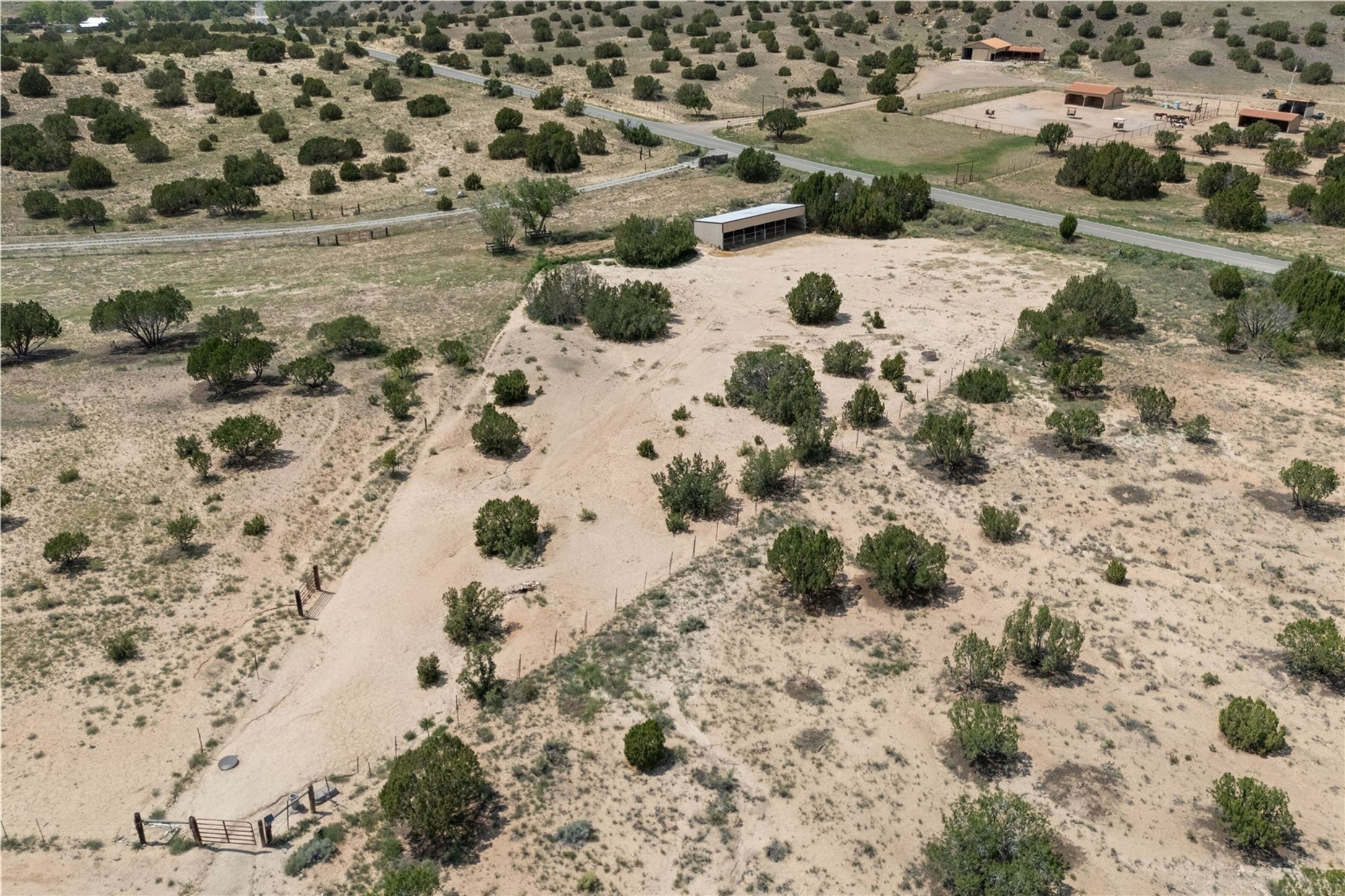 Set within the highly coveted hamlet of Galisteo, this extraordinary 70-acre gated compound offers something increasingly rare: true privacy, panoramic views, and a fully realized equestrian lifestyle -- all within easy reach of Santa Fe. Spanning three contiguous lots, the property delivers both immediate livability and long-term flexibility. The charming Northern New Mexican-style main residence anchors the compound with wood beamed high ceilings, plaster walls, an arched fireplace, two bedrooms, and a sleeping loft. A brick-floored portal extends living space outdoors, where a covered dining area, outdoor fireplace, and hot tub frame sweeping southern views of the Galisteo Basin and the iconic Cerro Pelon Ranch. For the serious equestrian, the property accesses miles of stunning extensive riding, complemented by five fenced interlocking pastures, internal roads, two horse and hay barns, and no restrictions on horse numbers. A detached guest casita, bunkhouse, garden workshop and large two-car garage with extensive storage accommodate guests and equipment with ease. The property has been thoughtfully manicured for horse activity, striking a rare balance between function and serenity. The two adjoining lots preserve unobstructed vistas while offering a compelling opportunity for future expansion. Just minutes from Eldorado shopping amenities and within easy reach of Santa Fe and Albuquerque, Galisteo is celebrated for its historic charm, artistic community, world-renowned neighbors and wide-open high-desert landscapes -- one of Northern New Mexico's most scenic and culturally rich settings.
