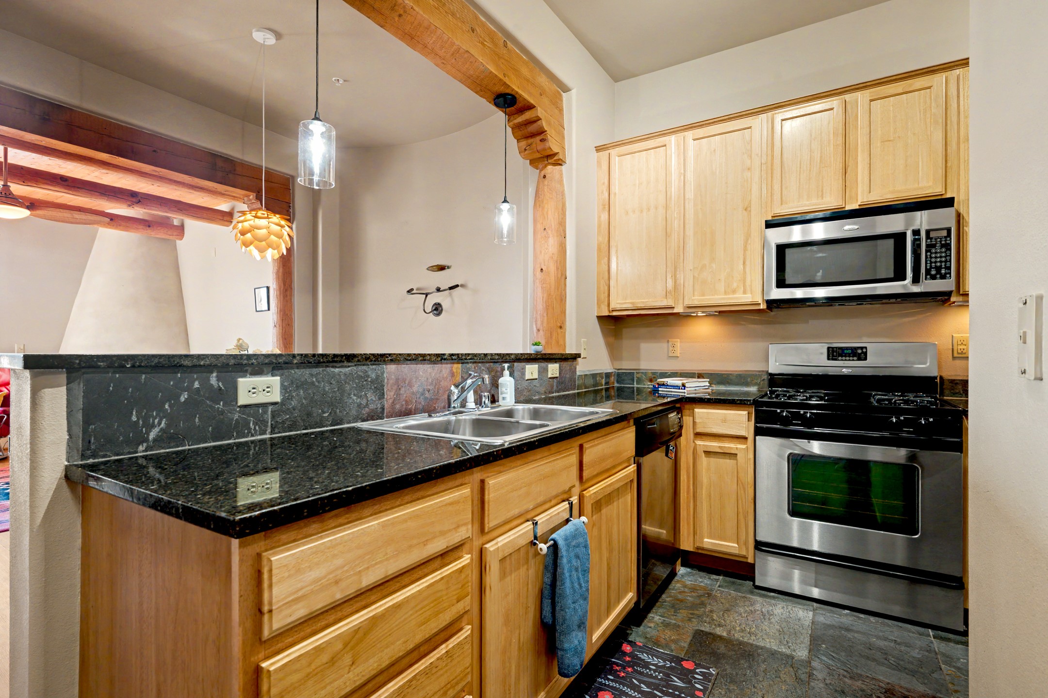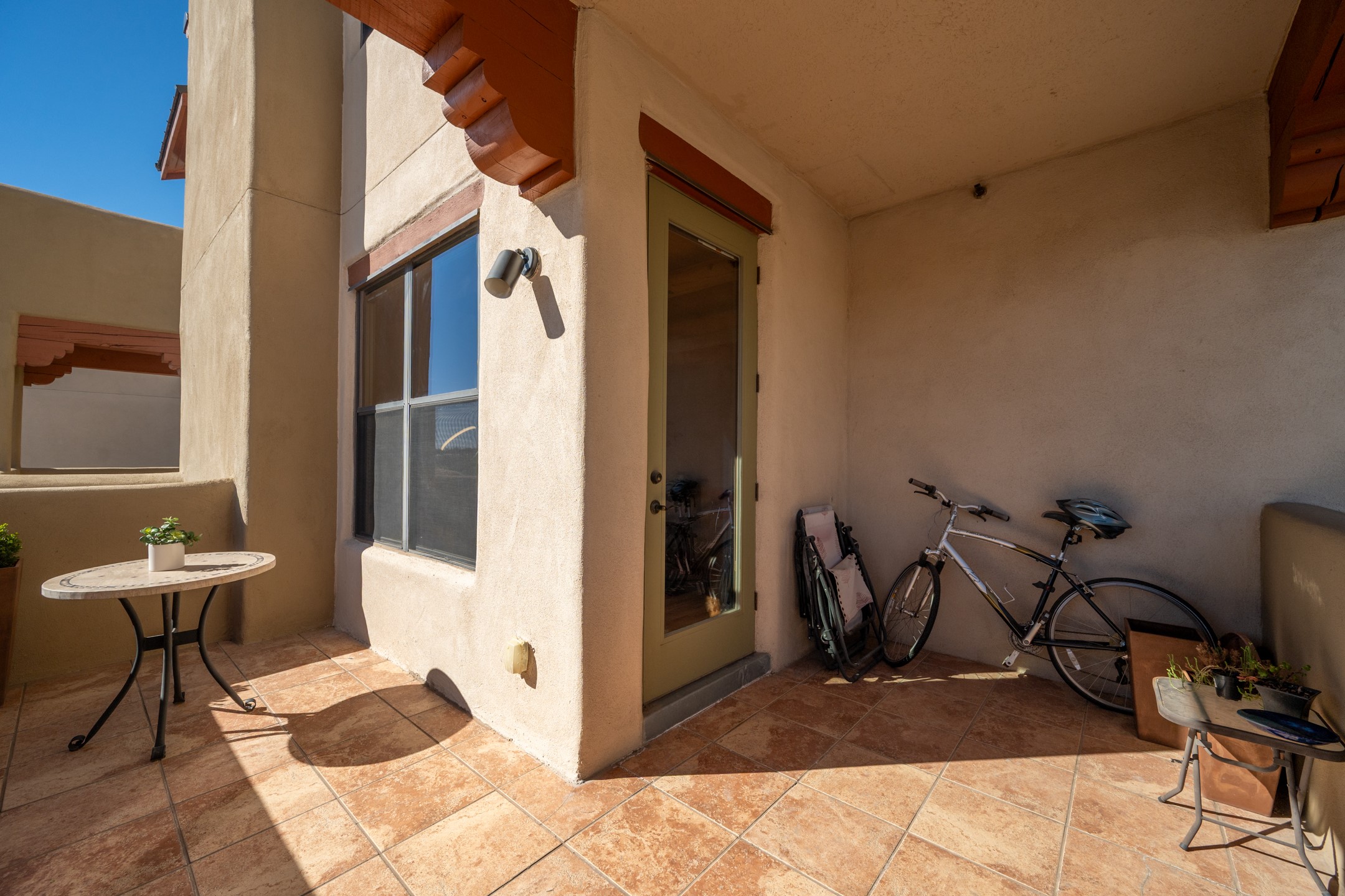 Welcome to The Alameda, a premier gated community in central Santa Fe that blends Southwestern charm with modern convenience. This beautifully appointed one-bedroom, one-and-a-half-bathroom condo spans +/- 900 sqft of thoughtfully designed living space just a few paces from the NE elevator. High-end finishes include authentic vigas and corbels, high ceilings, granite counters, central A/C & heat, a cozy kiva gas fireplace perfect for cool desert evenings, and a private East-facing balcony to soak in the morning sun and mountain views. Augmenting this turn-key gem's functionality are an office nook, laundry space, dedicated storage unit and 1-car garage. Exclusive amenities include a large carport and lobby entrance, fitness center, community kitchen with multiple lounge areas, a heated pool with grill area, and an on-site manager and handyman. Residents can also attend seasonal events and happy hours that enhance the sense of community. Conveniently located near Sprouts Farmers Market and the varied shopping offerings along Zafarano Drive, everyday errands become effortless. This is an exceptional value in one of Santa Fe's most vibrant areas.
