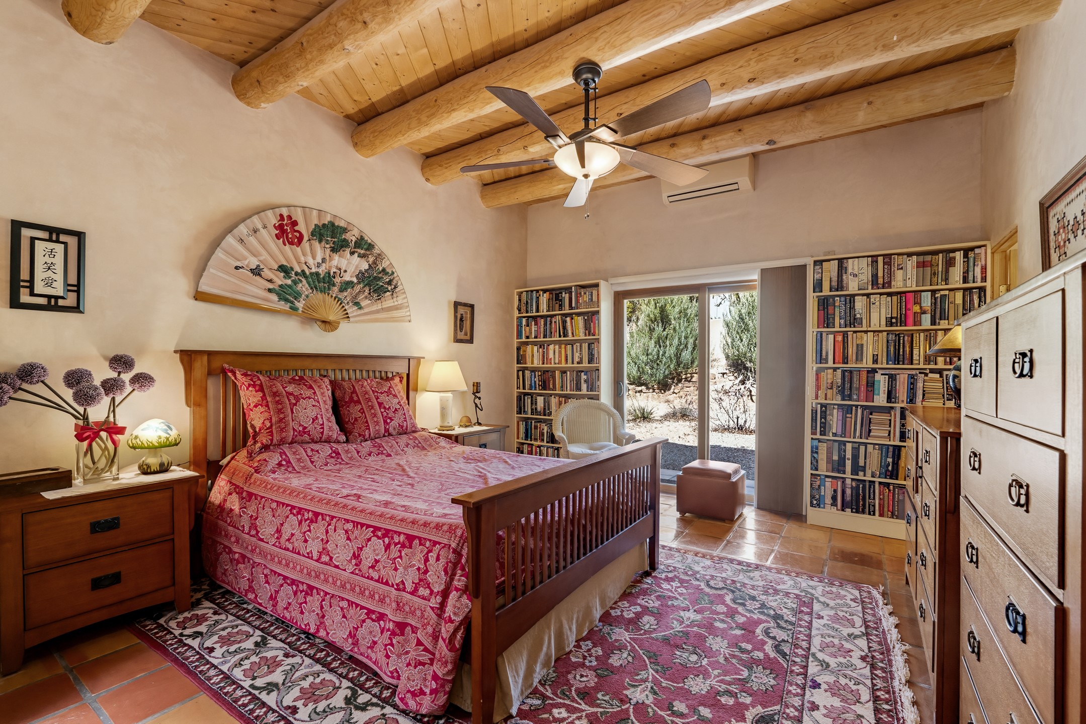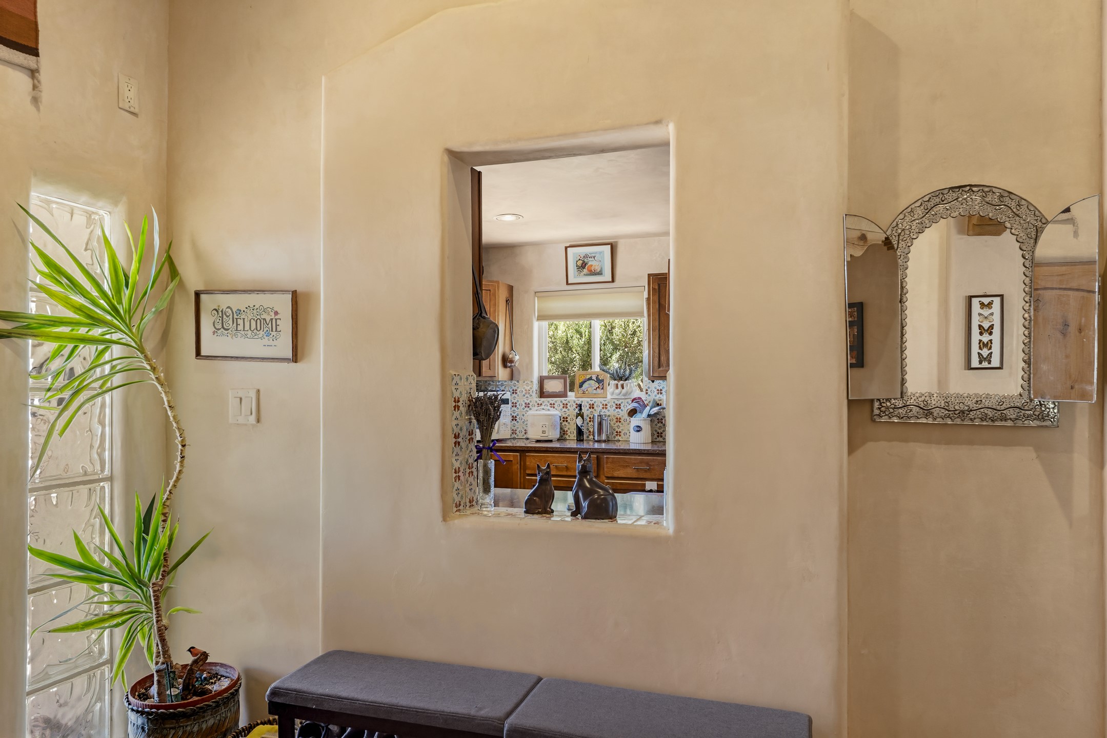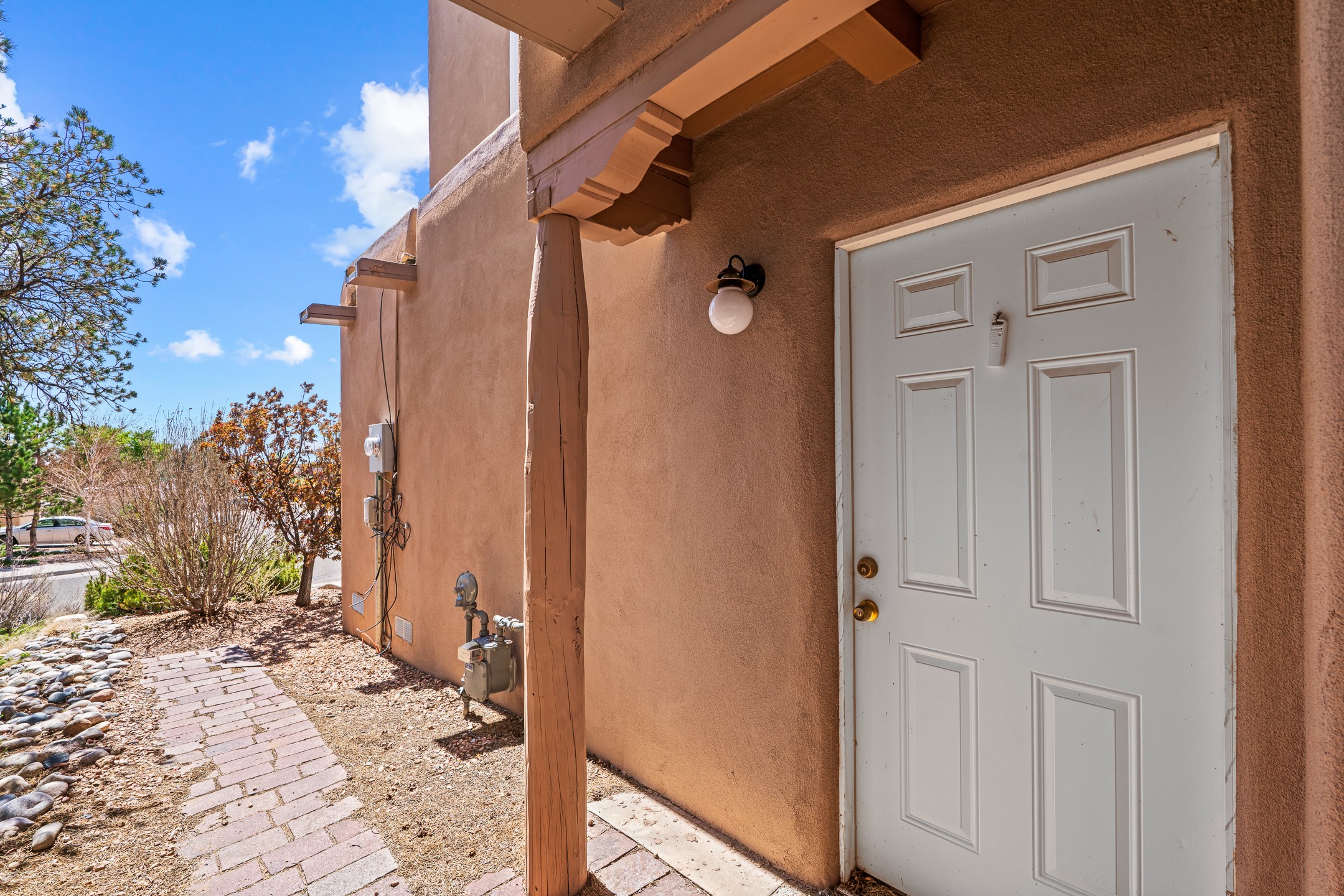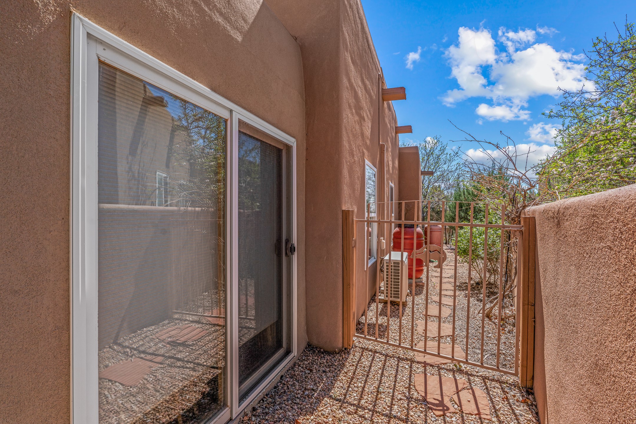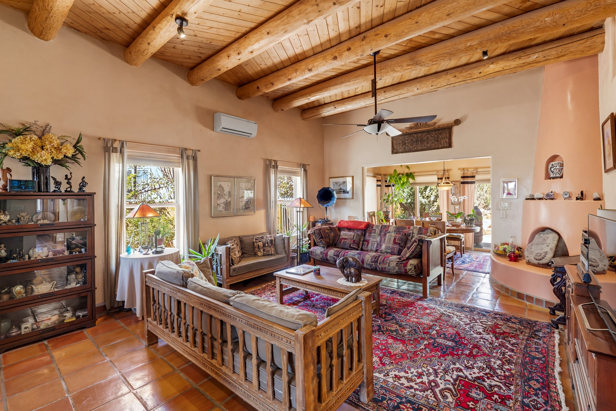 Santa Fe-style home in Pueblos del Sol with 3 bedrooms, 2 baths, and a separate studio above the garage. Built in 2004, the main residence offers approximately 1,625 sq ft, the studio is 425 sq ft, the entire living space is 2,050 sq ft. The layout is practical and consistent, with Saltillo tile flooring throughout and diamond plaster wall finishes. Exposed beams carry through the main living areas, where a wood-burning kiva fireplace anchors the space. A sunroom extends off the living area and opens to the backyard. The kitchen is arranged in a U-shape, allowing for continuous workspace, with Silestone countertops, stainless steel appliances, gas range, and backsplash of hand-painted tile. Storage is distributed across multiple cabinets and work zones. The primary suite includes direct outdoor access and a bath with dual sinks, separate jetted tub and shower. Two additional bedrooms are located near a bath with a walk-in shower. Heating is provided by radiant floor systems via a natural gas boiler, with mini-split units in the living/dining area, primary bedroom, and studio for targeted climate control. The studio above the two-car garage has a separate access point, its own 3/4 bath, and good natural light, supporting use as workspace, guest quarters, or rental. The roof was completely replaced and the parapets reconstructed in 2023; the radiant heat boiler was replaced in 2022, and the gas-fired water heater was replaced in 2021. Located within a neighborhood with established walking paths and access to community amenities, the property is positioned for convenient access to shopping, schools, and main routes across Santa Fe. The combination of solid construction, consistent materials, and flexible auxiliary space supports a range of use scenarios and long-term value.