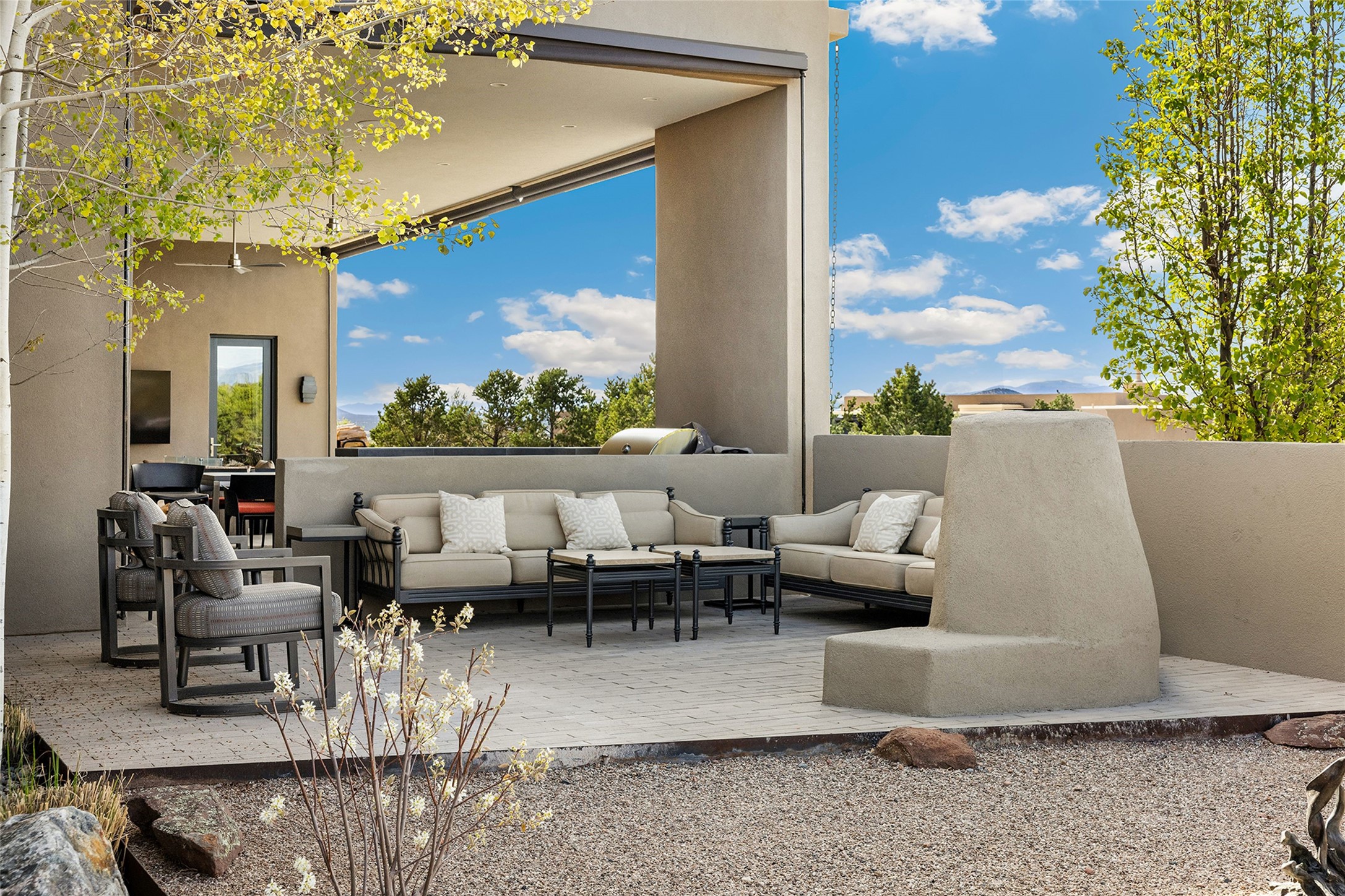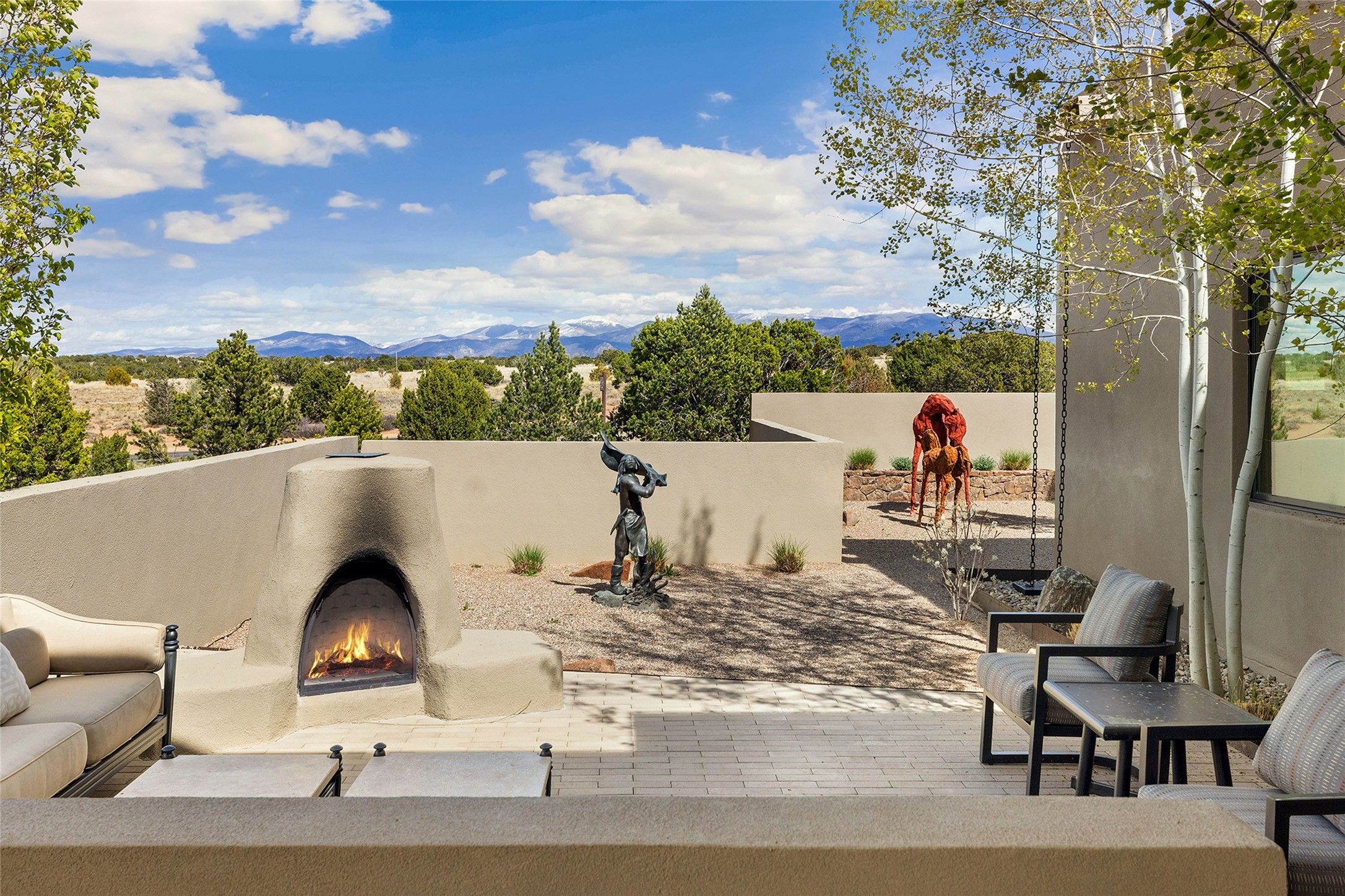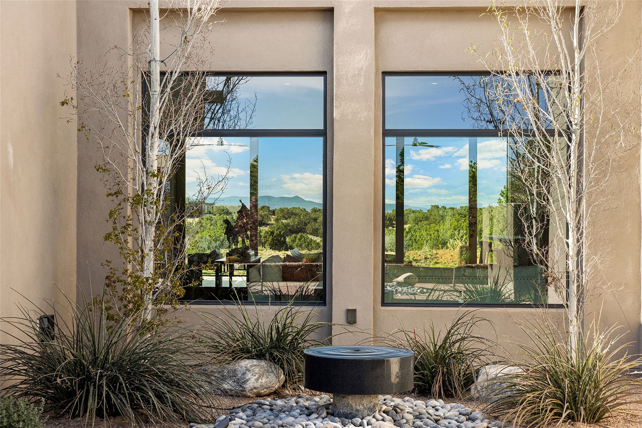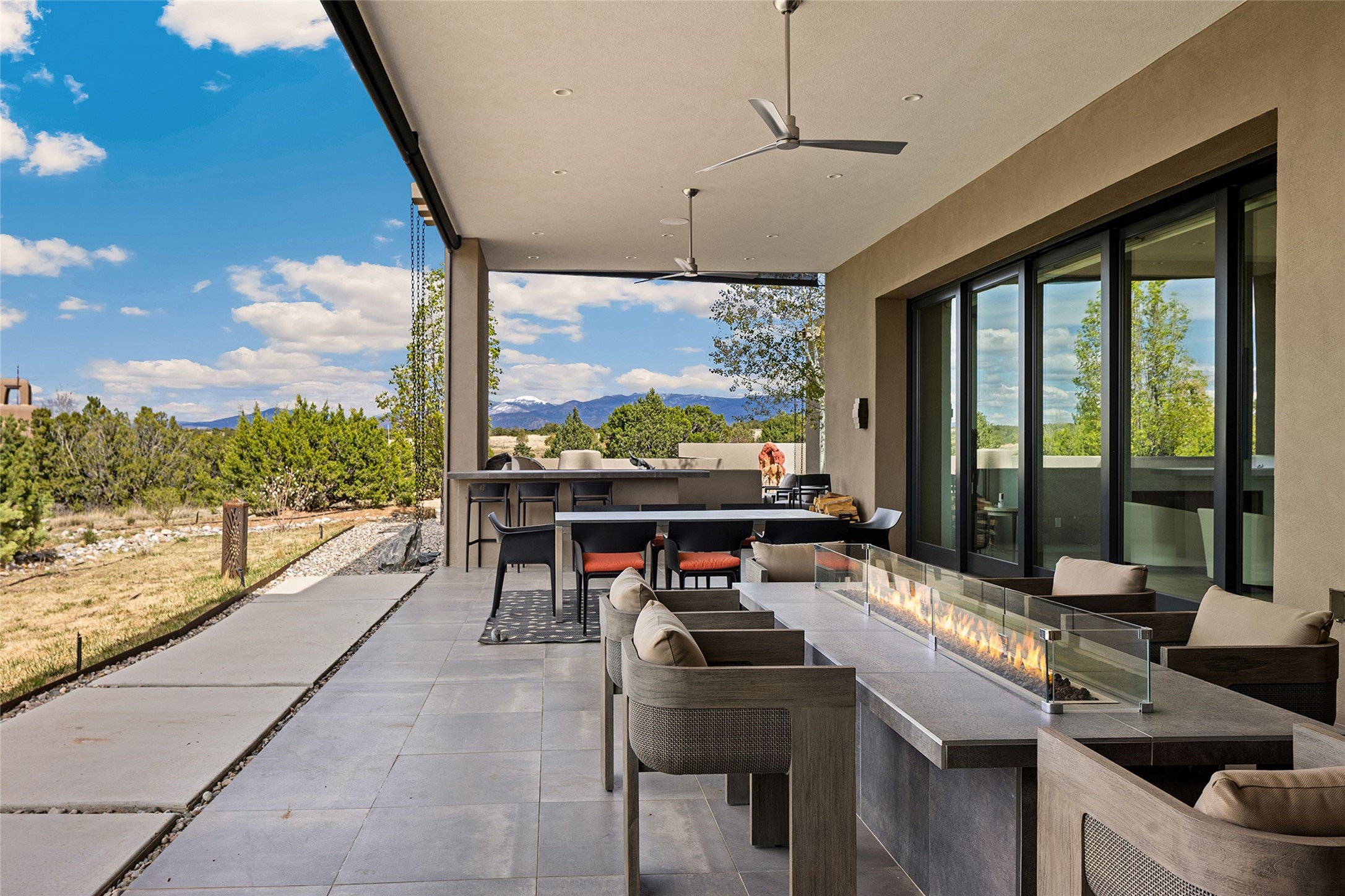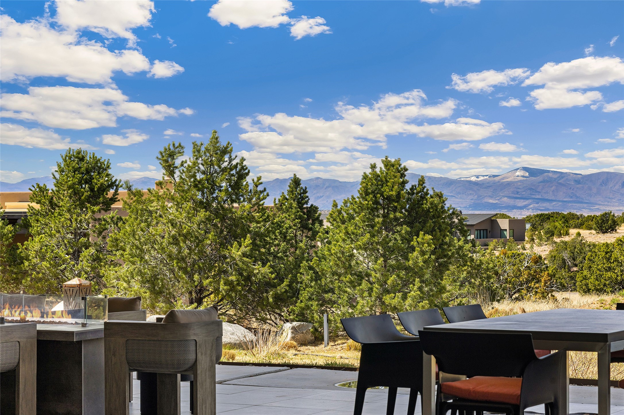 This Las Campanas masterpiece by award-winning builder Frank Yardman defines high-desert luxury. A true architectural tour de force, this sophisticated residence captures sweeping Sangre de Cristo and Jemez Mountain views, blending modern elegance with the quintessential Santa Fe lifestyle. The open-concept living and dining areas are designed for seamless entertaining, featuring retractable glass walls that perfectly frame mountain vistas and create the ultimate indoor-outdoor experience. The chef's kitchen is a culinary delight, equipped with state-of-the-art Thermador appliances, a massive breakfast bar, and a full butler's pantry--all of which opens to the primary dining and entertainment spaces. The spacious, private owner's suite impresses with panoramic mountain views and a spa-inspired bath featuring a glass shower, freestanding soaking tub, dual vanities, a vanity closet, and two large walk-in closets. Located in separate wings of the home, two additional ensuite bedrooms offer comfort and privacy for guests. Versatility abounds with a generous office featuring built-in cabinetry, an exercise room (or secondary office), and a cozy media den located directly off the kitchen. The incredible outdoor living experience was designed by renowned landscape architect Solange Serquis. Recent updates include a modern concrete driveway and a custom metal entrance gate that sets a tone of sophistication. The outdoor living areas have been further expanded with courtyard walls, premium hardscaping, and a kiva fireplace situated perfectly off the outdoor kitchen. Located just minutes from the world-class amenities of The Club at Las Campanas, this exceptional residence is move-in ready. Most furnishings and the owner's Equity Golf Membership are also available for purchase on a separate bill of sale.