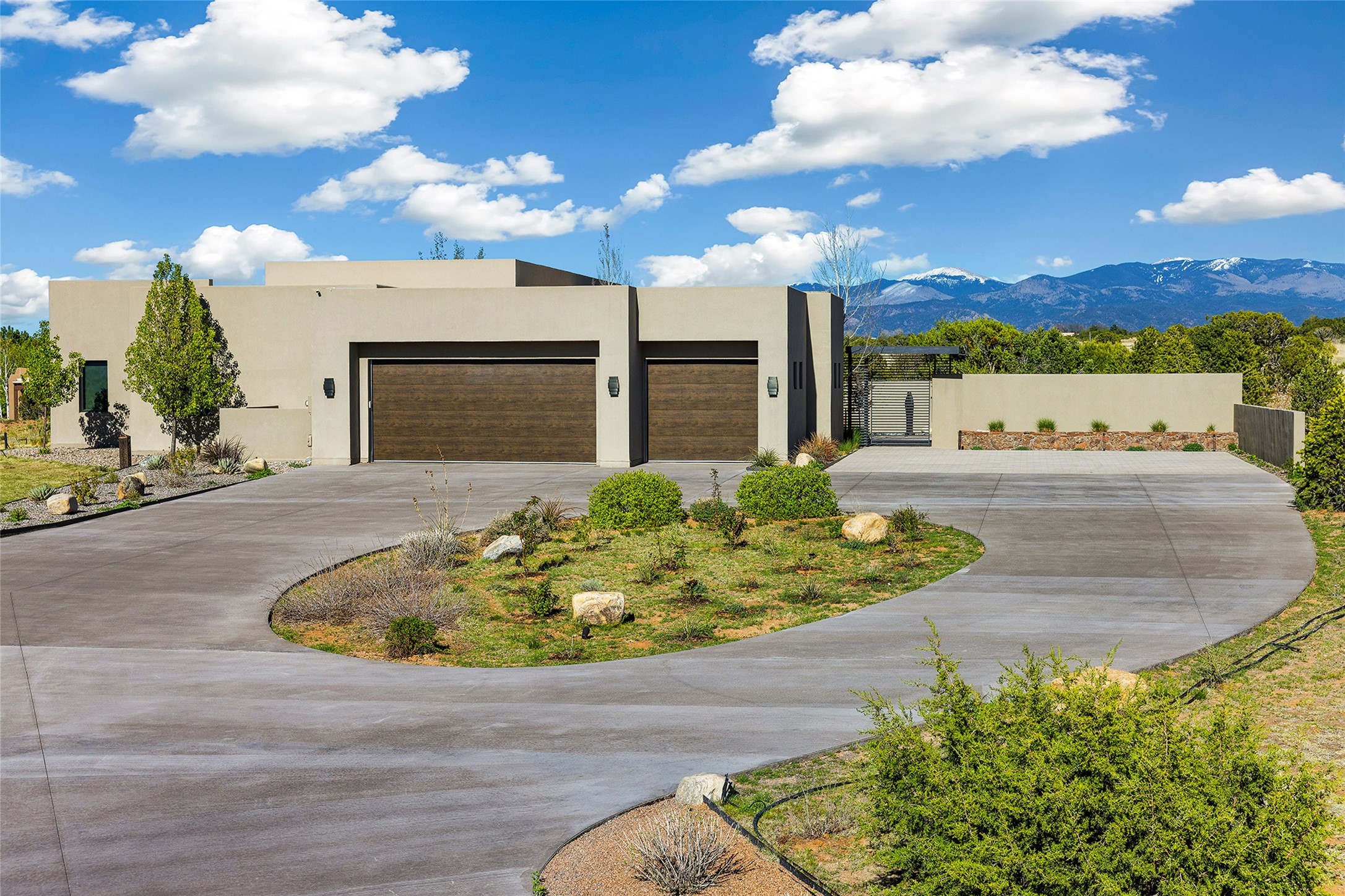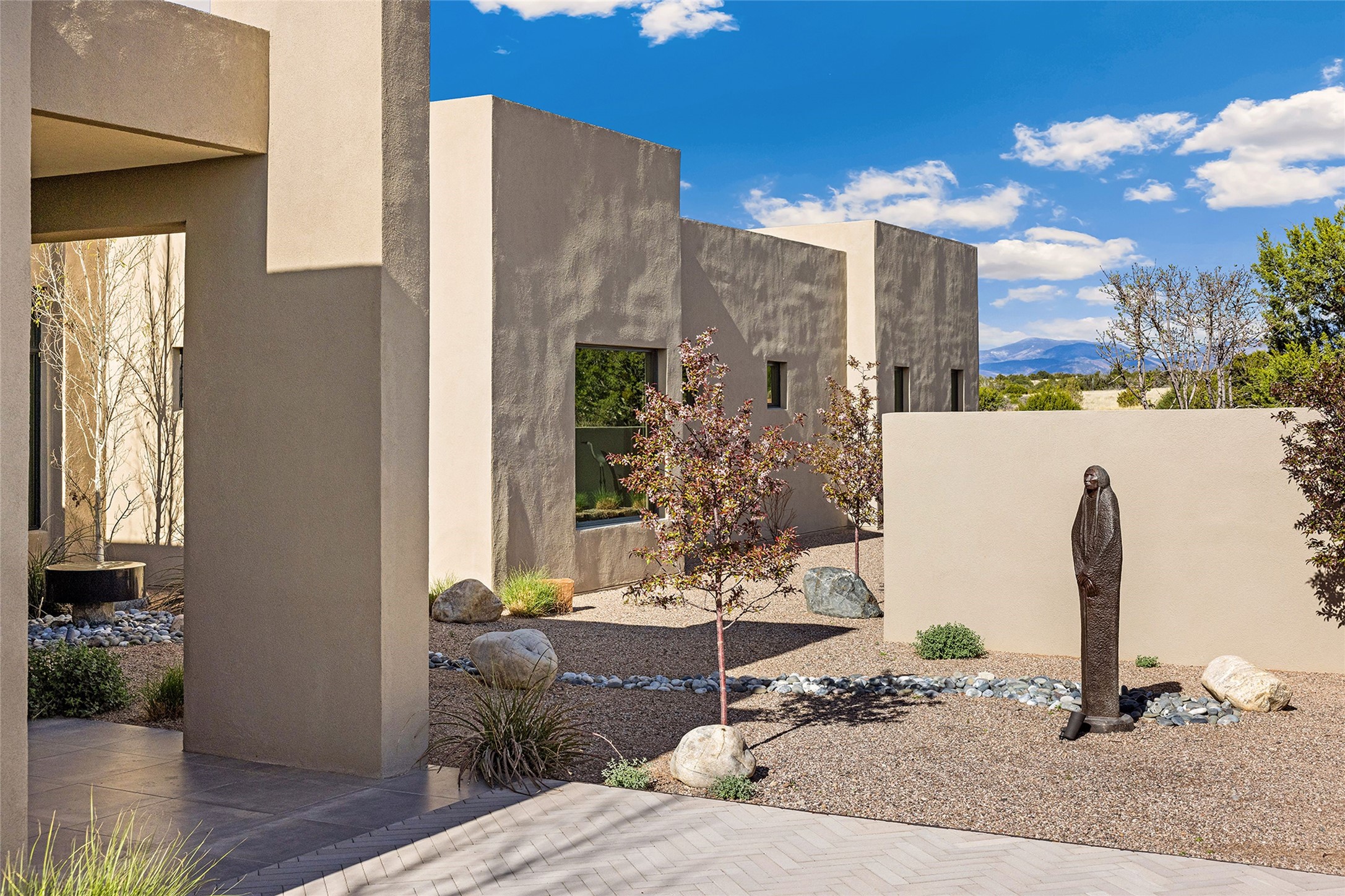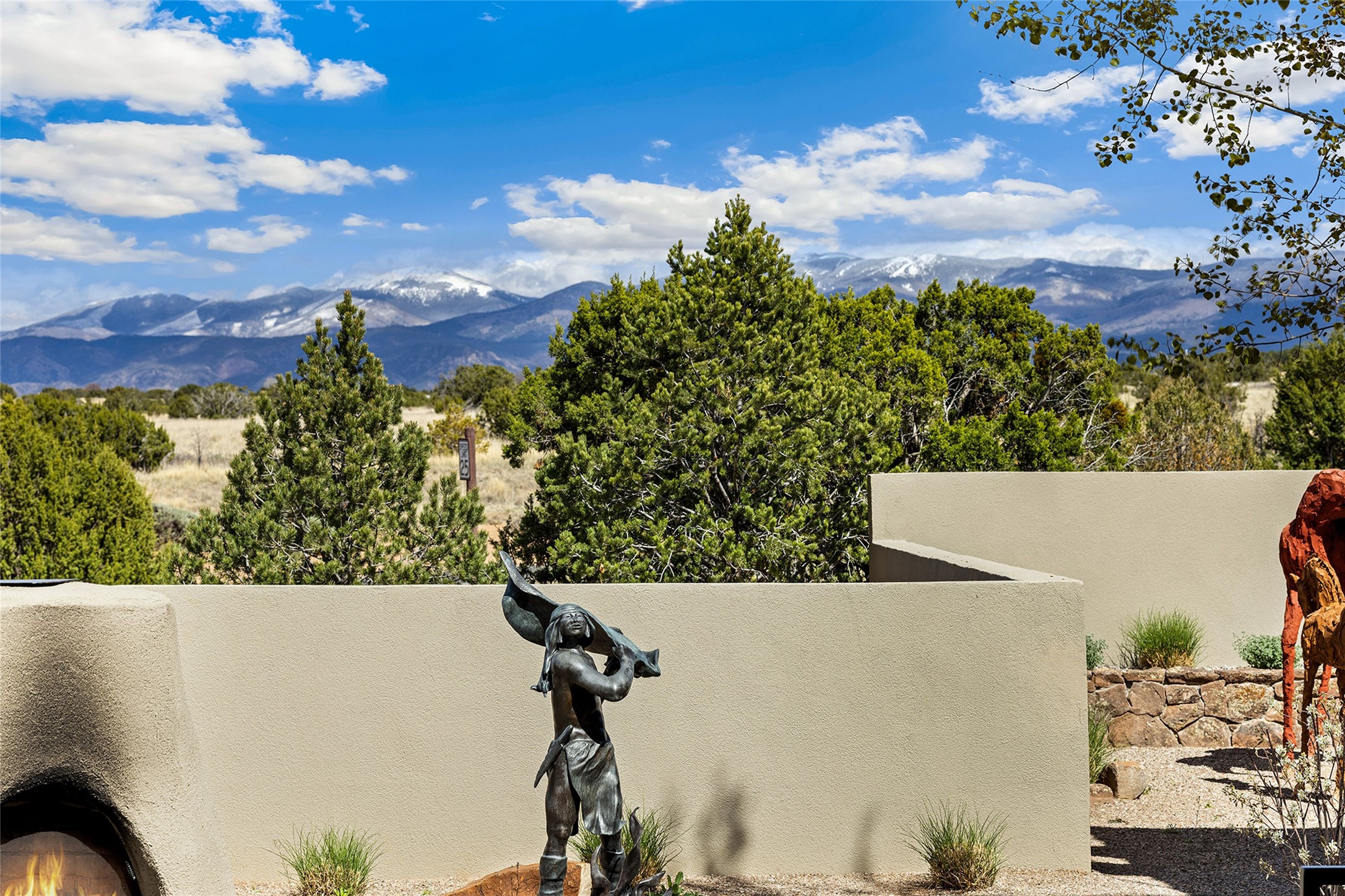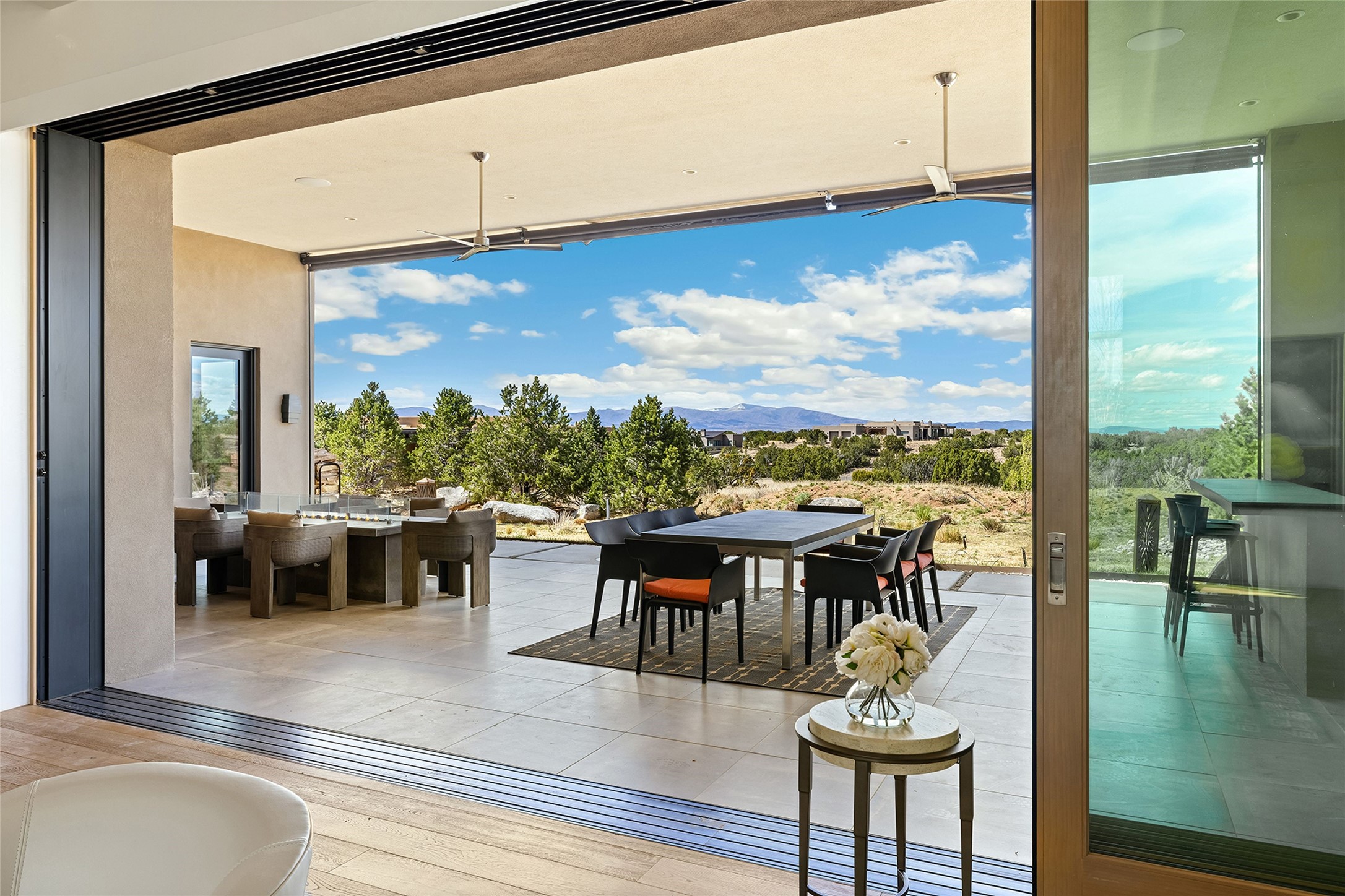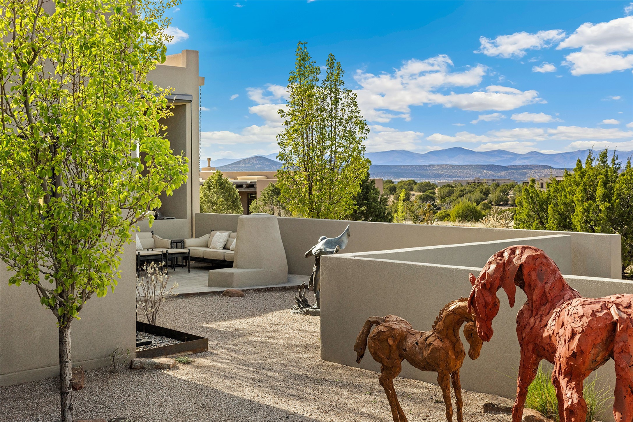 This Las Campanas masterpiece by award-winning builder Frank Yardman defines high-desert luxury. A true architectural tour de force, this sophisticated residence captures sweeping Sangre de Cristo and Jemez Mountain views, blending modern elegance with the quintessential Santa Fe lifestyle. The open-concept living and dining areas are designed for seamless entertaining, featuring retractable glass walls that perfectly frame mountain vistas and create the ultimate indoor-outdoor experience. The chef's kitchen is a culinary delight, equipped with state-of-the-art Thermador appliances, a massive breakfast bar, and a full butler's pantry--all of which opens to the primary dining and entertainment spaces. The spacious, private owner's suite impresses with panoramic mountain views and a spa-inspired bath featuring a glass shower, freestanding soaking tub, dual vanities, a vanity closet, and two large walk-in closets. Located in separate wings of the home, two additional ensuite bedrooms offer comfort and privacy for guests. Versatility abounds with a generous office featuring built-in cabinetry, an exercise room (or secondary office), and a cozy media den located directly off the kitchen. The incredible outdoor living experience was designed by renowned landscape architect Solange Serquis. Recent updates include a modern concrete driveway and a custom metal entrance gate that sets a tone of sophistication. The outdoor living areas have been further expanded with courtyard walls, premium hardscaping, and a kiva fireplace situated perfectly off the outdoor kitchen. Located just minutes from the world-class amenities of The Club at Las Campanas, this exceptional residence is move-in ready. Most furnishings and the owner's Equity Golf Membership are also available for purchase on a separate bill of sale.