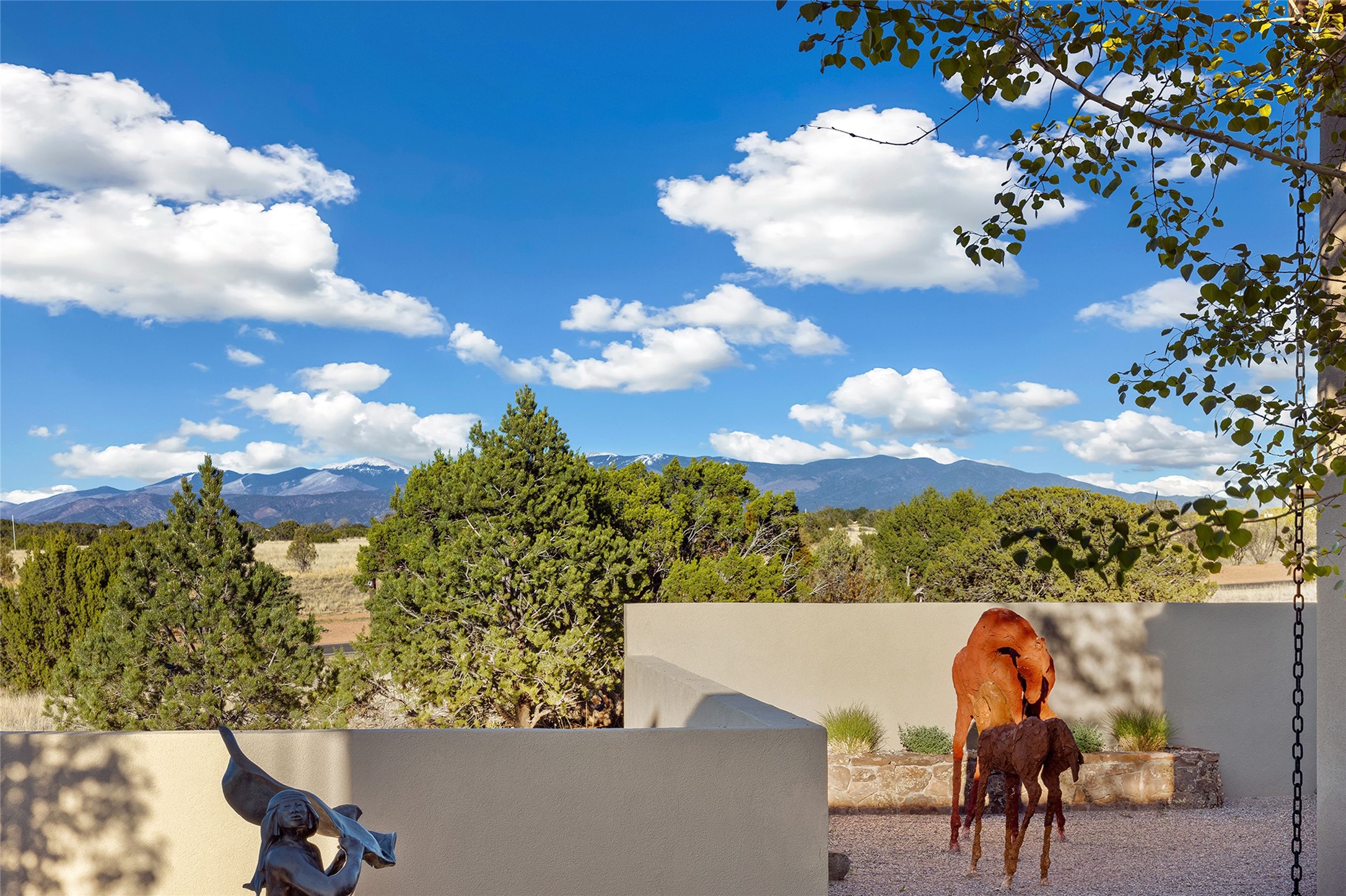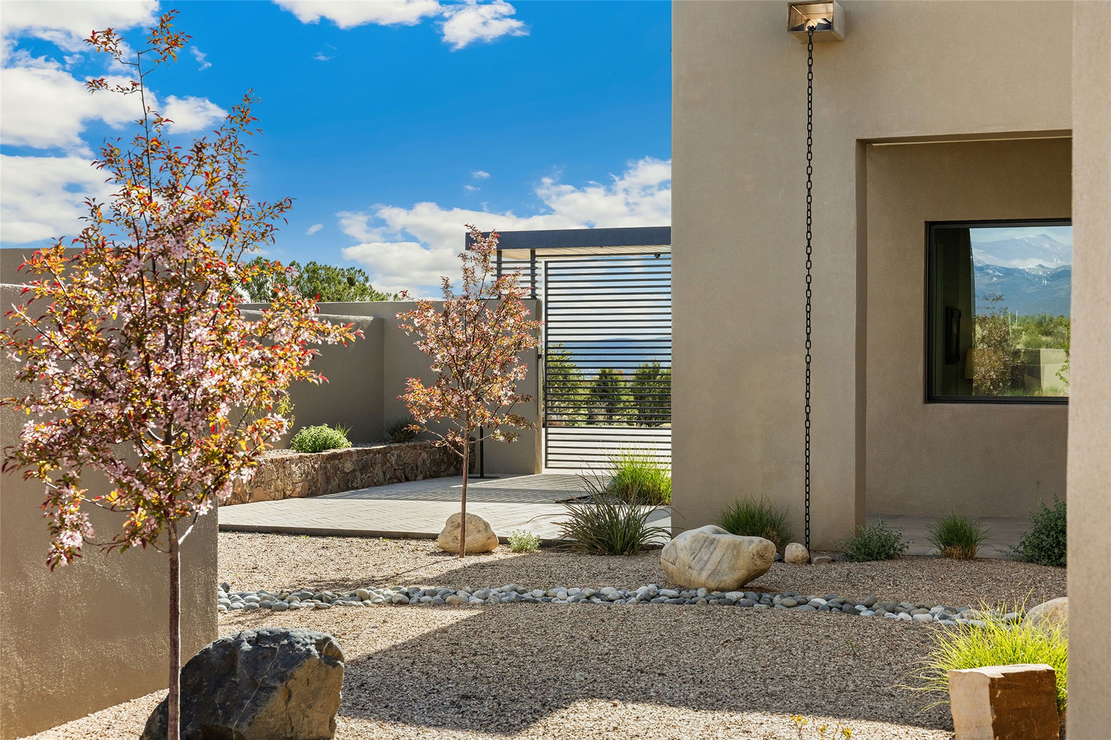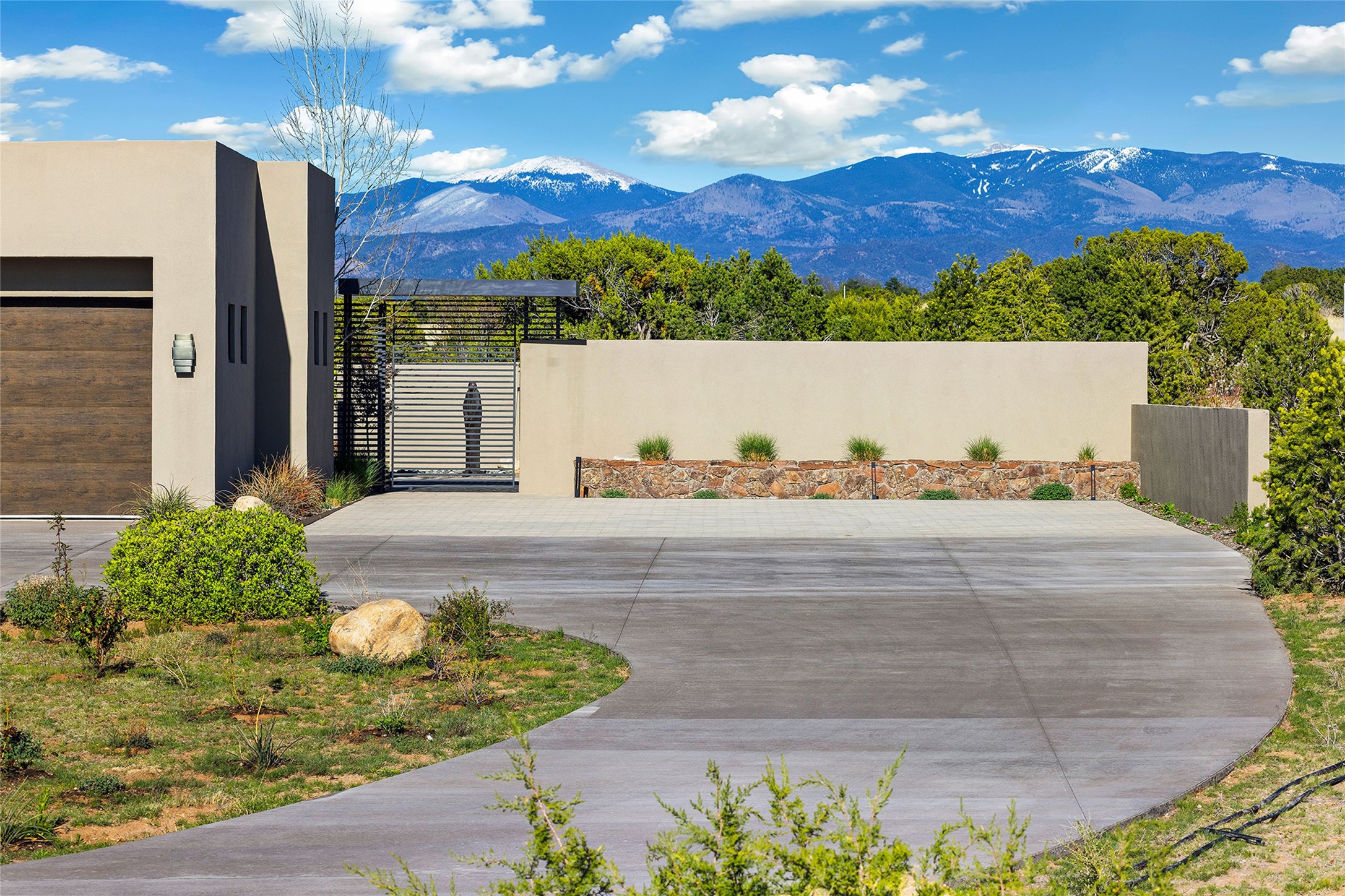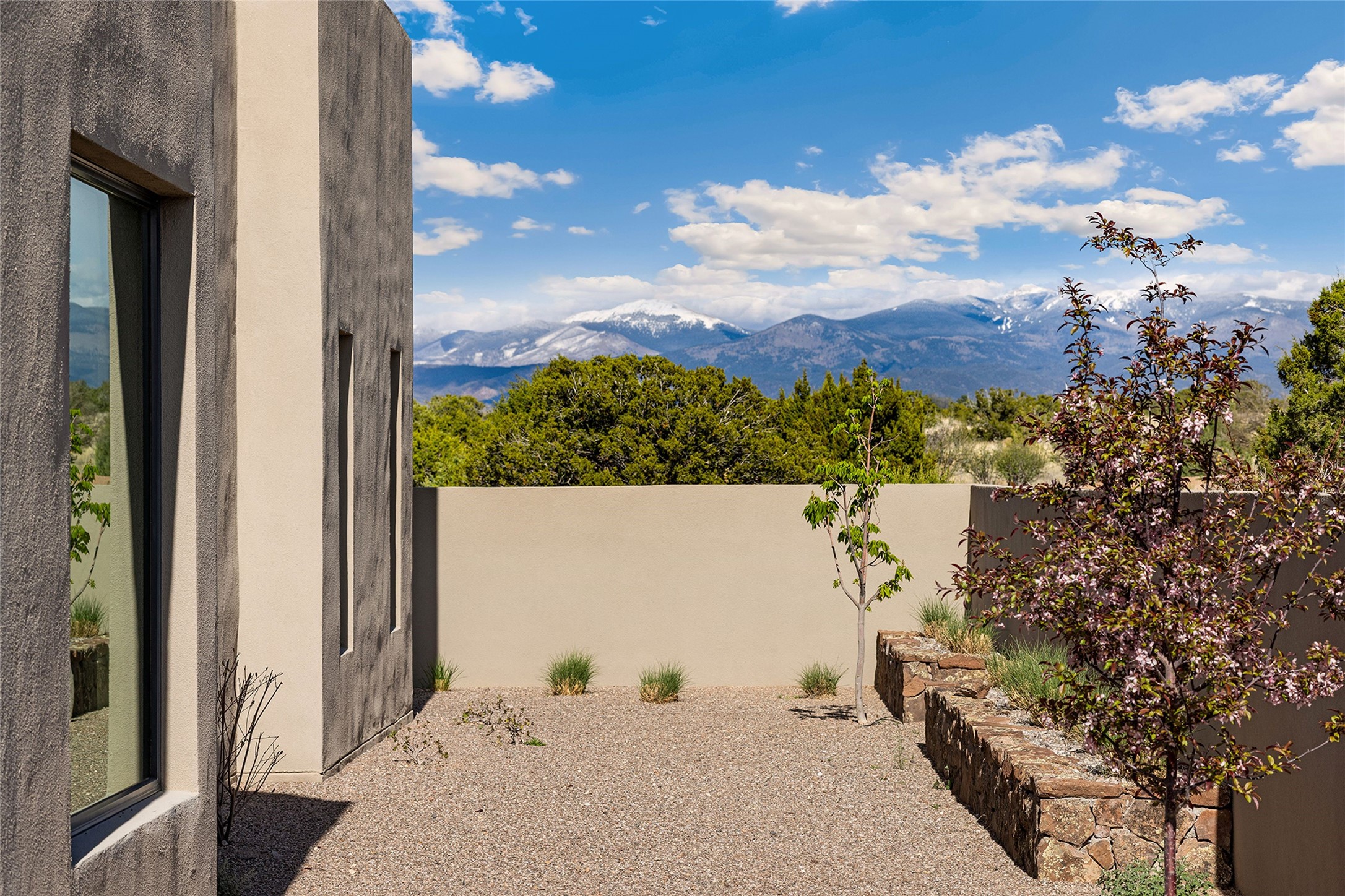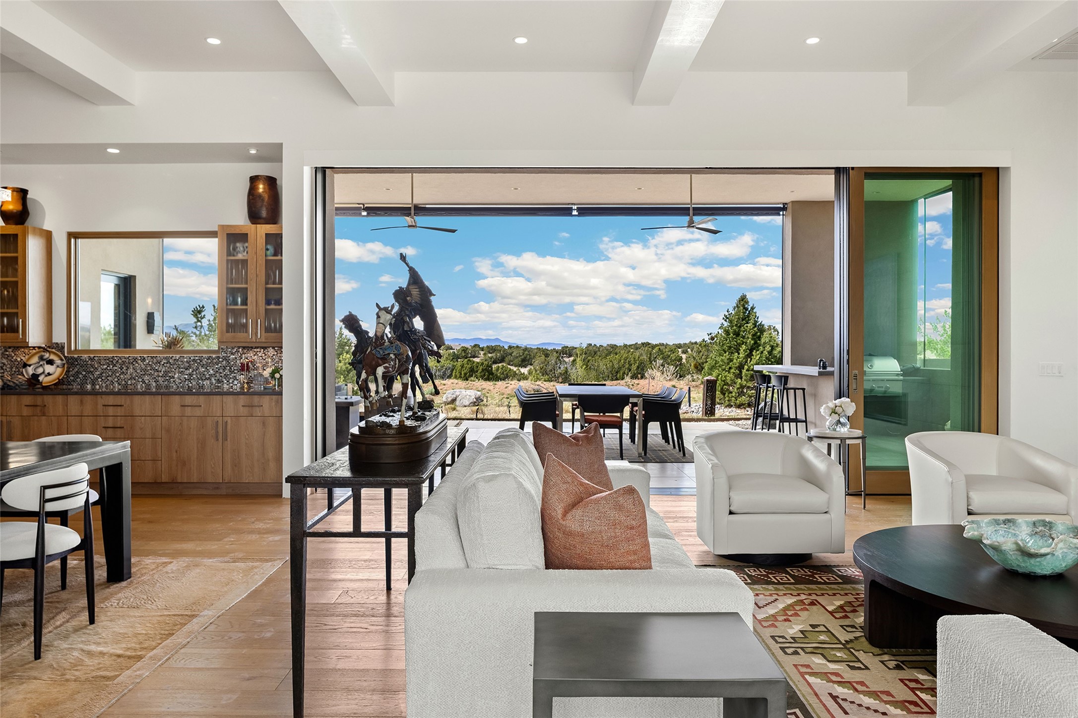 This Las Campanas masterpiece by award-winning builder Frank Yardman defines high-desert luxury. A true architectural tour de force, this sophisticated residence captures sweeping Sangre de Cristo and Jemez Mountain views, blending modern elegance with the quintessential Santa Fe lifestyle. The open-concept living and dining areas are designed for seamless entertaining, featuring retractable glass walls that perfectly frame mountain vistas and create the ultimate indoor-outdoor experience. The chef's kitchen is a culinary delight, equipped with state-of-the-art Thermador appliances, a massive breakfast bar, and a full butler's pantry--all of which opens to the primary dining and entertainment spaces. The spacious, private owner's suite impresses with panoramic mountain views and a spa-inspired bath featuring a glass shower, freestanding soaking tub, dual vanities, a vanity closet, and two large walk-in closets. Located in separate wings of the home, two additional ensuite bedrooms offer comfort and privacy for guests. Versatility abounds with a generous office featuring built-in cabinetry, an exercise room (or secondary office), and a cozy media den located directly off the kitchen. The incredible outdoor living experience was designed by renowned landscape architect Solange Serquis. Recent updates include a modern concrete driveway and a custom metal entrance gate that sets a tone of sophistication. The outdoor living areas have been further expanded with courtyard walls, premium hardscaping, and a kiva fireplace situated perfectly off the outdoor kitchen. Located just minutes from the world-class amenities of The Club at Las Campanas, this exceptional residence is move-in ready. Most furnishings and the owner's Equity Golf Membership are also available for purchase on a separate bill of sale.