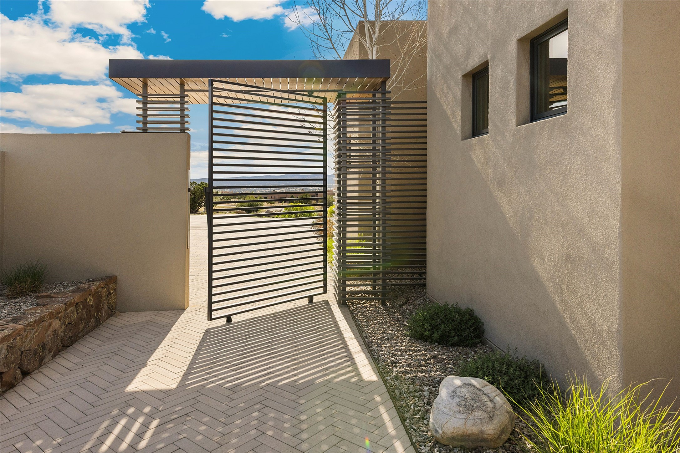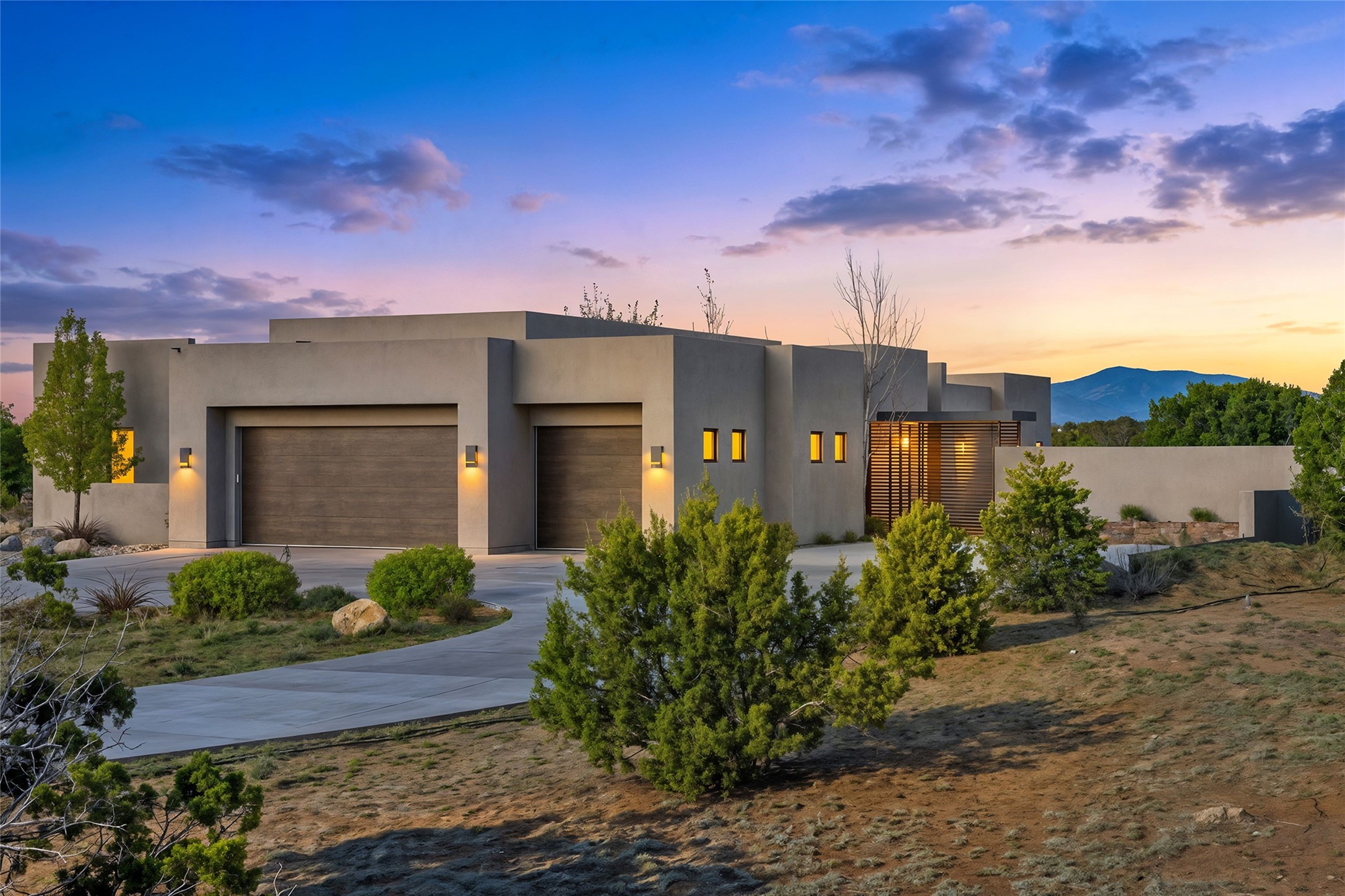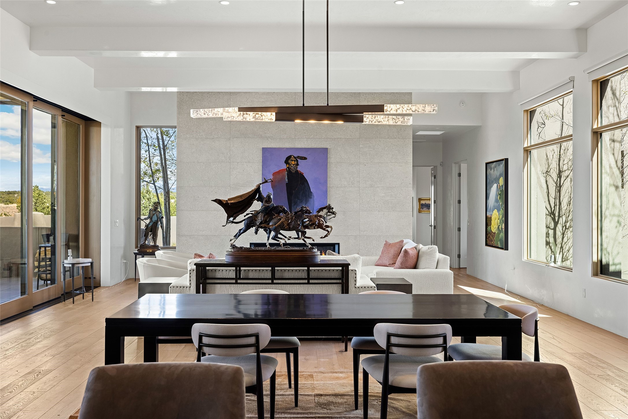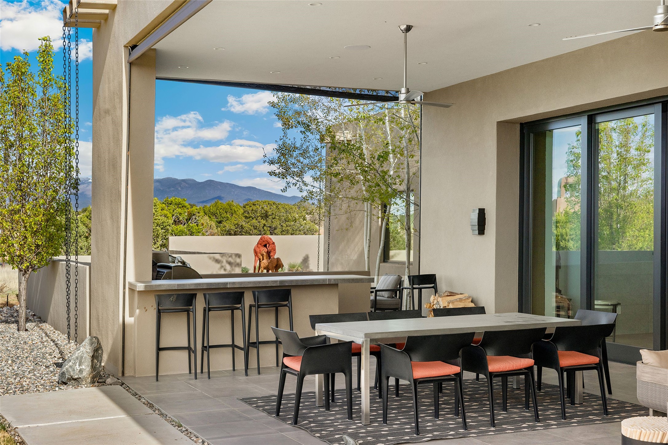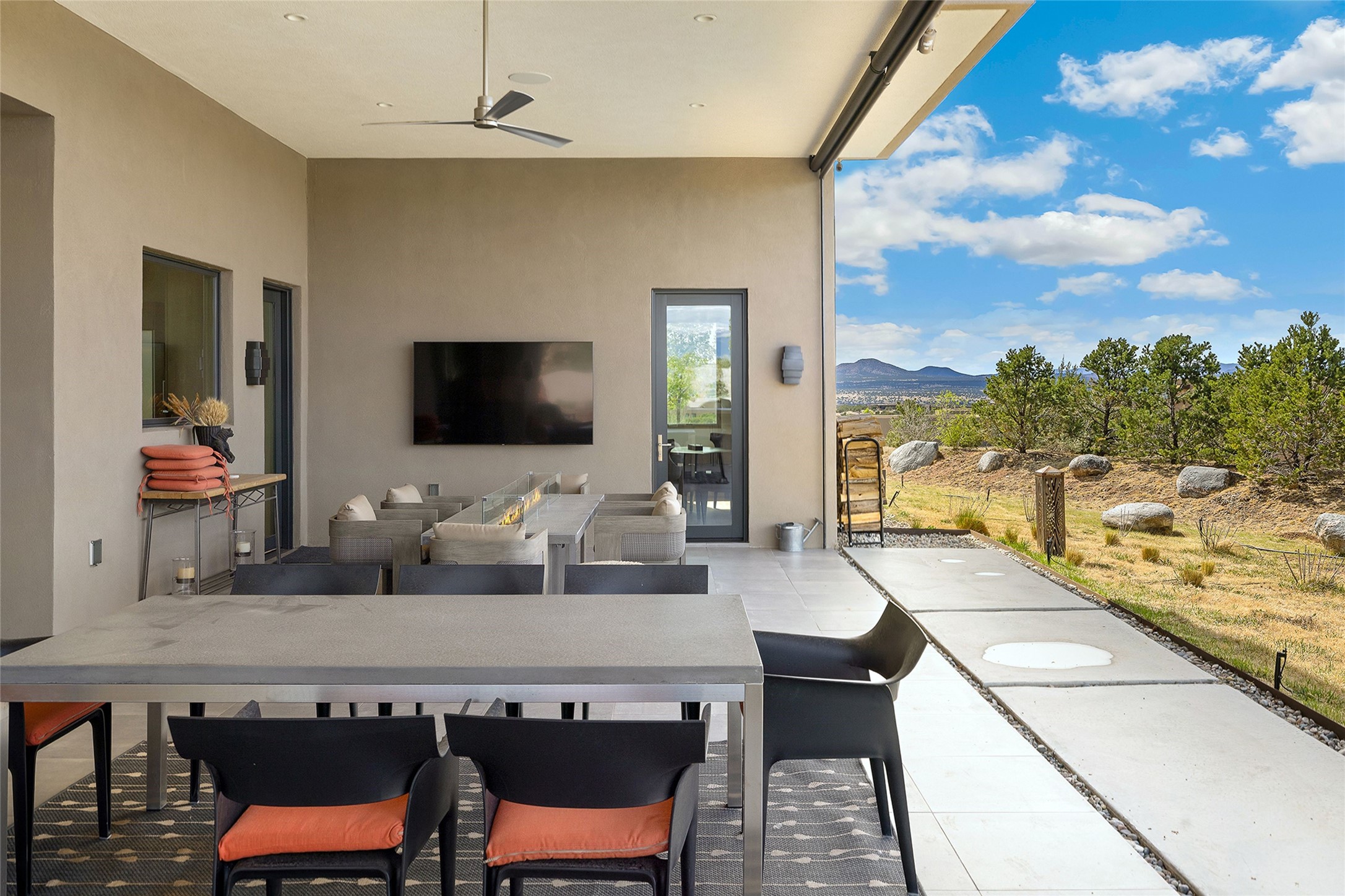 This Las Campanas masterpiece by award-winning builder Frank Yardman defines high-desert luxury. A true architectural tour de force, this sophisticated residence captures sweeping Sangre de Cristo and Jemez Mountain views, blending modern elegance with the quintessential Santa Fe lifestyle. The open-concept living and dining areas are designed for seamless entertaining, featuring retractable glass walls that perfectly frame mountain vistas and create the ultimate indoor-outdoor experience. The chef's kitchen is a culinary delight, equipped with state-of-the-art Thermador appliances, a massive breakfast bar, and a full butler's pantry--all of which opens to the primary dining and entertainment spaces. The spacious, private owner's suite impresses with panoramic mountain views and a spa-inspired bath featuring a glass shower, freestanding soaking tub, dual vanities, a vanity closet, and two large walk-in closets. Located in separate wings of the home, two additional ensuite bedrooms offer comfort and privacy for guests. Versatility abounds with a generous office featuring built-in cabinetry, an exercise room (or secondary office), and a cozy media den located directly off the kitchen. The incredible outdoor living experience was designed by renowned landscape architect Solange Serquis. Recent updates include a modern concrete driveway and a custom metal entrance gate that sets a tone of sophistication. The outdoor living areas have been further expanded with courtyard walls, premium hardscaping, and a kiva fireplace situated perfectly off the outdoor kitchen. Located just minutes from the world-class amenities of The Club at Las Campanas, this exceptional residence is move-in ready. Most furnishings and the owner's Equity Golf Membership are also available for purchase on a separate bill of sale.