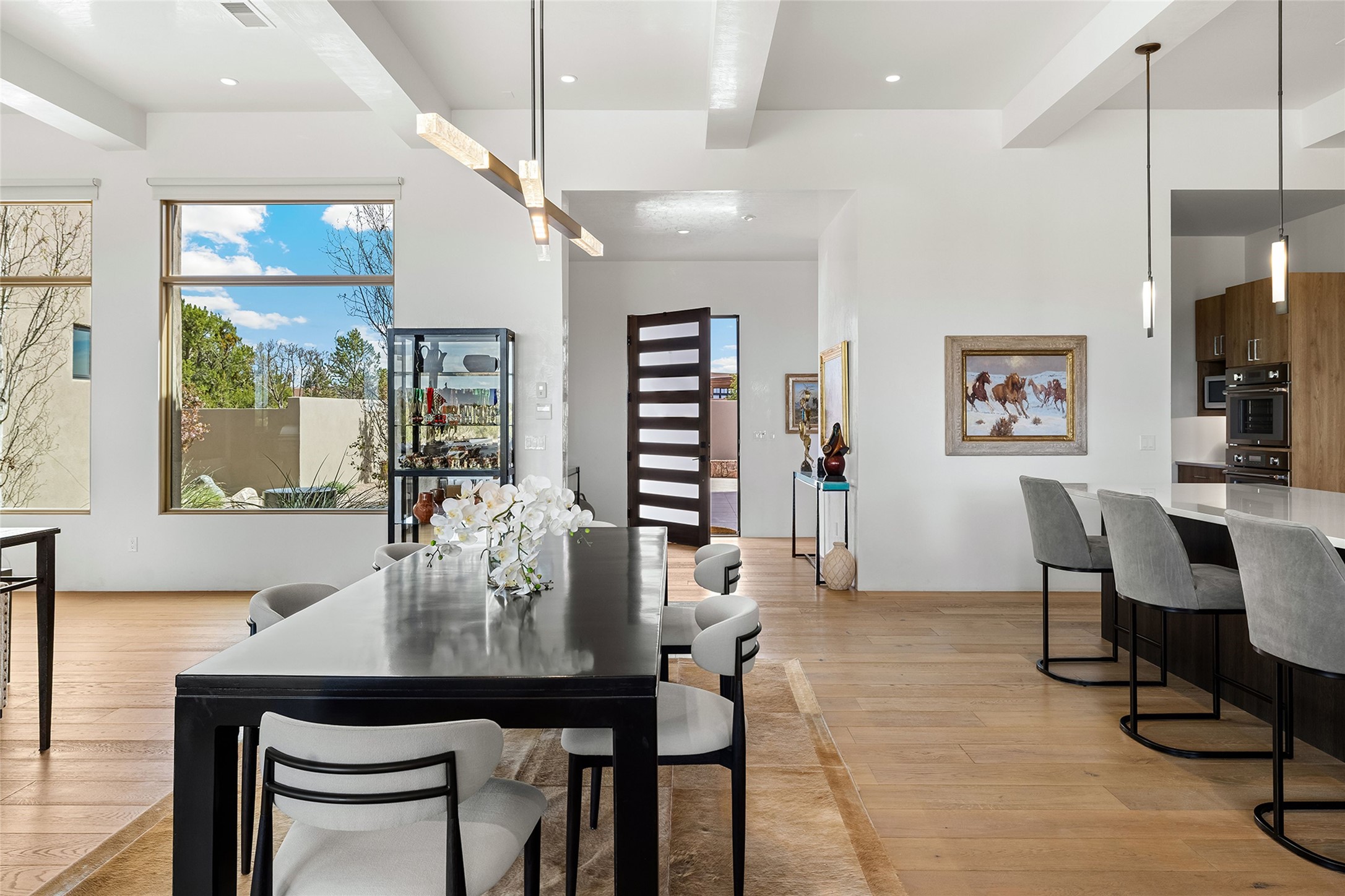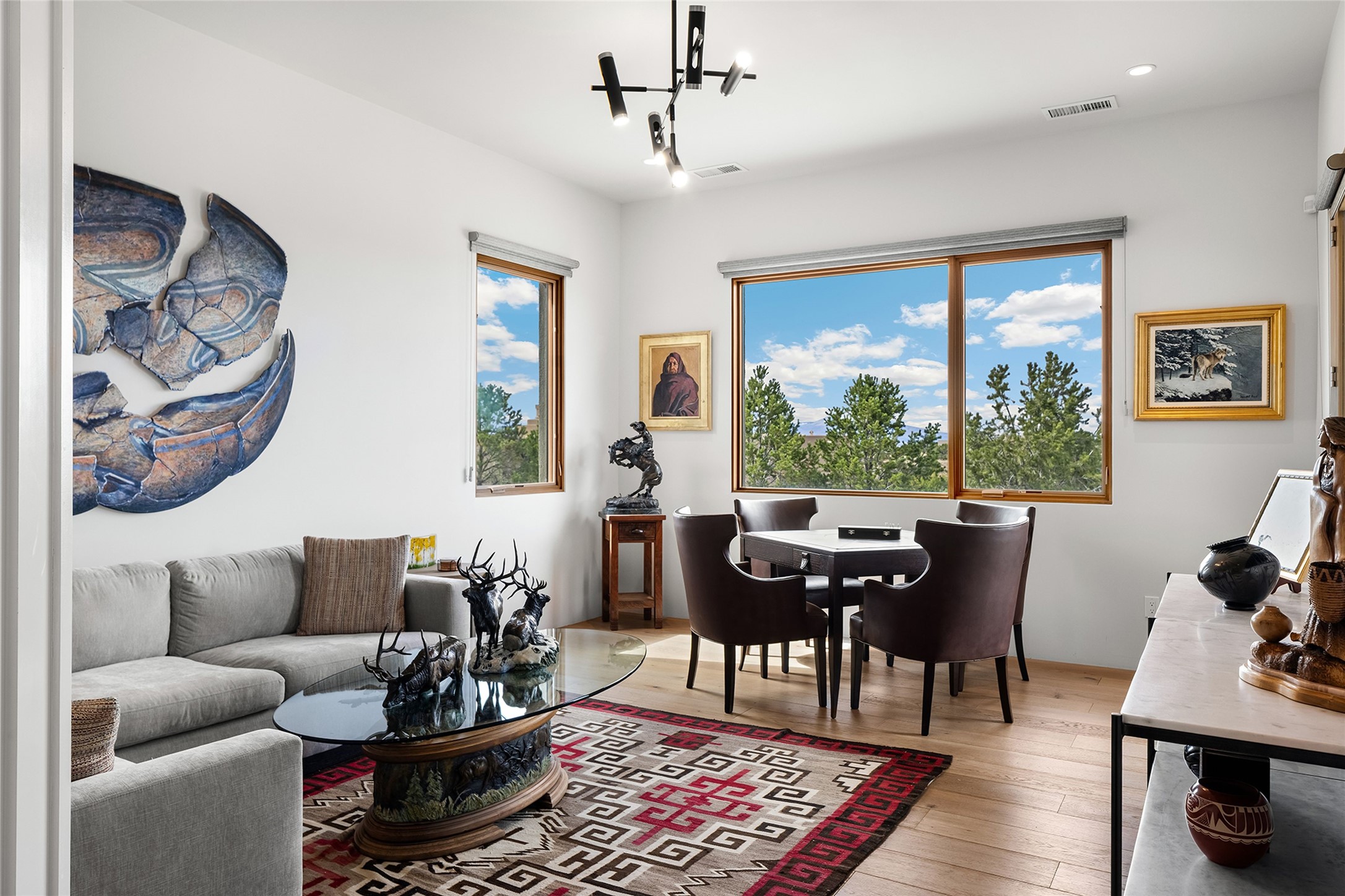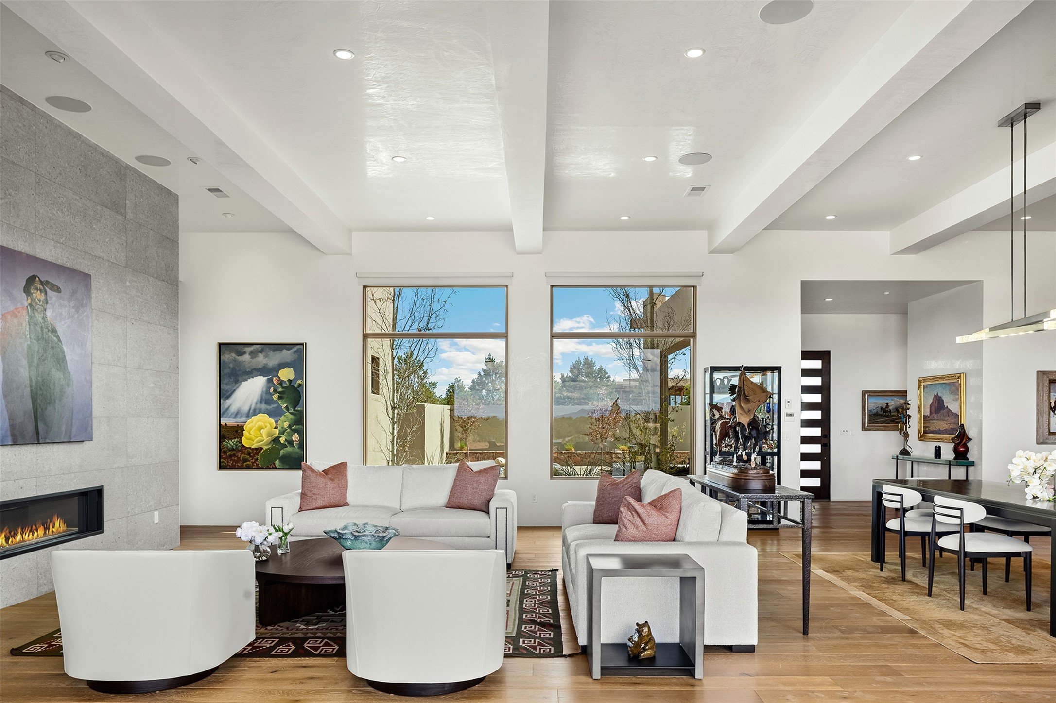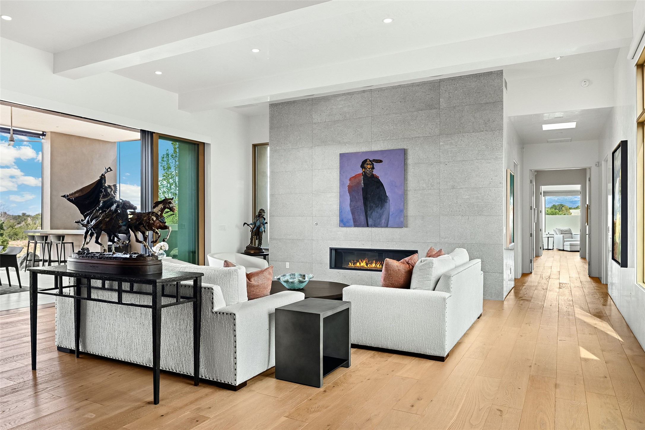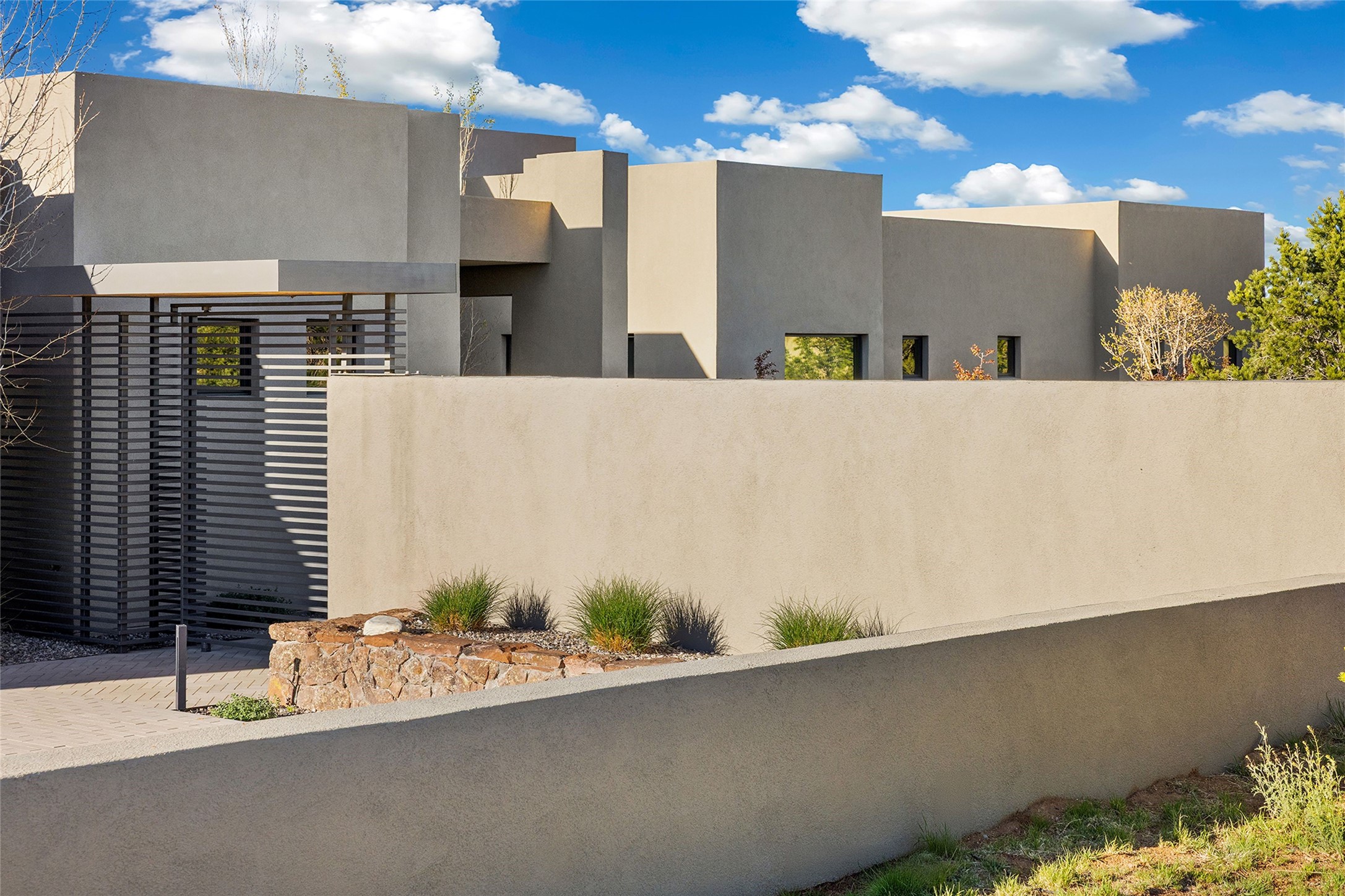 This Las Campanas masterpiece by award-winning builder Frank Yardman defines high-desert luxury. A true architectural tour de force, this sophisticated residence captures sweeping Sangre de Cristo and Jemez Mountain views, blending modern elegance with the quintessential Santa Fe lifestyle. The open-concept living and dining areas are designed for seamless entertaining, featuring retractable glass walls that perfectly frame mountain vistas and create the ultimate indoor-outdoor experience. The chef's kitchen is a culinary delight, equipped with state-of-the-art Thermador appliances, a massive breakfast bar, and a full butler's pantry--all of which opens to the primary dining and entertainment spaces. The spacious, private owner's suite impresses with panoramic mountain views and a spa-inspired bath featuring a glass shower, freestanding soaking tub, dual vanities, a vanity closet, and two large walk-in closets. Located in separate wings of the home, two additional ensuite bedrooms offer comfort and privacy for guests. Versatility abounds with a generous office featuring built-in cabinetry, an exercise room (or secondary office), and a cozy media den located directly off the kitchen. The incredible outdoor living experience was designed by renowned landscape architect Solange Serquis. Recent updates include a modern concrete driveway and a custom metal entrance gate that sets a tone of sophistication. The outdoor living areas have been further expanded with courtyard walls, premium hardscaping, and a kiva fireplace situated perfectly off the outdoor kitchen. Located just minutes from the world-class amenities of The Club at Las Campanas, this exceptional residence is move-in ready. Most furnishings and the owner's Equity Golf Membership are also available for purchase on a separate bill of sale.