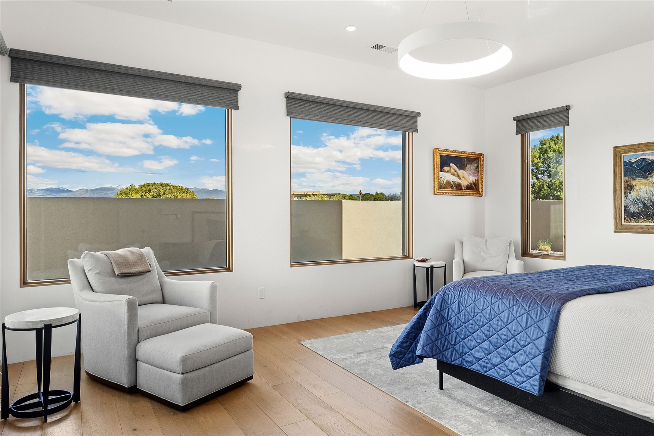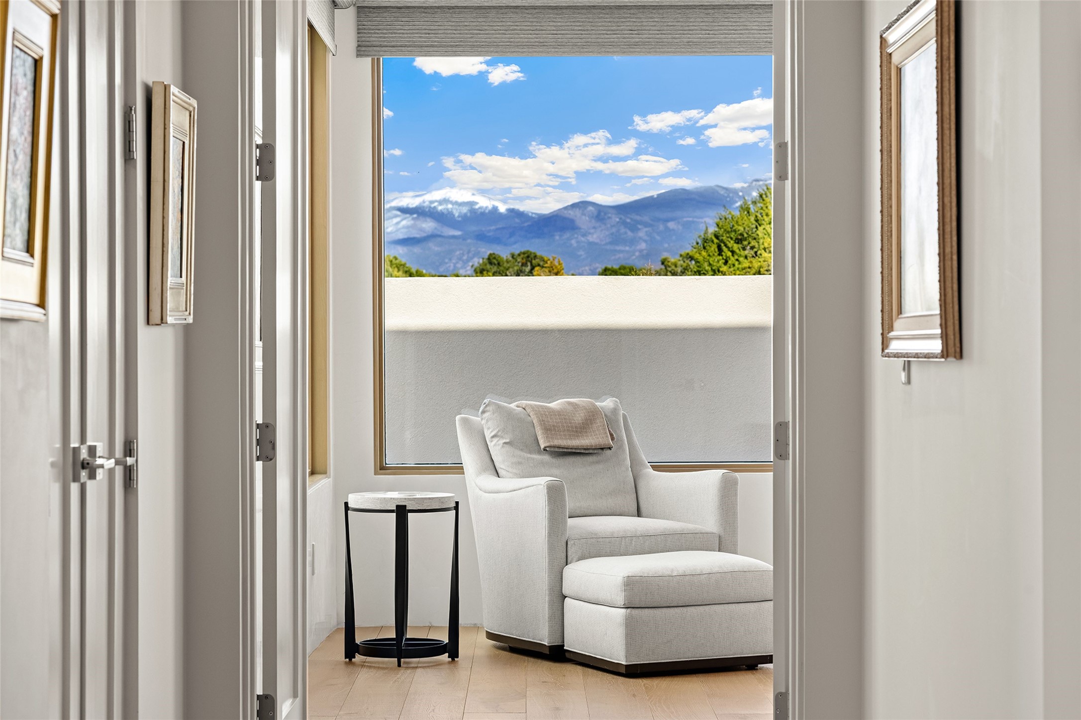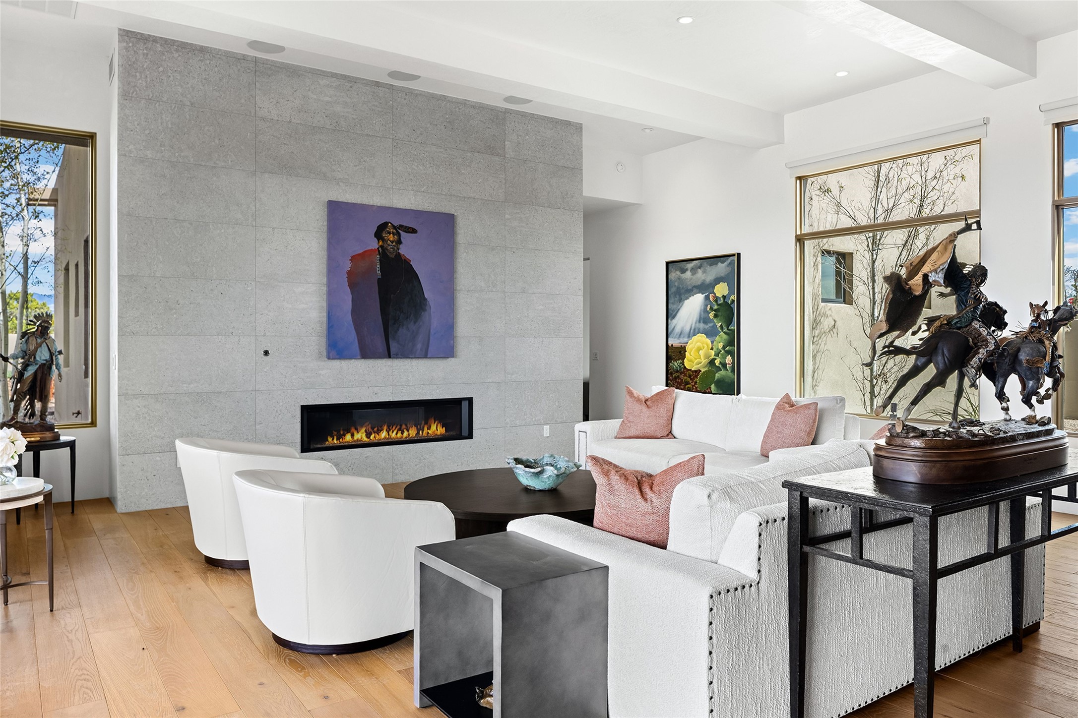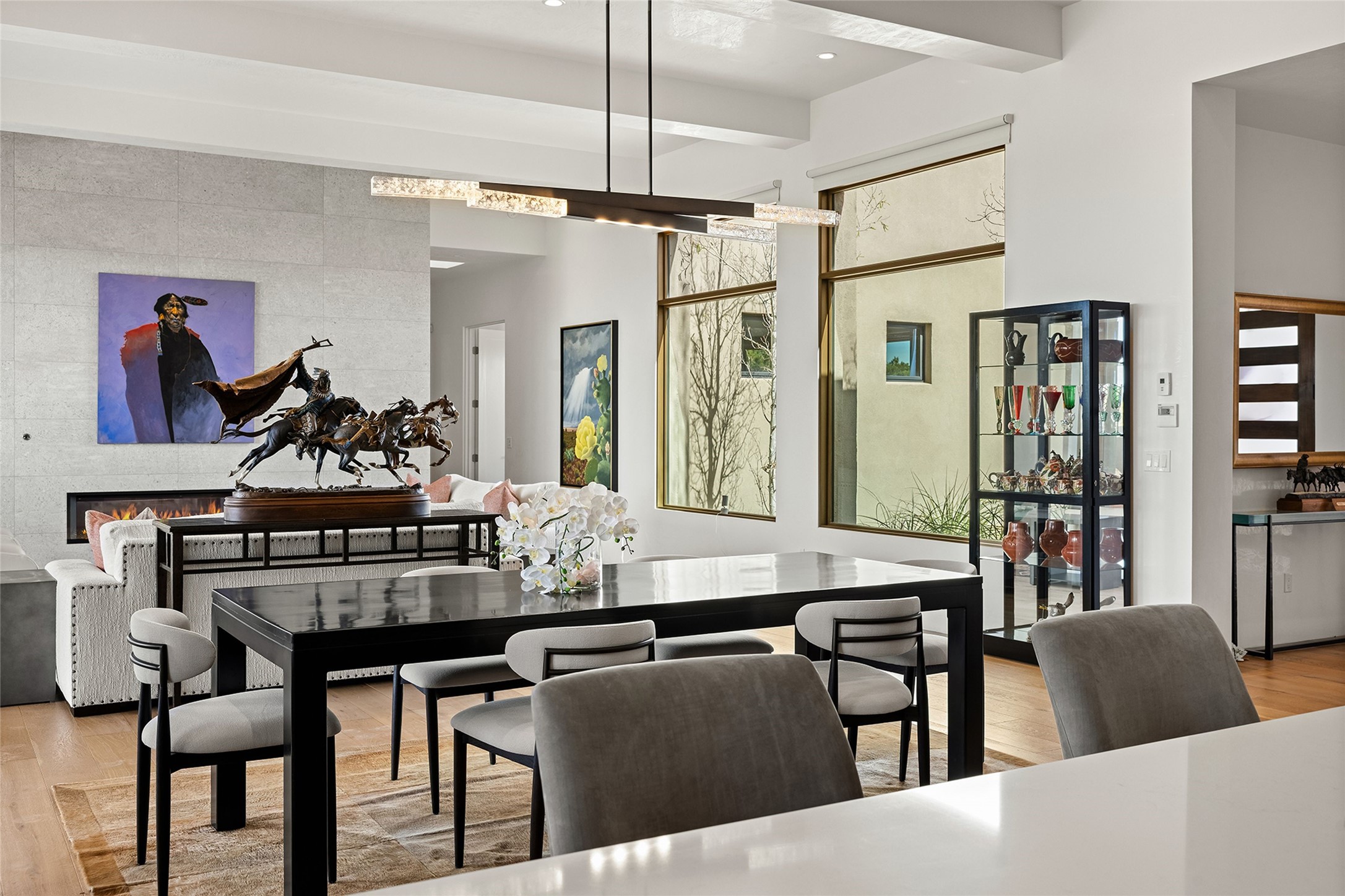 This Las Campanas masterpiece by award-winning builder Frank Yardman defines high-desert luxury. A true architectural tour de force, this sophisticated residence captures sweeping Sangre de Cristo and Jemez Mountain views, blending modern elegance with the quintessential Santa Fe lifestyle. The open-concept living and dining areas are designed for seamless entertaining, featuring retractable glass walls that perfectly frame mountain vistas and create the ultimate indoor-outdoor experience. The chef's kitchen is a culinary delight, equipped with state-of-the-art Thermador appliances, a massive breakfast bar, and a full butler's pantry--all of which opens to the primary dining and entertainment spaces. The spacious, private owner's suite impresses with panoramic mountain views and a spa-inspired bath featuring a glass shower, freestanding soaking tub, dual vanities, a vanity closet, and two large walk-in closets. Located in separate wings of the home, two additional ensuite bedrooms offer comfort and privacy for guests. Versatility abounds with a generous office featuring built-in cabinetry, an exercise room (or secondary office), and a cozy media den located directly off the kitchen. The incredible outdoor living experience was designed by renowned landscape architect Solange Serquis. Recent updates include a modern concrete driveway and a custom metal entrance gate that sets a tone of sophistication. The outdoor living areas have been further expanded with courtyard walls, premium hardscaping, and a kiva fireplace situated perfectly off the outdoor kitchen. Located just minutes from the world-class amenities of The Club at Las Campanas, this exceptional residence is move-in ready. Most furnishings and the owner's Equity Golf Membership are also available for purchase on a separate bill of sale.