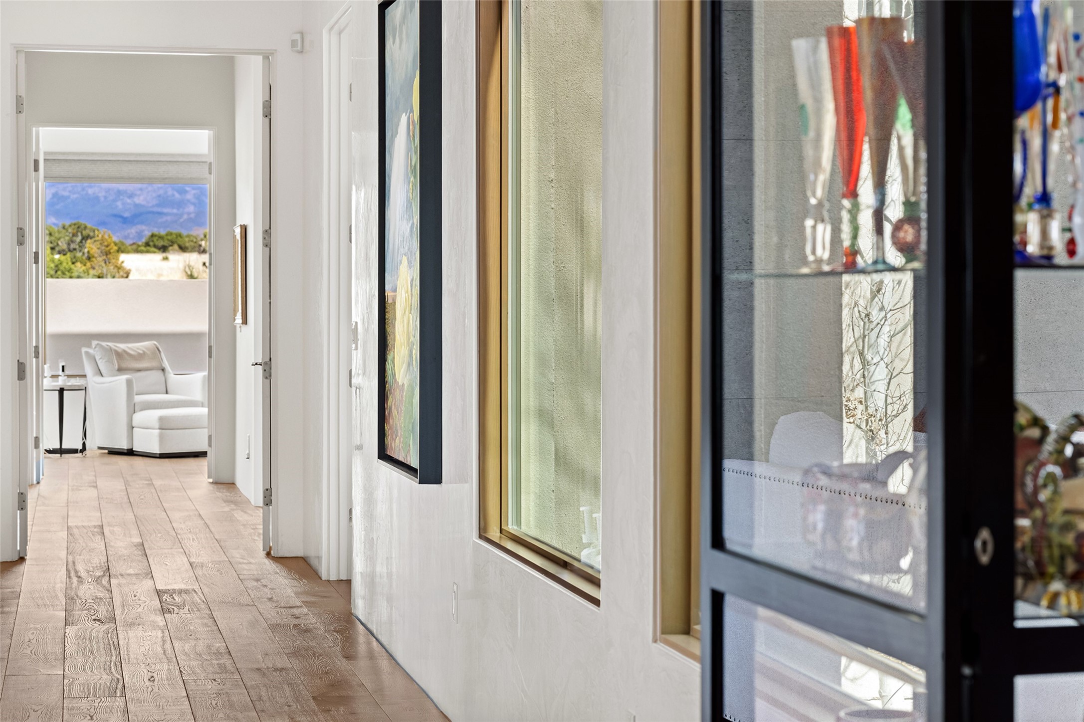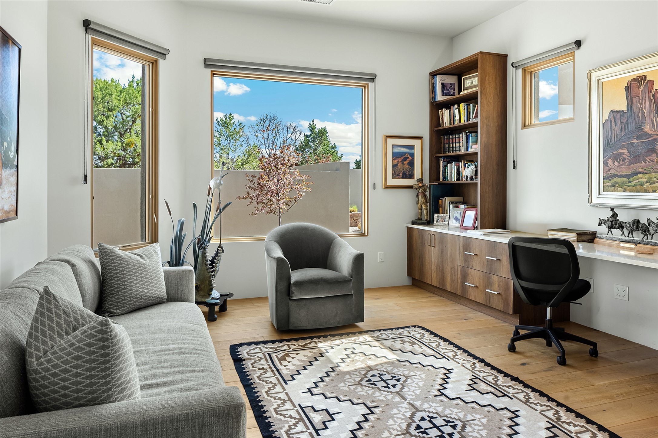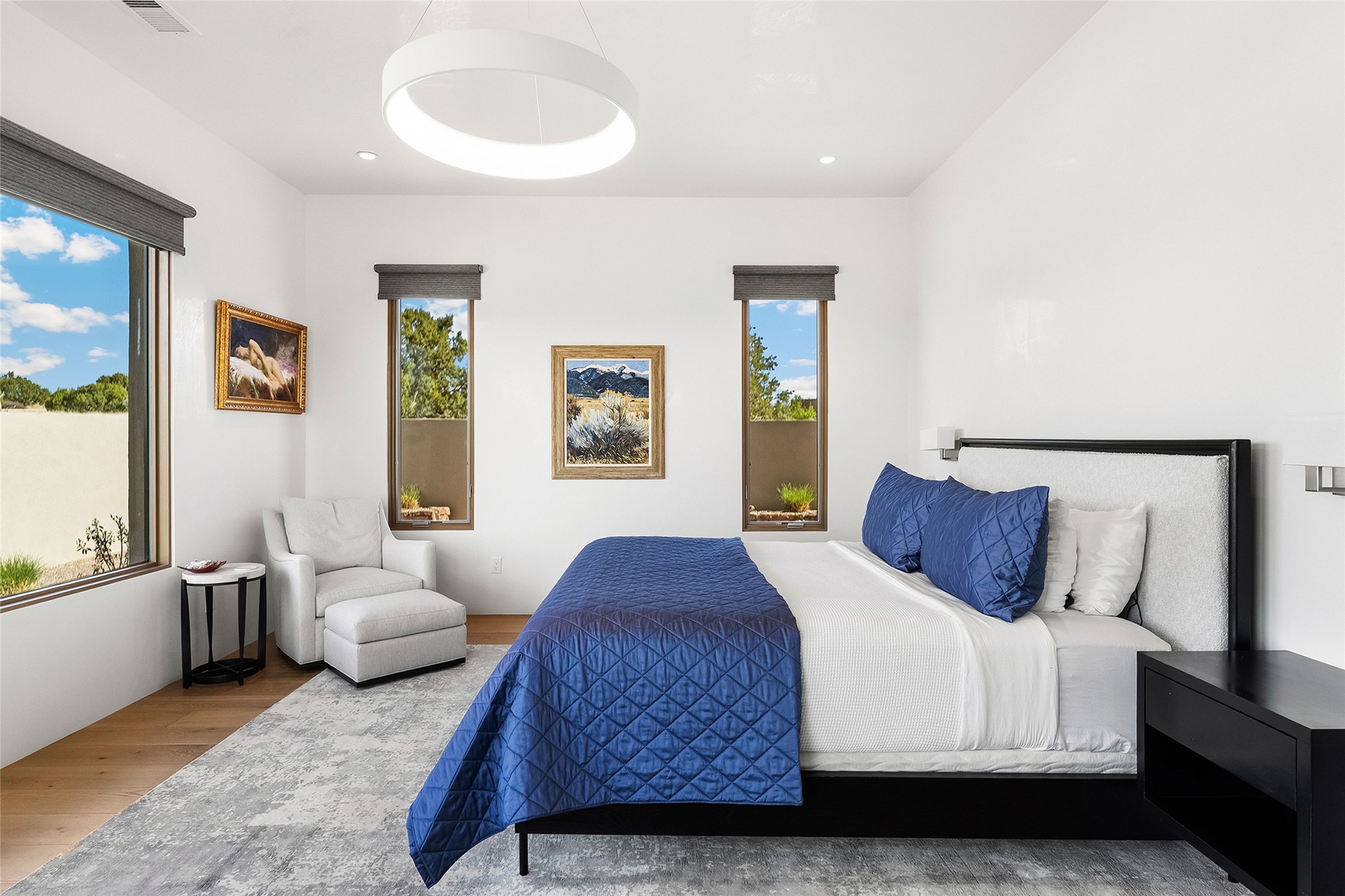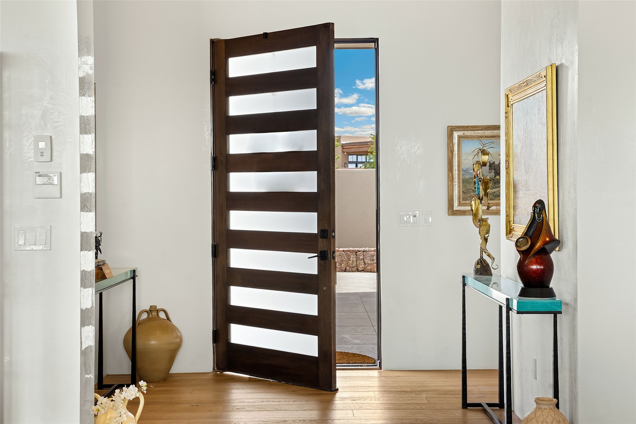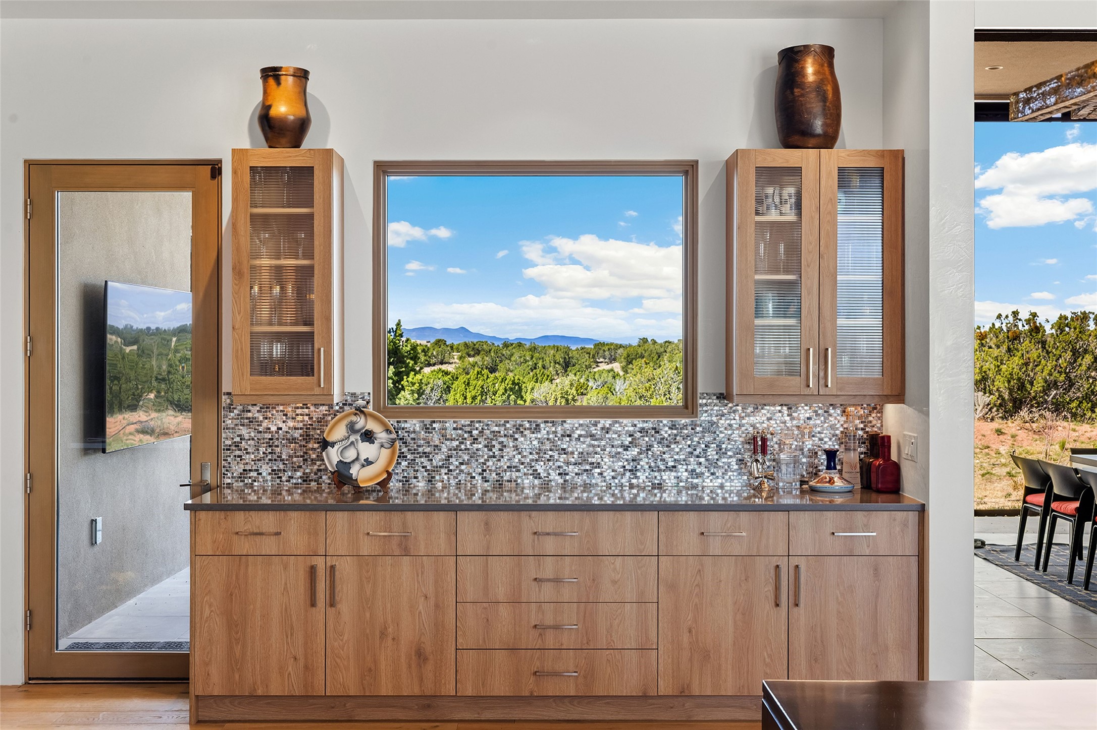 This Las Campanas masterpiece by award-winning builder Frank Yardman defines high-desert luxury. A true architectural tour de force, this sophisticated residence captures sweeping Sangre de Cristo and Jemez Mountain views, blending modern elegance with the quintessential Santa Fe lifestyle. The open-concept living and dining areas are designed for seamless entertaining, featuring retractable glass walls that perfectly frame mountain vistas and create the ultimate indoor-outdoor experience. The chef's kitchen is a culinary delight, equipped with state-of-the-art Thermador appliances, a massive breakfast bar, and a full butler's pantry--all of which opens to the primary dining and entertainment spaces. The spacious, private owner's suite impresses with panoramic mountain views and a spa-inspired bath featuring a glass shower, freestanding soaking tub, dual vanities, a vanity closet, and two large walk-in closets. Located in separate wings of the home, two additional ensuite bedrooms offer comfort and privacy for guests. Versatility abounds with a generous office featuring built-in cabinetry, an exercise room (or secondary office), and a cozy media den located directly off the kitchen. The incredible outdoor living experience was designed by renowned landscape architect Solange Serquis. Recent updates include a modern concrete driveway and a custom metal entrance gate that sets a tone of sophistication. The outdoor living areas have been further expanded with courtyard walls, premium hardscaping, and a kiva fireplace situated perfectly off the outdoor kitchen. Located just minutes from the world-class amenities of The Club at Las Campanas, this exceptional residence is move-in ready. Most furnishings and the owner's Equity Golf Membership are also available for purchase on a separate bill of sale.