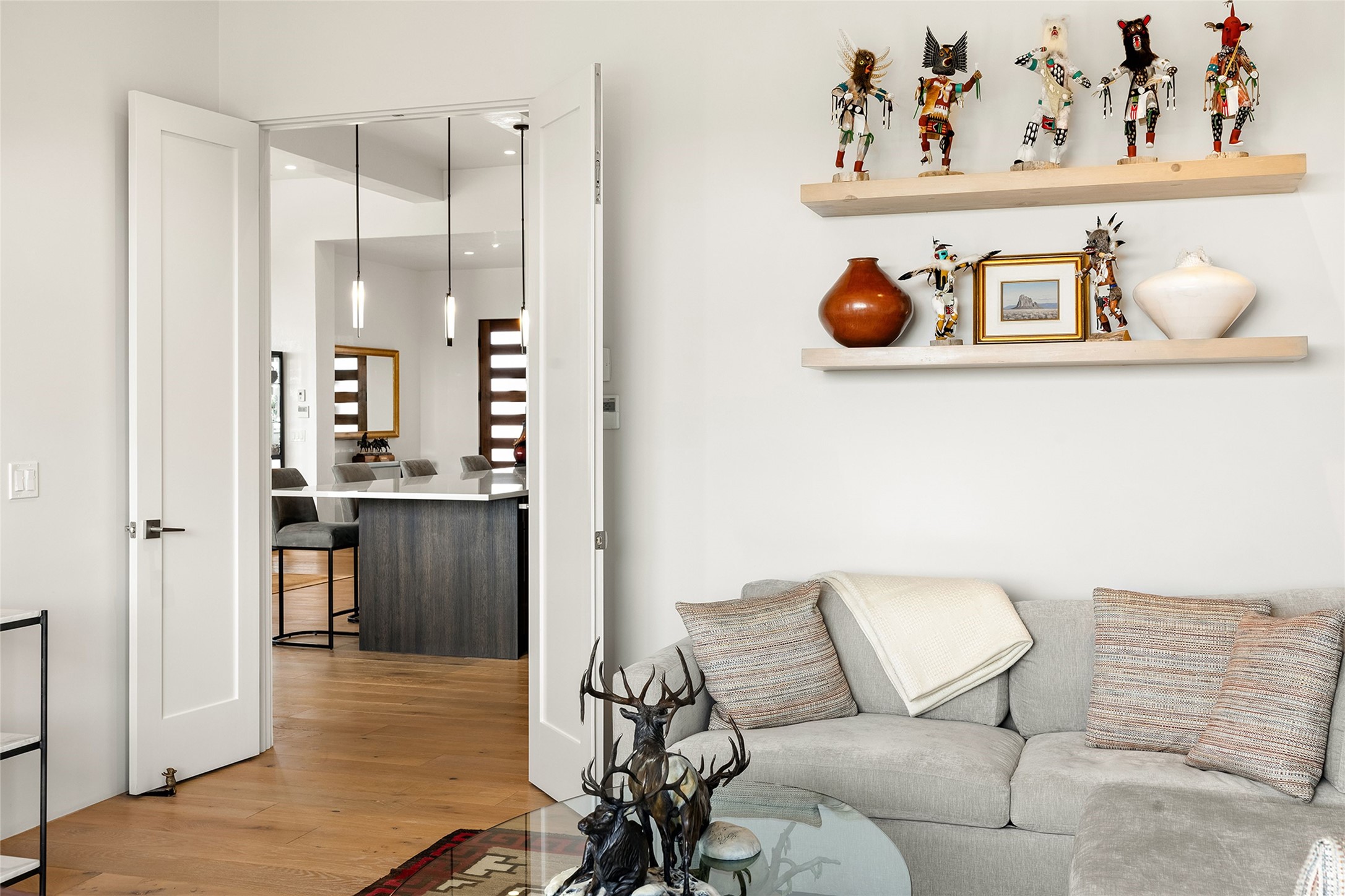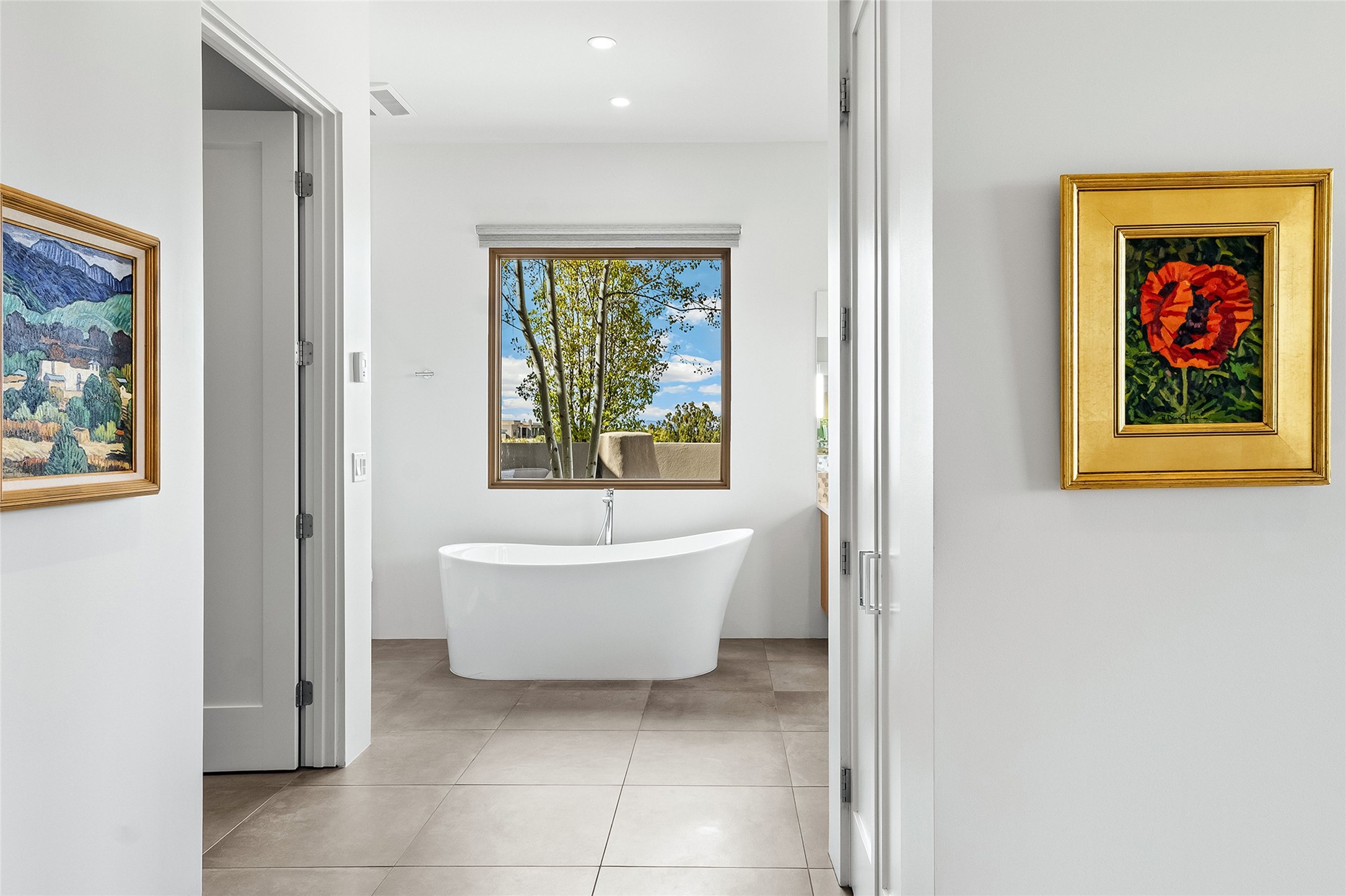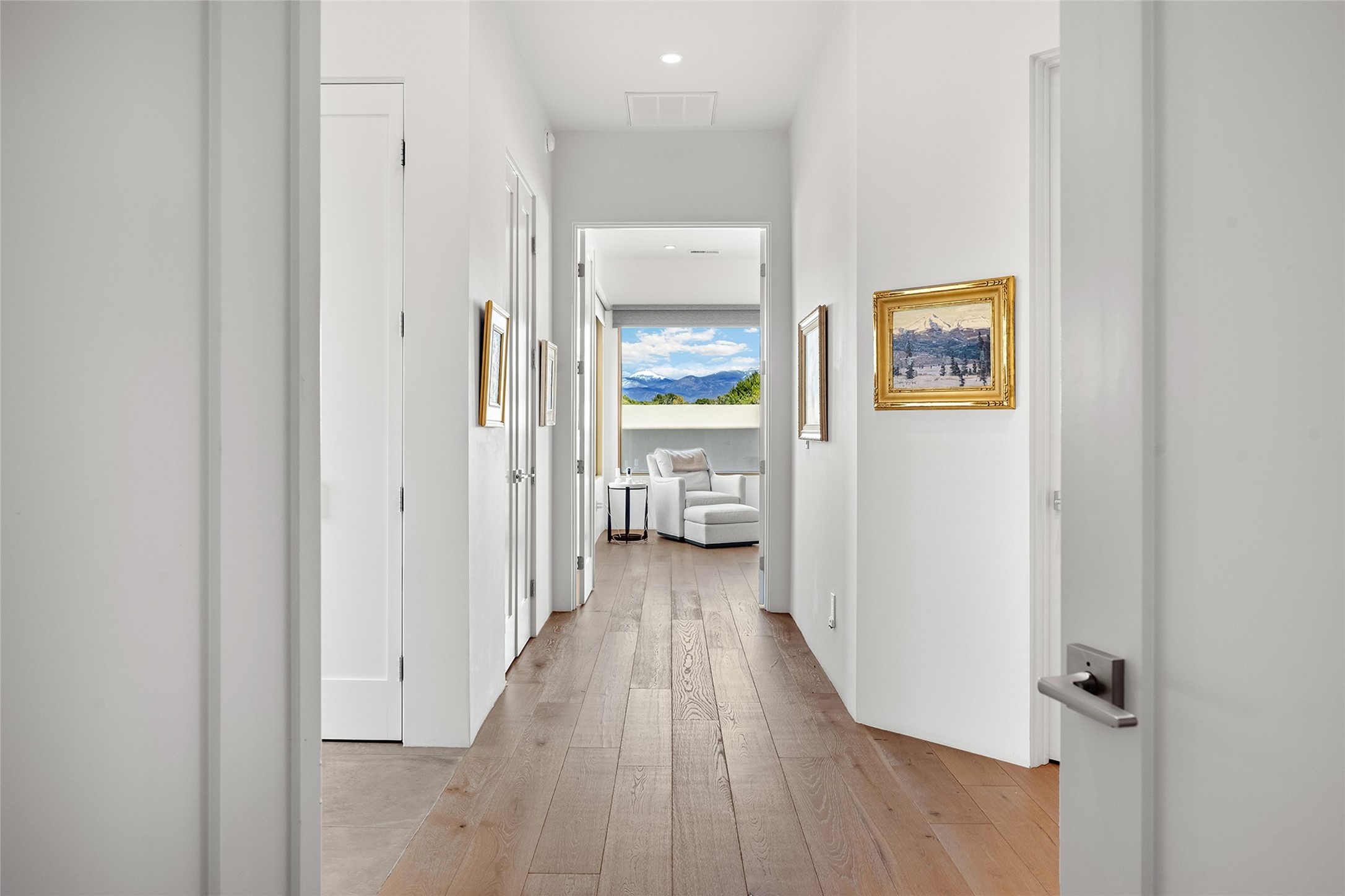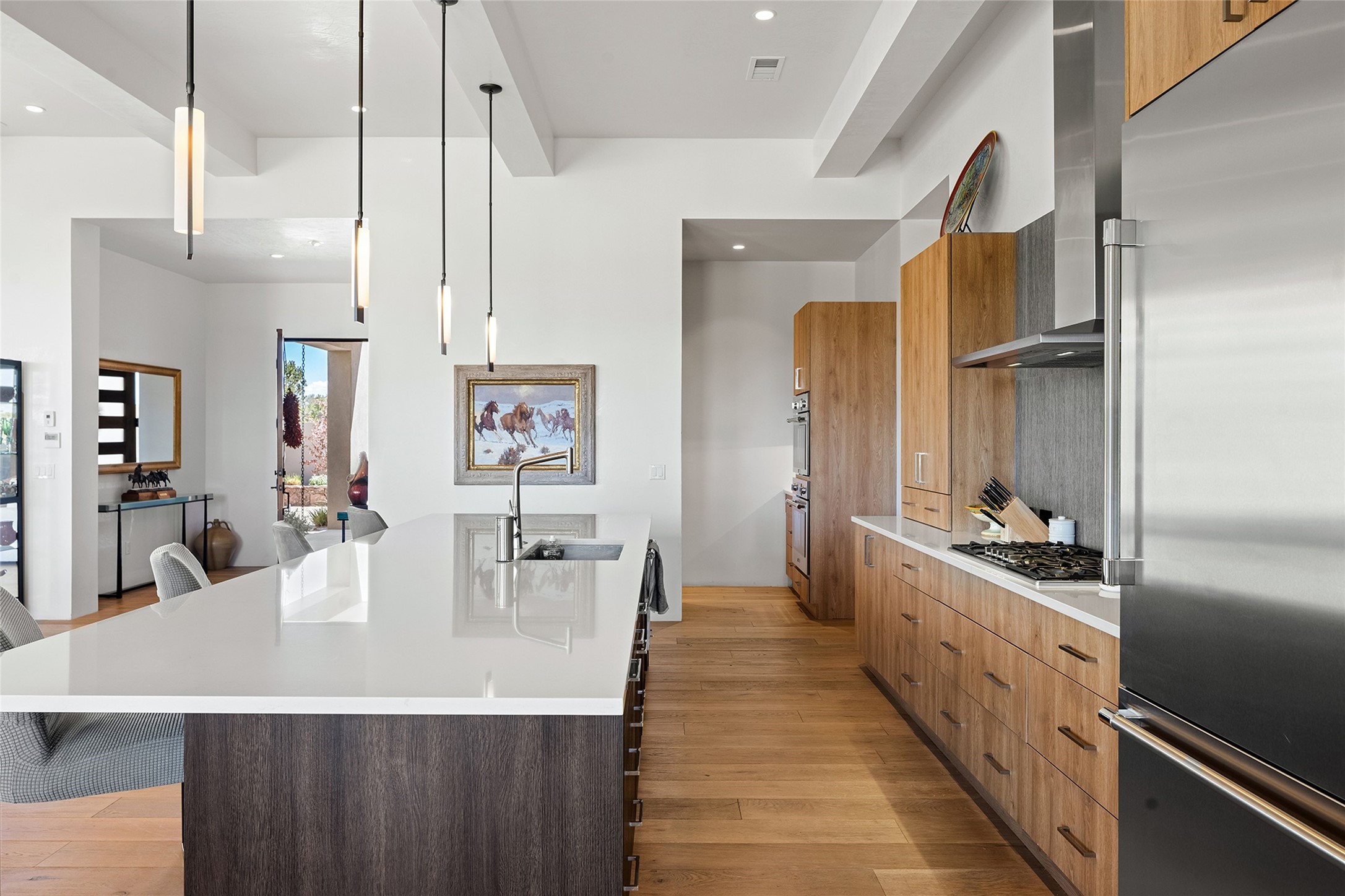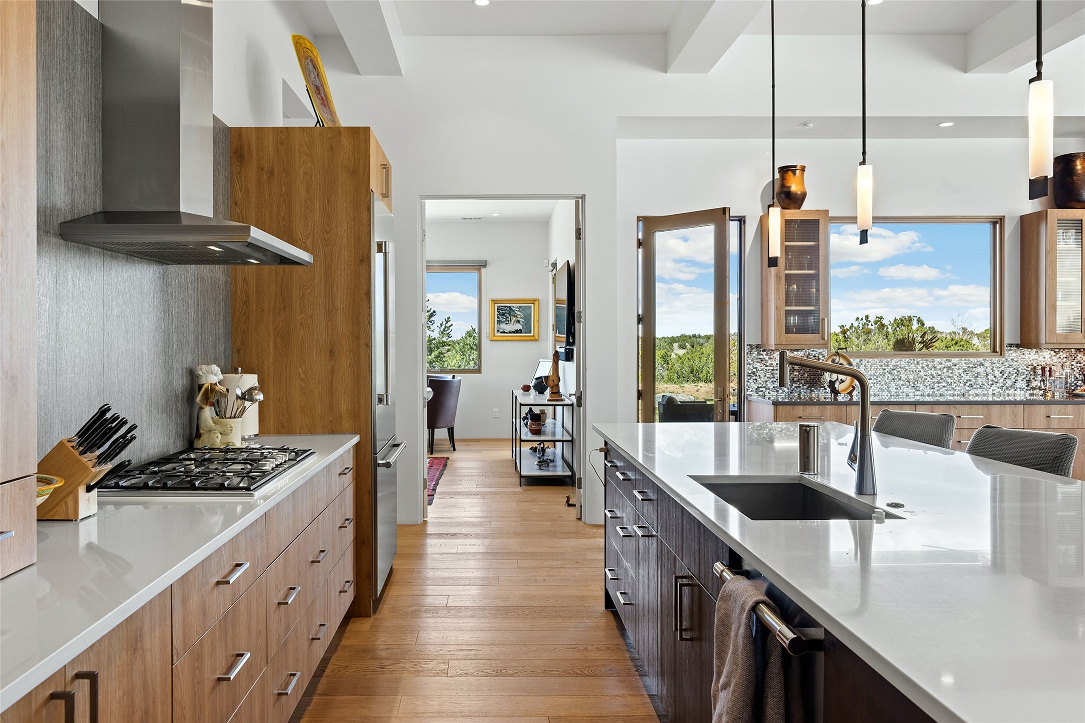 This Las Campanas masterpiece by award-winning builder Frank Yardman defines high-desert luxury. A true architectural tour de force, this sophisticated residence captures sweeping Sangre de Cristo and Jemez Mountain views, blending modern elegance with the quintessential Santa Fe lifestyle. The open-concept living and dining areas are designed for seamless entertaining, featuring retractable glass walls that perfectly frame mountain vistas and create the ultimate indoor-outdoor experience. The chef's kitchen is a culinary delight, equipped with state-of-the-art Thermador appliances, a massive breakfast bar, and a full butler's pantry--all of which opens to the primary dining and entertainment spaces. The spacious, private owner's suite impresses with panoramic mountain views and a spa-inspired bath featuring a glass shower, freestanding soaking tub, dual vanities, a vanity closet, and two large walk-in closets. Located in separate wings of the home, two additional ensuite bedrooms offer comfort and privacy for guests. Versatility abounds with a generous office featuring built-in cabinetry, an exercise room (or secondary office), and a cozy media den located directly off the kitchen. The incredible outdoor living experience was designed by renowned landscape architect Solange Serquis. Recent updates include a modern concrete driveway and a custom metal entrance gate that sets a tone of sophistication. The outdoor living areas have been further expanded with courtyard walls, premium hardscaping, and a kiva fireplace situated perfectly off the outdoor kitchen. Located just minutes from the world-class amenities of The Club at Las Campanas, this exceptional residence is move-in ready. Most furnishings and the owner's Equity Golf Membership are also available for purchase on a separate bill of sale.