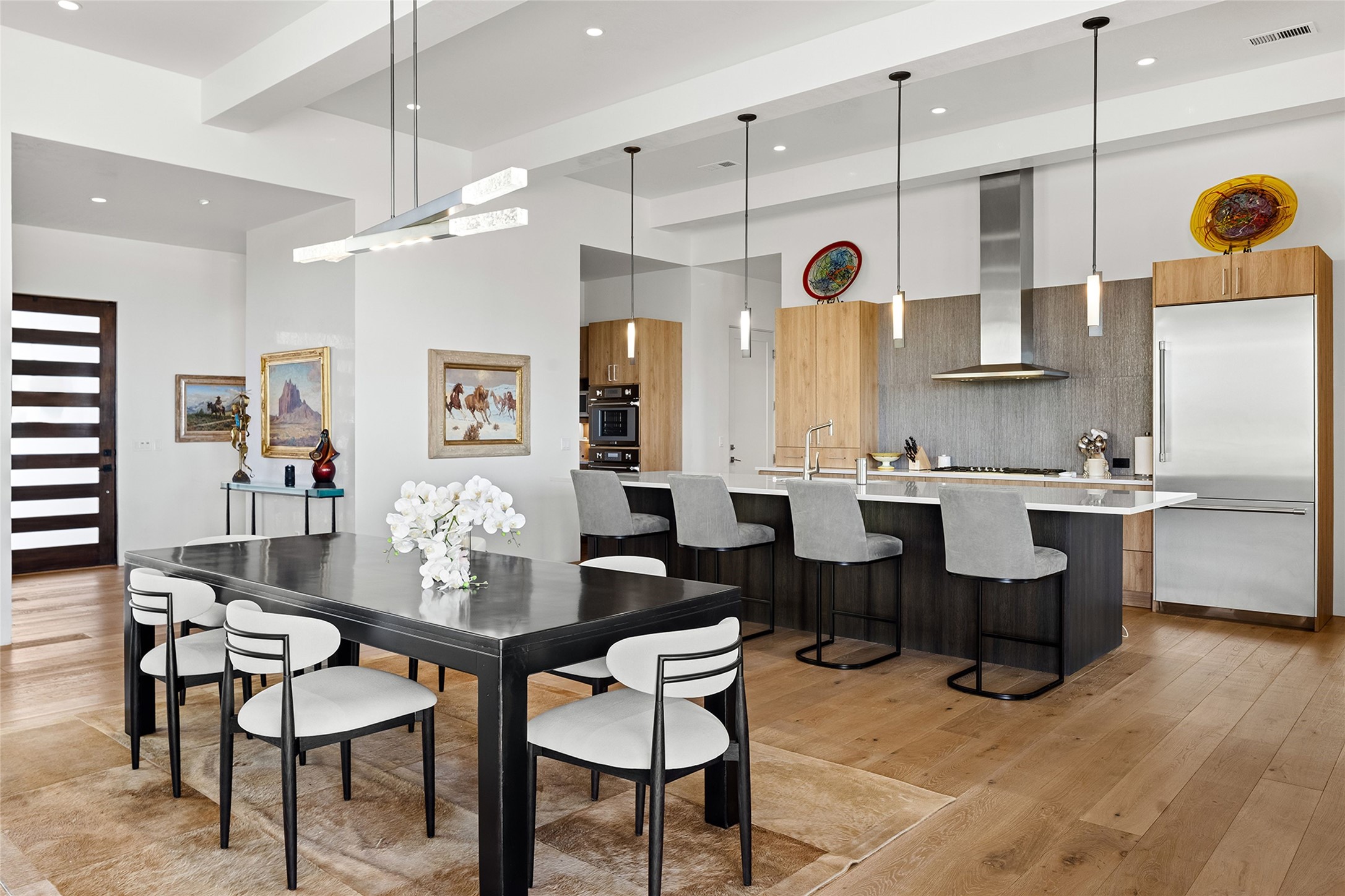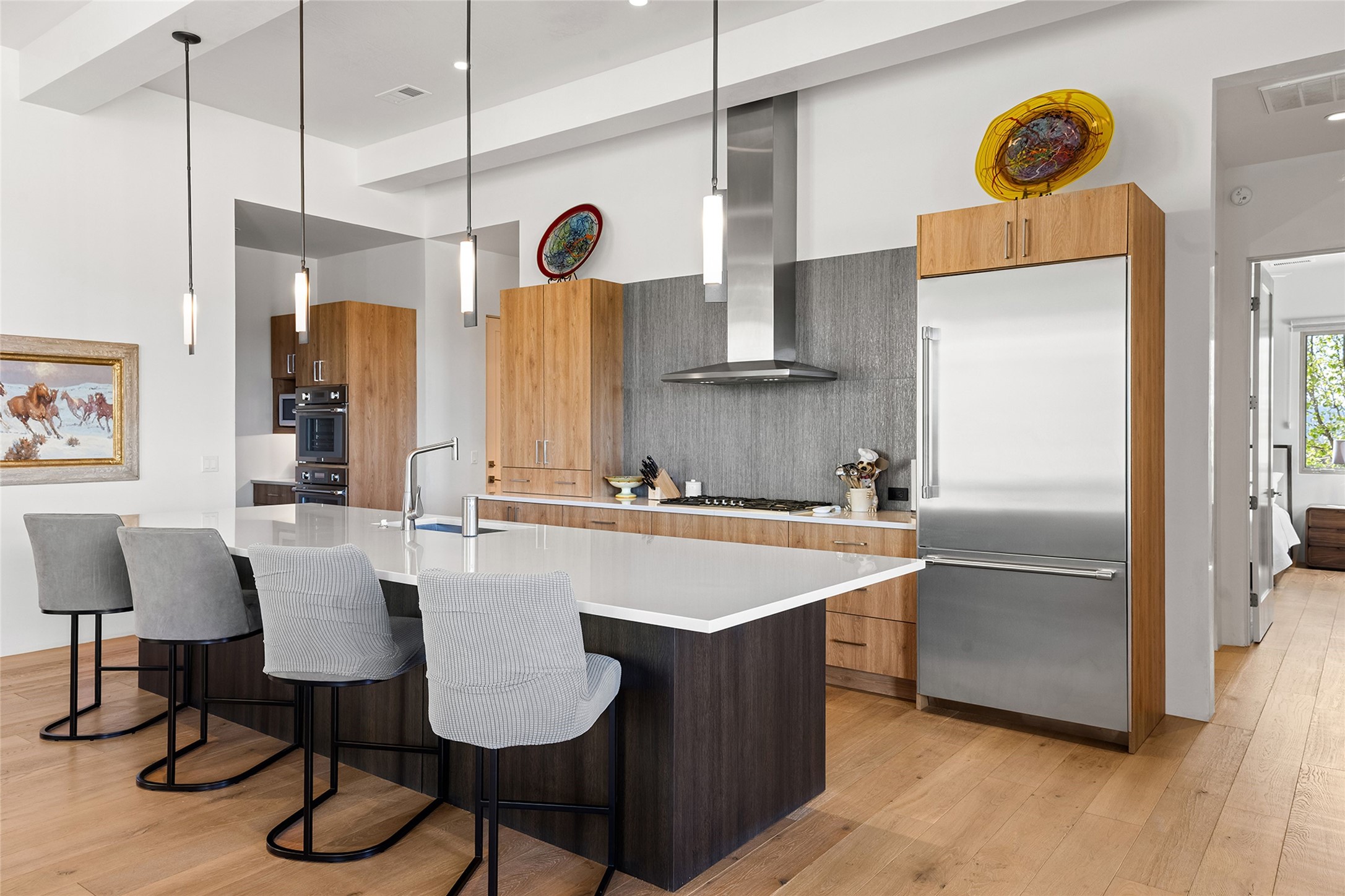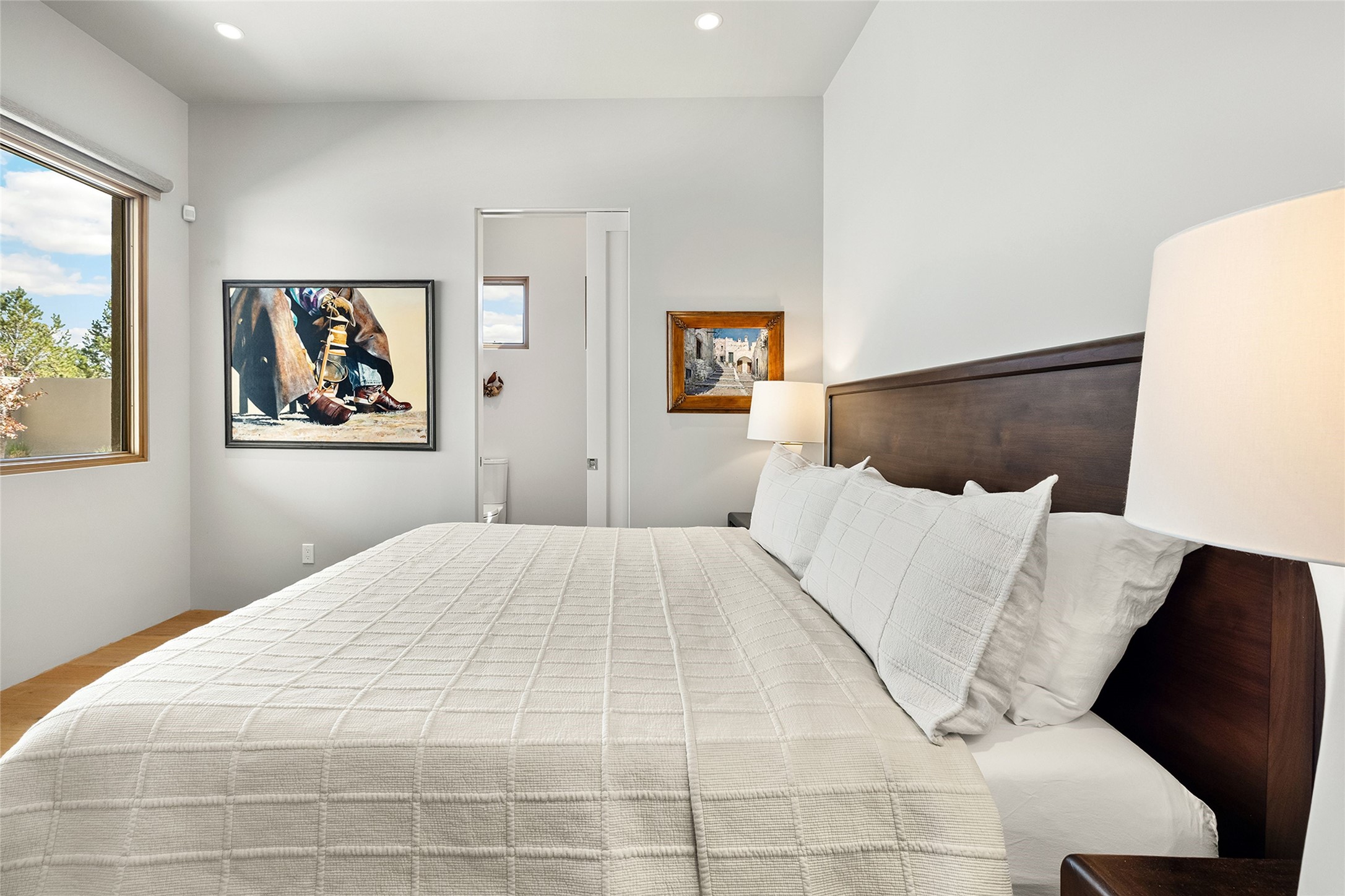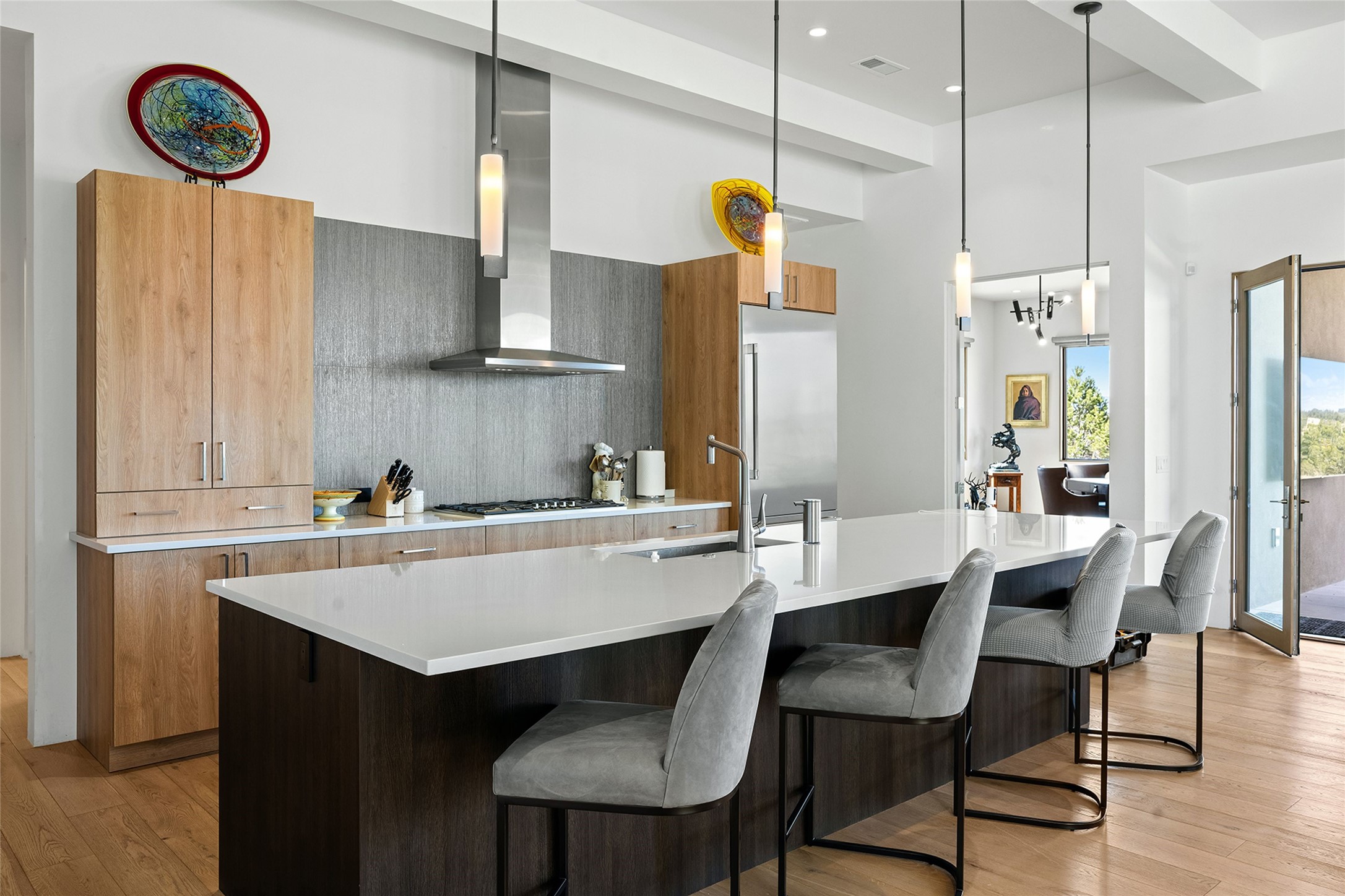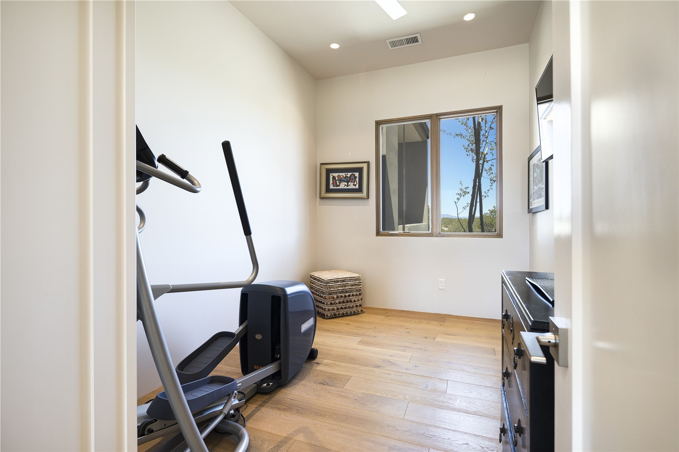 This Las Campanas masterpiece by award-winning builder Frank Yardman defines high-desert luxury. A true architectural tour de force, this sophisticated residence captures sweeping Sangre de Cristo and Jemez Mountain views, blending modern elegance with the quintessential Santa Fe lifestyle. The open-concept living and dining areas are designed for seamless entertaining, featuring retractable glass walls that perfectly frame mountain vistas and create the ultimate indoor-outdoor experience. The chef's kitchen is a culinary delight, equipped with state-of-the-art Thermador appliances, a massive breakfast bar, and a full butler's pantry--all of which opens to the primary dining and entertainment spaces. The spacious, private owner's suite impresses with panoramic mountain views and a spa-inspired bath featuring a glass shower, freestanding soaking tub, dual vanities, a vanity closet, and two large walk-in closets. Located in separate wings of the home, two additional ensuite bedrooms offer comfort and privacy for guests. Versatility abounds with a generous office featuring built-in cabinetry, an exercise room (or secondary office), and a cozy media den located directly off the kitchen. The incredible outdoor living experience was designed by renowned landscape architect Solange Serquis. Recent updates include a modern concrete driveway and a custom metal entrance gate that sets a tone of sophistication. The outdoor living areas have been further expanded with courtyard walls, premium hardscaping, and a kiva fireplace situated perfectly off the outdoor kitchen. Located just minutes from the world-class amenities of The Club at Las Campanas, this exceptional residence is move-in ready. Most furnishings and the owner's Equity Golf Membership are also available for purchase on a separate bill of sale.
