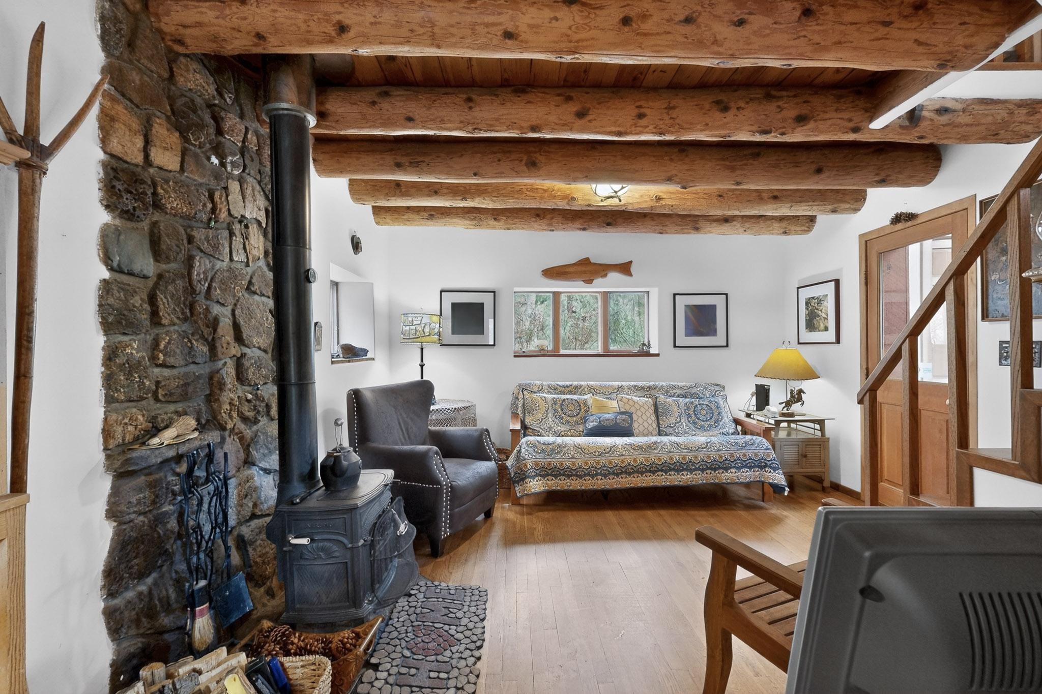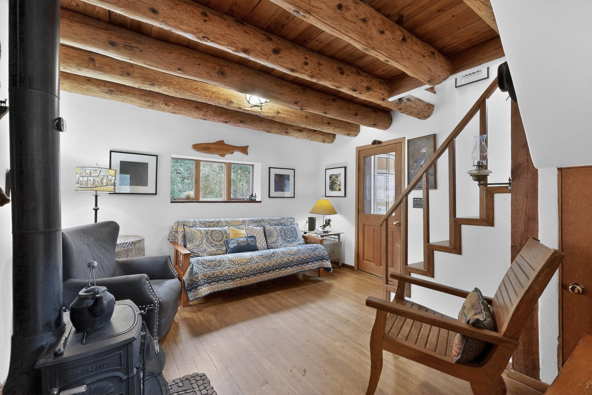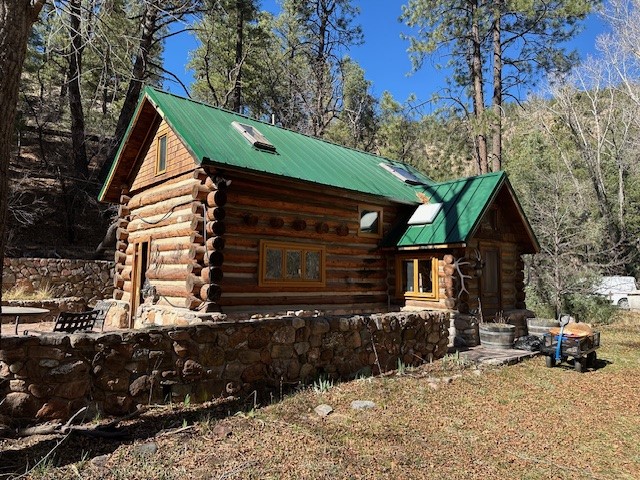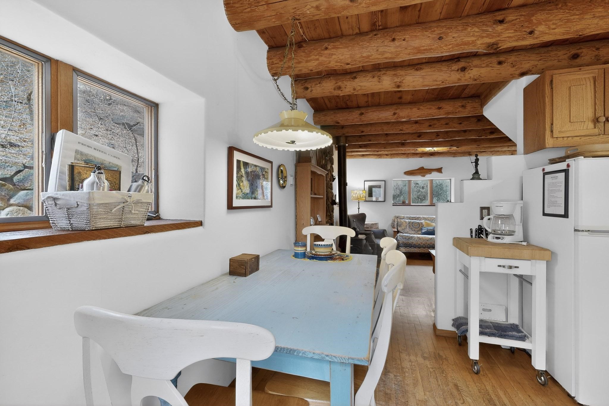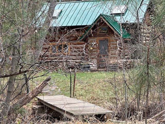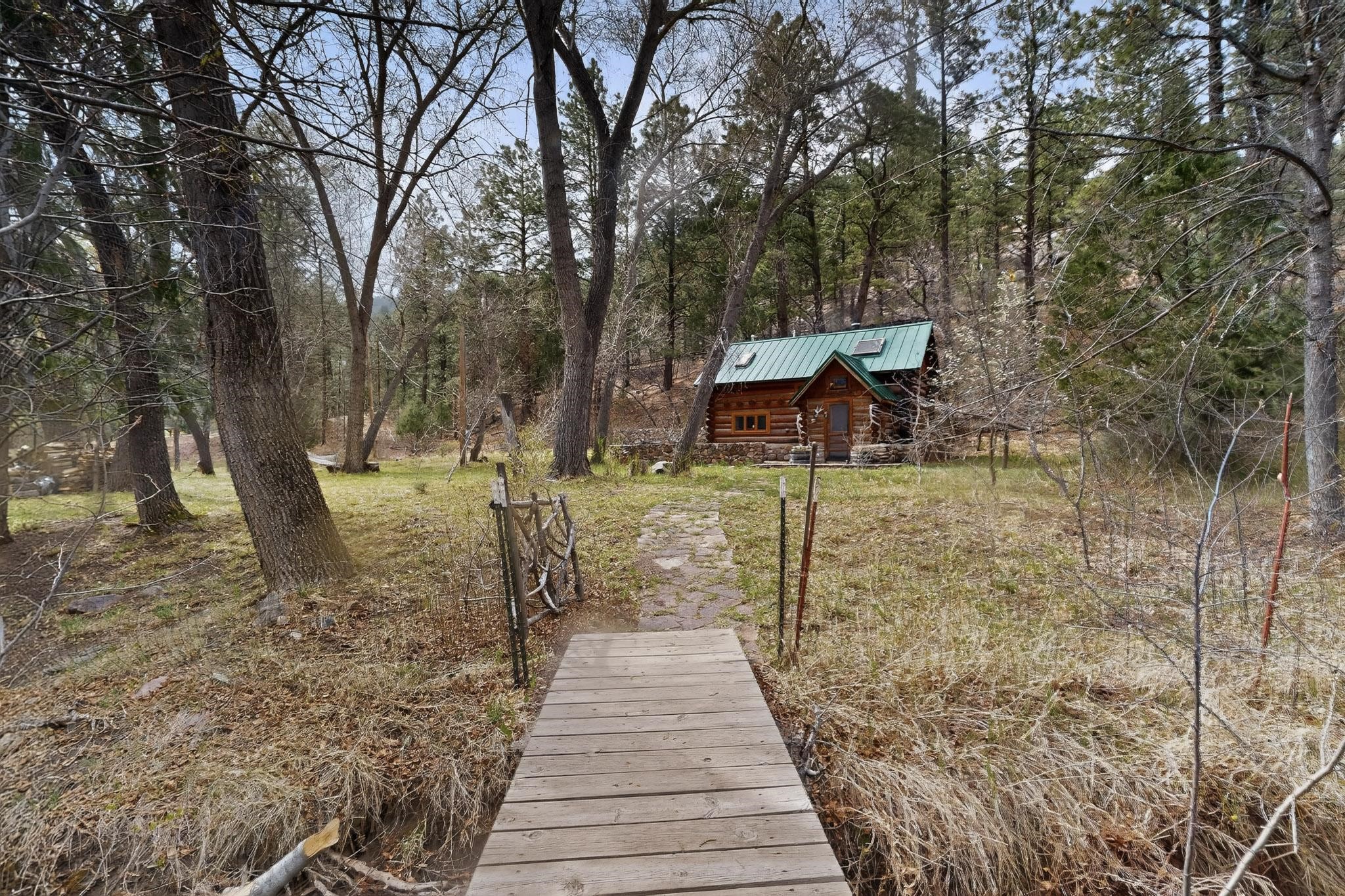 Adorable Storybook log cabin located on 360 +/- feet of Pecos River frontage, 10 miles above the Village of Pecos immediately before Windy Bridge. Properties of this type and quality are rarely offered for sale. The cabin has been an AirB&B offering for a number of years and our sellers are conveying domain names: PecosRiverCabin and Cabin on the Pecos. The setting includes a beautiful meadow, wooded bosque, healthy ponderosa pine, cotton willow, spruce trees and a large portion of an island accessed from a sweet bridge. The Pecos river frontage is significant with several openings for fishing and rapids towards the north end of the lot. The log cabin is quite stunning with a pitched pro-panel roof, skylights, river rock foundation, patio walls, livingroom, country kitchen, 1 bedroom, 1 bathroom and a laundry area. Improvements include new furnace, wood burning stove, new washer & dryer, upgraded electrical panel with additional GFI's in kitchen and bath, Centurylink land line telephone, on demand hot water heater, WiFi repeater in the garden house bringing the internet throughout the yard and patio. There is a separate 8'2 1/2"x 8' bonus building with electricity, solid entry door and view windows. All of the furniture, furnishings, tools, gardening supplies needed for a country get-a-way or for an income producing recreational retreat will be included with the purchase. There is no Home owner's Association just State and County regulations. The adjoining area to the kitchen could work for an expansion of the cabin footprint. The site is frequented by wildlife: deer, turkeys, skunks, fox, raccoons and occasionally a bear. For folks seeking a one of a kind river front destination property, please consider 1 McFerrin Taylor Rd, Pecos Canyon.