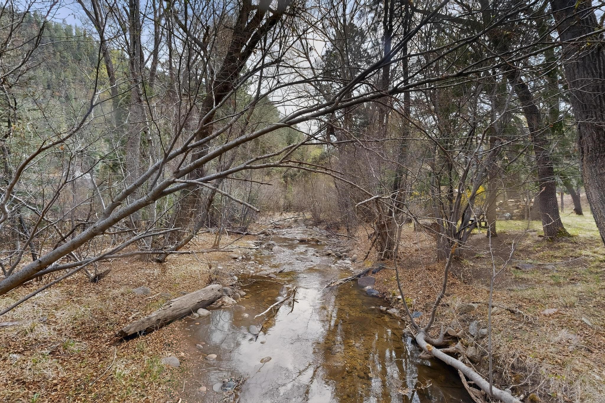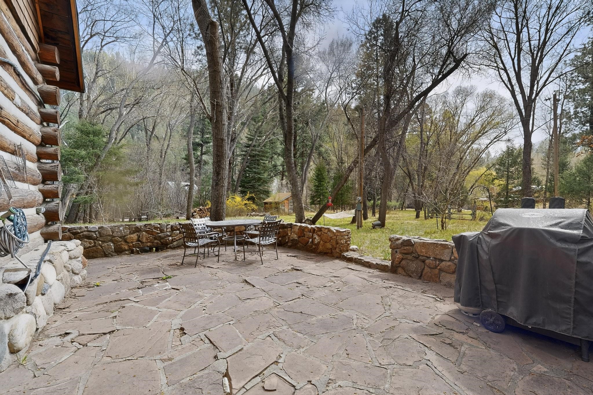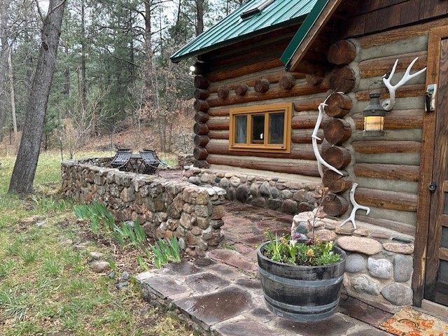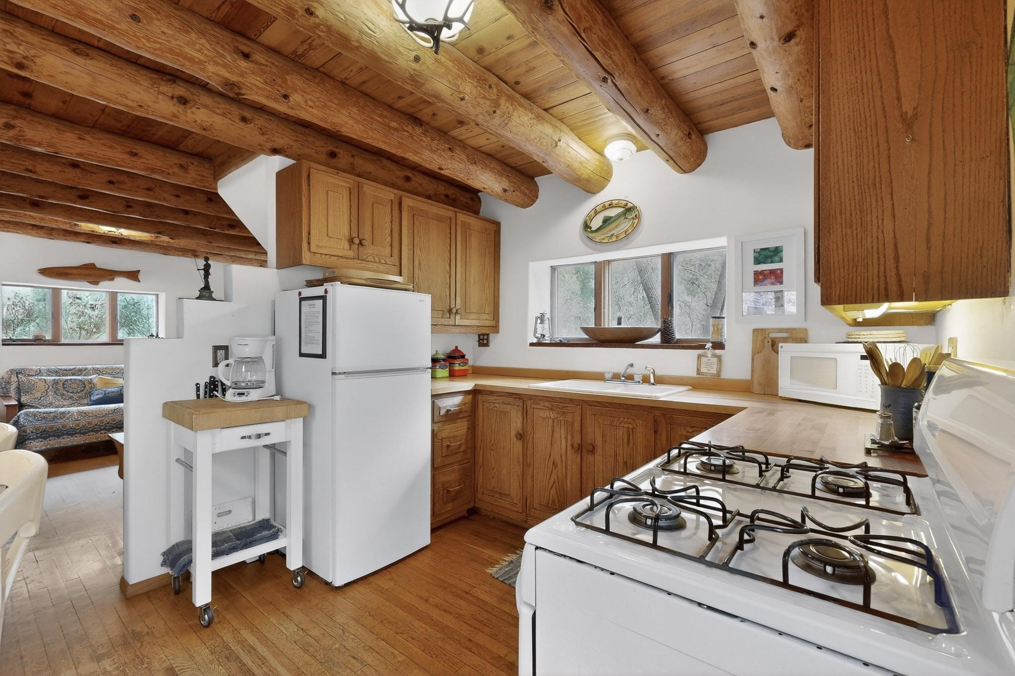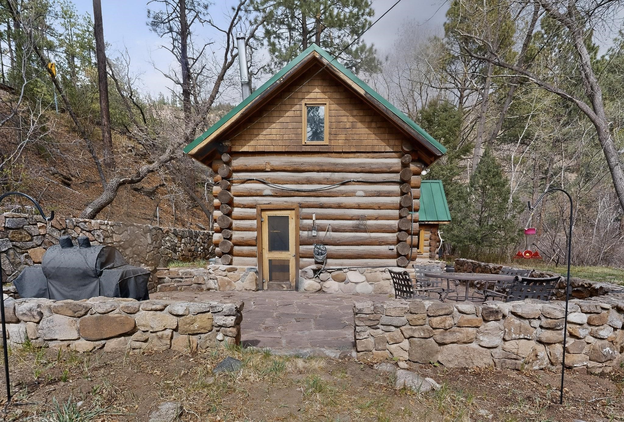 Adorable Storybook log cabin located on 360 +/- feet of Pecos River frontage, 10 miles above the Village of Pecos immediately before Windy Bridge. Properties of this type and quality are rarely offered for sale. The cabin has been an AirB&B offering for a number of years and our sellers are conveying domain names: PecosRiverCabin and Cabin on the Pecos. The setting includes a beautiful meadow, wooded bosque, healthy ponderosa pine, cotton willow, spruce trees and a large portion of an island accessed from a sweet bridge. The Pecos river frontage is significant with several openings for fishing and rapids towards the north end of the lot. The log cabin is quite stunning with a pitched pro-panel roof, skylights, river rock foundation, patio walls, livingroom, country kitchen, 1 bedroom, 1 bathroom and a laundry area. Improvements include new furnace, wood burning stove, new washer & dryer, upgraded electrical panel with additional GFI's in kitchen and bath, Centurylink land line telephone, on demand hot water heater, WiFi repeater in the garden house bringing the internet throughout the yard and patio. There is a separate 8'2 1/2"x 8' bonus building with electricity, solid entry door and view windows. All of the furniture, furnishings, tools, gardening supplies needed for a country get-a-way or for an income producing recreational retreat will be included with the purchase. There is no Home owner's Association just State and County regulations. The adjoining area to the kitchen could work for an expansion of the cabin footprint. The site is frequented by wildlife: deer, turkeys, skunks, fox, raccoons and occasionally a bear. For folks seeking a one of a kind river front destination property, please consider 1 McFerrin Taylor Rd, Pecos Canyon.