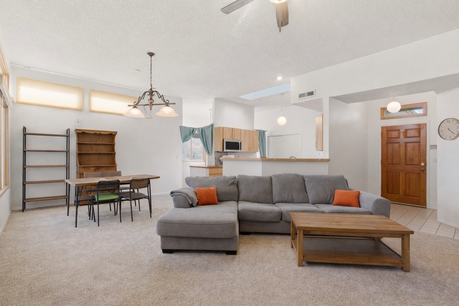 Great starter home or investment opportunity! This 3-bedroom, 2-bathroom home in the desirable Las Estancias neighborhood offers the perfect blend of convenience and comfort, located just a short drive from the Plaza and Southside shopping. The inviting living area and kitchen boast high ceilings, a cozy fireplace, and a wall of custom built-in bookshelves, creating the ultimate retreat. The primary suite serves as a true sanctuary, featuring a spacious bathroom with a walk-in closet, dual sinks, and a walk-in shower. This home also includes a two-car garage and a separate shed for added convenience and storage. Outside, the large backyard comes complete with a play structure, storage shed and offers plenty of room to garden, play, or relax in the sunshine. Priced to sell, this home is the complete package!