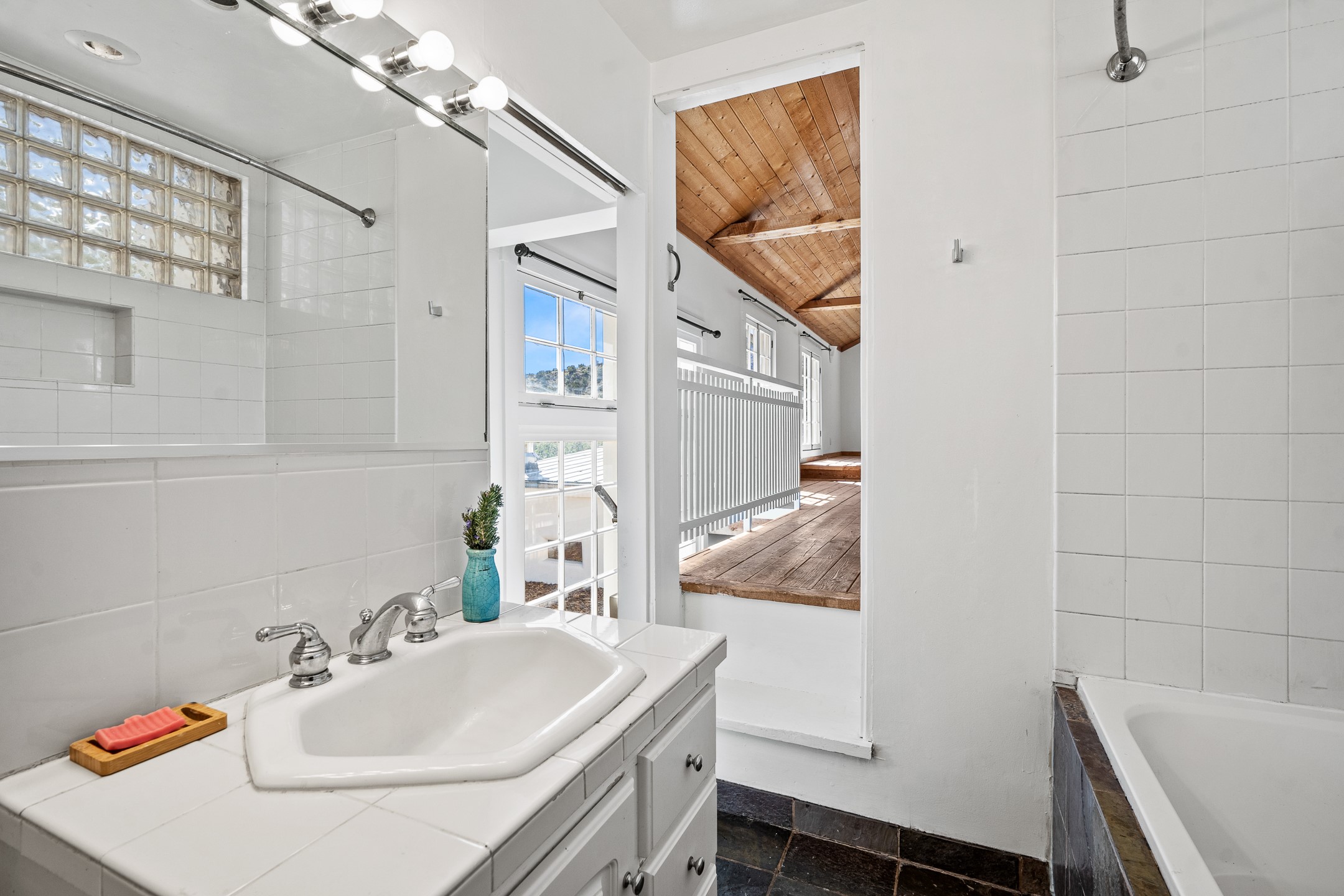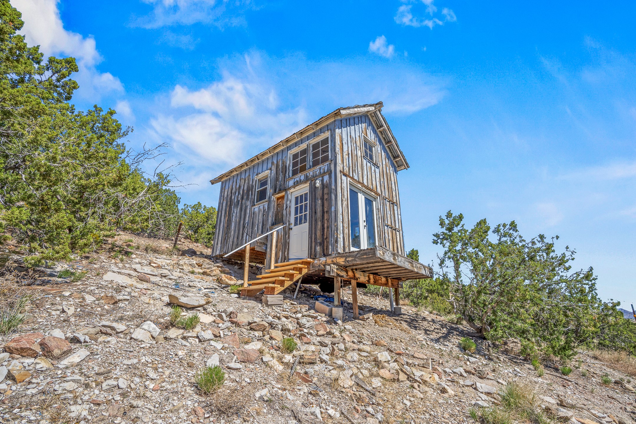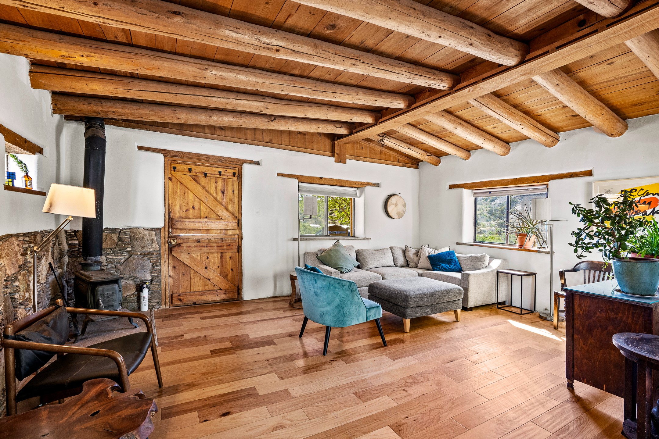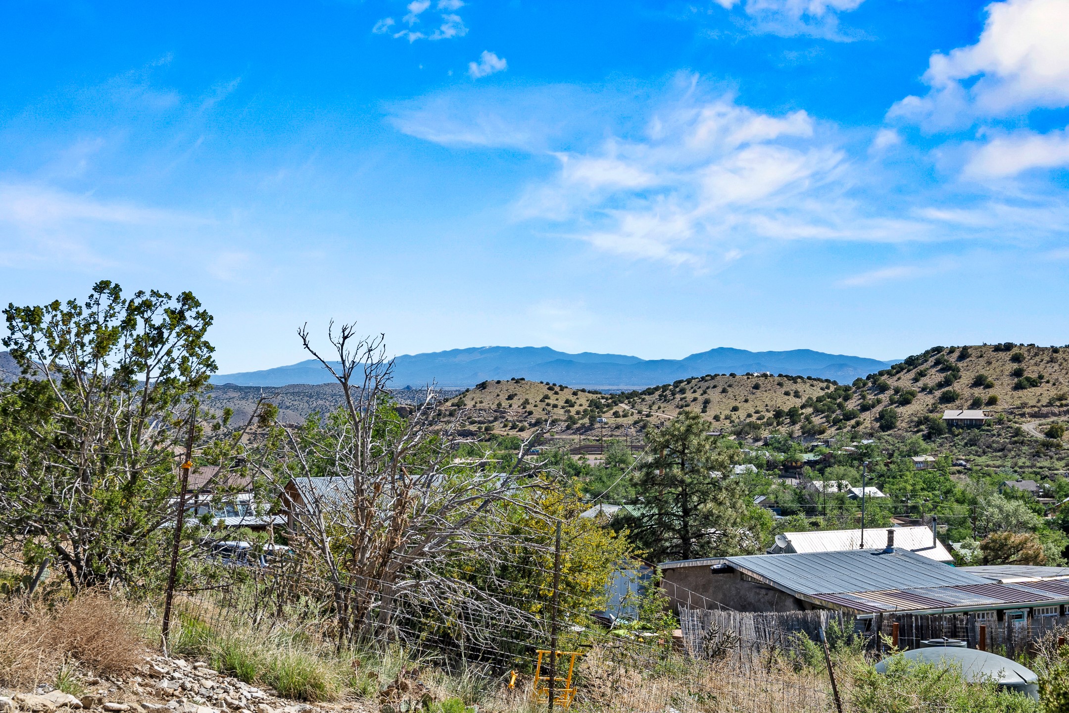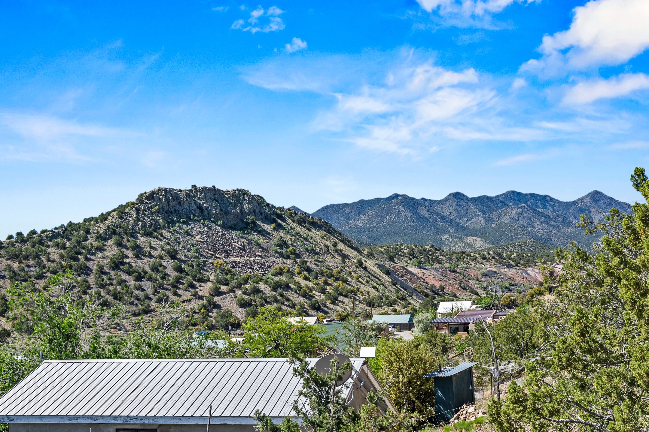 On a hillside within a few minutes walk of the entertainment and dining in Madrid, this well maintained two-story home is sure to charm. Outside, the terraced lot leads up to a separate studio space with loft. The white exterior and pitched metal roof add desert style, and a back patio provides space for outdoor relaxation. Inside, the home opens into a spacious living room with wood heat, wood flooring and a viga ceiling. The kitchen has brick flooring, large windows and a glass door to the patio, A large, open bedroom is situated on the second floor above the kitchen with ample light and The lot's elevation allows for views over the town.