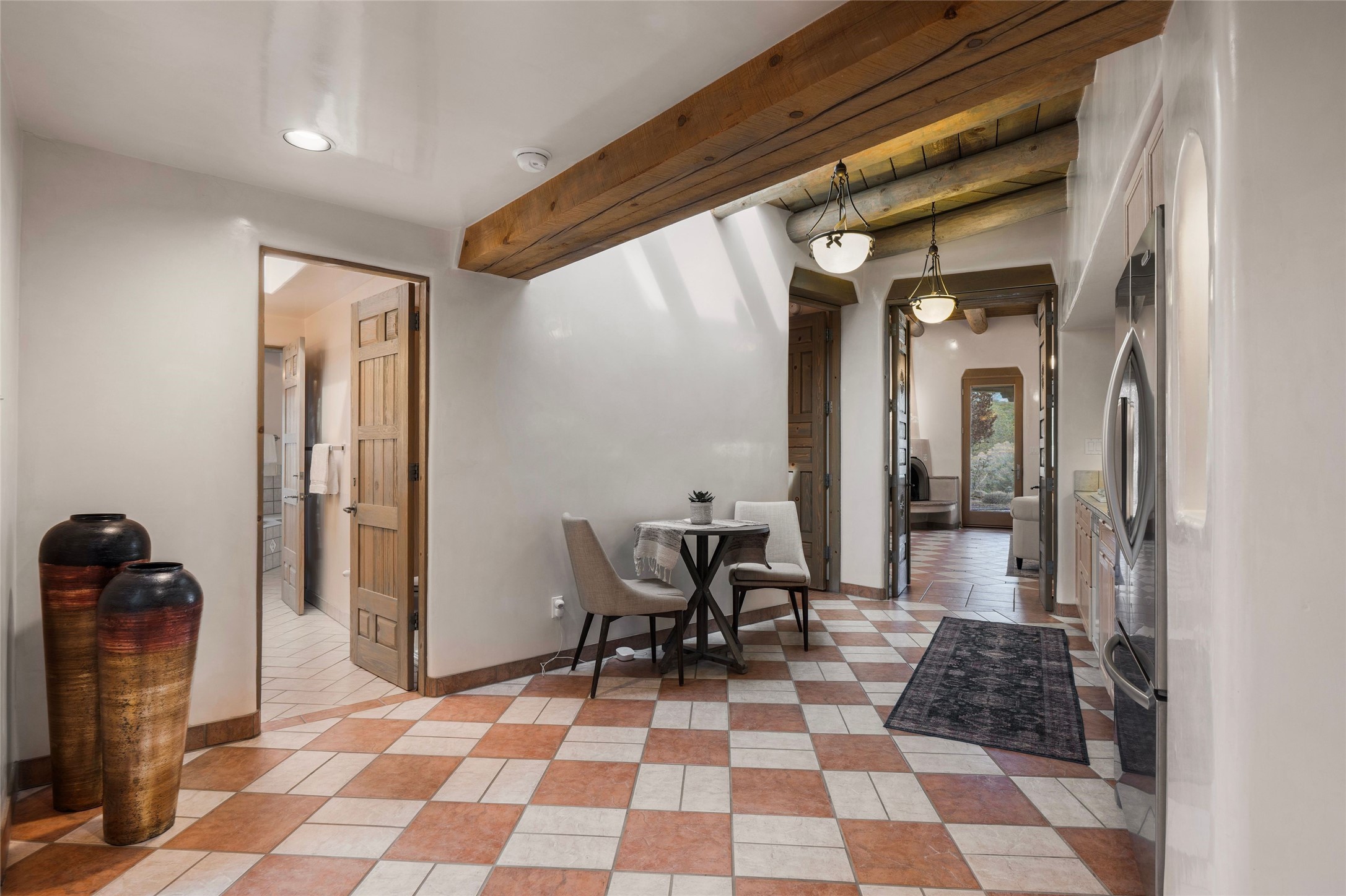 Hyde Park Road 4-bedroom, 2.5 bath Pueblo-style home on 1.08-acres with spectacular views of Sun and Moon Mountain. Iconic Santa Fe design with hand-troweled plaster walls, vigas and beams, nichos, tile and wood floors, and five kiva fireplaces. Flexible floor plan offers space for multi-generational living with separate wing with 2 bedrooms or 1 bedroom plus sitting area, bathroom and a second kitchen. Primary wing offers a spacious living room, dining room, kitchen and informal dining area, 2- bedrooms and ensuite bath. Expansive portals wrap around the home, providing multiple areas for al fresco dining and entertaining. Bonus feature is an above ground heated spa/hot tub for soaking under the magical New Mexican skies. 2-car attached garage. Superbly located close to the Santa Fe Plaza, Dale Ball Trails, Ten Thousand Waves and the Santa Fe Ski Basin.