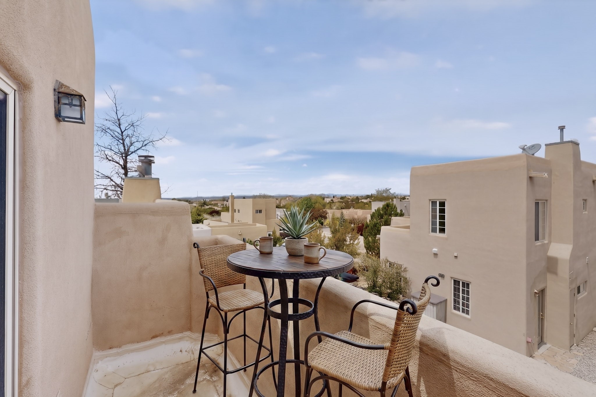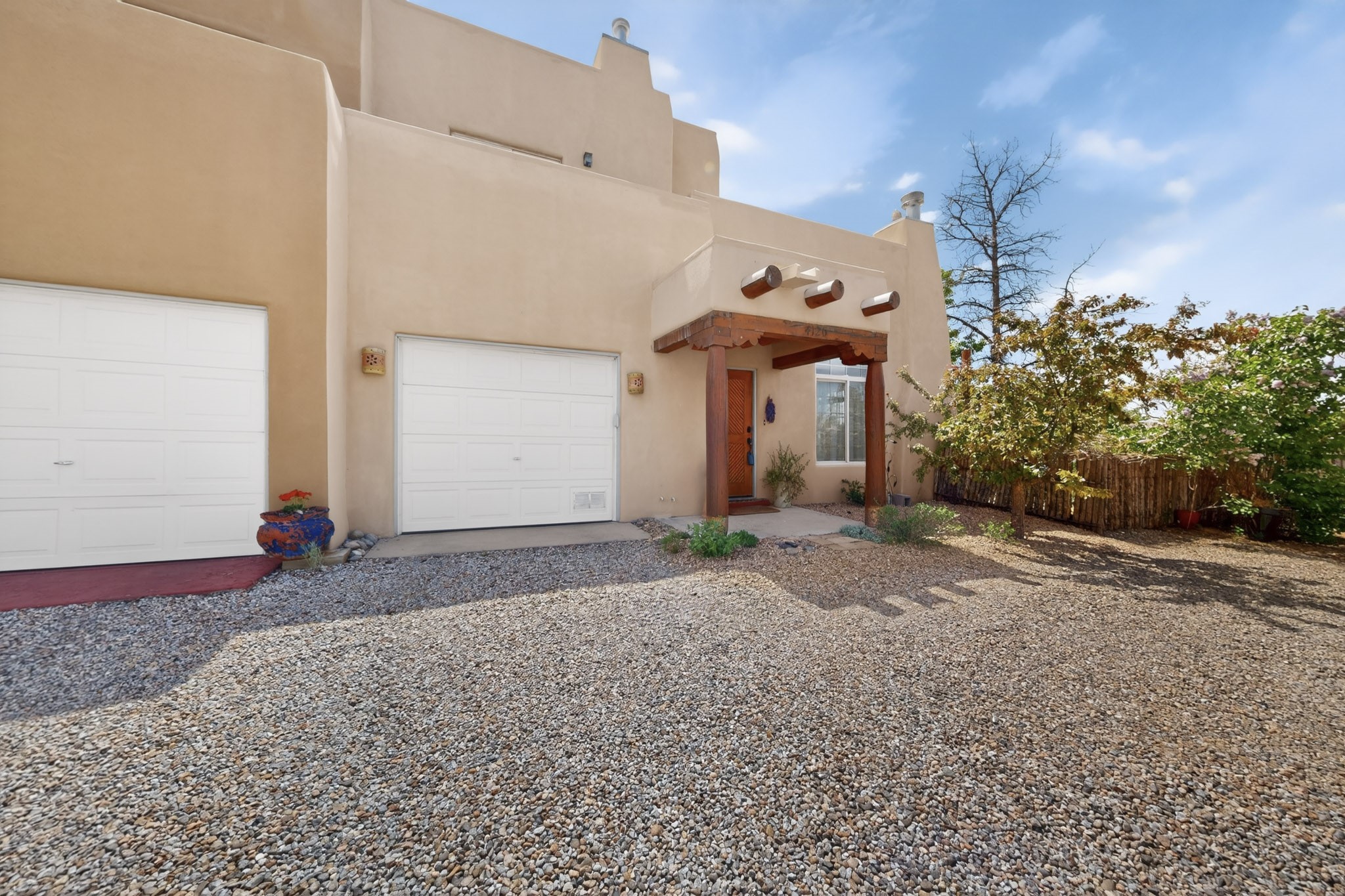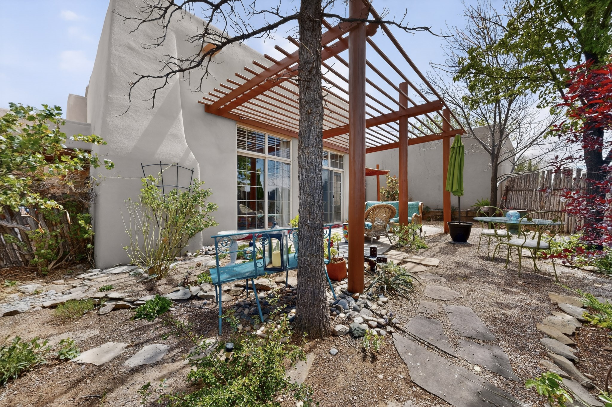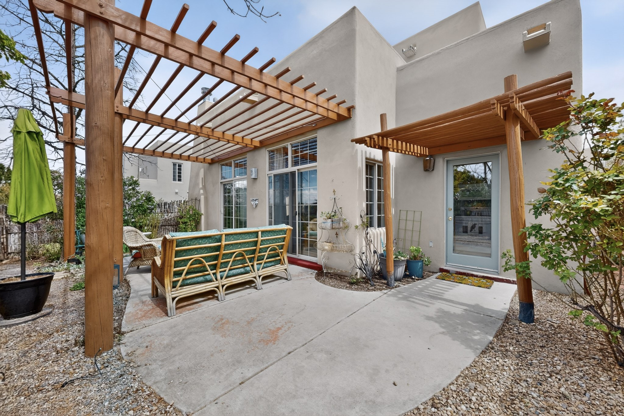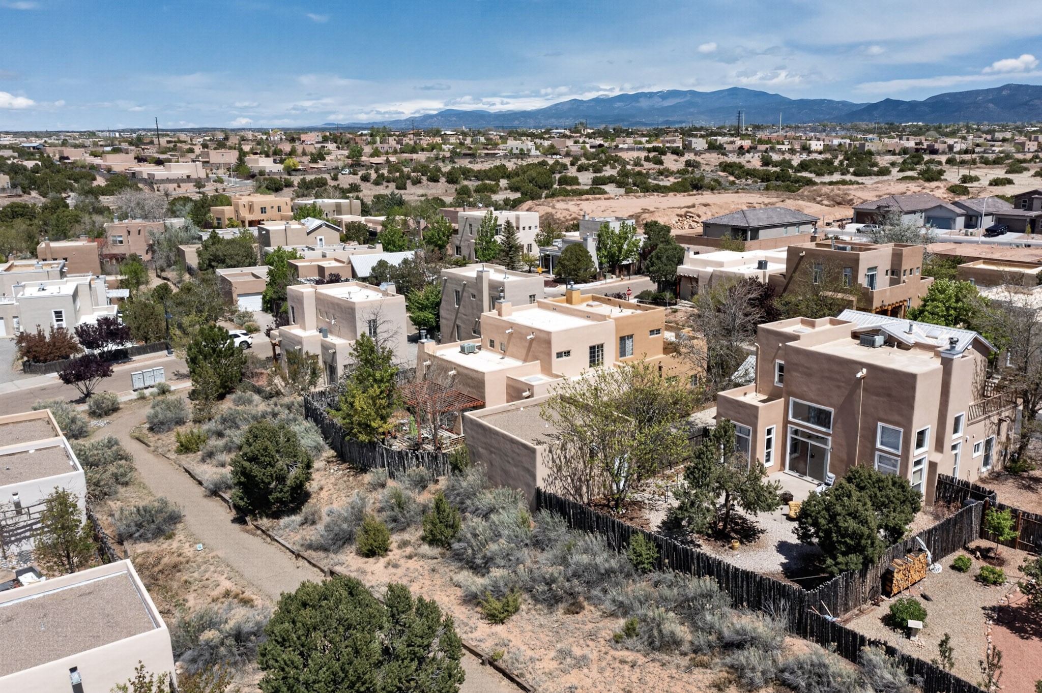 Pride of ownership throughout this absolutely charming Santa Fe home offering privacy as it backs to the walking trail & some open space--one of the cutest you'll ever see. With approximately 1300 +/- sqft, this thoughtfully designed residence offers 2 bedrooms (one upstairs & one downstairs) plus an additional upstairs flex loft space--ideal as a studio, office, playroom, or workout room--with direct access to a private balcony with views. With 2 full bathrooms, a finished 1-car garage with extra storage space, and additional onsite parking, this home blends comfort, convenience, and character. Each of the two bedrooms functions as a primary suite, complete with its own ensuite bath (one featuring double vanities). One suite is located upstairs and the other downstairs, offering privacy and flexibility for a variety of living arrangements. The inviting living room features high ceiling with vigas, tile floors, and a wood-burning fireplace, creating a warm and welcoming atmosphere. Doors open to the private, fenced and beautifully landscaped backyard with two pergolas --perfect for peaceful mornings or glowing Santa Fe sunsets. The kitchen continues the Santa Fe aesthetic with vigas and charming tile countertops, offering a delightful space for cooking. Features and amenities include: Forced air heat with central refrigerated A/C-Stackable washer and dryer-TPO roof-New smoke/carbon monoxide detectors, +/- 4-year-old refrigerator, Tile and laminate flooring, Carpet only on the stairs & more. Residents enjoy access to a clubhouse, workout room, hot tub, pool and a trail system connecting to the Arroyo Chamiso Trail--ideal for outdoor enthusiasts. Despite the peaceful setting, you're just minutes from hospitals, restaurants, shopping, and schools.