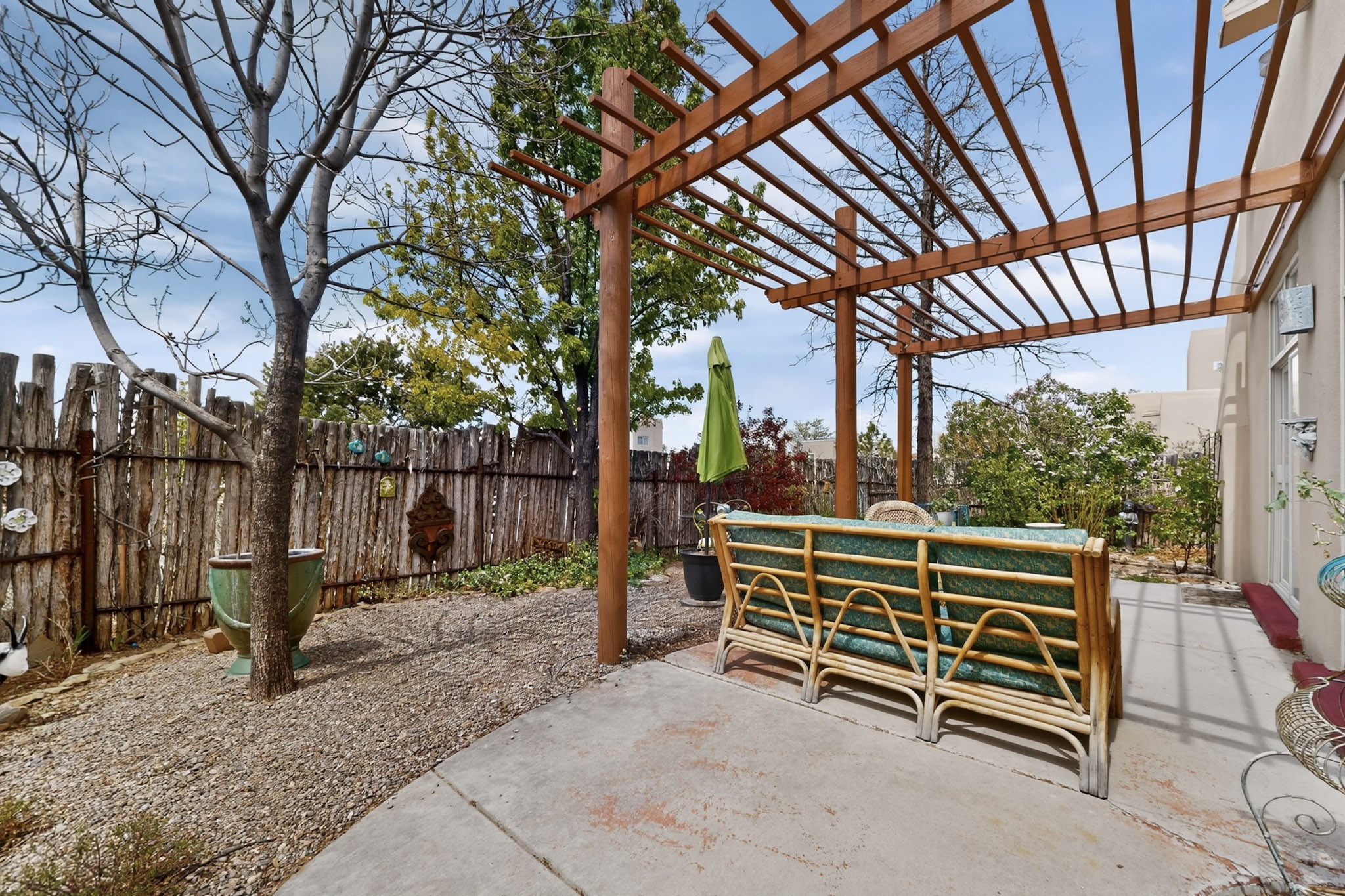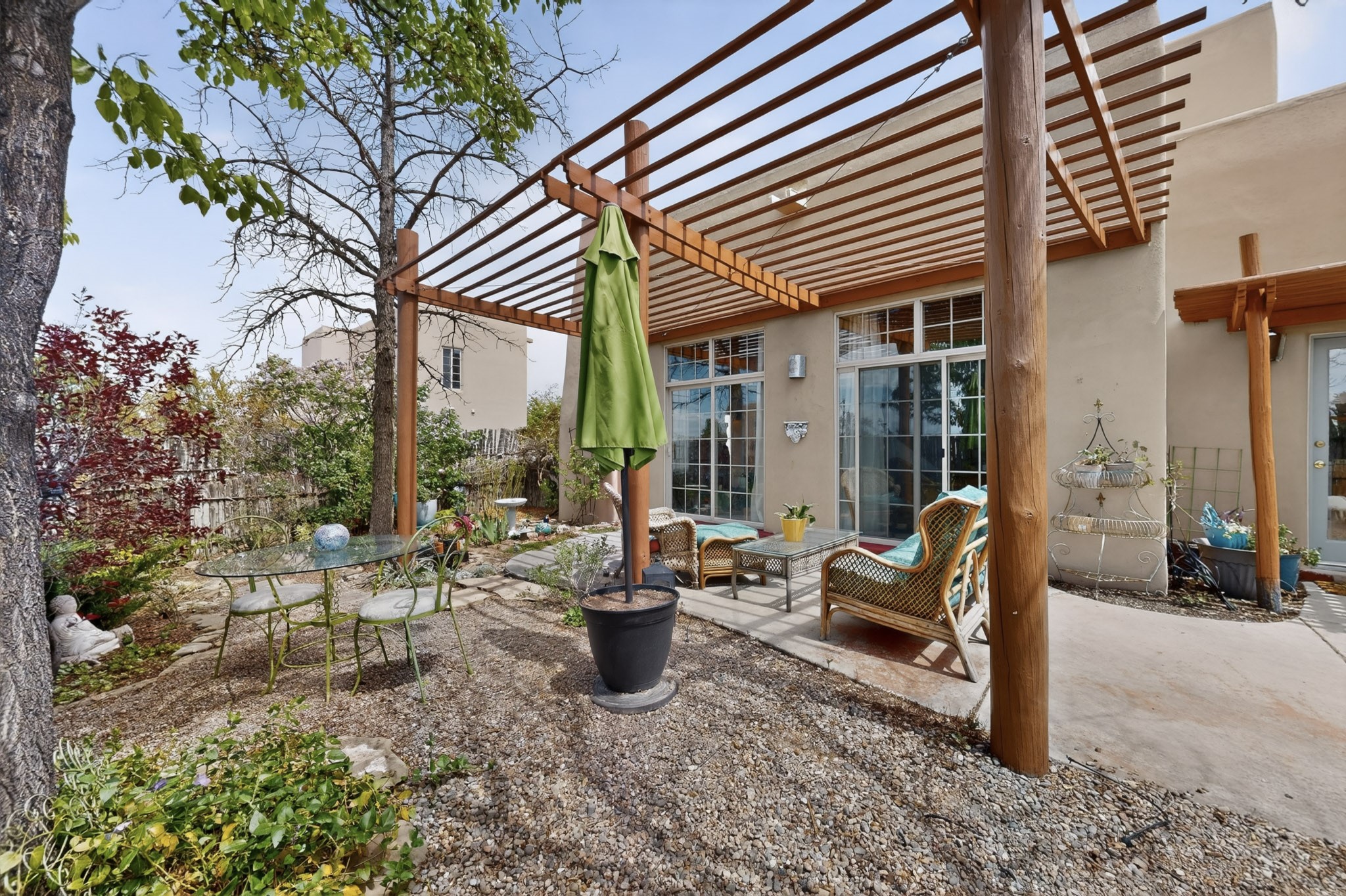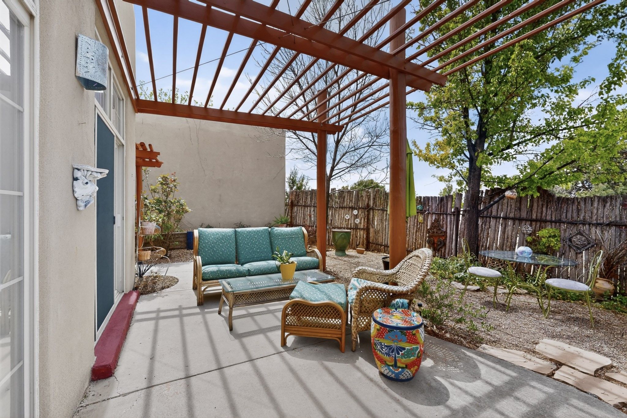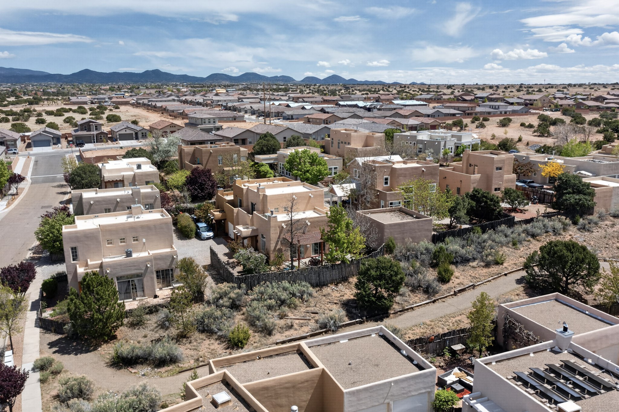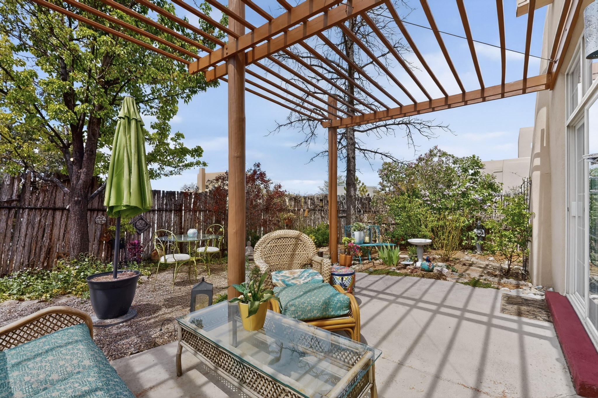 Pride of ownership throughout this absolutely charming Santa Fe home offering privacy as it backs to the walking trail & some open space--one of the cutest you'll ever see. With approximately 1300 +/- sqft, this thoughtfully designed residence offers 2 bedrooms (one upstairs & one downstairs) plus an additional upstairs flex loft space--ideal as a studio, office, playroom, or workout room--with direct access to a private balcony with views. With 2 full bathrooms, a finished 1-car garage with extra storage space, and additional onsite parking, this home blends comfort, convenience, and character. Each of the two bedrooms functions as a primary suite, complete with its own ensuite bath (one featuring double vanities). One suite is located upstairs and the other downstairs, offering privacy and flexibility for a variety of living arrangements. The inviting living room features high ceiling with vigas, tile floors, and a wood-burning fireplace, creating a warm and welcoming atmosphere. Doors open to the private, fenced and beautifully landscaped backyard with two pergolas --perfect for peaceful mornings or glowing Santa Fe sunsets. The kitchen continues the Santa Fe aesthetic with vigas and charming tile countertops, offering a delightful space for cooking. Features and amenities include: Forced air heat with central refrigerated A/C-Stackable washer and dryer-TPO roof-New smoke/carbon monoxide detectors, +/- 4-year-old refrigerator, Tile and laminate flooring, Carpet only on the stairs & more. Residents enjoy access to a clubhouse, workout room, hot tub, pool and a trail system connecting to the Arroyo Chamiso Trail--ideal for outdoor enthusiasts. Despite the peaceful setting, you're just minutes from hospitals, restaurants, shopping, and schools.