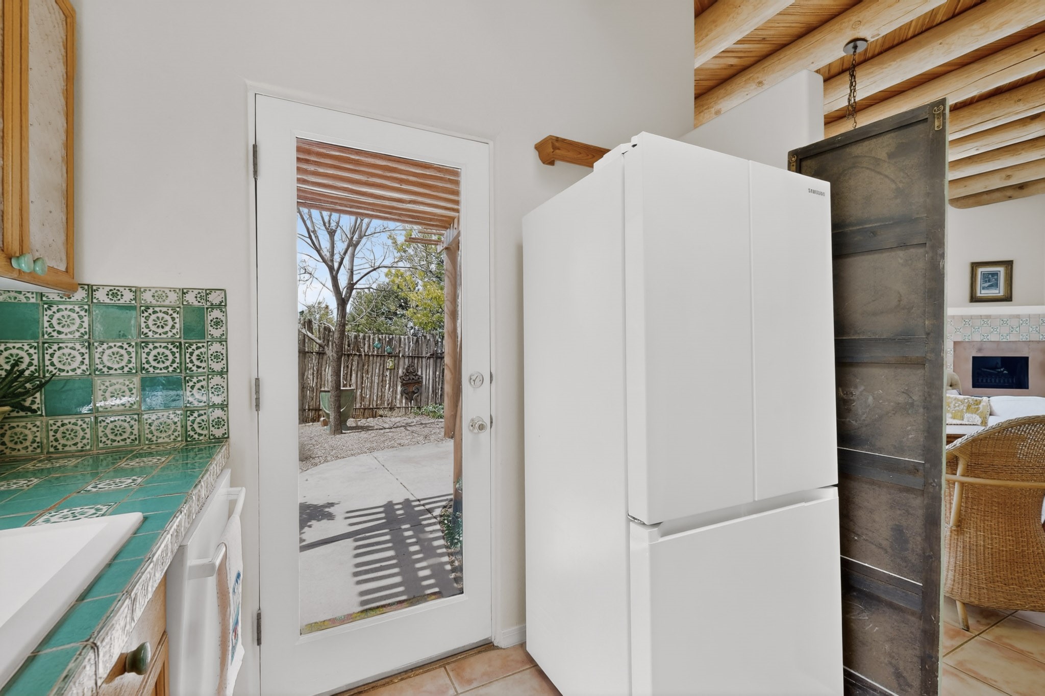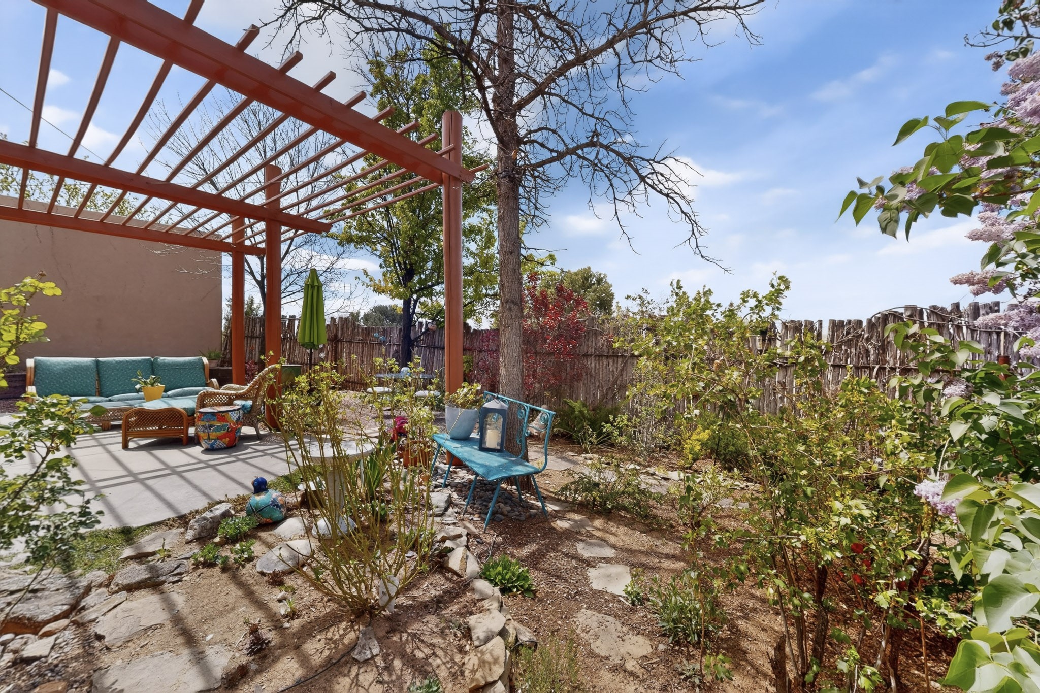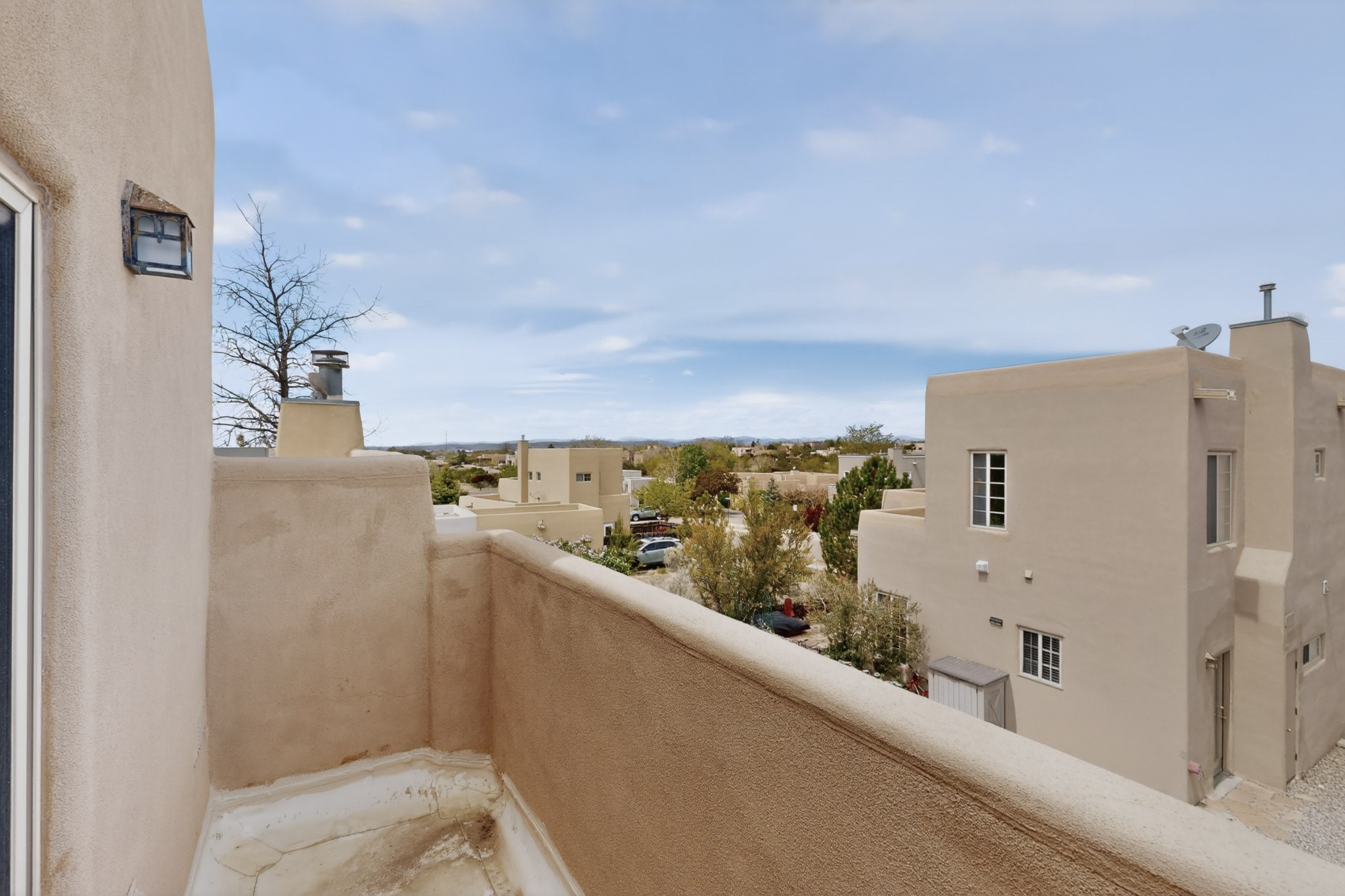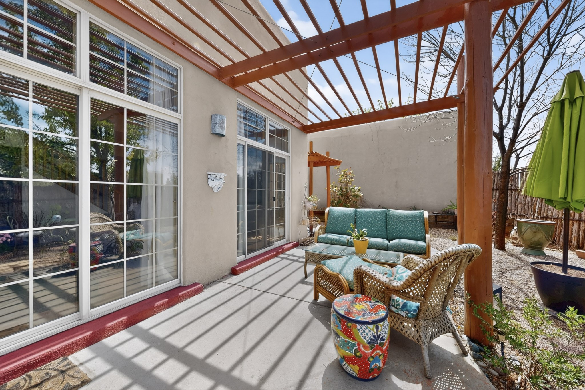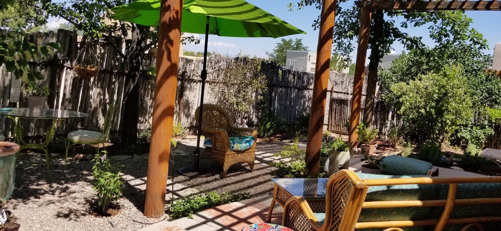 Pride of ownership throughout this absolutely charming Santa Fe home offering privacy as it backs to the walking trail & some open space--one of the cutest you'll ever see. With approximately 1300 +/- sqft, this thoughtfully designed residence offers 2 bedrooms (one upstairs & one downstairs) plus an additional upstairs flex loft space--ideal as a studio, office, playroom, or workout room--with direct access to a private balcony with views. With 2 full bathrooms, a finished 1-car garage with extra storage space, and additional onsite parking, this home blends comfort, convenience, and character. Each of the two bedrooms functions as a primary suite, complete with its own ensuite bath (one featuring double vanities). One suite is located upstairs and the other downstairs, offering privacy and flexibility for a variety of living arrangements. The inviting living room features high ceiling with vigas, tile floors, and a wood-burning fireplace, creating a warm and welcoming atmosphere. Doors open to the private, fenced and beautifully landscaped backyard with two pergolas --perfect for peaceful mornings or glowing Santa Fe sunsets. The kitchen continues the Santa Fe aesthetic with vigas and charming tile countertops, offering a delightful space for cooking. Features and amenities include: Forced air heat with central refrigerated A/C-Stackable washer and dryer-TPO roof-New smoke/carbon monoxide detectors, +/- 4-year-old refrigerator, Tile and laminate flooring, Carpet only on the stairs & more. Residents enjoy access to a clubhouse, workout room, hot tub, pool and a trail system connecting to the Arroyo Chamiso Trail--ideal for outdoor enthusiasts. Despite the peaceful setting, you're just minutes from hospitals, restaurants, shopping, and schools.