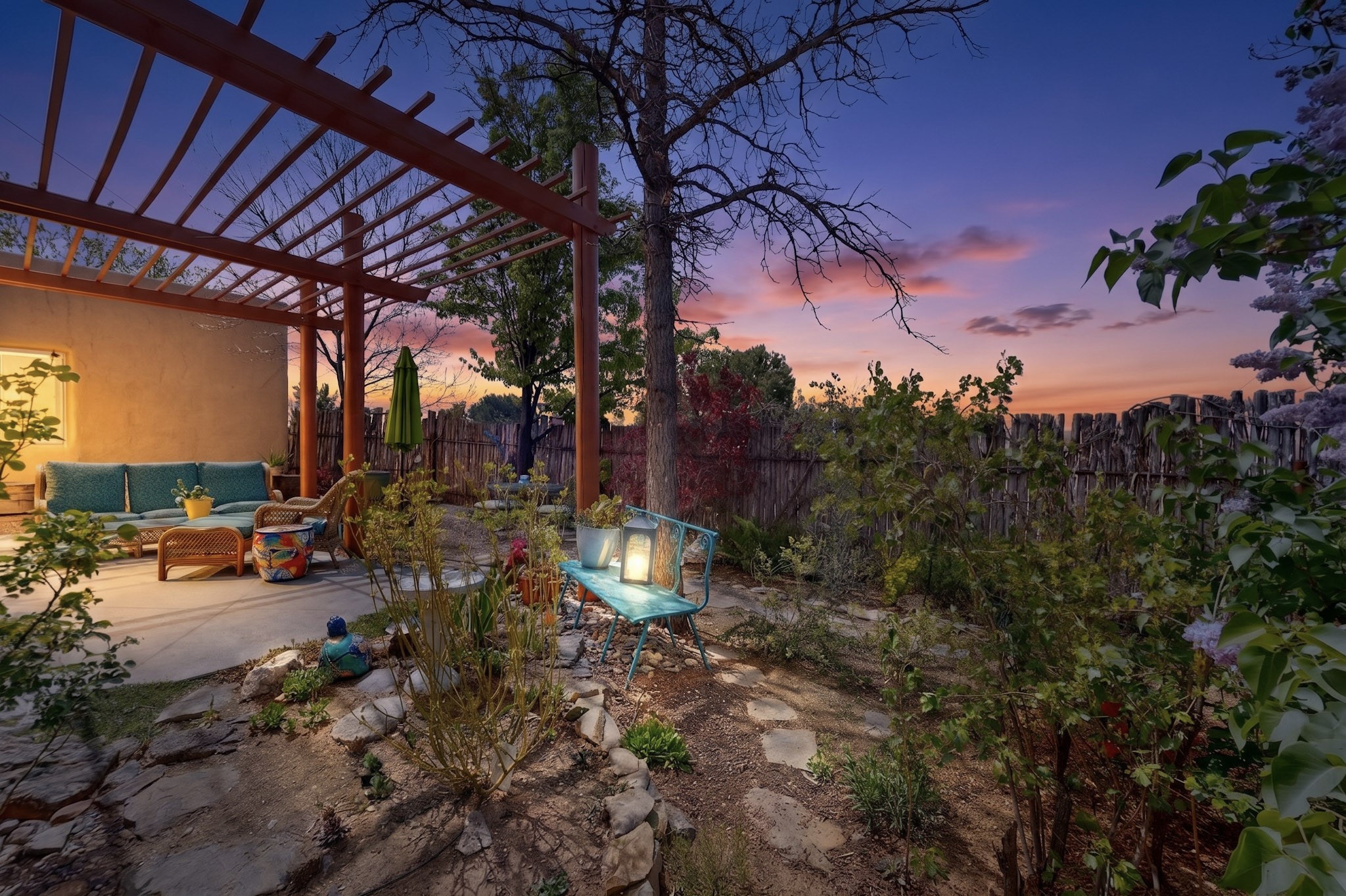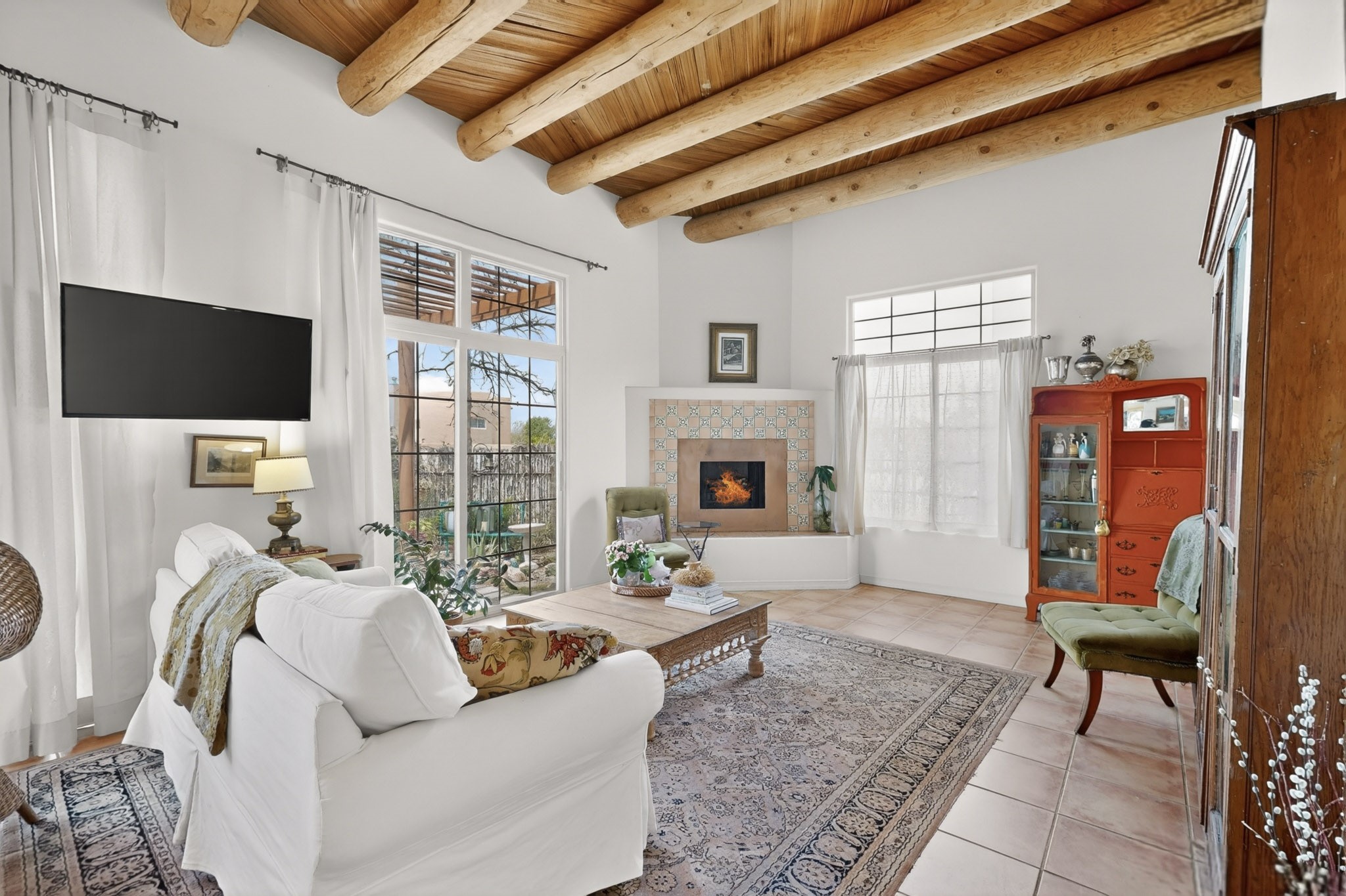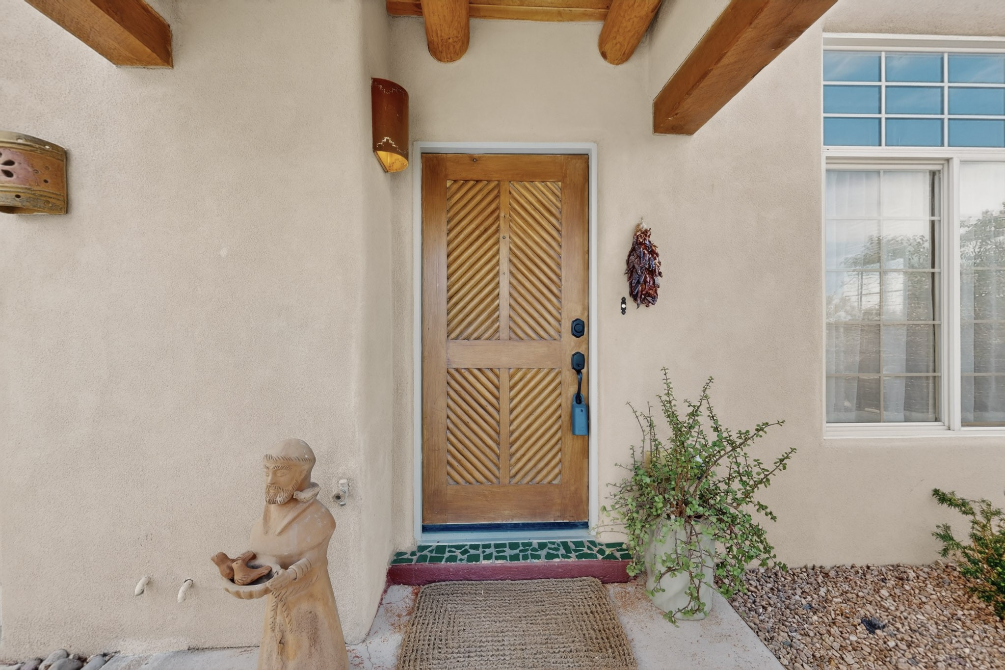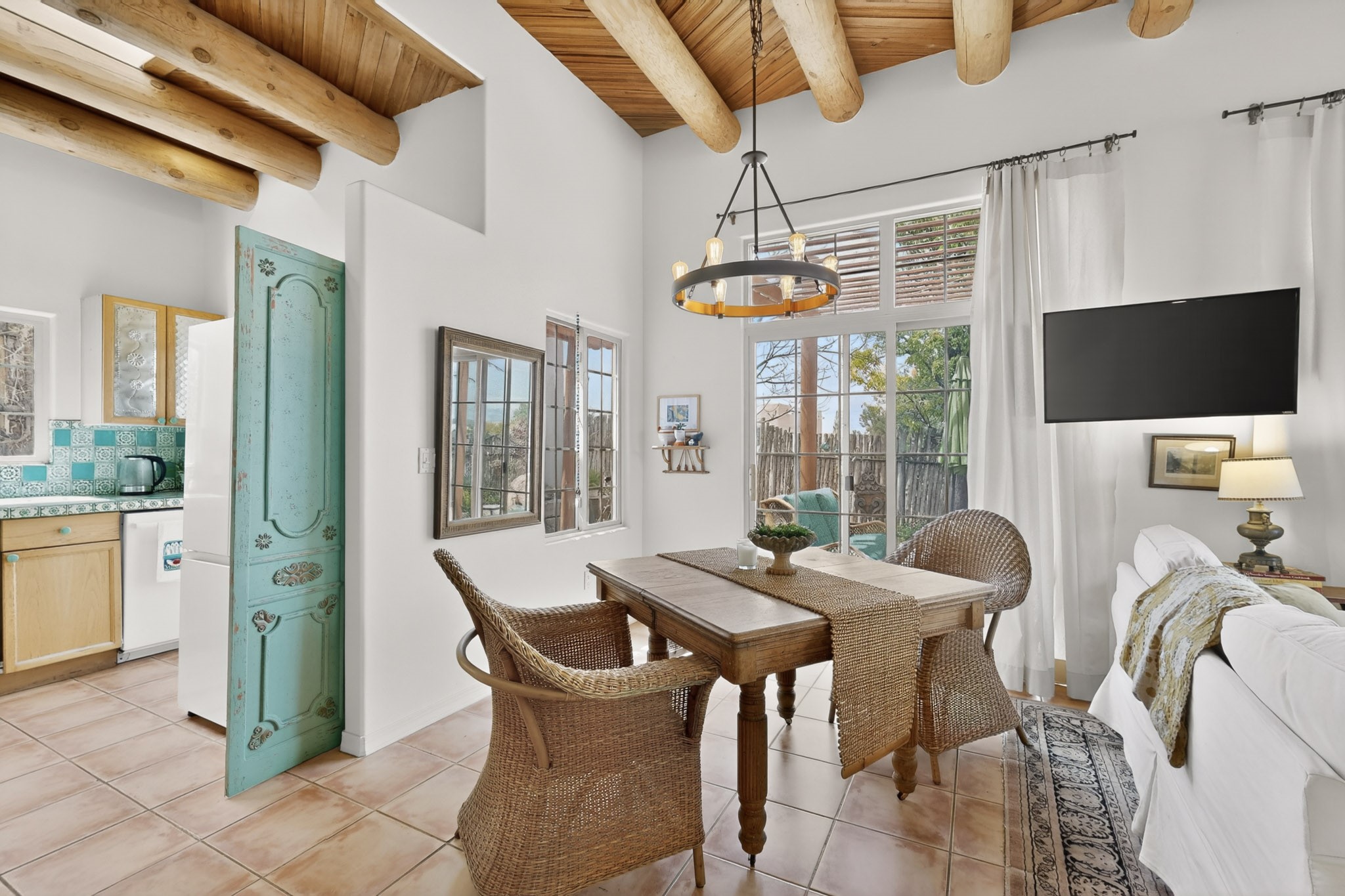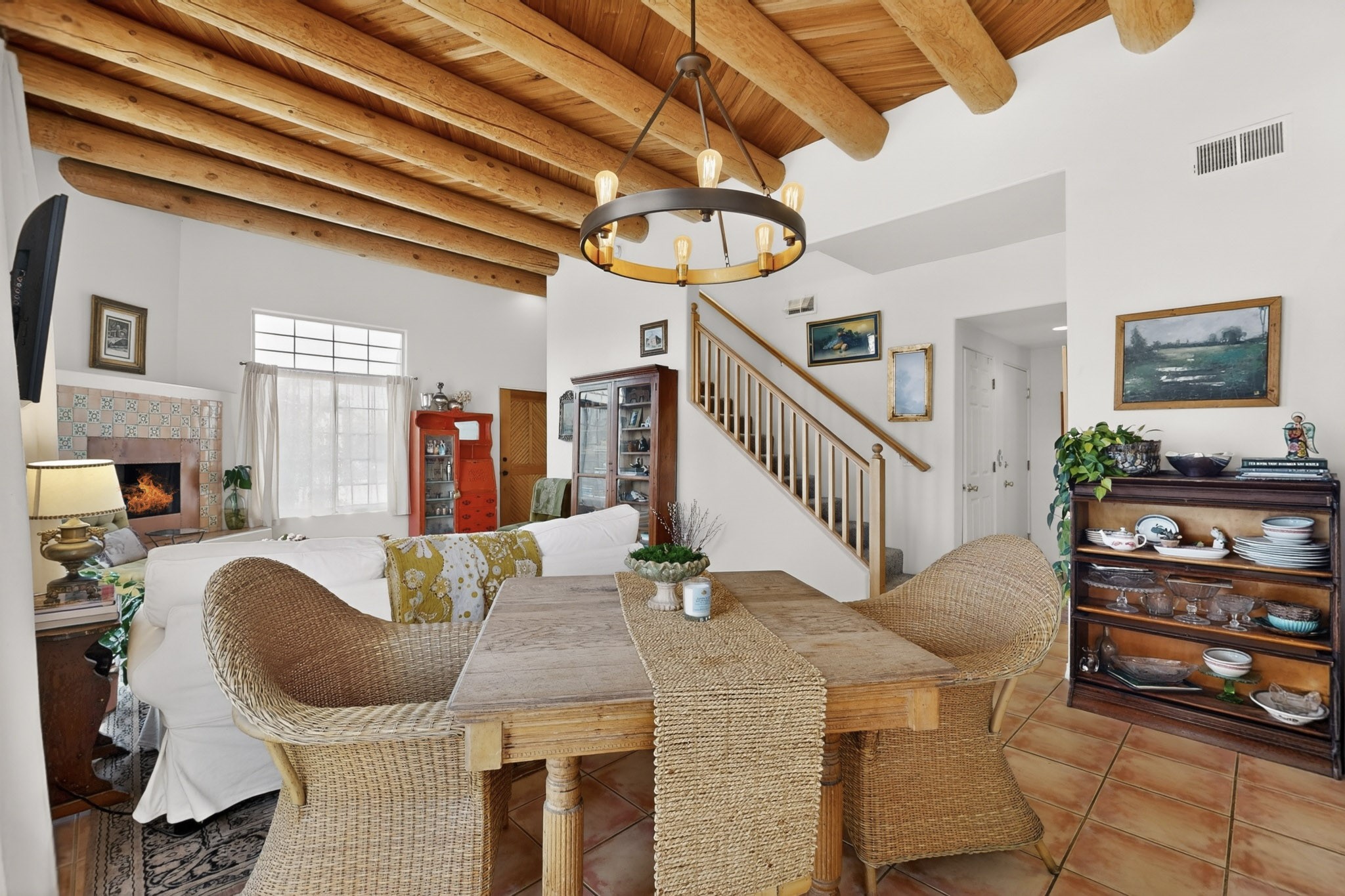 Pride of ownership throughout this absolutely charming Santa Fe home offering privacy as it backs to the walking trail & some open space--one of the cutest you'll ever see. With approximately 1300 +/- sqft, this thoughtfully designed residence offers 2 bedrooms (one upstairs & one downstairs) plus an additional upstairs flex loft space--ideal as a studio, office, playroom, or workout room--with direct access to a private balcony with views. With 2 full bathrooms, a finished 1-car garage with extra storage space, and additional onsite parking, this home blends comfort, convenience, and character. Each of the two bedrooms functions as a primary suite, complete with its own ensuite bath (one featuring double vanities). One suite is located upstairs and the other downstairs, offering privacy and flexibility for a variety of living arrangements. The inviting living room features high ceiling with vigas, tile floors, and a wood-burning fireplace, creating a warm and welcoming atmosphere. Doors open to the private, fenced and beautifully landscaped backyard with two pergolas --perfect for peaceful mornings or glowing Santa Fe sunsets. The kitchen continues the Santa Fe aesthetic with vigas and charming tile countertops, offering a delightful space for cooking. Features and amenities include: Forced air heat with central refrigerated A/C-Stackable washer and dryer-TPO roof-New smoke/carbon monoxide detectors, +/- 4-year-old refrigerator, Tile and laminate flooring, Carpet only on the stairs & more. Residents enjoy access to a clubhouse, workout room, hot tub, pool and a trail system connecting to the Arroyo Chamiso Trail--ideal for outdoor enthusiasts. Despite the peaceful setting, you're just minutes from hospitals, restaurants, shopping, and schools.