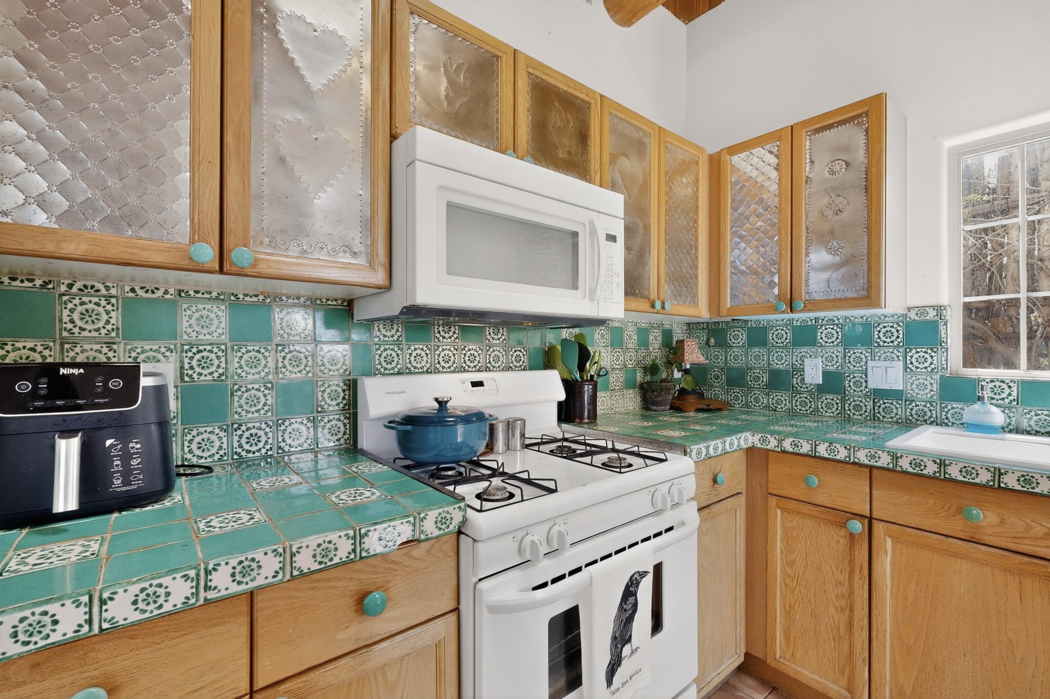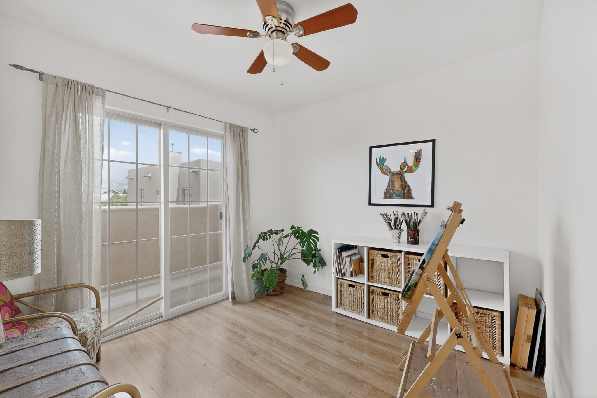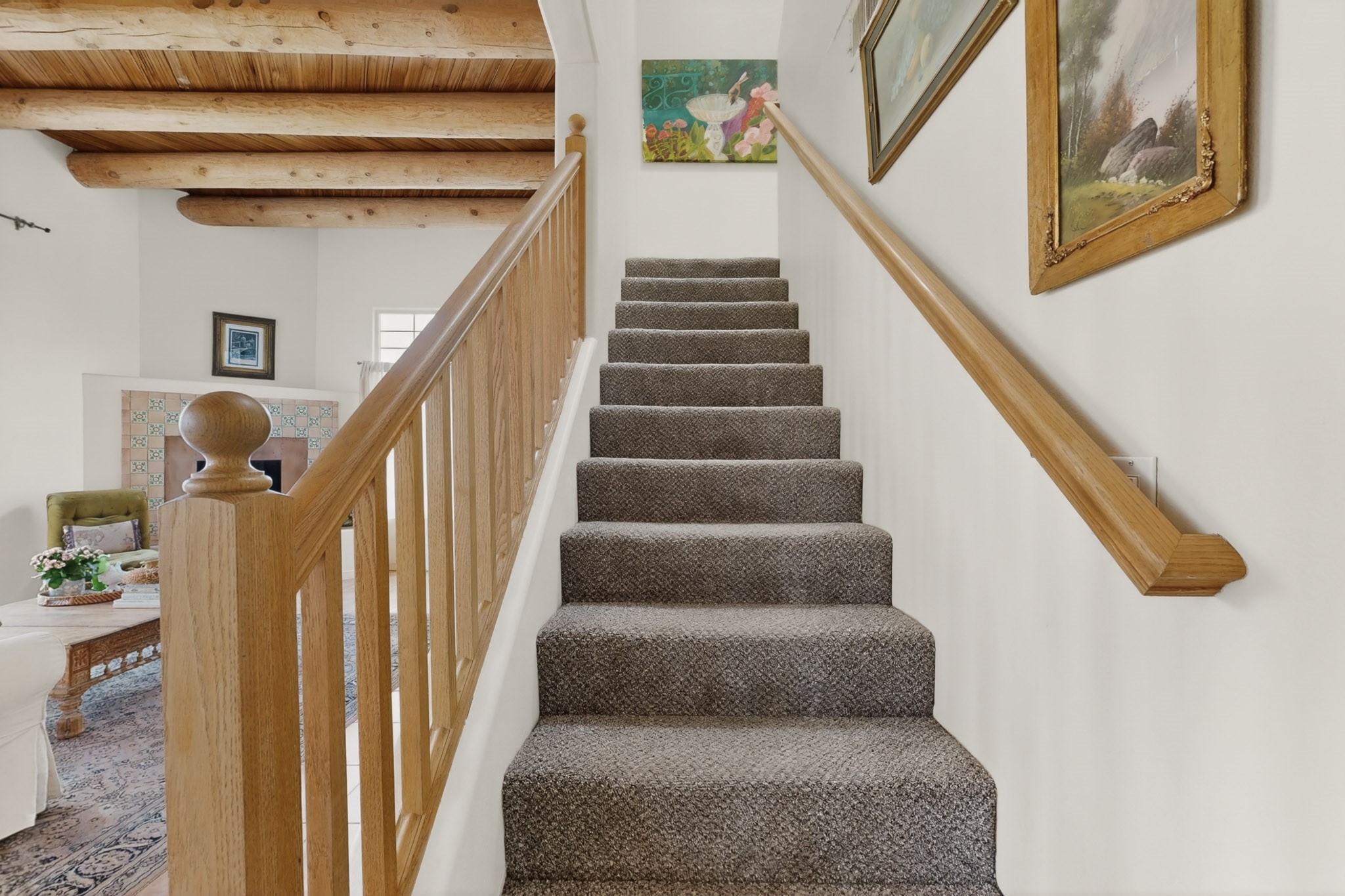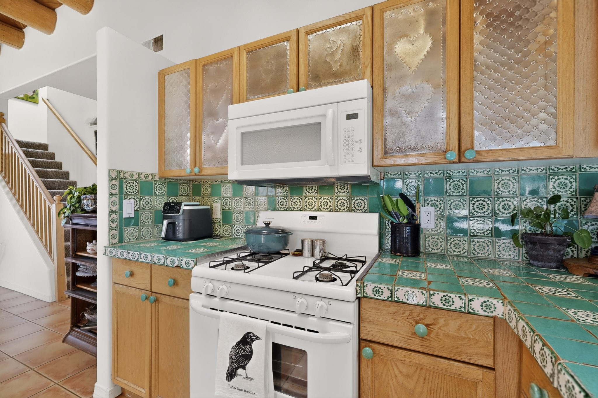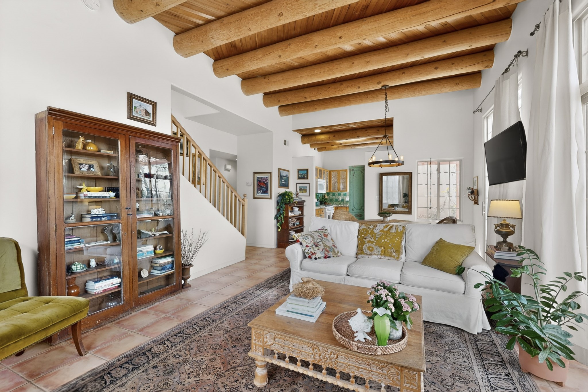 Pride of ownership throughout this absolutely charming Santa Fe home offering privacy as it backs to the walking trail & some open space--one of the cutest you'll ever see. With approximately 1300 +/- sqft, this thoughtfully designed residence offers 2 bedrooms (one upstairs & one downstairs) plus an additional upstairs flex loft space--ideal as a studio, office, playroom, or workout room--with direct access to a private balcony with views. With 2 full bathrooms, a finished 1-car garage with extra storage space, and additional onsite parking, this home blends comfort, convenience, and character. Each of the two bedrooms functions as a primary suite, complete with its own ensuite bath (one featuring double vanities). One suite is located upstairs and the other downstairs, offering privacy and flexibility for a variety of living arrangements. The inviting living room features high ceiling with vigas, tile floors, and a wood-burning fireplace, creating a warm and welcoming atmosphere. Doors open to the private, fenced and beautifully landscaped backyard with two pergolas --perfect for peaceful mornings or glowing Santa Fe sunsets. The kitchen continues the Santa Fe aesthetic with vigas and charming tile countertops, offering a delightful space for cooking. Features and amenities include: Forced air heat with central refrigerated A/C-Stackable washer and dryer-TPO roof-New smoke/carbon monoxide detectors, +/- 4-year-old refrigerator, Tile and laminate flooring, Carpet only on the stairs & more. Residents enjoy access to a clubhouse, workout room, hot tub, pool and a trail system connecting to the Arroyo Chamiso Trail--ideal for outdoor enthusiasts. Despite the peaceful setting, you're just minutes from hospitals, restaurants, shopping, and schools.