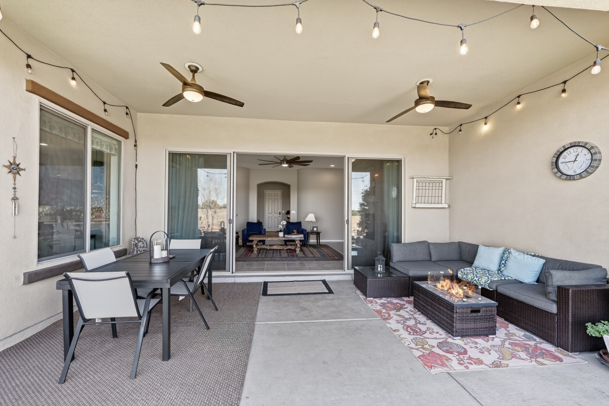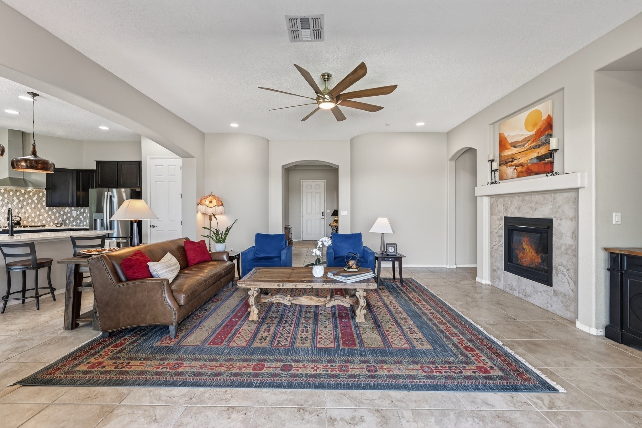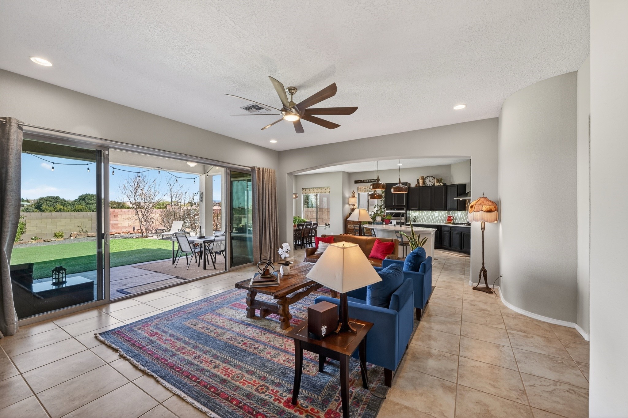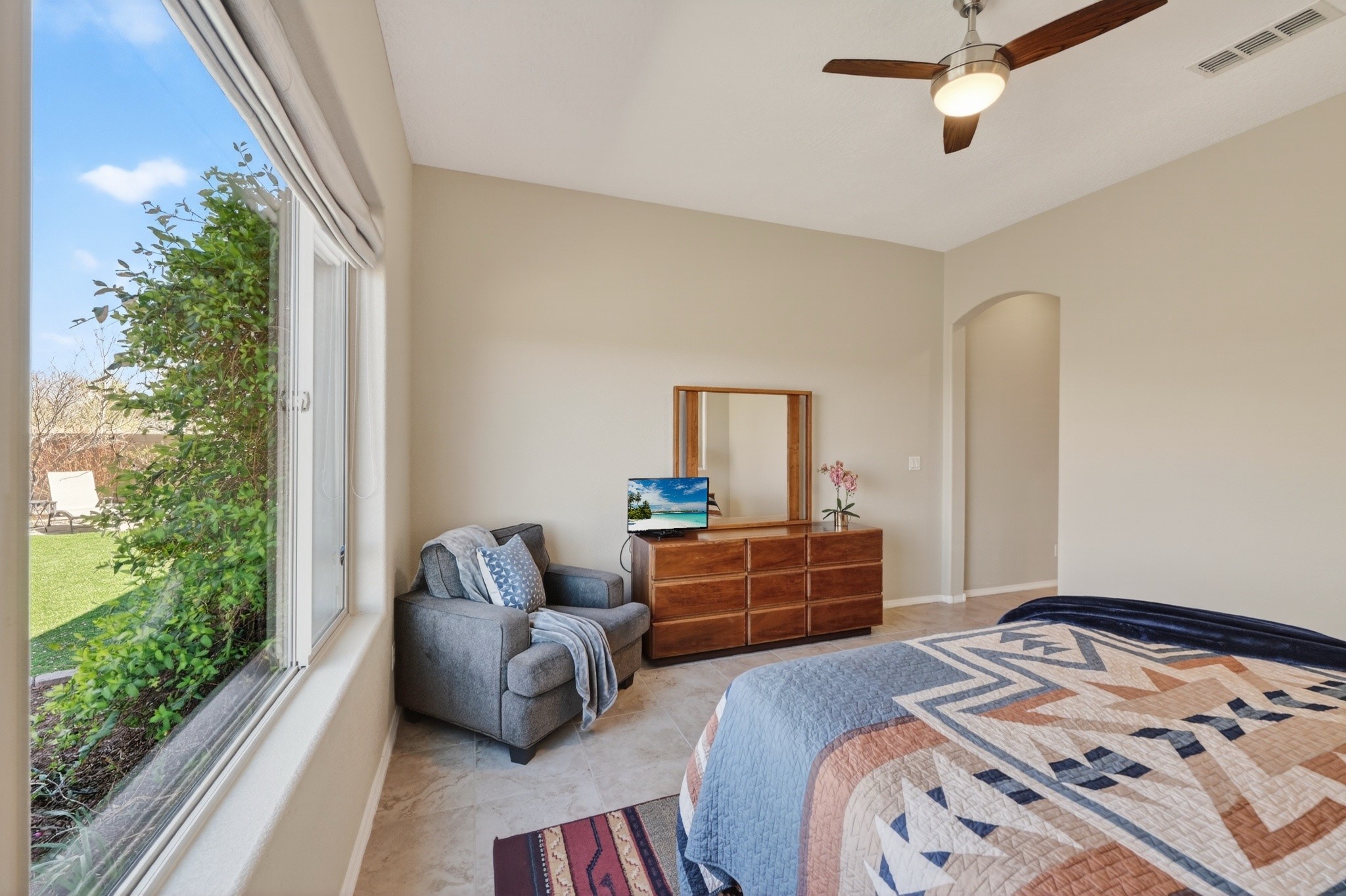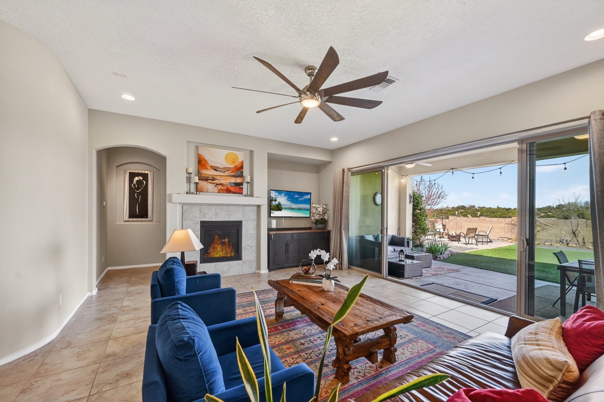 Welcome Home to 4144 Arboles Bonitos, Santa FeNestled in one of Santa Fe's most desirable neighborhoods, this stunning 3-bedroom, 2-bathroom home offers 2,303 square feet of thoughtfully designed living space with breathtaking mountain views that remind you daily why you chose the City Different.Quality craftsmanship shines throughout every detail. The kitchen features elegant decorator lighting, while a 5-foot lighted ceiling fan anchors the living room with style and comfort. Lighted ceiling fans grace each bedroom, and the primary suite boasts an impressive 7'x10'walk-in closet that rivals a boutique dressing room. Air conditioning keeps you comfortable through warm summer months.The garage is a dream workspace, outfitted with epoxy flooring, approximately 12'6" of New Age modular workbench and cabinetry, a 6'x6'slatwall storage system with hooks, and roughly 70 square feet of wall-mounted drop-down storage.Step outside into a professionally landscaped backyard featuring an approximately 30'x24'turf area -- perfect for entertaining, play, or simply relaxing under the New Mexico sky. Fruit-bearing peach and apple trees add charm and seasonal harvests, while solar landscape lighting illuminates both front and back yards beautifully after sunset.The surrounding community offers exceptional convenience. Monte del Sol Charter School sits just minutes away, Dancing Ground Park provides nearby recreation, and everyday essentials like Target Grocery and public transit are easily accessible along the Cerrillos corridor.This is more than a house -- it's a lifestyle waiting for you. Schedule your private showing today!