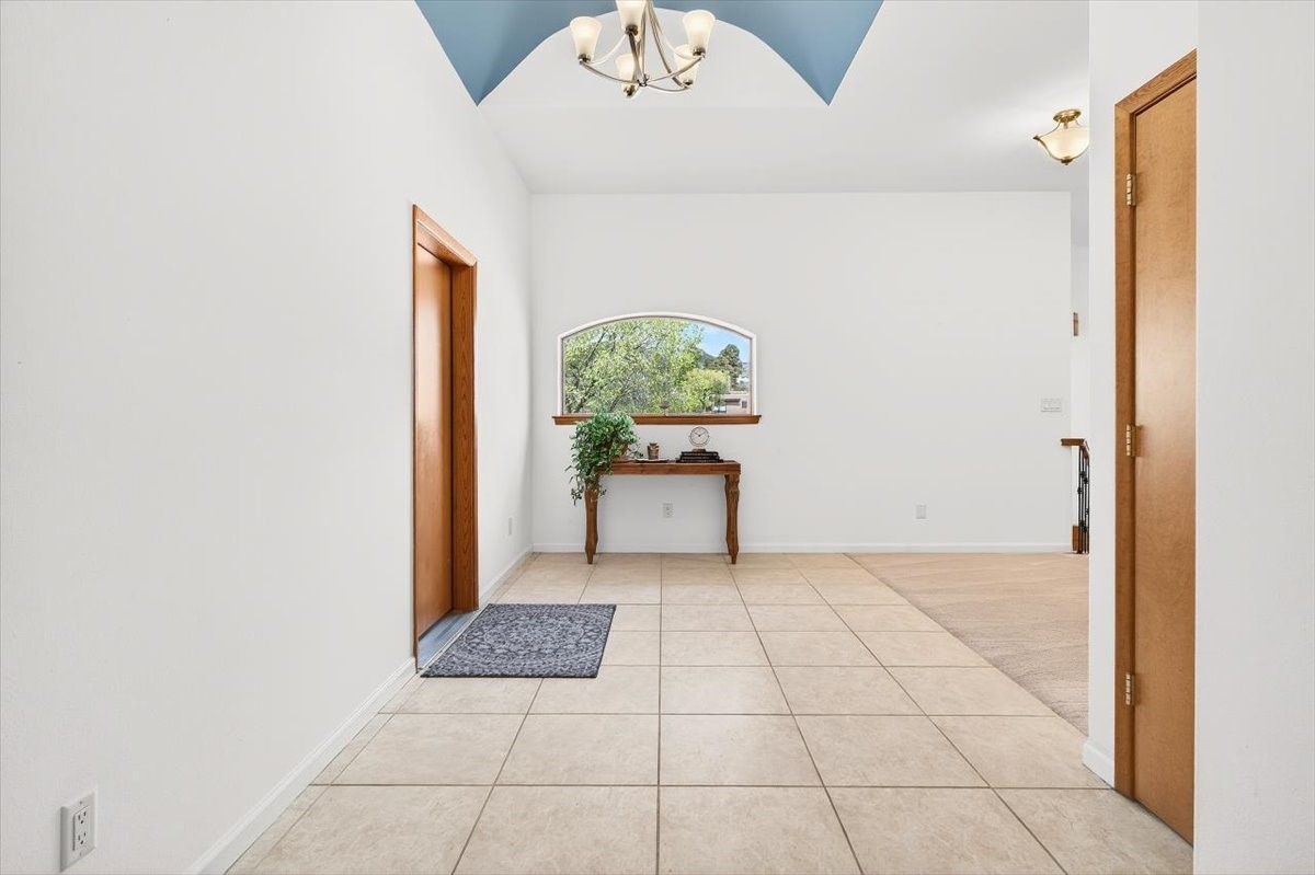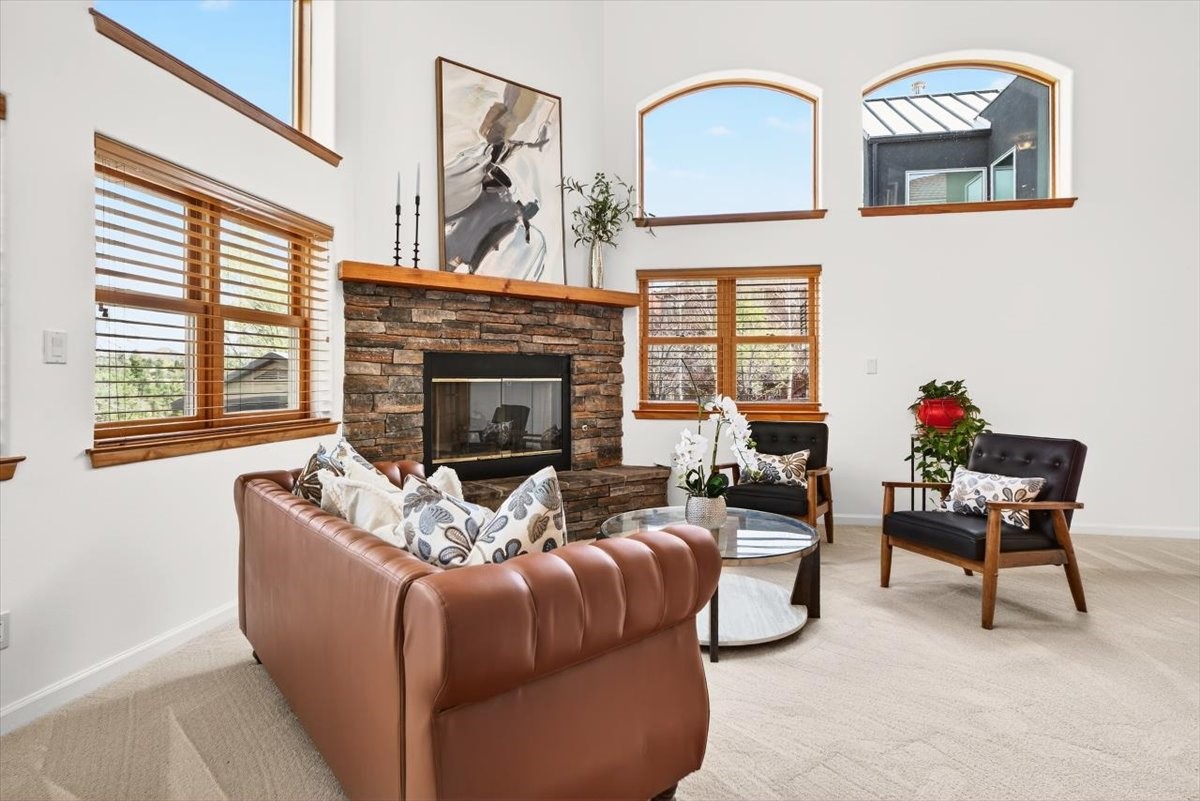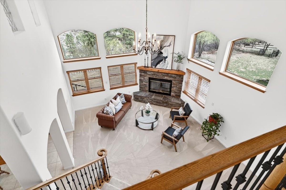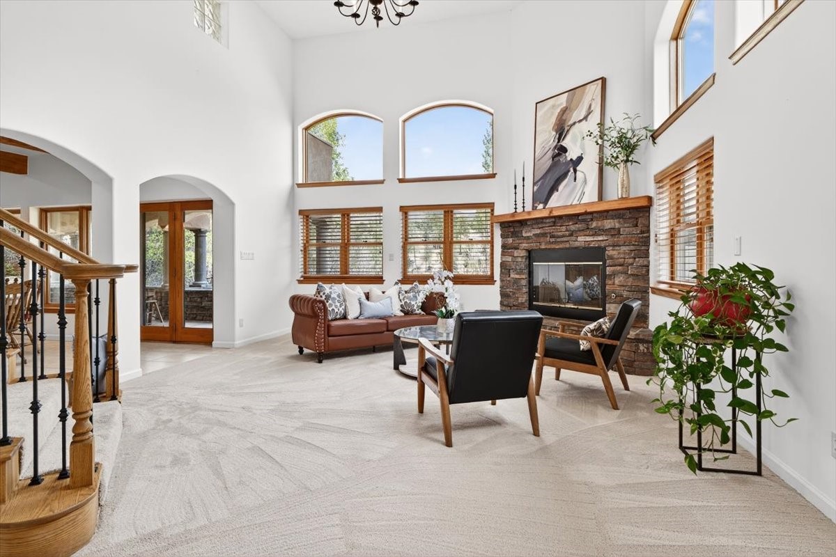 Crafted with enhanced safety standards and durability at the forefront, this 2004-built residence features exceptional construction, including 2x10 wall framing with R-32 insulation and a 1.5-inch fire-rated stucco exterior. The 2011 metal roof, designed to resemble classic clay tile, is fully fireproof and includes a transferable warranty, while double-pane skylights enhance both efficiency and natural light. A grand foyer welcomes you inside, where a striking stone fireplace and iron staircase anchor the living spaces and set a refined tone. Arched windows accentuate the home's distinctive character and fill the space with natural light. The upper level features two bedrooms, including a well-appointed primary suite with a spa-like bath, generous walk-in closet, and private sitting area. A den overlooks the living room below, adding dimension and openness to the design. The lower level serves as the heart of the home. Arched architectural details lead into the dining area and kitchen, where custom alder wood cabinetry, granite tile countertops, and a 2025 appliance suite create a functional and stylish workspace. An island with a pullout workstation offers added versatility. This level also includes two additional bedrooms and direct access to the backyard. Just off the kitchen, the patio is thoughtfully designed for year-round enjoyment, complete with integrated Bose speakers and a balance of shelter and openness ideal for entertaining. A 550-square-foot bonus room--originally designed as a dance studio--offers flexible use as a home theater, game room, or creative space. Additional features include in-floor radiant heating throughout both levels, central air conditioning, and solid-core ADA compliant doors. The oversized garage accommodates larger vehicles. Located near hiking trails, public transportation, and the local high school, this property combines thoughtful design, quality construction, and everyday livability. Schedule a private showing today.