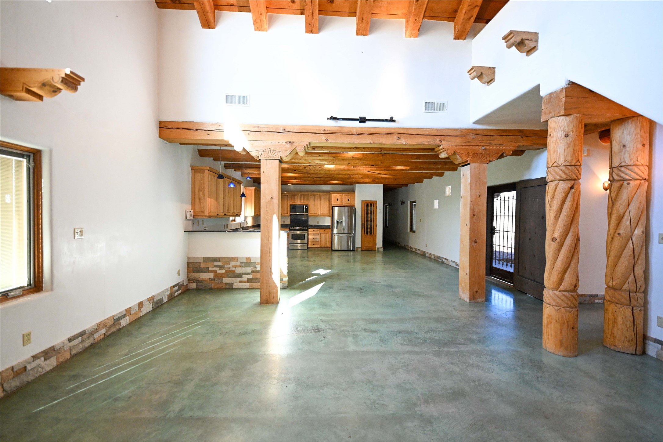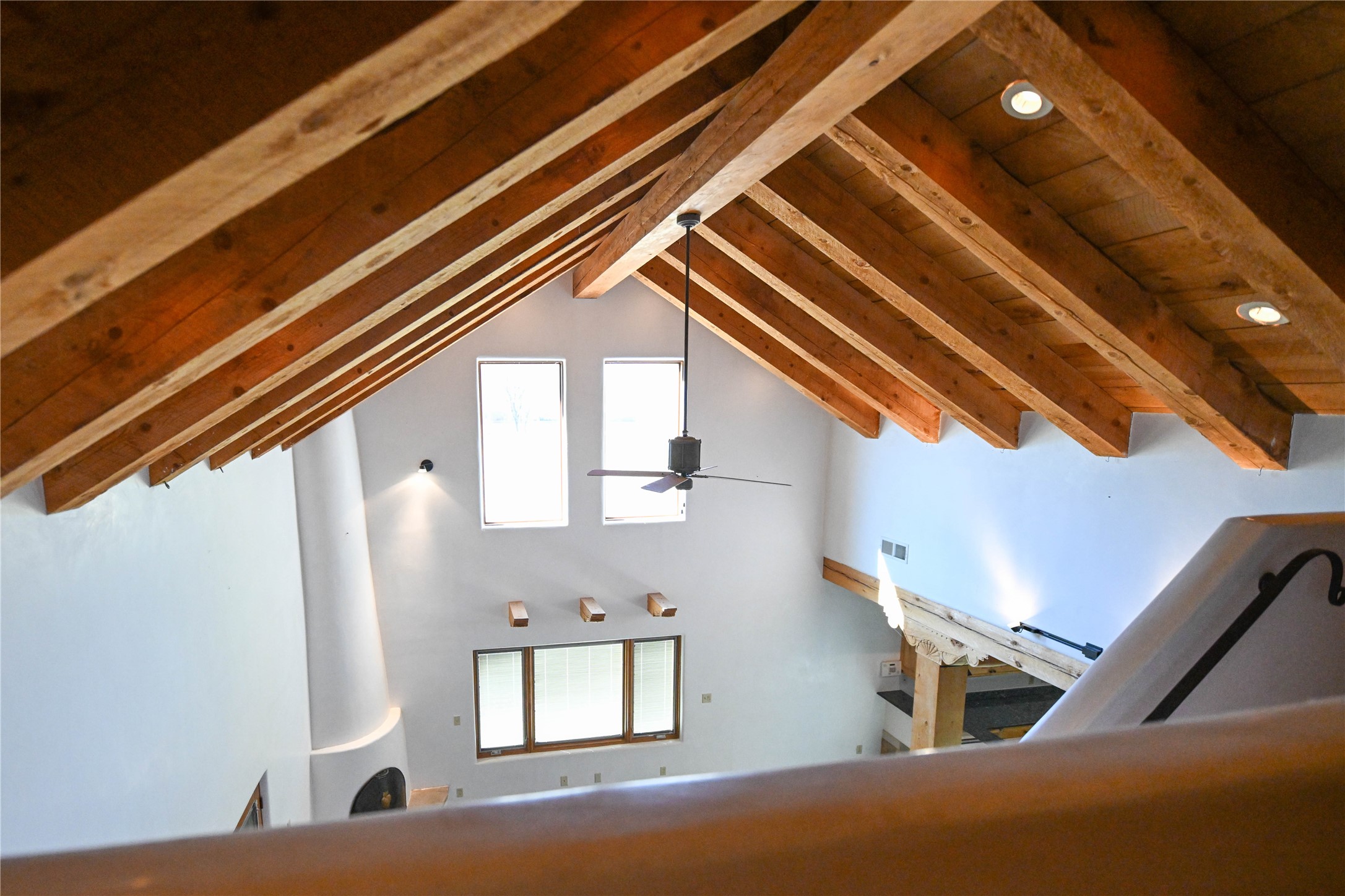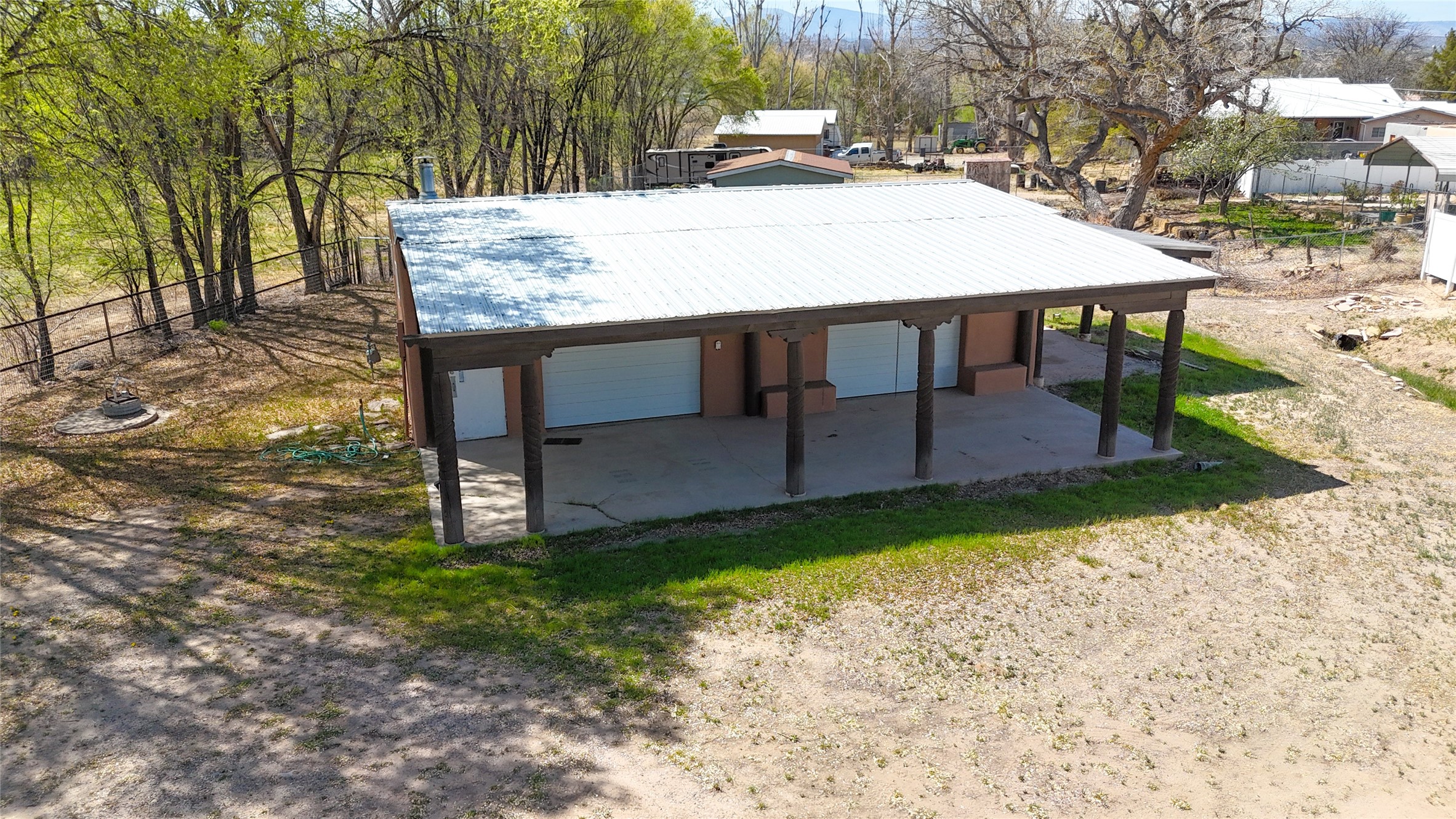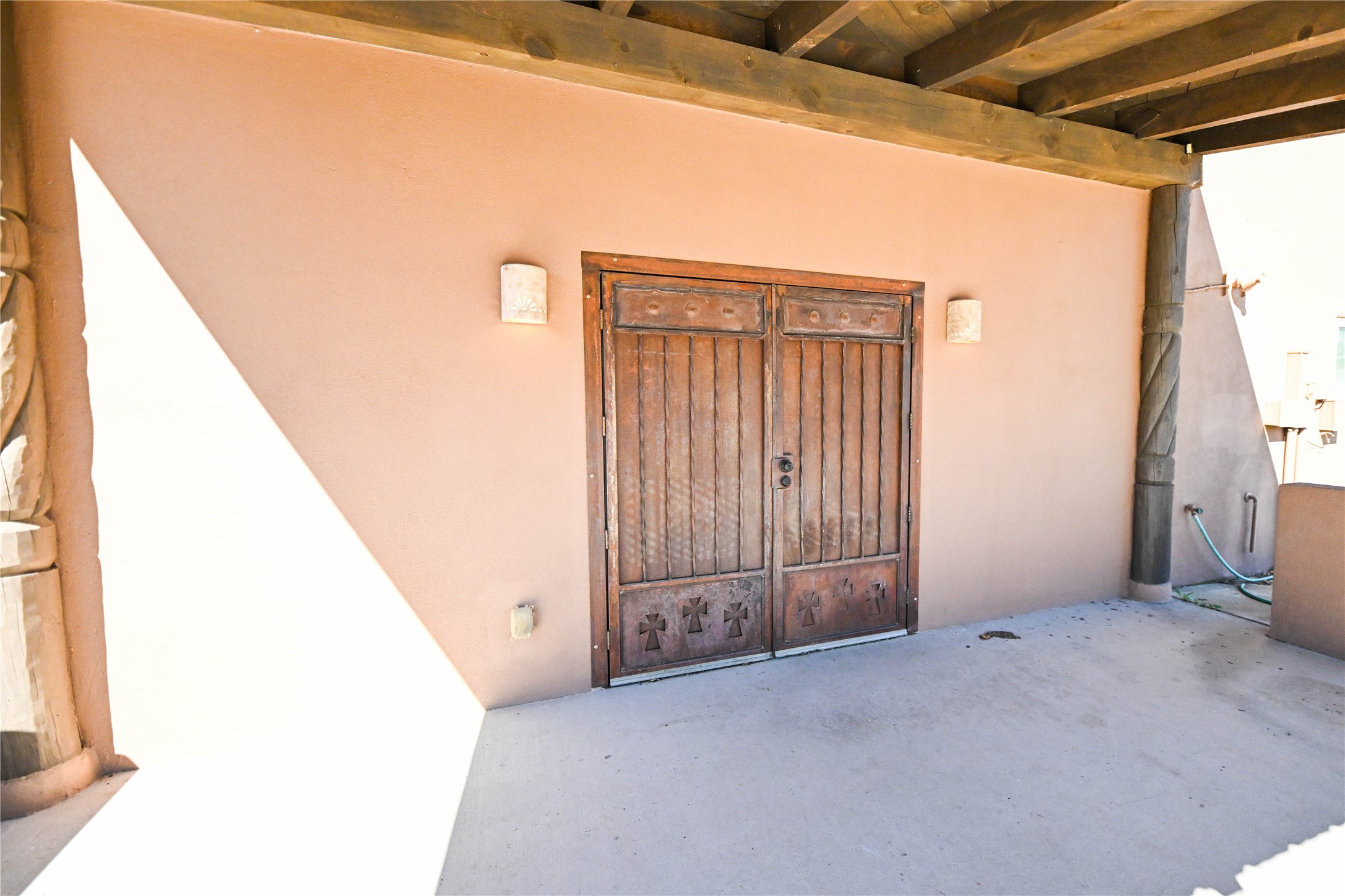 Southwest style home on .6 acres with water rights, built around 2005 and designed with flexibility in mind.The main living space is open and inviting, with vigas, high ceilings, natural light, and a kiva fireplace. Custom wood doors and finishes throughout give the home a distinct New Mexico character that stands apart from typical construction.The layout includes two bedrooms and two bathrooms, along with an upper level loft that has been used for guest sleeping, offering additional living space beyond the traditional floor plan.Just off the back patio, a detached studio with mini split provides a separate, conditioned space ideal for a home office, gym, or extended stay use, with room to expand.A large garage and workshop with wood stove adds even more flexibility, supported by ample exterior parking, including space for multiple vehicles or RV use.Radiant heat and refrigerated air provide year round comfort. Convenient access to Santa Fe and Los Alamos.