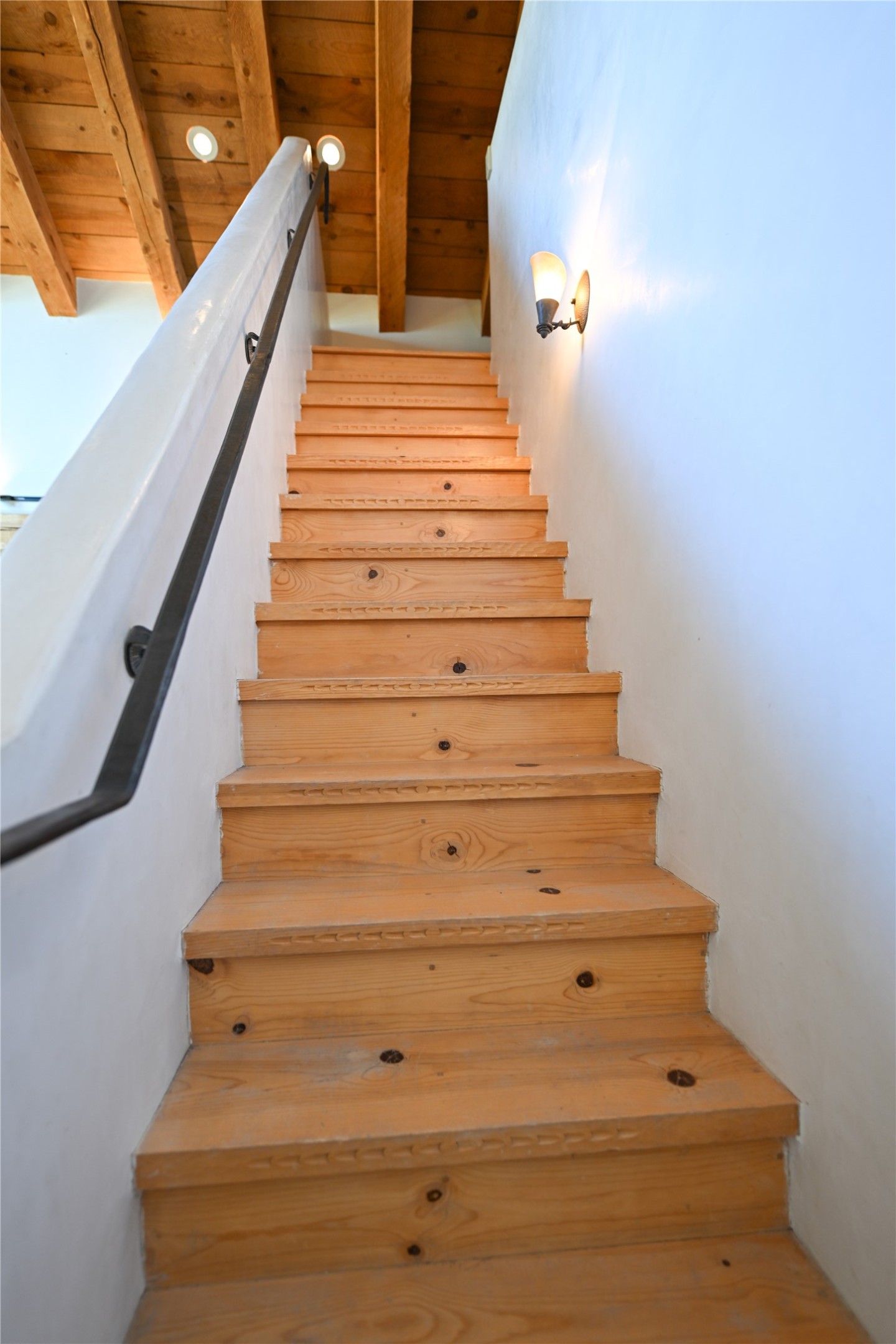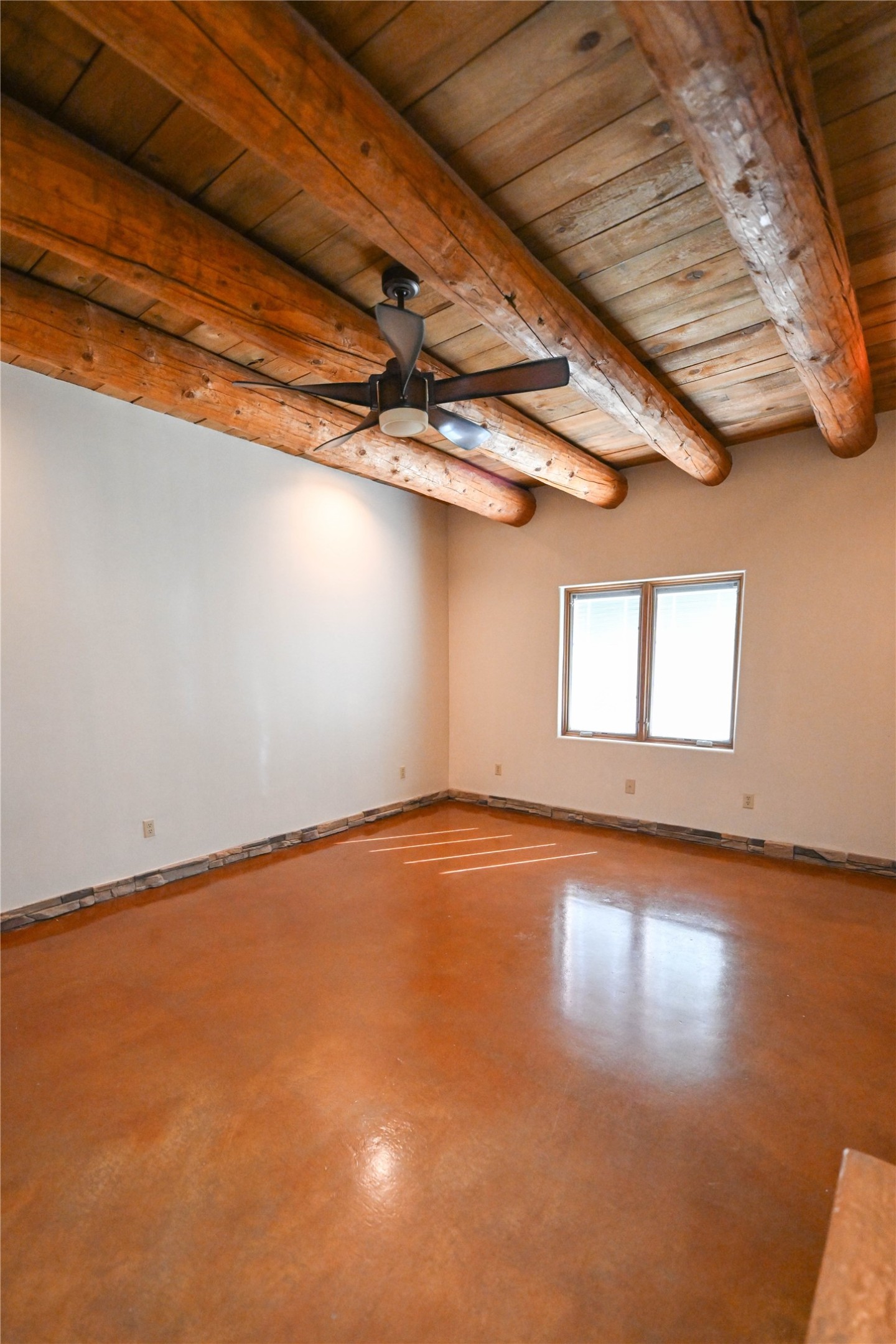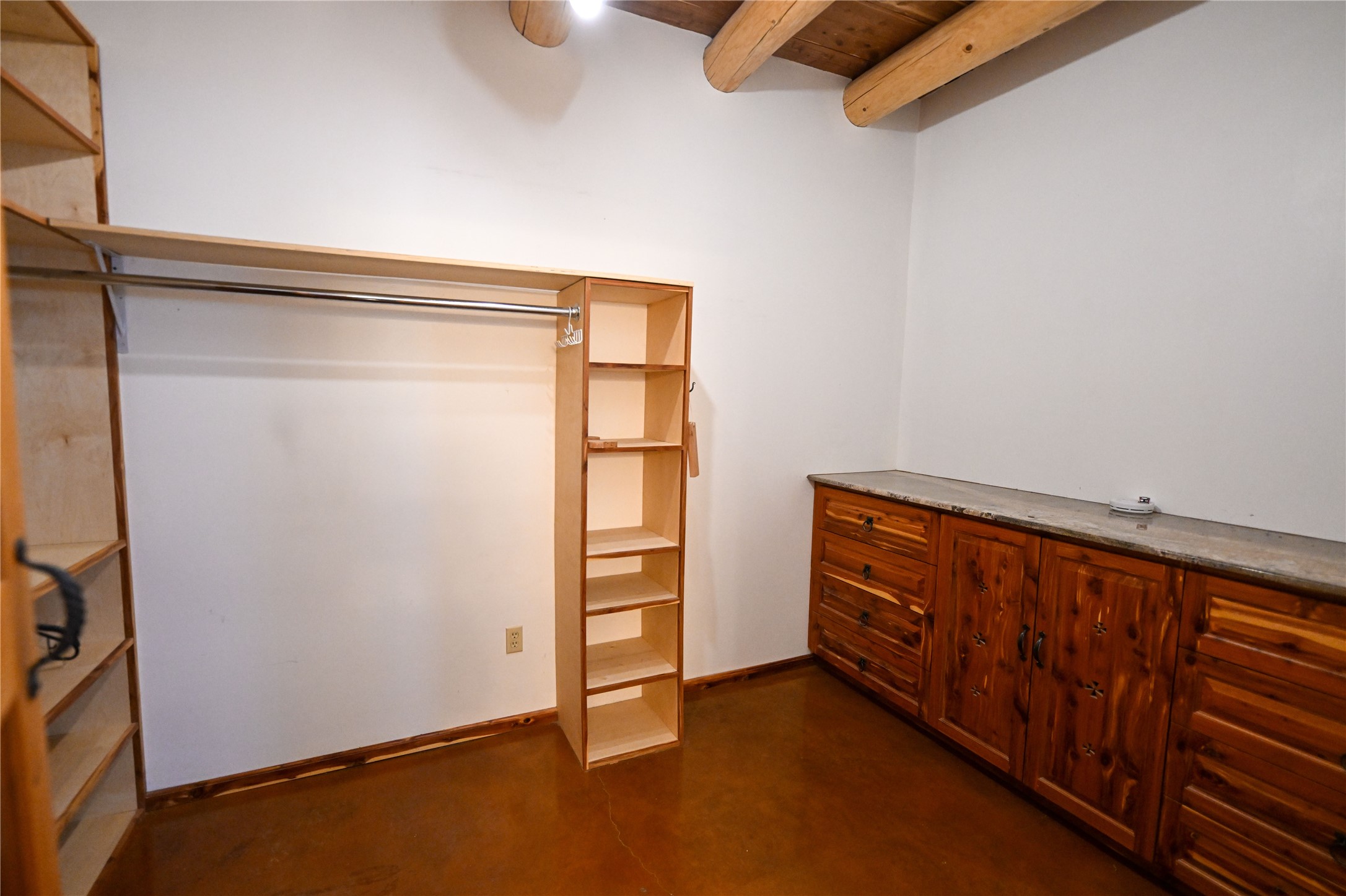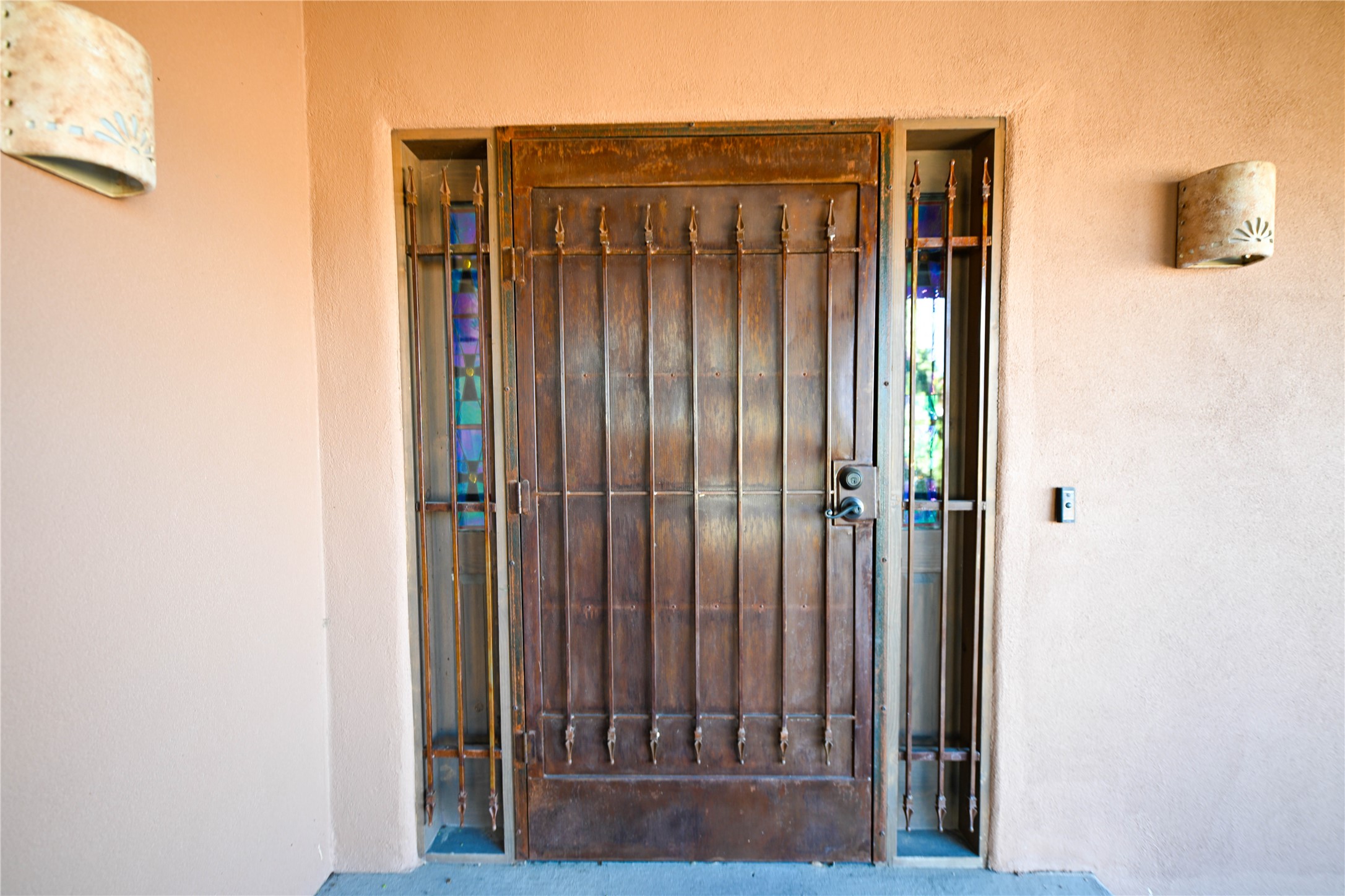 Southwest style home on .6 acres with water rights, built around 2005 and designed with flexibility in mind.The main living space is open and inviting, with vigas, high ceilings, natural light, and a kiva fireplace. Custom wood doors and finishes throughout give the home a distinct New Mexico character that stands apart from typical construction.The layout includes two bedrooms and two bathrooms, along with an upper level loft that has been used for guest sleeping, offering additional living space beyond the traditional floor plan.Just off the back patio, a detached studio with mini split provides a separate, conditioned space ideal for a home office, gym, or extended stay use, with room to expand.A large garage and workshop with wood stove adds even more flexibility, supported by ample exterior parking, including space for multiple vehicles or RV use.Radiant heat and refrigerated air provide year round comfort. Convenient access to Santa Fe and Los Alamos.