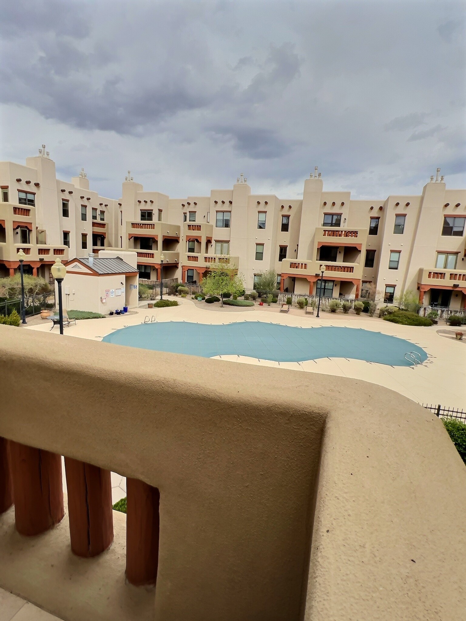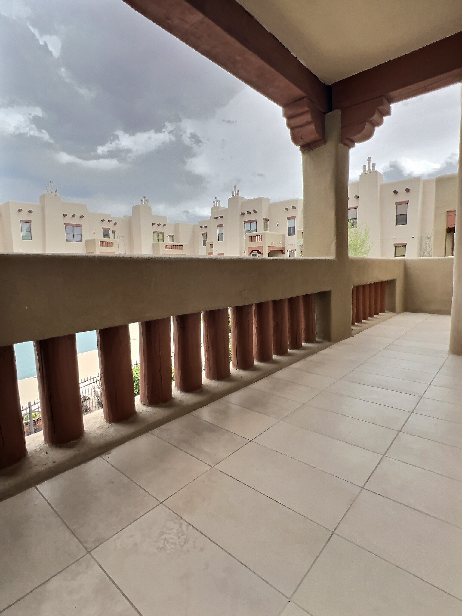 Welcome to this exceptional residence in the highly sought-after Alameda Condo Association, where timeless Santa Fe charm meets elevated modern living. This prime second-floor unit showcases stunning 10-foot viga ceilings in the living room, creating a warm, inviting atmosphere filled with character and natural elegance. The thoughtfully designed interior features granite countertops, a gas kiva fireplace, full-size washer and dryer, and refrigerated A/C for year-round comfort. The spacious, open layout is ideal for both relaxing and entertaining. Step outside to your private balcony with two separate entrances, overlooking the sparkling pool--an ideal setting for morning coffee or evening unwinding. This rare and highly desirable unit offers both convenience and privacy. The primary suite serves as a true retreat, complete with an en suite bathroom featuring a separate soaking tub and shower. A second bedroom and full bath provide flexibility for guests or a home office. Residents of The Alameda enjoy access to an elegant clubhouse with multiple entertainment spaces and kitchens, a heated outdoor pool, fitness center, and beautifully designed lounge areas. The unit is ideally located just steps from the fitness room and includes a private storage closet and a dedicated garage.Set within a gated community with direct access to scenic walking and hiking trails, this home also offers close proximity to premier shopping, dining, and entertainment. This is a rare opportunity to own a refined, resort-style retreat--don't miss your chance to make it yours.
