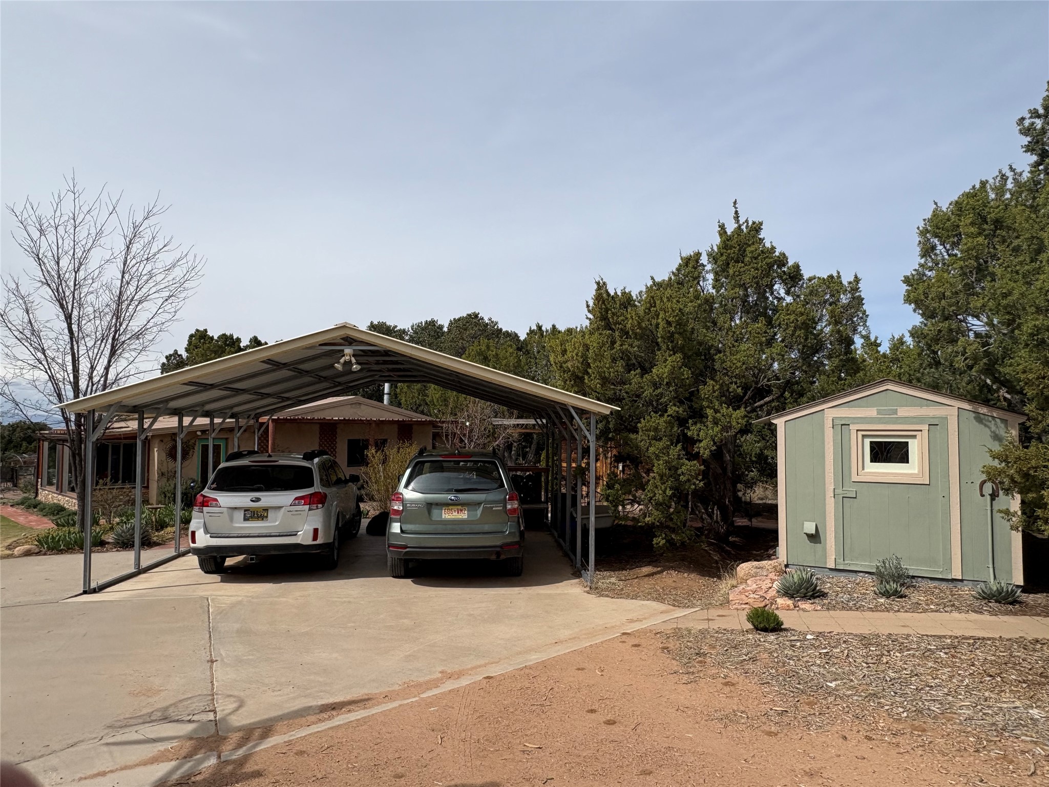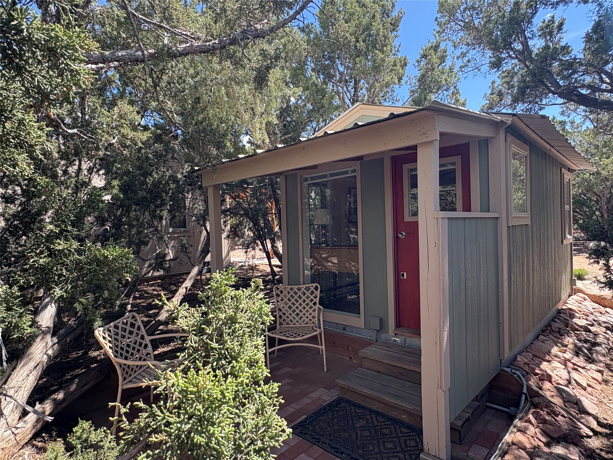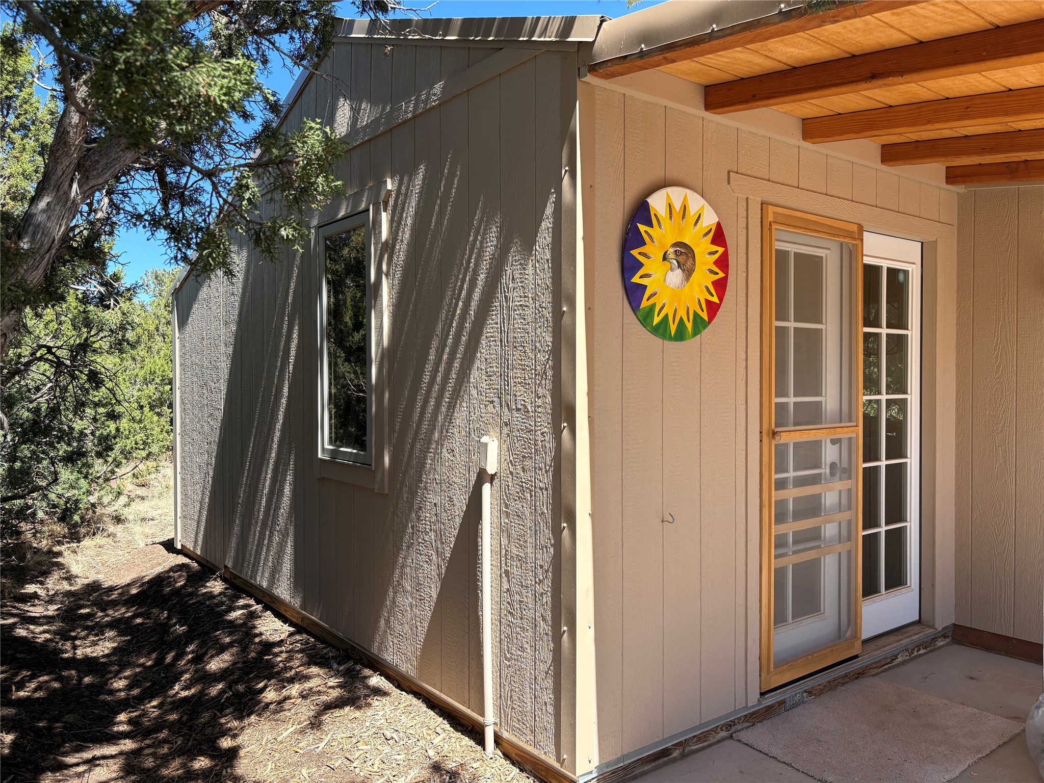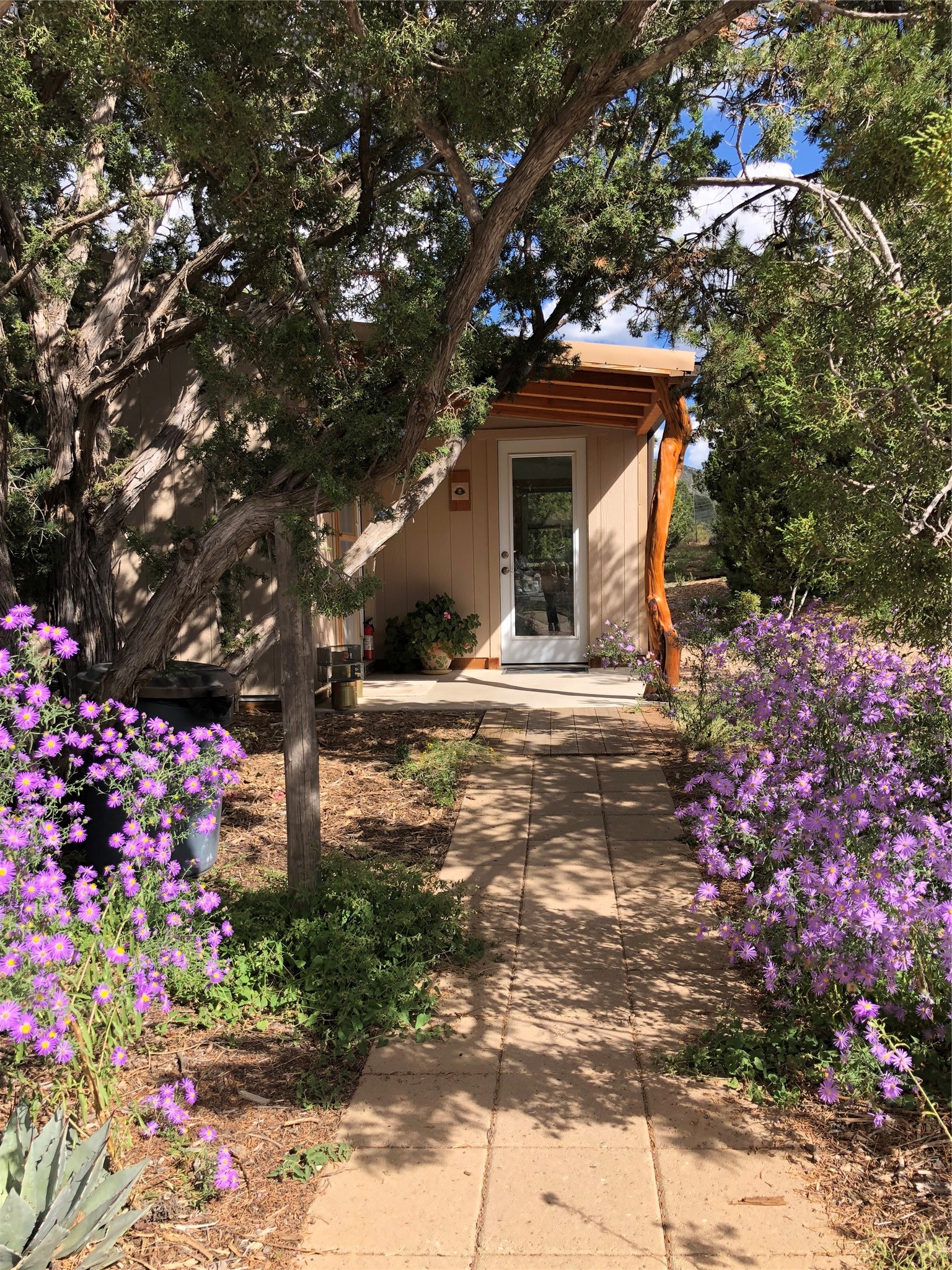 Welcome to '' The Ravens Nest '', this special oasis is nestled among old growth pinon and juniper trees. This 2 bedroom 1 bath home sits on 3+ acres with water-wise landscaping and fertile developed garden beds on a drip system. The attached greenhouse is great for getting plants started and provides passive solar gain to the main house. This property is a very private and peaceful haven yet it's only 12 minutes to the plaza, 6 minutes to the hospital, 3 minutes to I-25 and supermarkets. There is over 1700 square feet of heated space including the main house, the studios and the guest cabin. This property allows for self-sufficient living, featuring a large solar array that powers the house and out buildings, a high producing private well [25 gpm] and over 3000 sq. ft. of gardens under cultivation for organic vegetables, berries, fruit trees and grape arbors all on a well developed drip irrigation system. In addition to the solar powered electric heating system there is a cozy wood stove to support you during the colder winter months. There is a completely new pitched propanel roof and updated windows and doors installed in 2016, a complete kitchen remodel just 5 years ago, a new septic system installed in 2016, new water heater in 2017 and a new washer in 2026. Did I mention the Chicken coop with the hens, a great hot tub and a root cellar all convey. Needless to mention that the guest cabin with basic bath and the studios are all rentable buildings which could provide supplemental income. The property is bordered by an arroyo which separates it from over 50 acres of private land and a ten minute walk brings you to hiking and biking trails at the Arroyo Hondo Open Space Preserve. This is a rare find for country living so close to town ... Please schedule a visit asap, this property won't last long on the market.