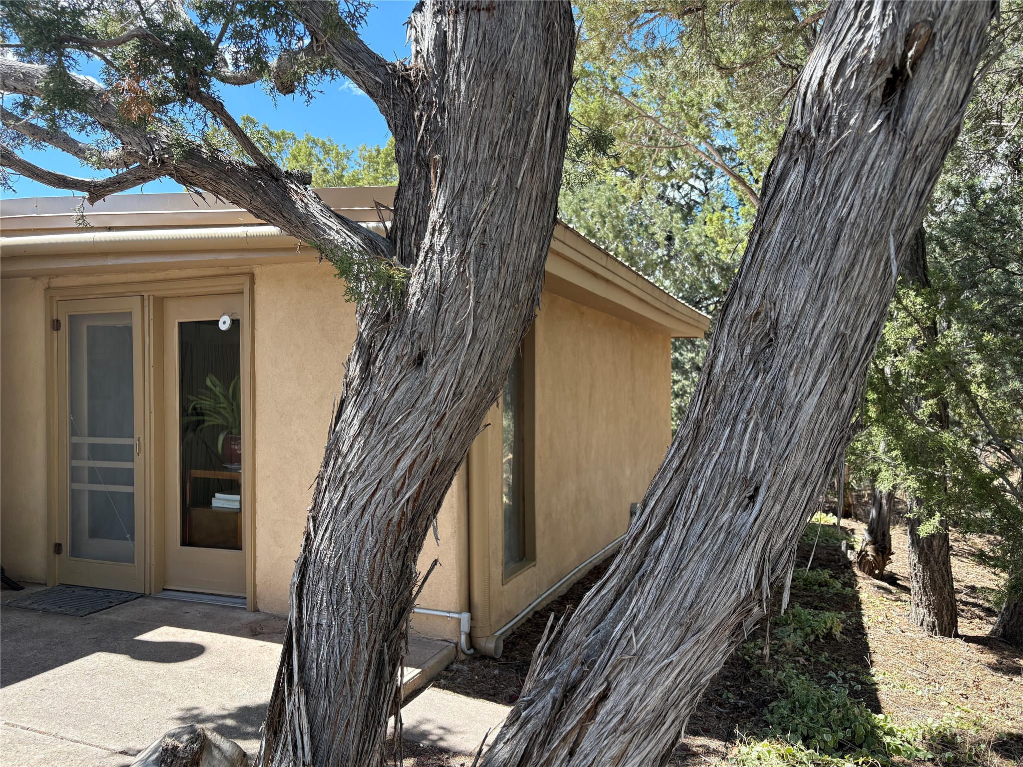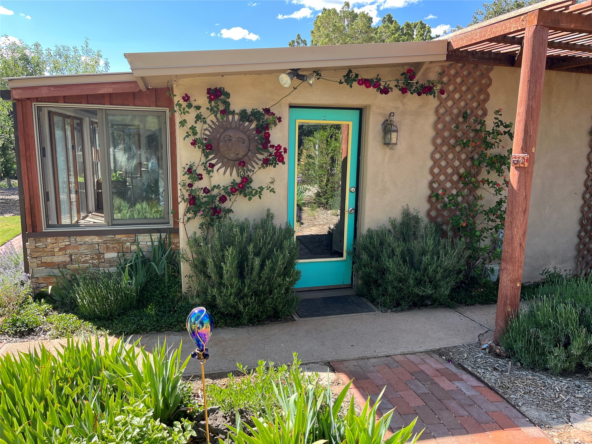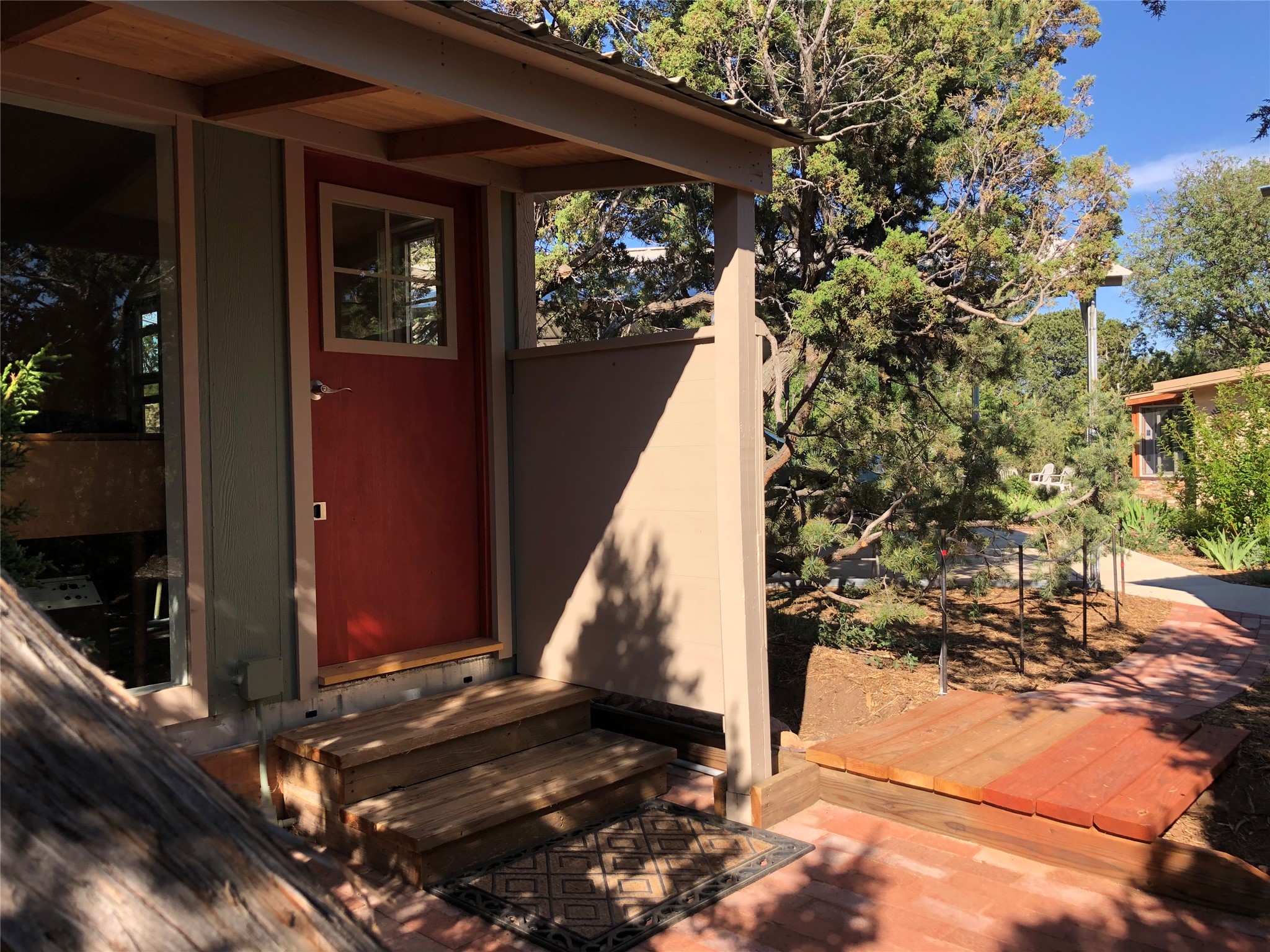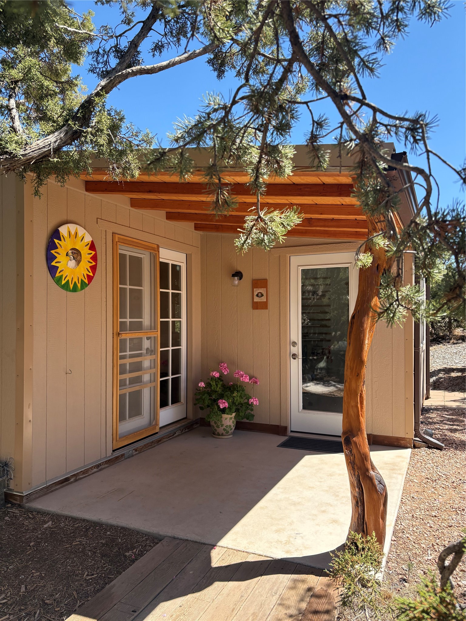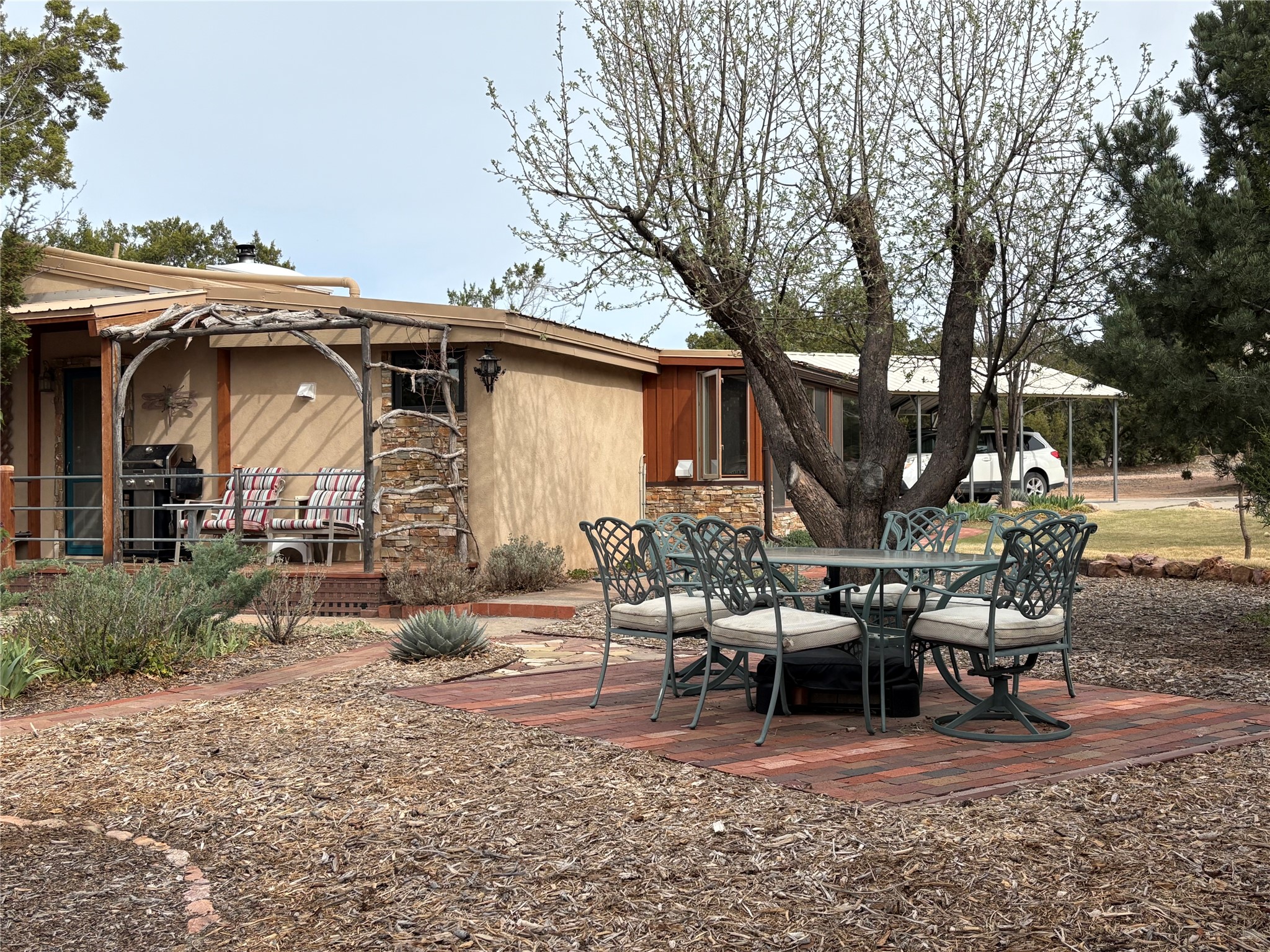 Welcome to '' The Ravens Nest '', this special oasis is nestled among old growth pinon and juniper trees. This 2 bedroom 1 bath home sits on 3+ acres with water-wise landscaping and fertile developed garden beds on a drip system. The attached greenhouse is great for getting plants started and provides passive solar gain to the main house. This property is a very private and peaceful haven yet it's only 12 minutes to the plaza, 6 minutes to the hospital, 3 minutes to I-25 and supermarkets. There is over 1700 square feet of heated space including the main house, the studios and the guest cabin. This property allows for self-sufficient living, featuring a large solar array that powers the house and out buildings, a high producing private well [25 gpm] and over 3000 sq. ft. of gardens under cultivation for organic vegetables, berries, fruit trees and grape arbors all on a well developed drip irrigation system. In addition to the solar powered electric heating system there is a cozy wood stove to support you during the colder winter months. There is a completely new pitched propanel roof and updated windows and doors installed in 2016, a complete kitchen remodel just 5 years ago, a new septic system installed in 2016, new water heater in 2017 and a new washer in 2026. Did I mention the Chicken coop with the hens, a great hot tub and a root cellar all convey. Needless to mention that the guest cabin with basic bath and the studios are all rentable buildings which could provide supplemental income. The property is bordered by an arroyo which separates it from over 50 acres of private land and a ten minute walk brings you to hiking and biking trails at the Arroyo Hondo Open Space Preserve. This is a rare find for country living so close to town ... Please schedule a visit asap, this property won't last long on the market.