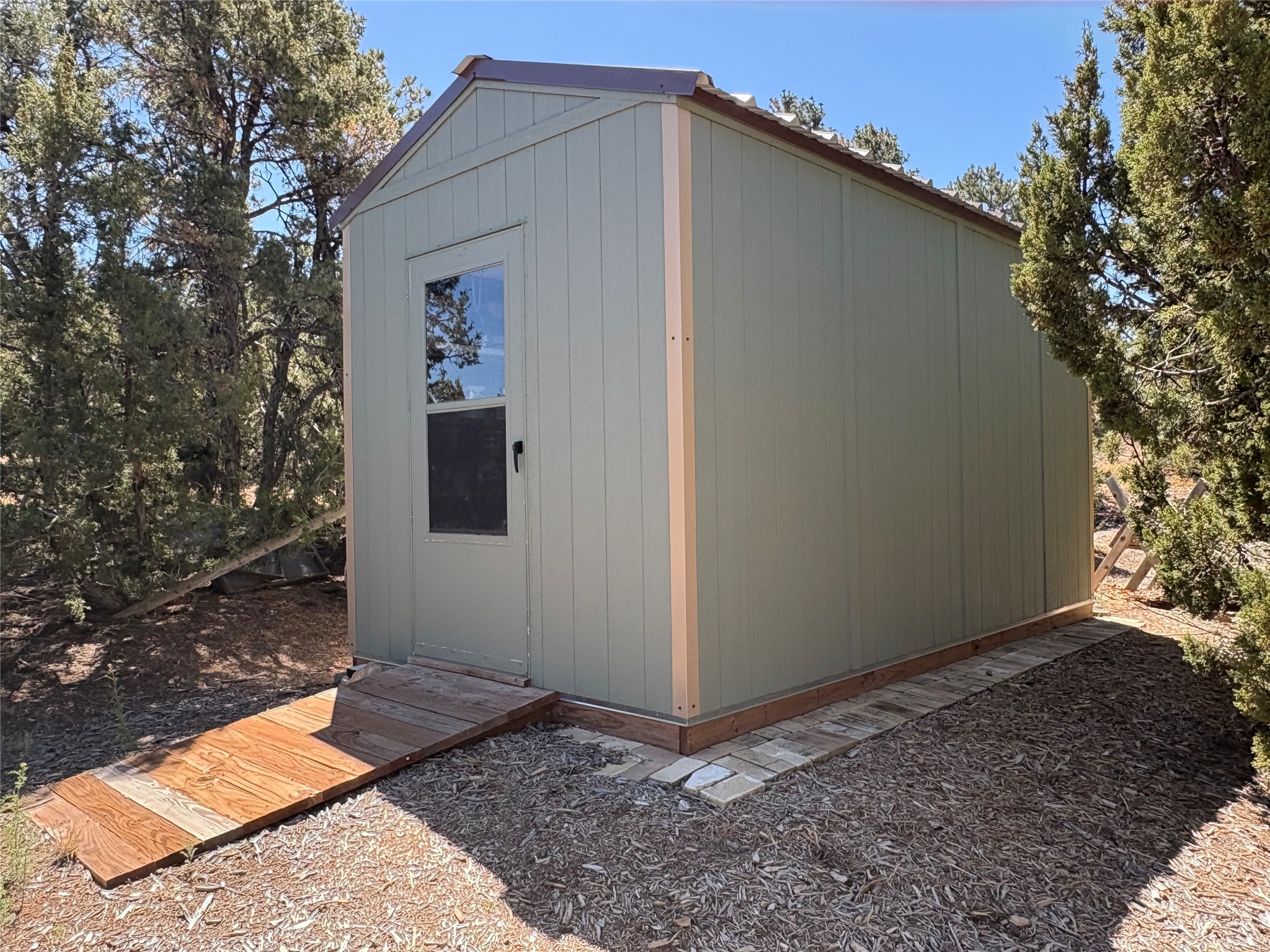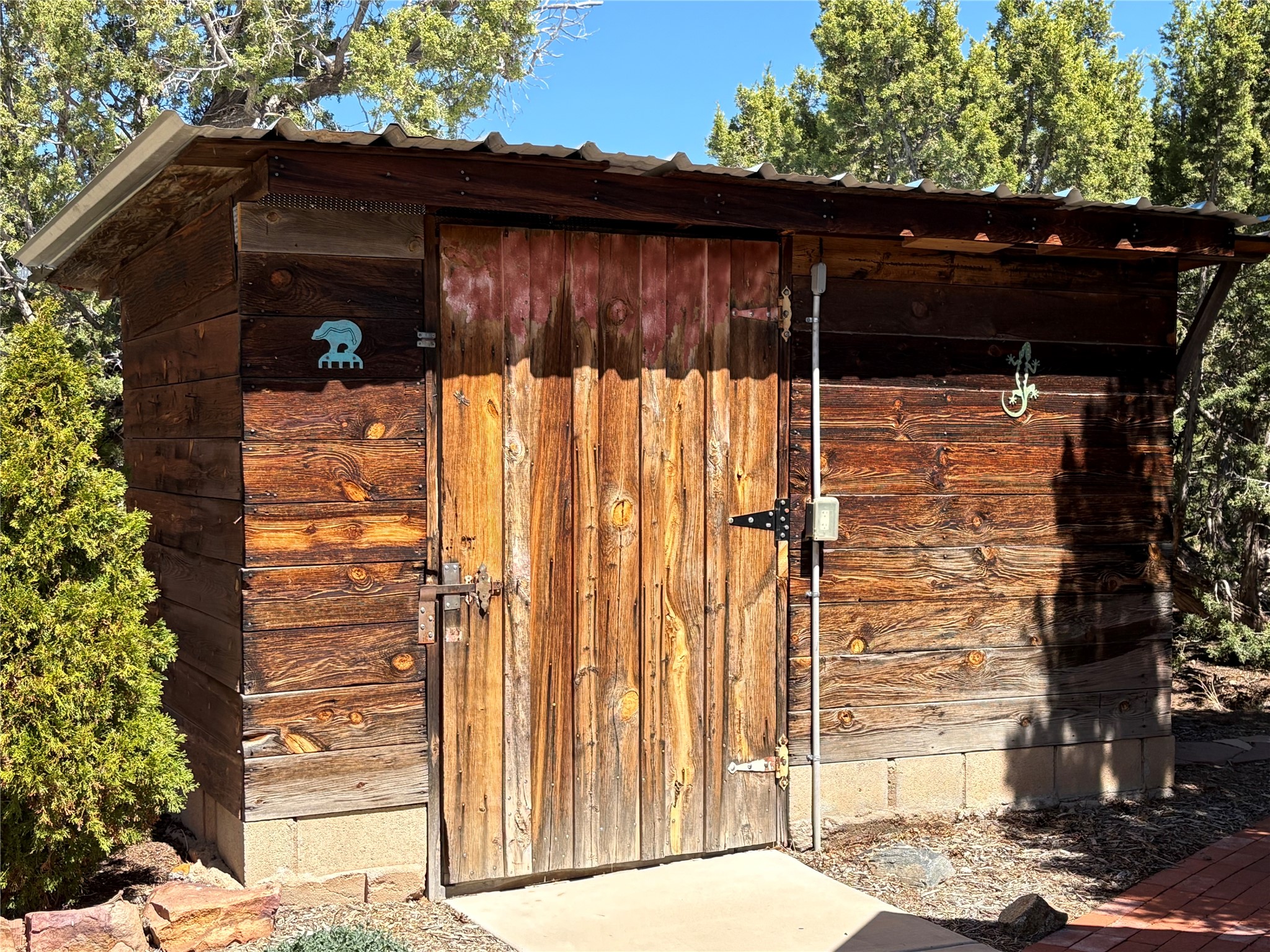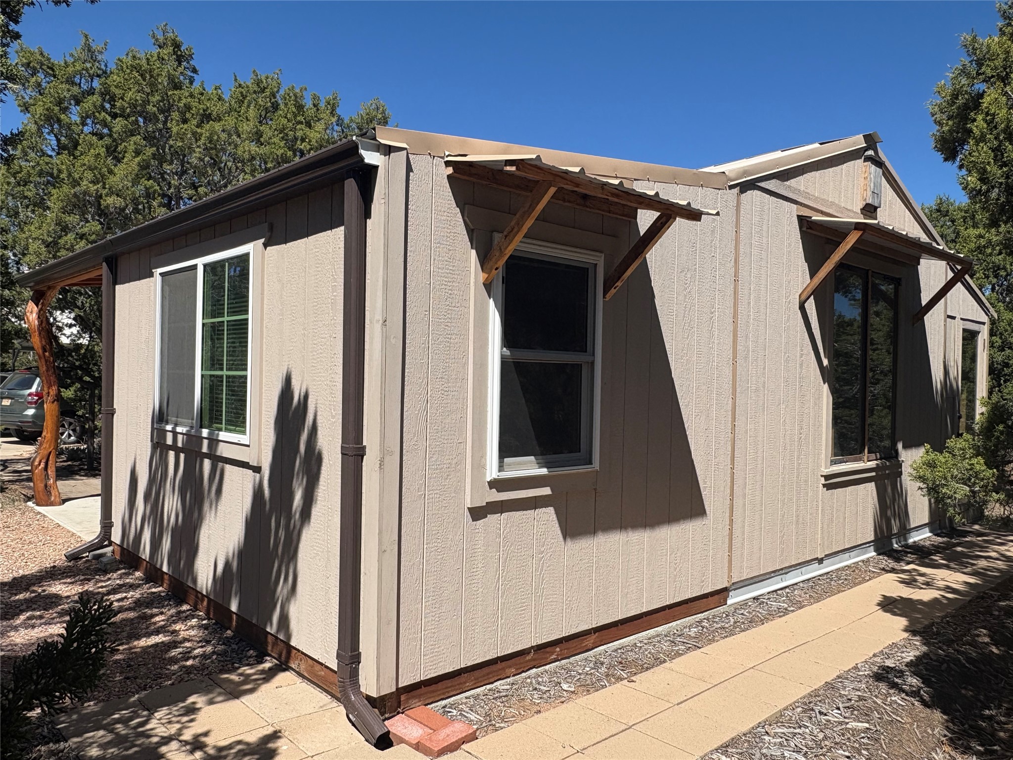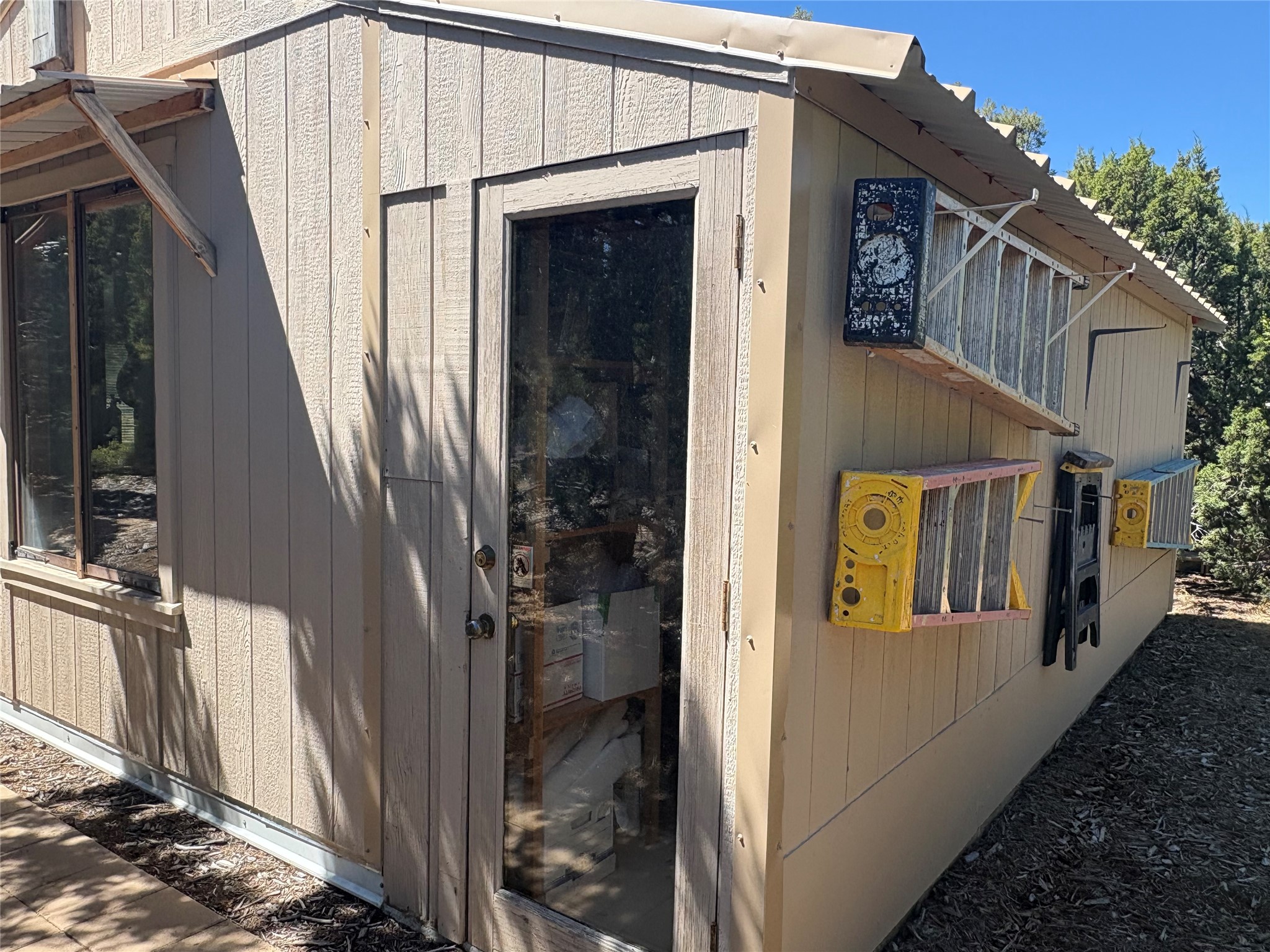 Welcome to '' The Ravens Nest '', this special oasis is nestled among old growth pinon and juniper trees. This 2 bedroom 1 bath home sits on 3+ acres with water-wise landscaping and fertile developed garden beds on a drip system. The attached greenhouse is great for getting plants started and provides passive solar gain to the main house. This property is a very private and peaceful haven yet it's only 12 minutes to the plaza, 6 minutes to the hospital, 3 minutes to I-25 and supermarkets. There is over 1700 square feet of heated space including the main house, the studios and the guest cabin. This property allows for self-sufficient living, featuring a large solar array that powers the house and out buildings, a high producing private well [25 gpm] and over 3000 sq. ft. of gardens under cultivation for organic vegetables, berries, fruit trees and grape arbors all on a well developed drip irrigation system. In addition to the solar powered electric heating system there is a cozy wood stove to support you during the colder winter months. There is a completely new pitched propanel roof and updated windows and doors installed in 2016, a complete kitchen remodel just 5 years ago, a new septic system installed in 2016, new water heater in 2017 and a new washer in 2026. Did I mention the Chicken coop with the hens, a great hot tub and a root cellar all convey. Needless to mention that the guest cabin with basic bath and the studios are all rentable buildings which could provide supplemental income. The property is bordered by an arroyo which separates it from over 50 acres of private land and a ten minute walk brings you to hiking and biking trails at the Arroyo Hondo Open Space Preserve. This is a rare find for country living so close to town ... Please schedule a visit asap, this property won't last long on the market.