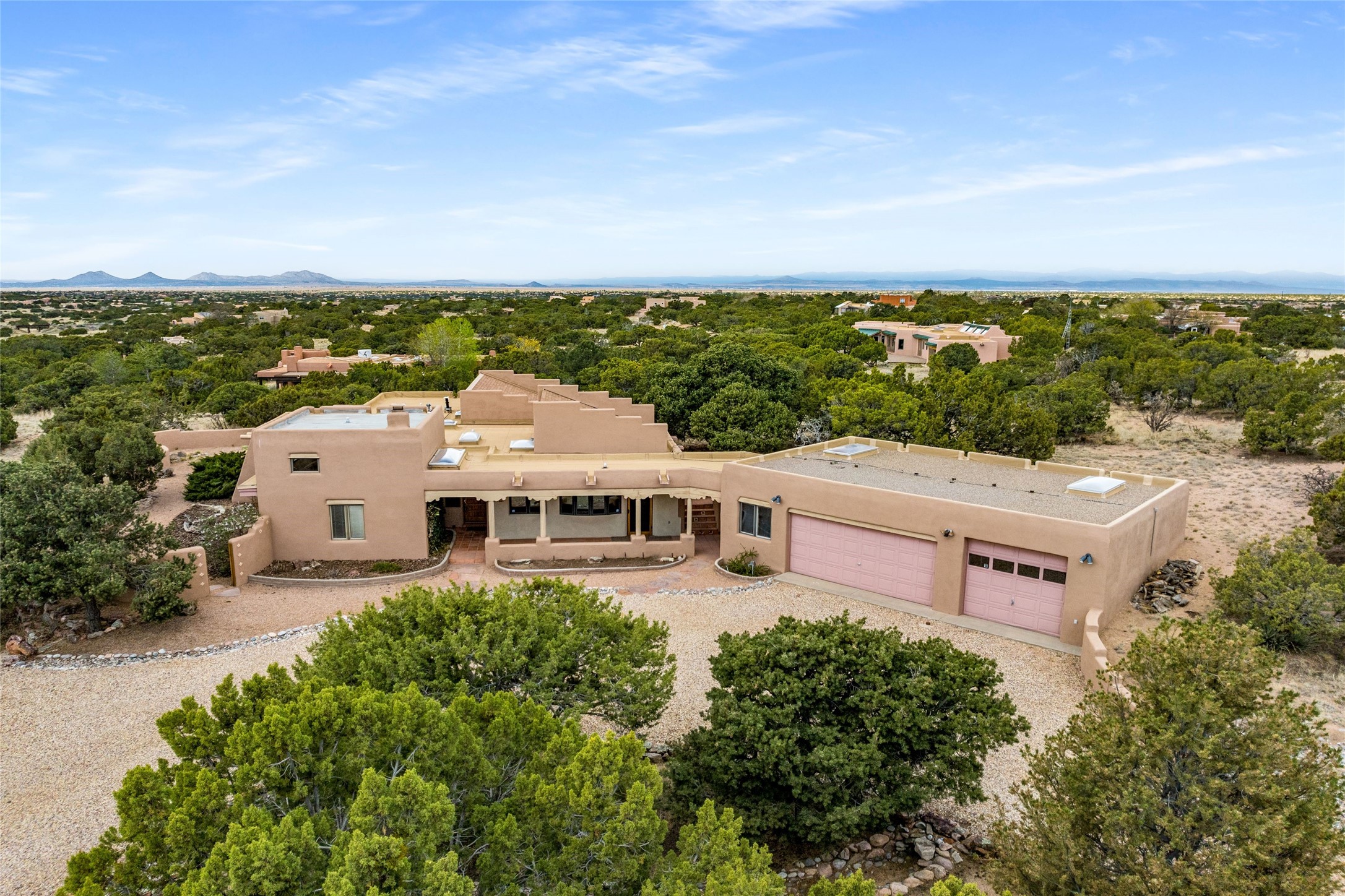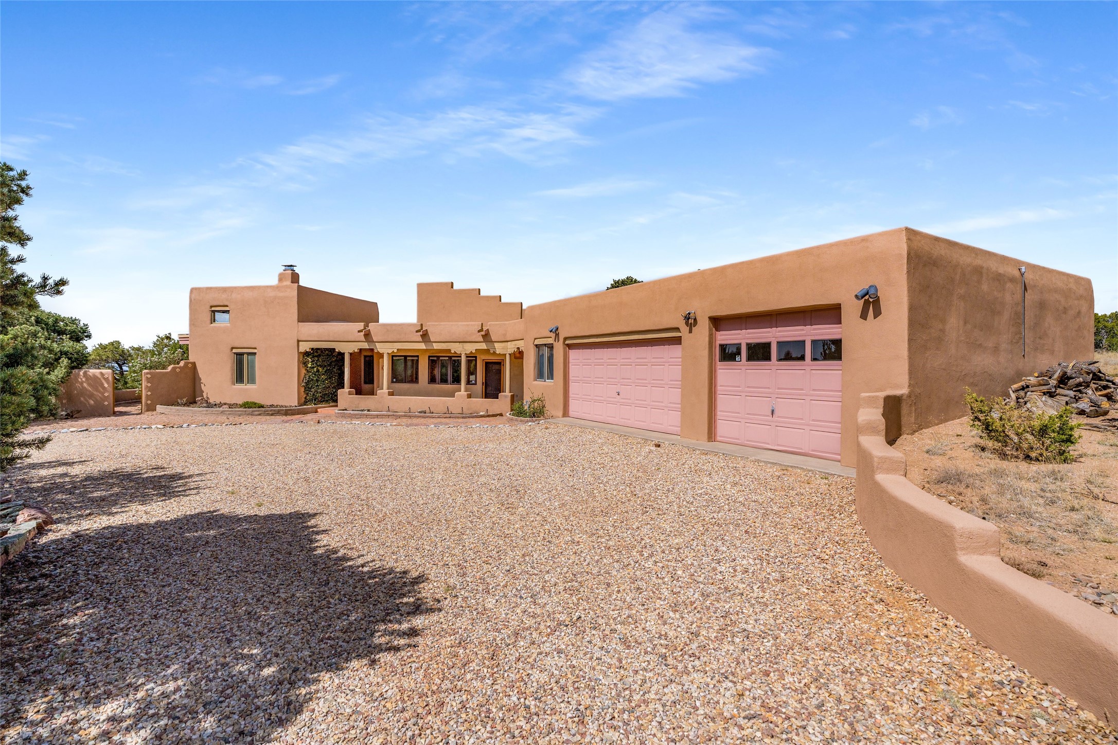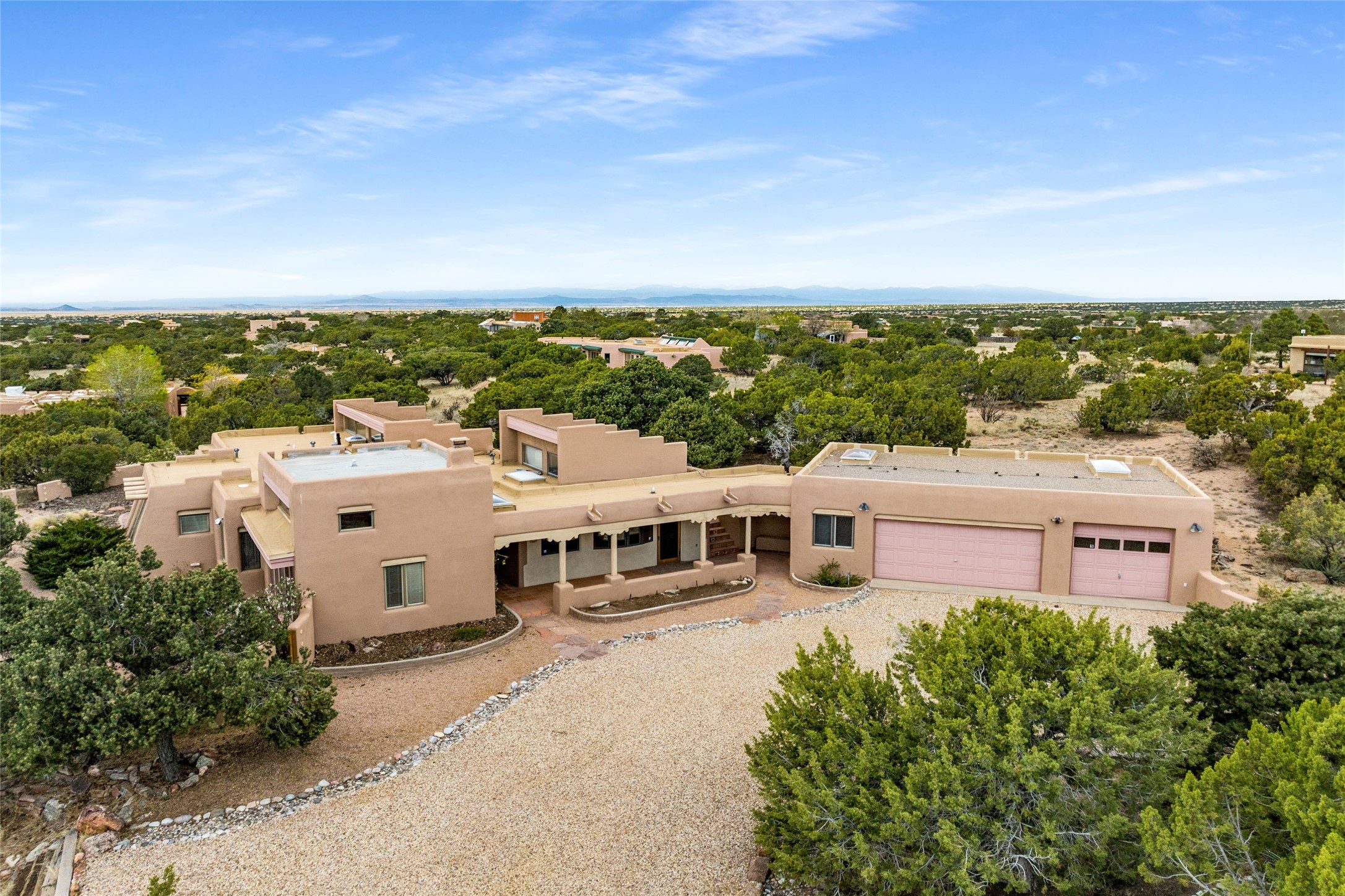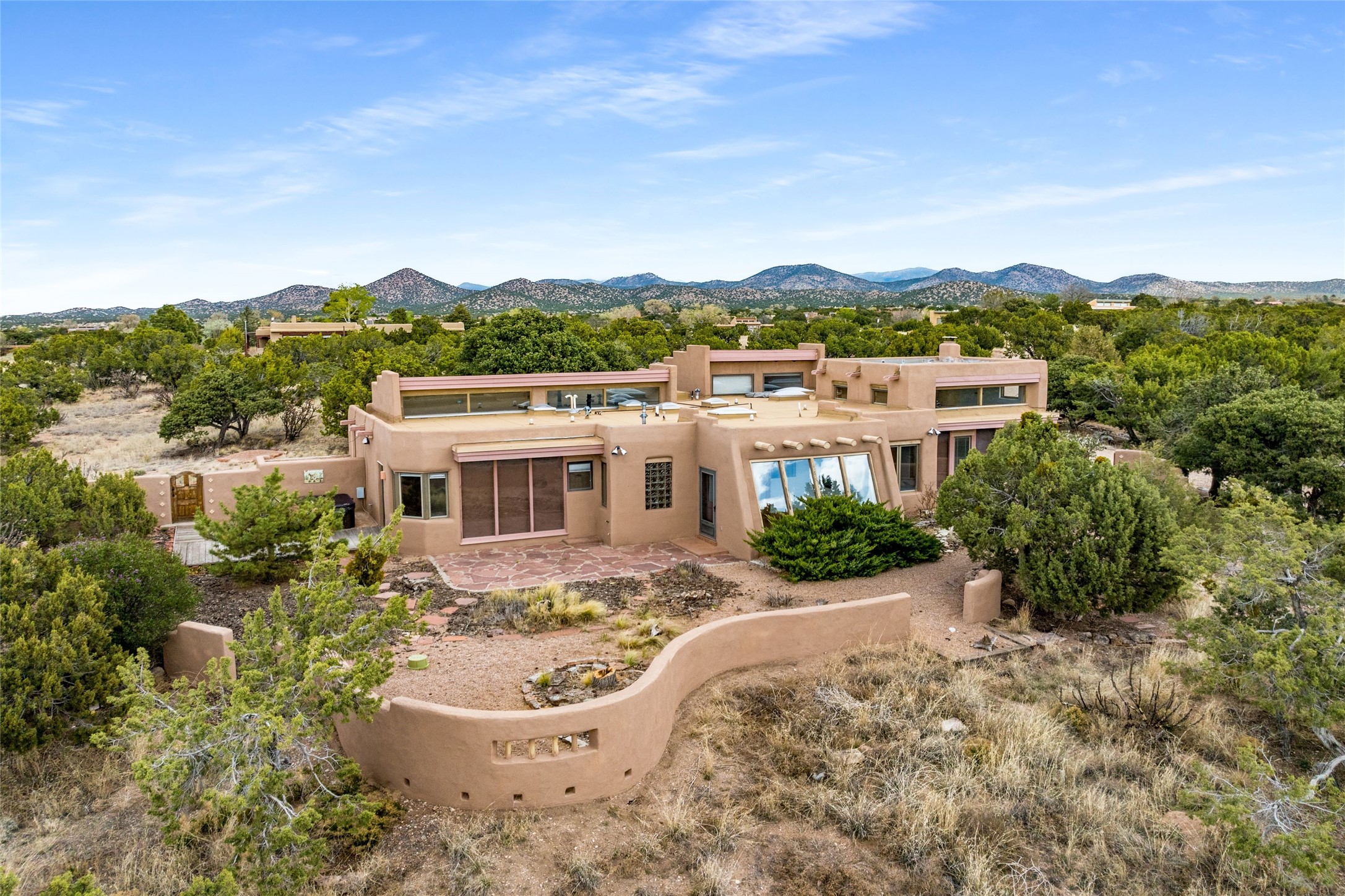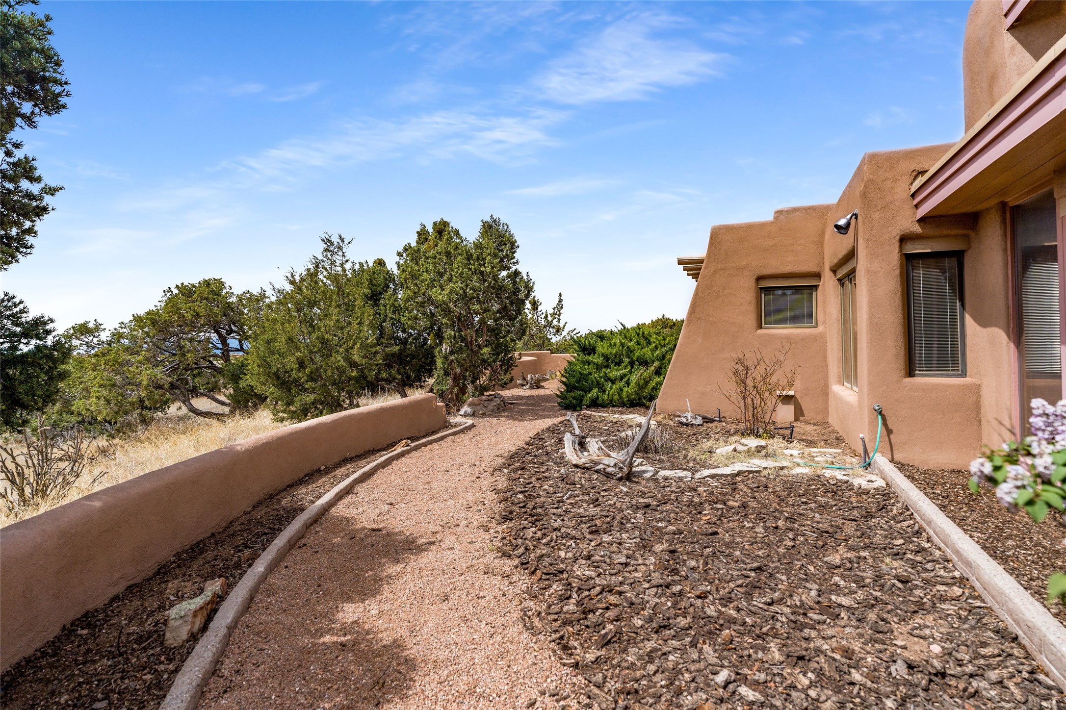 4 Montana Court is a distinctive Pueblo style residence, crafted in the mid 1980s by respected local builder John DiJanni as his personal home. Designed with passive solar Trombe Walls, and solar orientation, his charming home provides energy efficiency and the timeless warmth of classic Southwestern architecture. Set on more than two acres and bordering a greenbelt, the property enjoys remarkable privacy, separation from neighboring homes, and pleasing mountain views. A circular driveway creates an inviting and practical approach to the home. Inside, the formal living room centers around a traditional Kiva fireplace. A separate and generous office or media room--complete with vaulted ceilings, Vigas, clerestory windows, and its own exterior entrance--provides a flexible space ideal for work, creative pursuits, and a variety of uses. Adjoining the delightful and centrally placed kitchen, there is a dedicated Sunroom for growing herbs and plants throughout the year. The bedroom wing is finished with chipped edge travertine flooring, adding a refined touch. The generously sized primary suite includes a jacuzzi tub/shower, a single hardwood vanity, and a bidet. Two guest bedrooms feature vaulted Viga ceilings, clerestory windows, and abundant natural light, with a well placed full bath conveniently serving both rooms. A detached three car garage, connected to the home by a covered portal, offers excellent versatility; one bay has previously been used as an office or studio, and can easily be converted back to garage space if preferred.