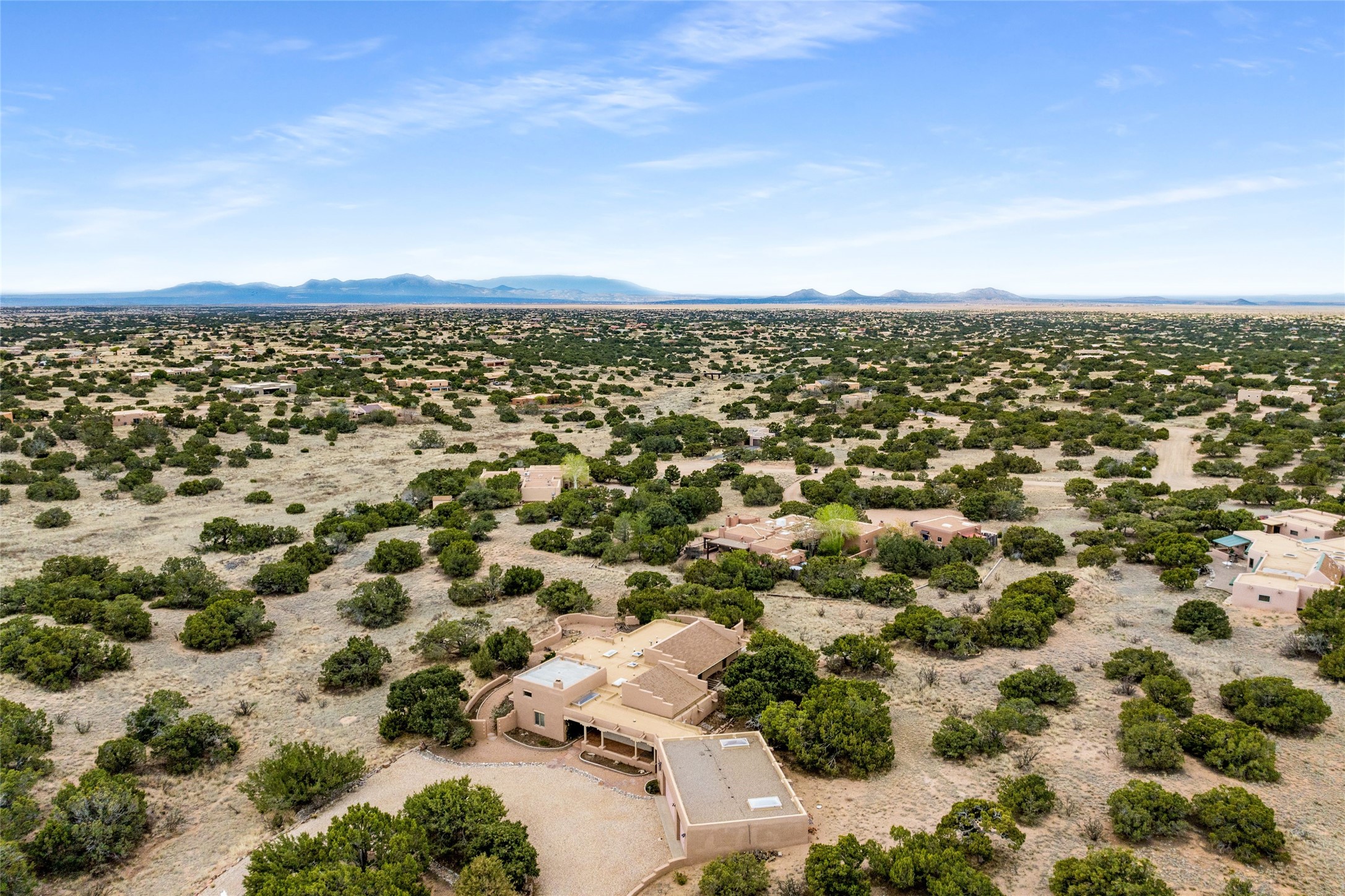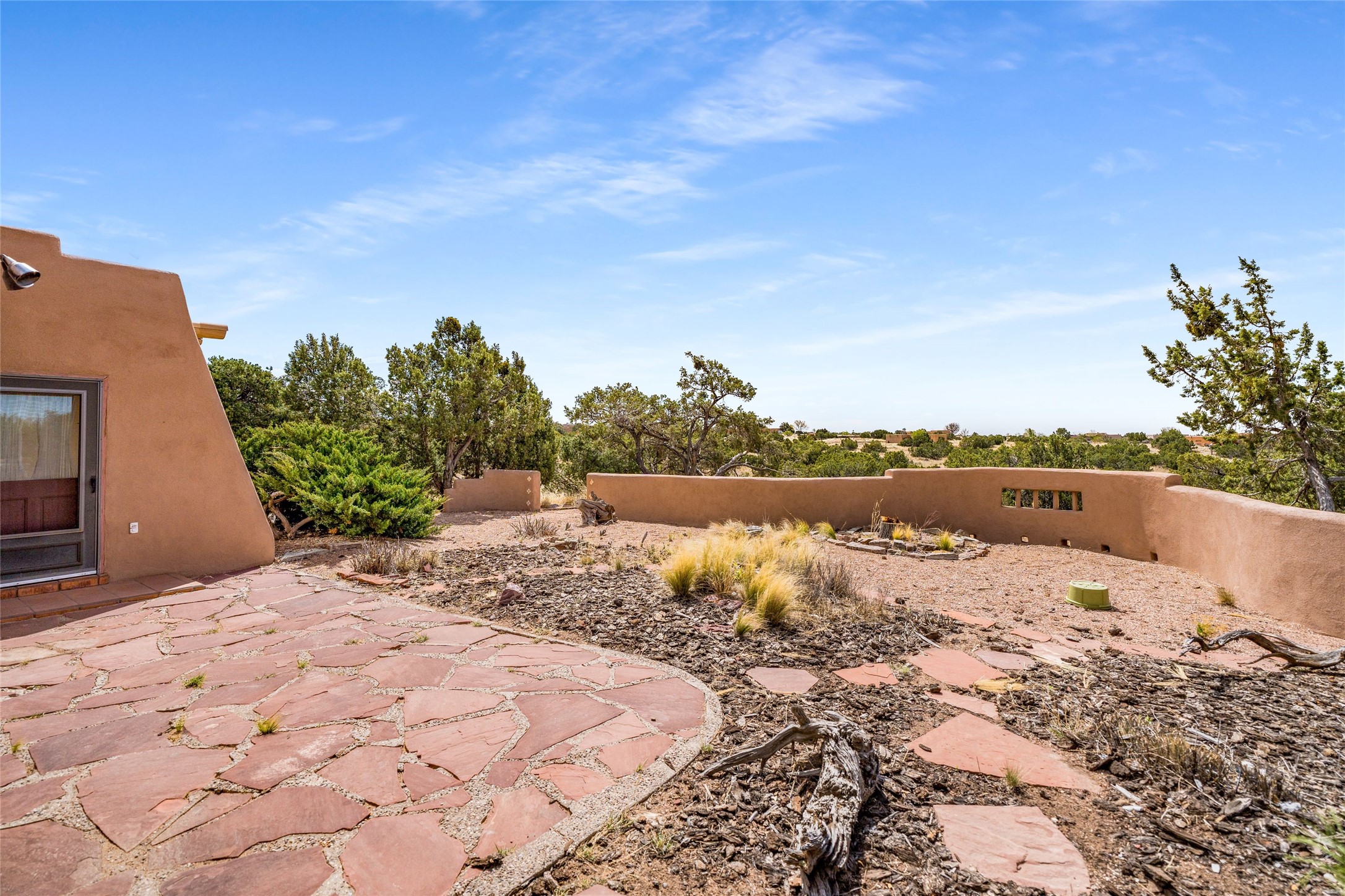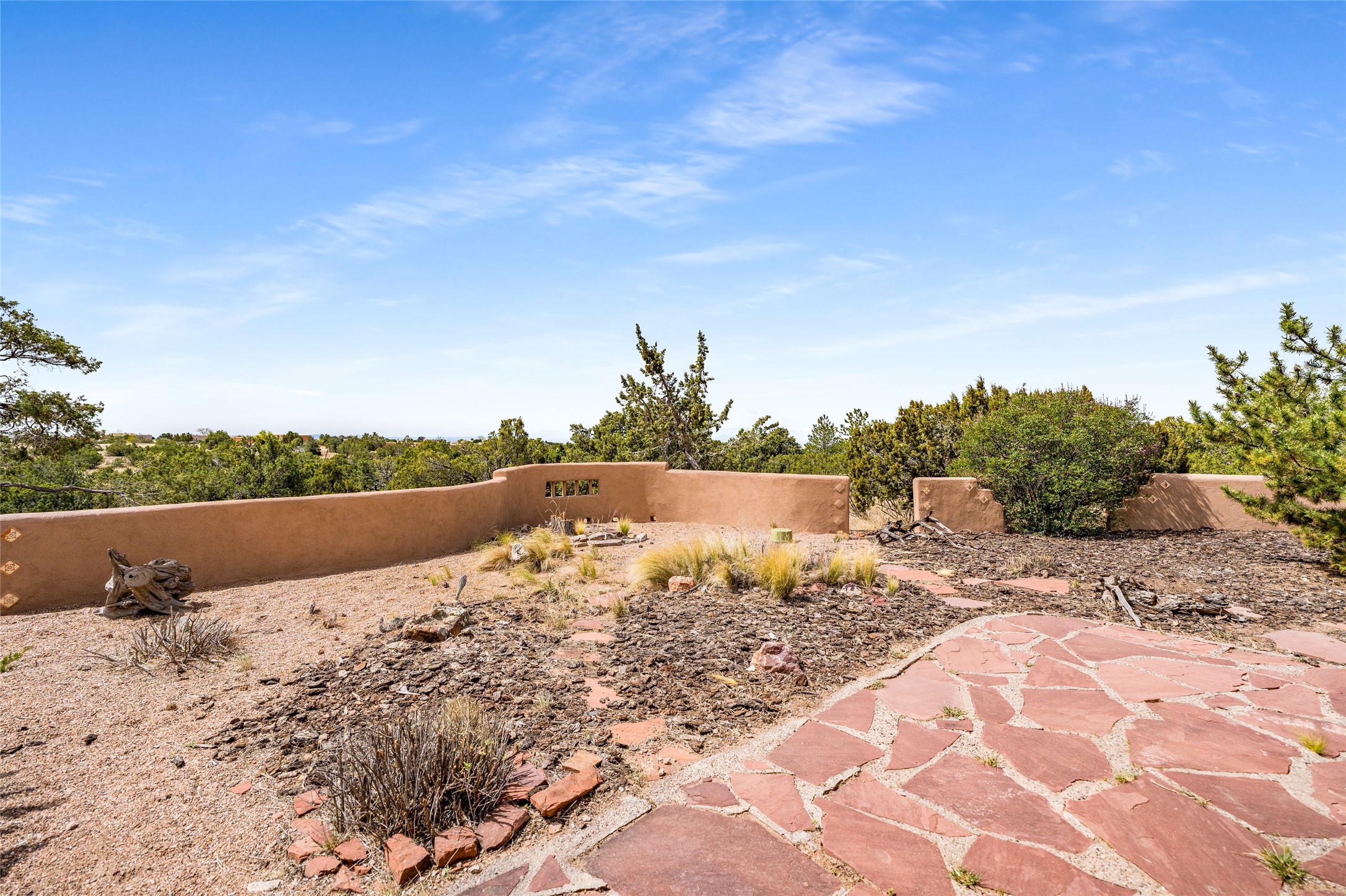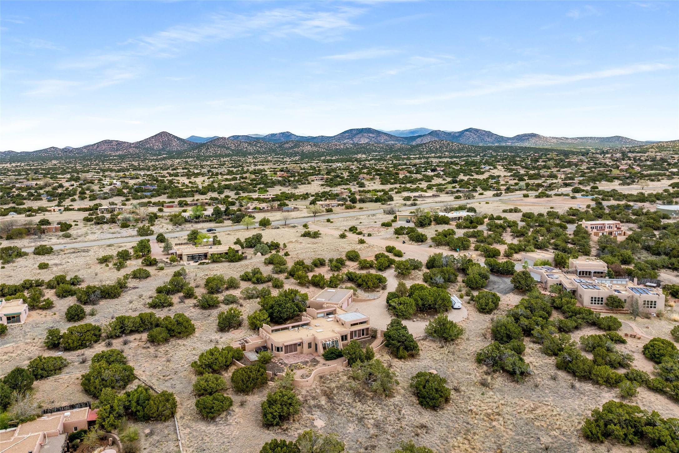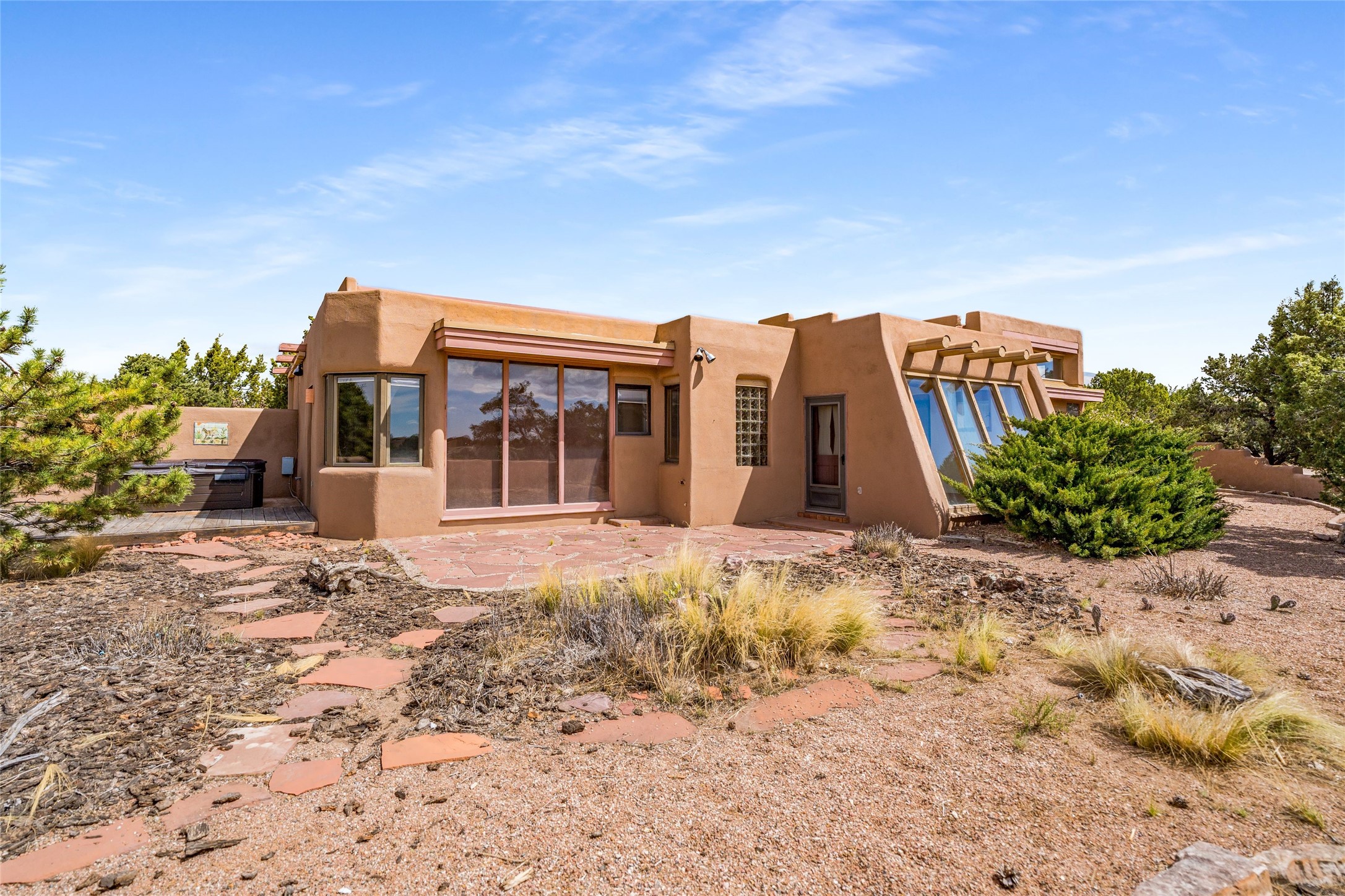 4 Montana Court is a distinctive Pueblo style residence, crafted in the mid 1980s by respected local builder John DiJanni as his personal home. Designed with passive solar Trombe Walls, and solar orientation, his charming home provides energy efficiency and the timeless warmth of classic Southwestern architecture. Set on more than two acres and bordering a greenbelt, the property enjoys remarkable privacy, separation from neighboring homes, and pleasing mountain views. A circular driveway creates an inviting and practical approach to the home. Inside, the formal living room centers around a traditional Kiva fireplace. A separate and generous office or media room--complete with vaulted ceilings, Vigas, clerestory windows, and its own exterior entrance--provides a flexible space ideal for work, creative pursuits, and a variety of uses. Adjoining the delightful and centrally placed kitchen, there is a dedicated Sunroom for growing herbs and plants throughout the year. The bedroom wing is finished with chipped edge travertine flooring, adding a refined touch. The generously sized primary suite includes a jacuzzi tub/shower, a single hardwood vanity, and a bidet. Two guest bedrooms feature vaulted Viga ceilings, clerestory windows, and abundant natural light, with a well placed full bath conveniently serving both rooms. A detached three car garage, connected to the home by a covered portal, offers excellent versatility; one bay has previously been used as an office or studio, and can easily be converted back to garage space if preferred.