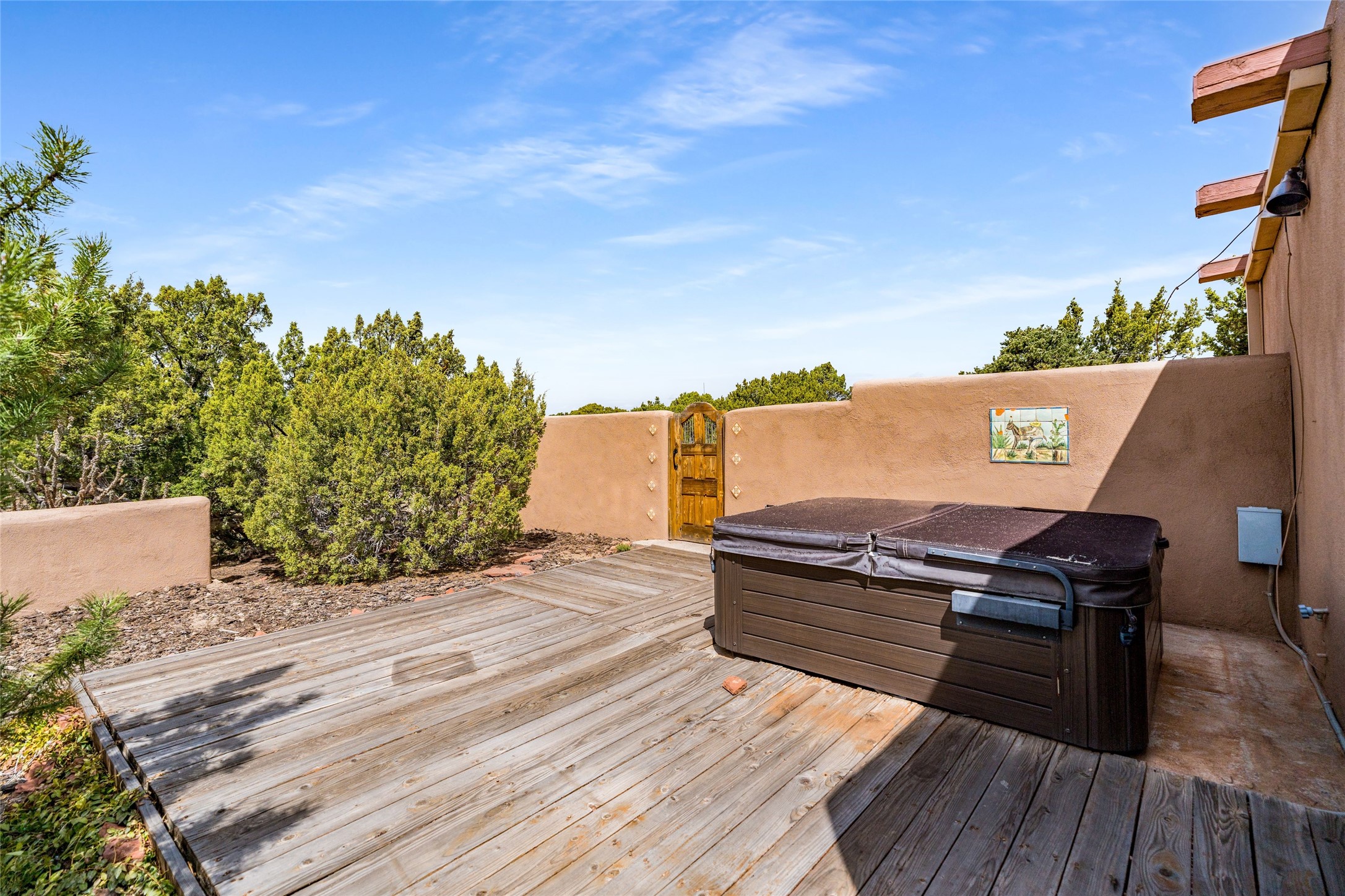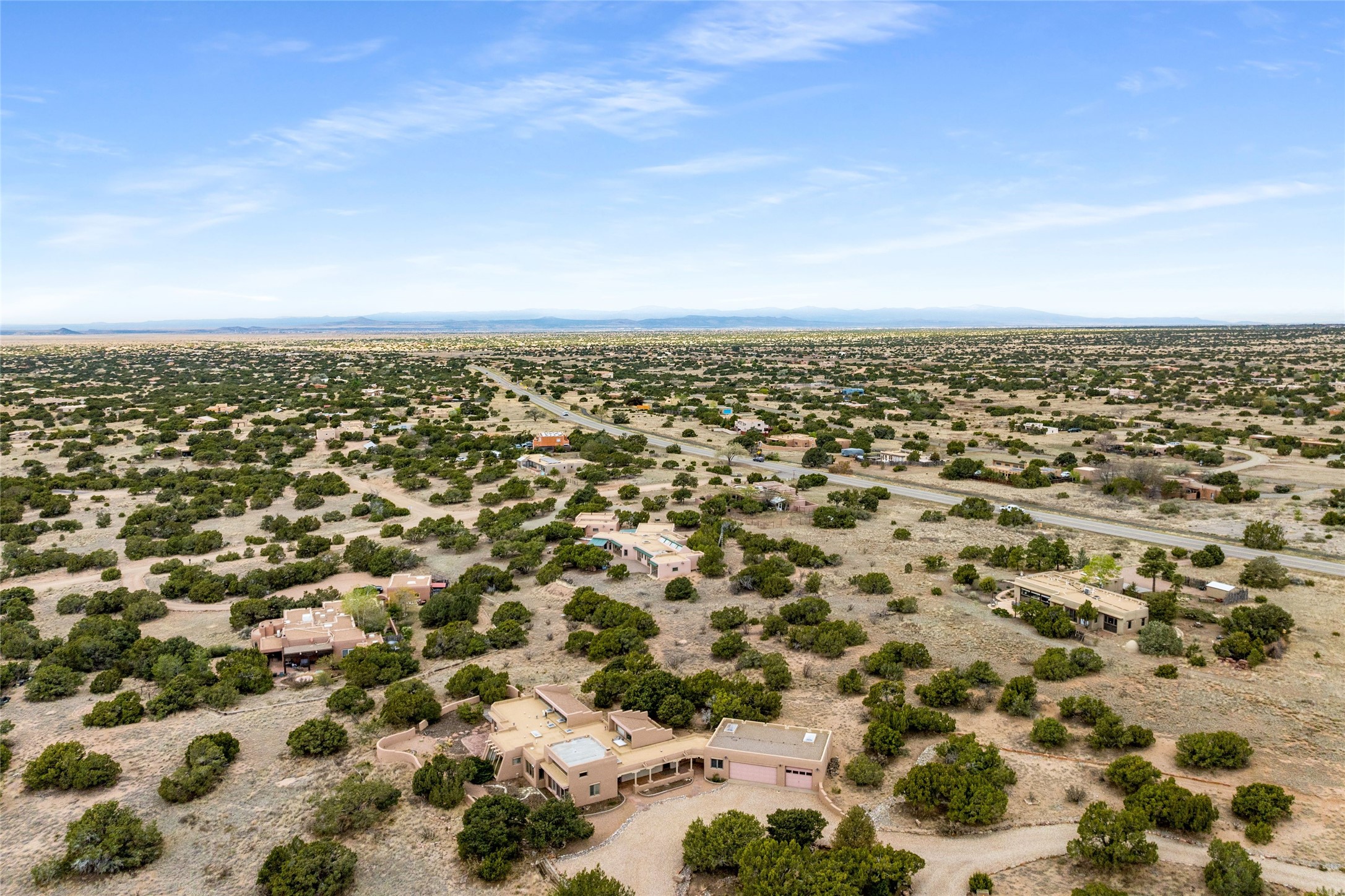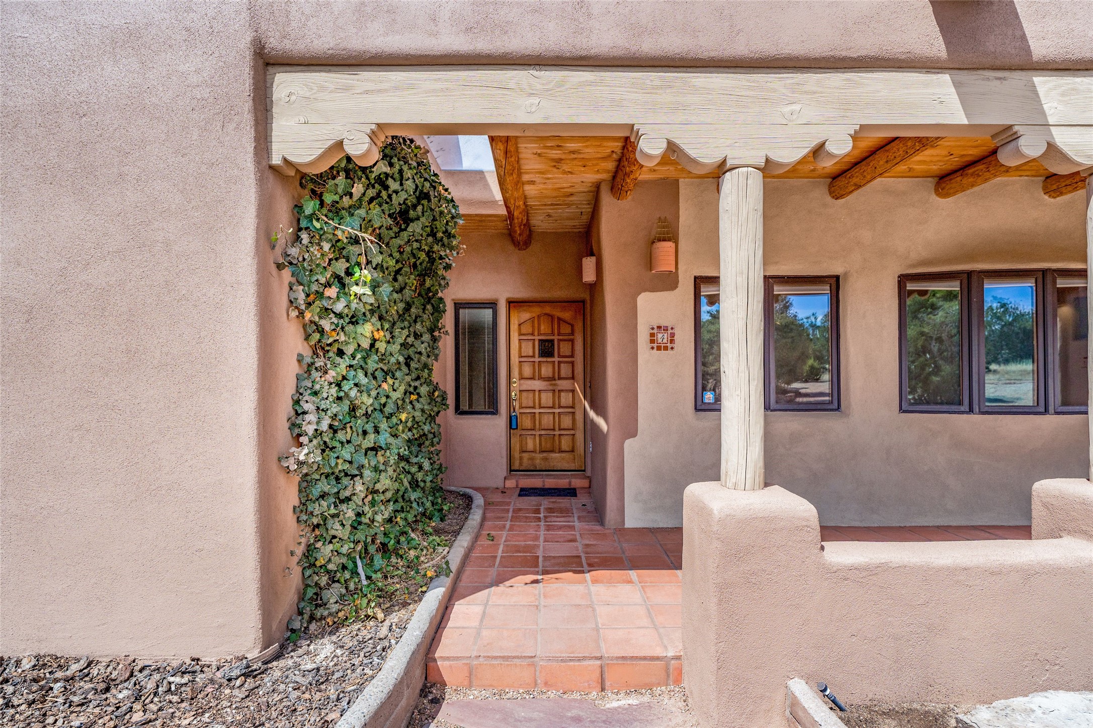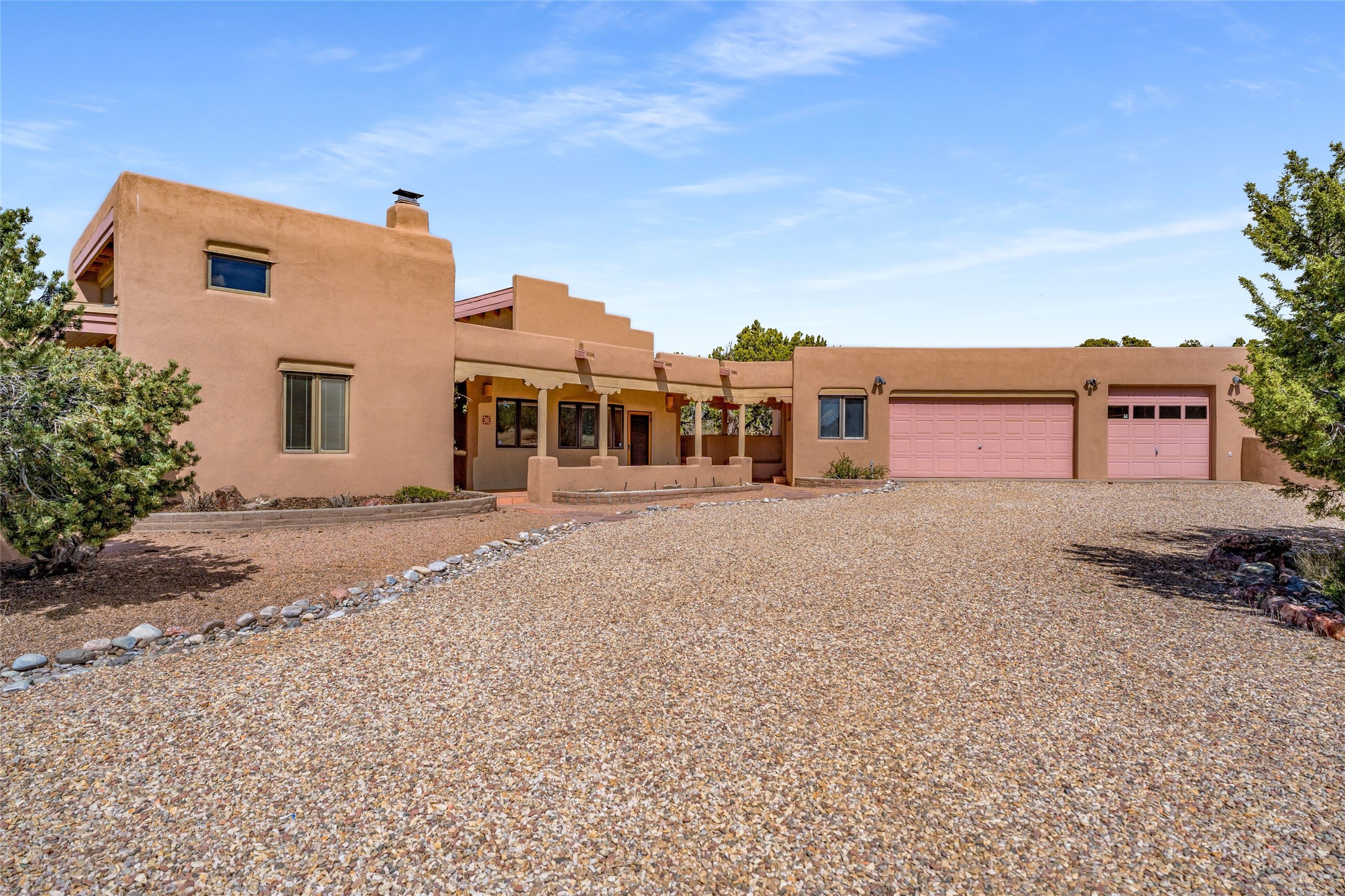 4 Montana Court is a distinctive Pueblo style residence, crafted in the mid 1980s by respected local builder John DiJanni as his personal home. Designed with passive solar Trombe Walls, and solar orientation, his charming home provides energy efficiency and the timeless warmth of classic Southwestern architecture. Set on more than two acres and bordering a greenbelt, the property enjoys remarkable privacy, separation from neighboring homes, and pleasing mountain views. A circular driveway creates an inviting and practical approach to the home. Inside, the formal living room centers around a traditional Kiva fireplace. A separate and generous office or media room--complete with vaulted ceilings, Vigas, clerestory windows, and its own exterior entrance--provides a flexible space ideal for work, creative pursuits, and a variety of uses. Adjoining the delightful and centrally placed kitchen, there is a dedicated Sunroom for growing herbs and plants throughout the year. The bedroom wing is finished with chipped edge travertine flooring, adding a refined touch. The generously sized primary suite includes a jacuzzi tub/shower, a single hardwood vanity, and a bidet. Two guest bedrooms feature vaulted Viga ceilings, clerestory windows, and abundant natural light, with a well placed full bath conveniently serving both rooms. A detached three car garage, connected to the home by a covered portal, offers excellent versatility; one bay has previously been used as an office or studio, and can easily be converted back to garage space if preferred.