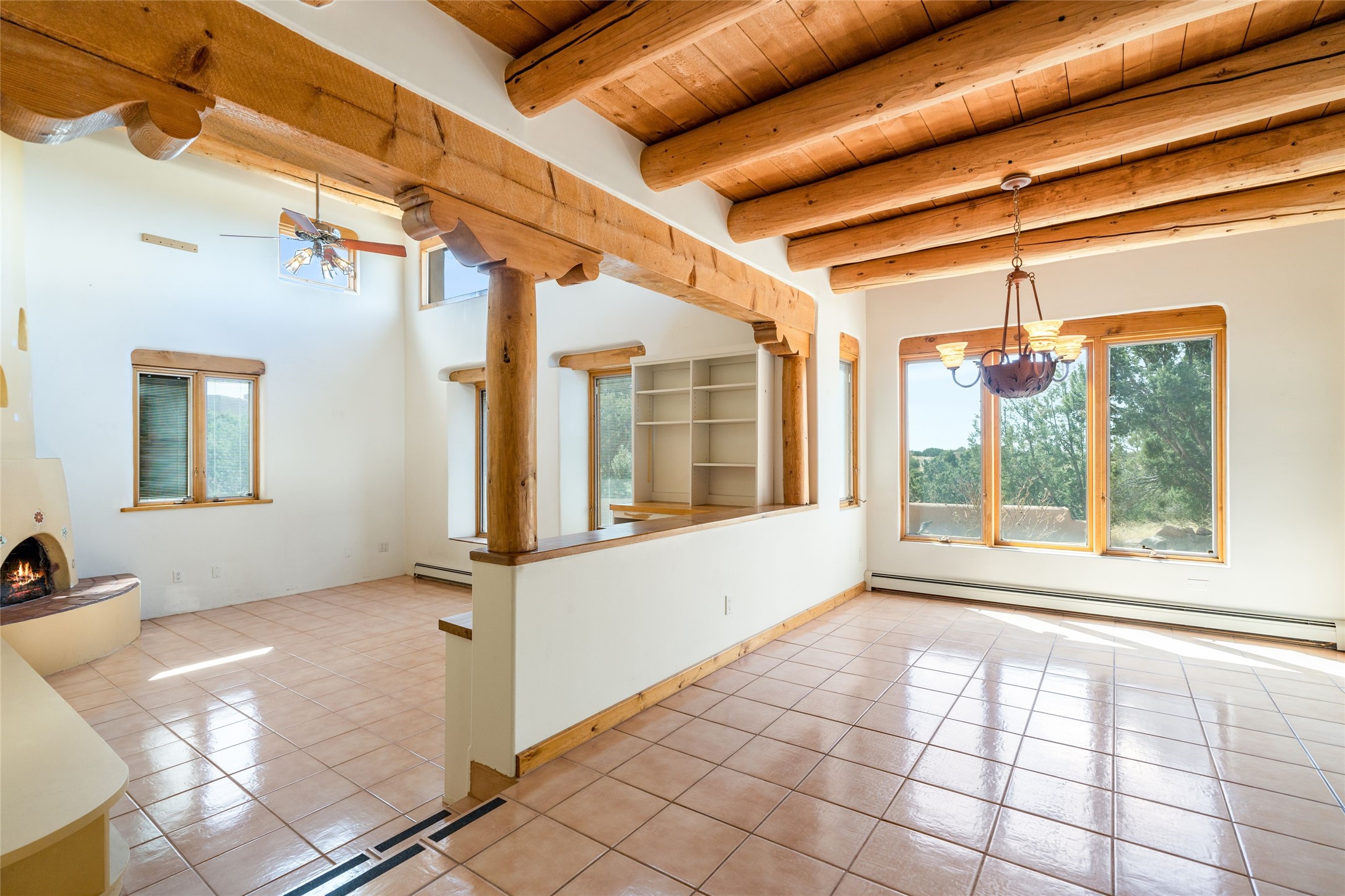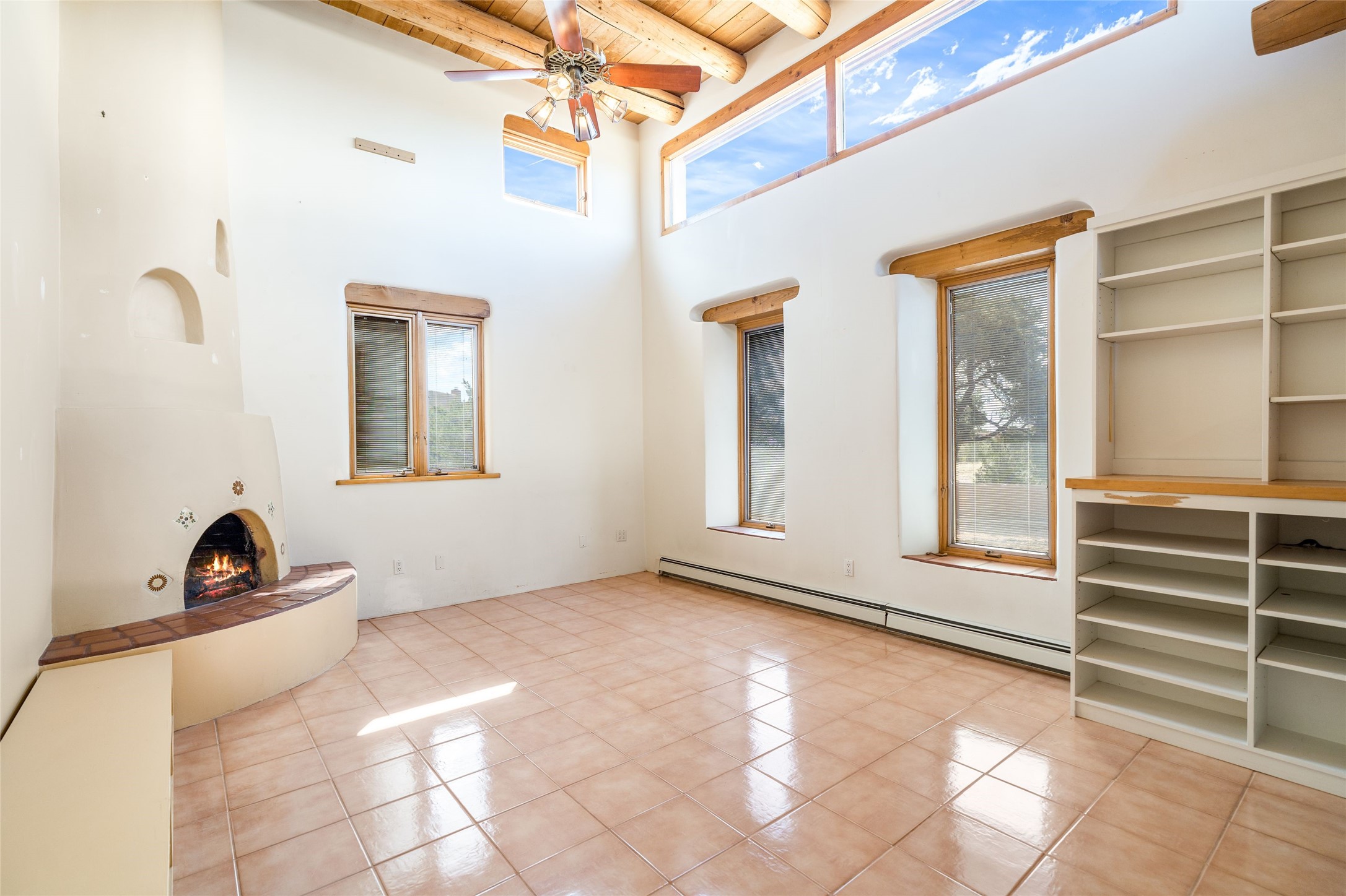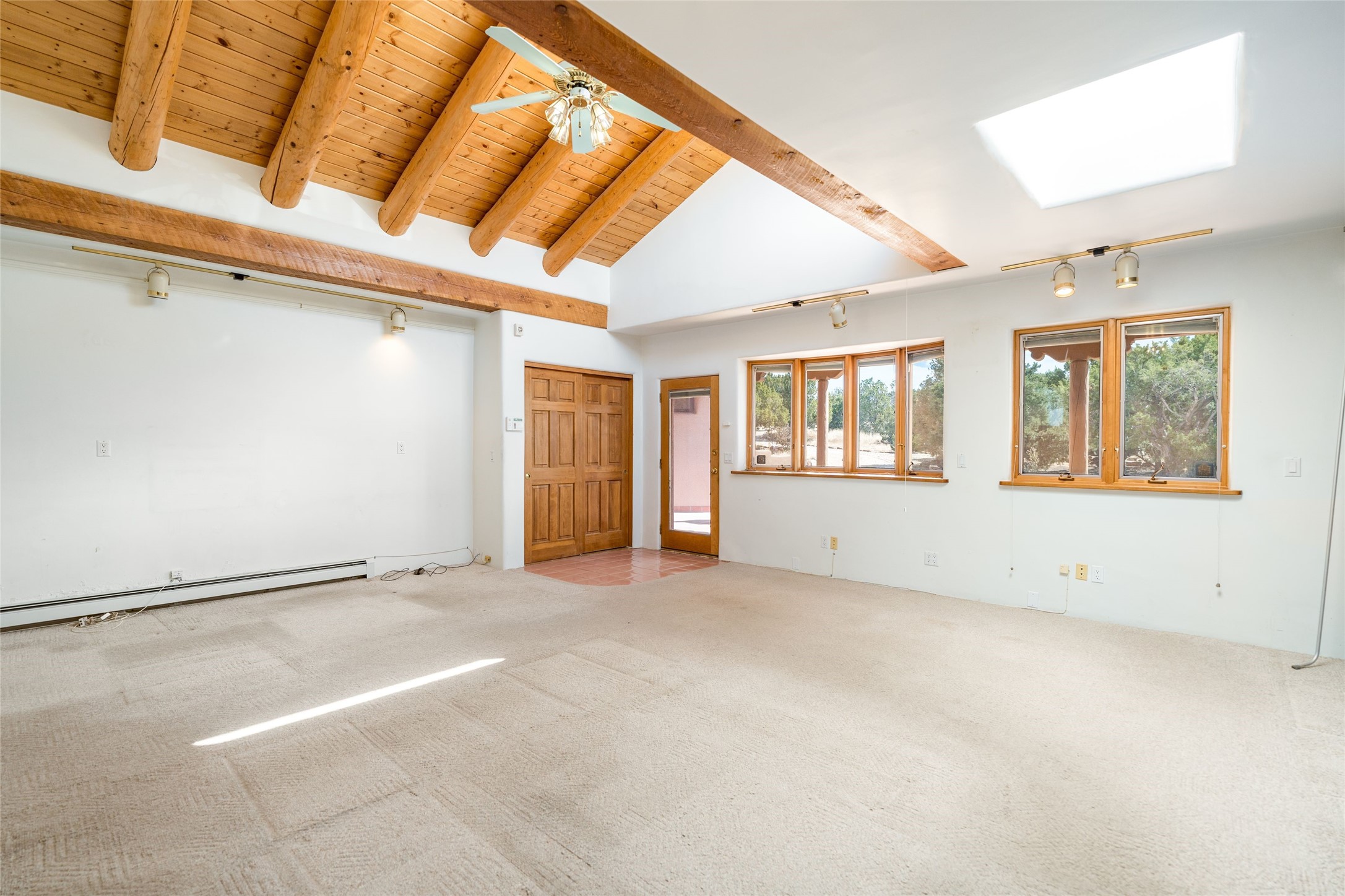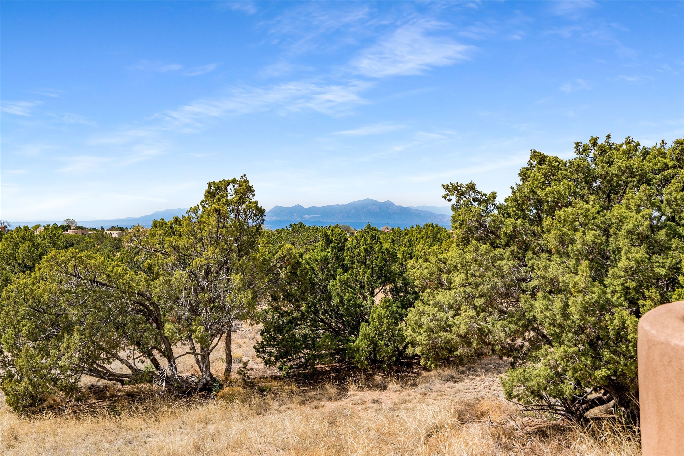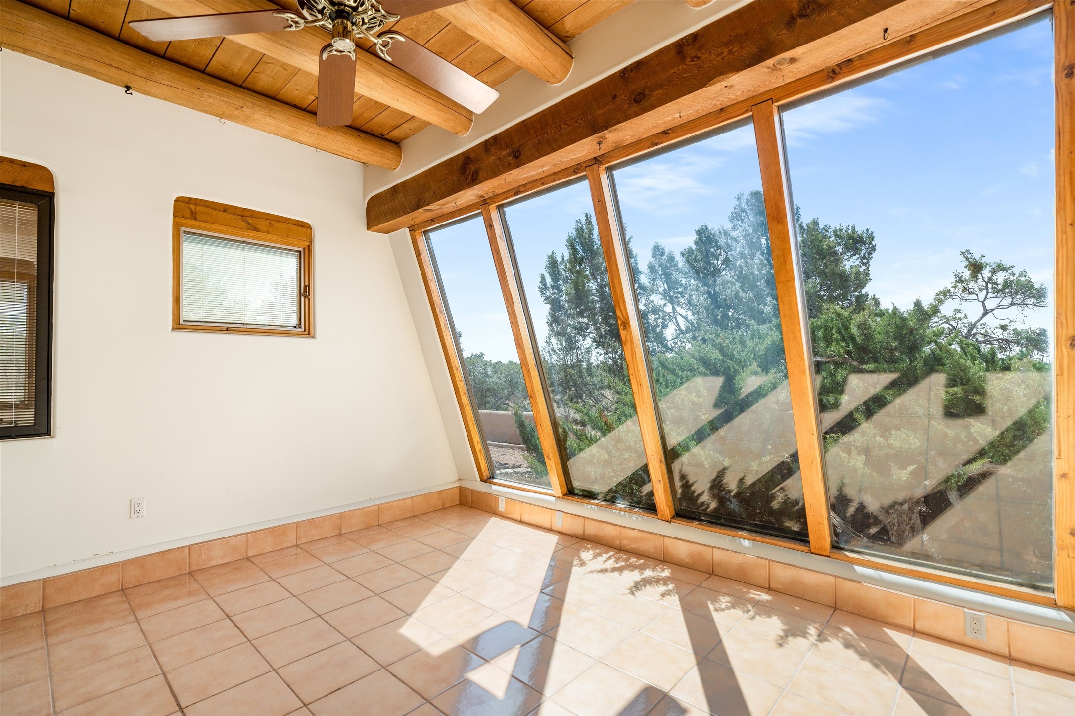4 Montana Court is a distinctive Pueblo style residence, crafted in the mid 1980s by respected local builder John DiJanni as his personal home. Designed with passive solar Trombe Walls, and solar orientation, his charming home provides energy efficiency and the timeless warmth of classic Southwestern architecture. Set on more than two acres and bordering a greenbelt, the property enjoys remarkable privacy, separation from neighboring homes, and pleasing mountain views. A circular driveway creates an inviting and practical approach to the home. Inside, the formal living room centers around a traditional Kiva fireplace. A separate and generous office or media room--complete with vaulted ceilings, Vigas, clerestory windows, and its own exterior entrance--provides a flexible space ideal for work, creative pursuits, and a variety of uses. Adjoining the delightful and centrally placed kitchen, there is a dedicated Sunroom for growing herbs and plants throughout the year. The bedroom wing is finished with chipped edge travertine flooring, adding a refined touch. The generously sized primary suite includes a jacuzzi tub/shower, a single hardwood vanity, and a bidet. Two guest bedrooms feature vaulted Viga ceilings, clerestory windows, and abundant natural light, with a well placed full bath conveniently serving both rooms. A detached three car garage, connected to the home by a covered portal, offers excellent versatility; one bay has previously been used as an office or studio, and can easily be converted back to garage space if preferred.