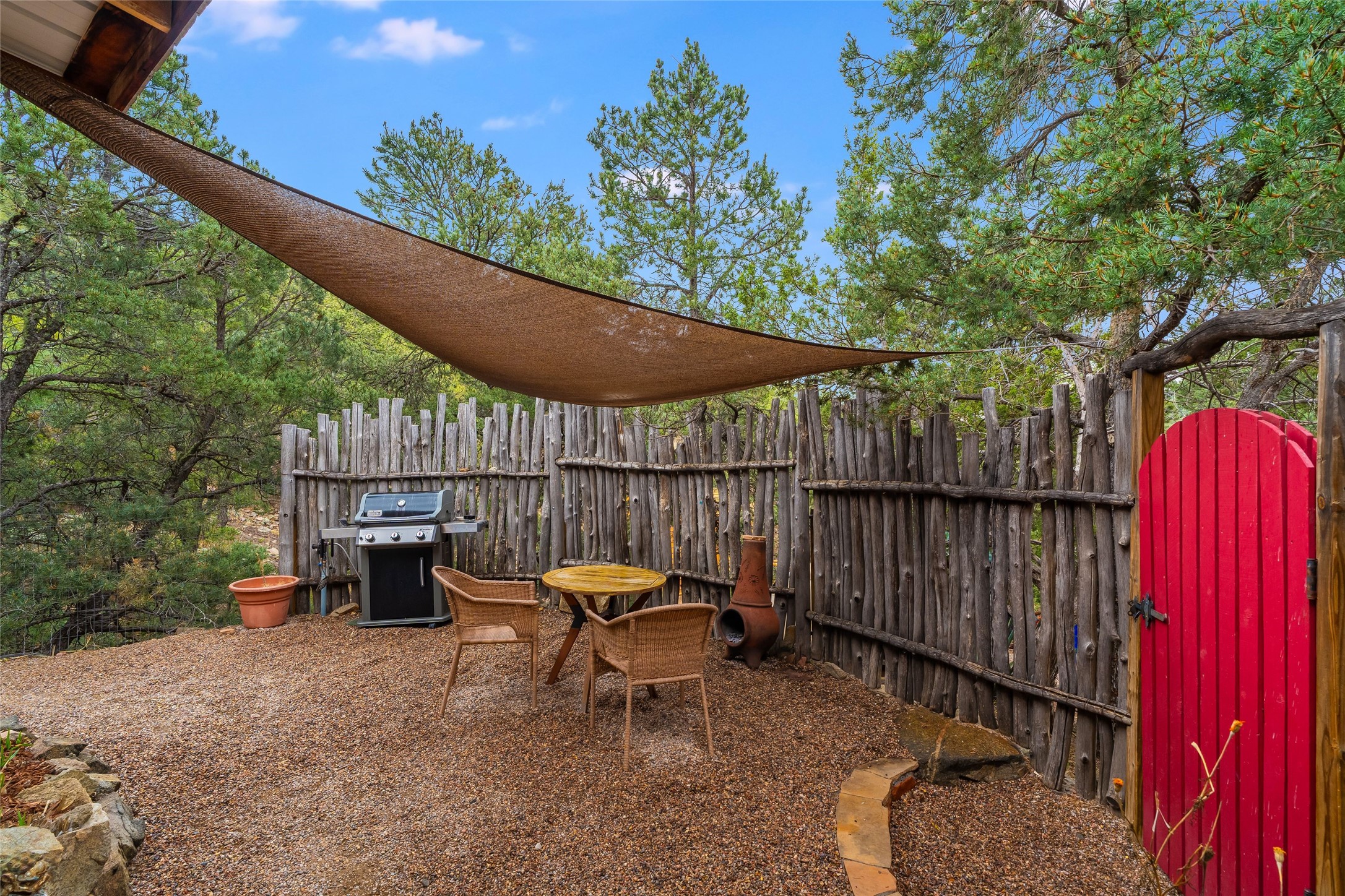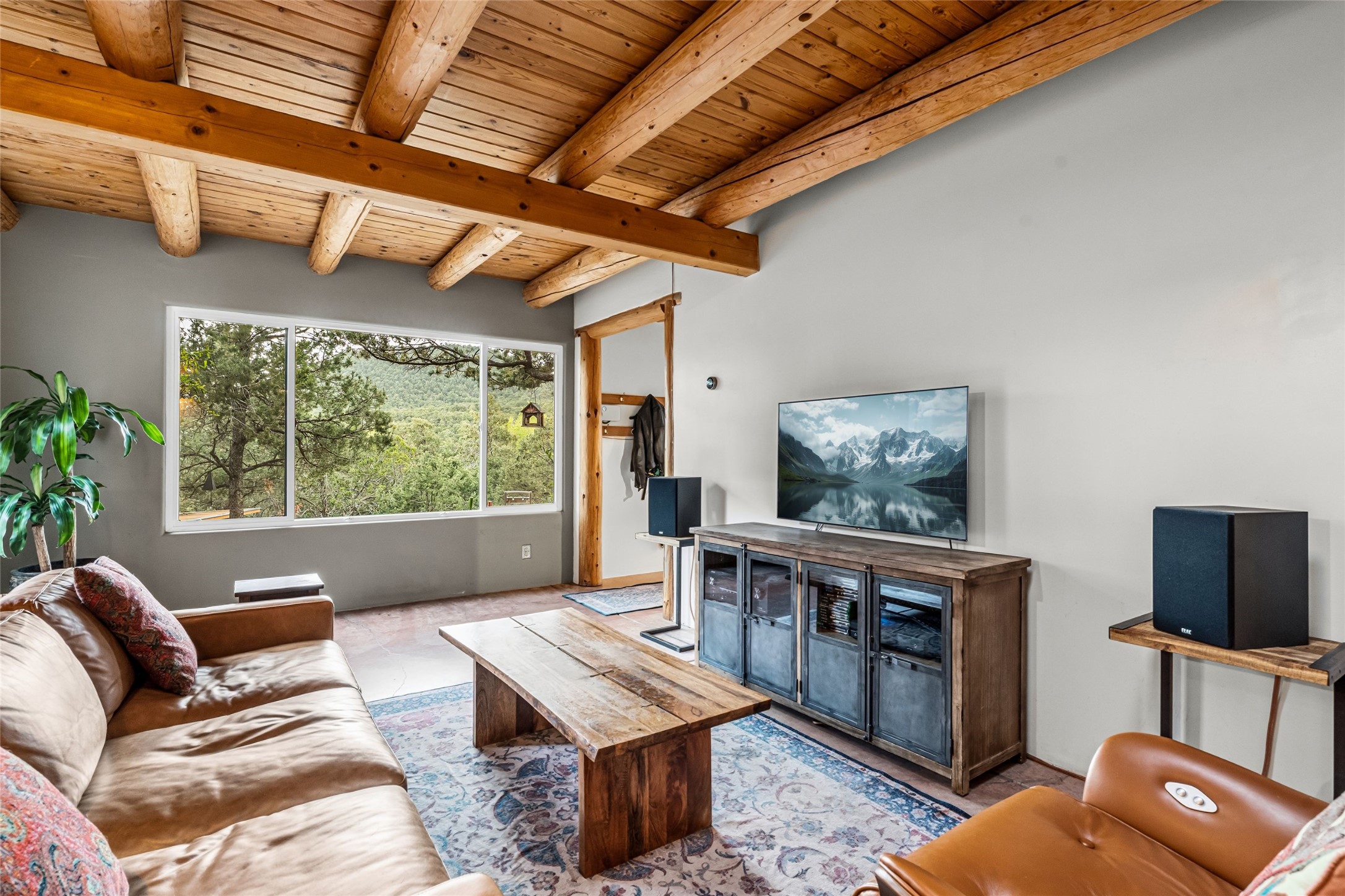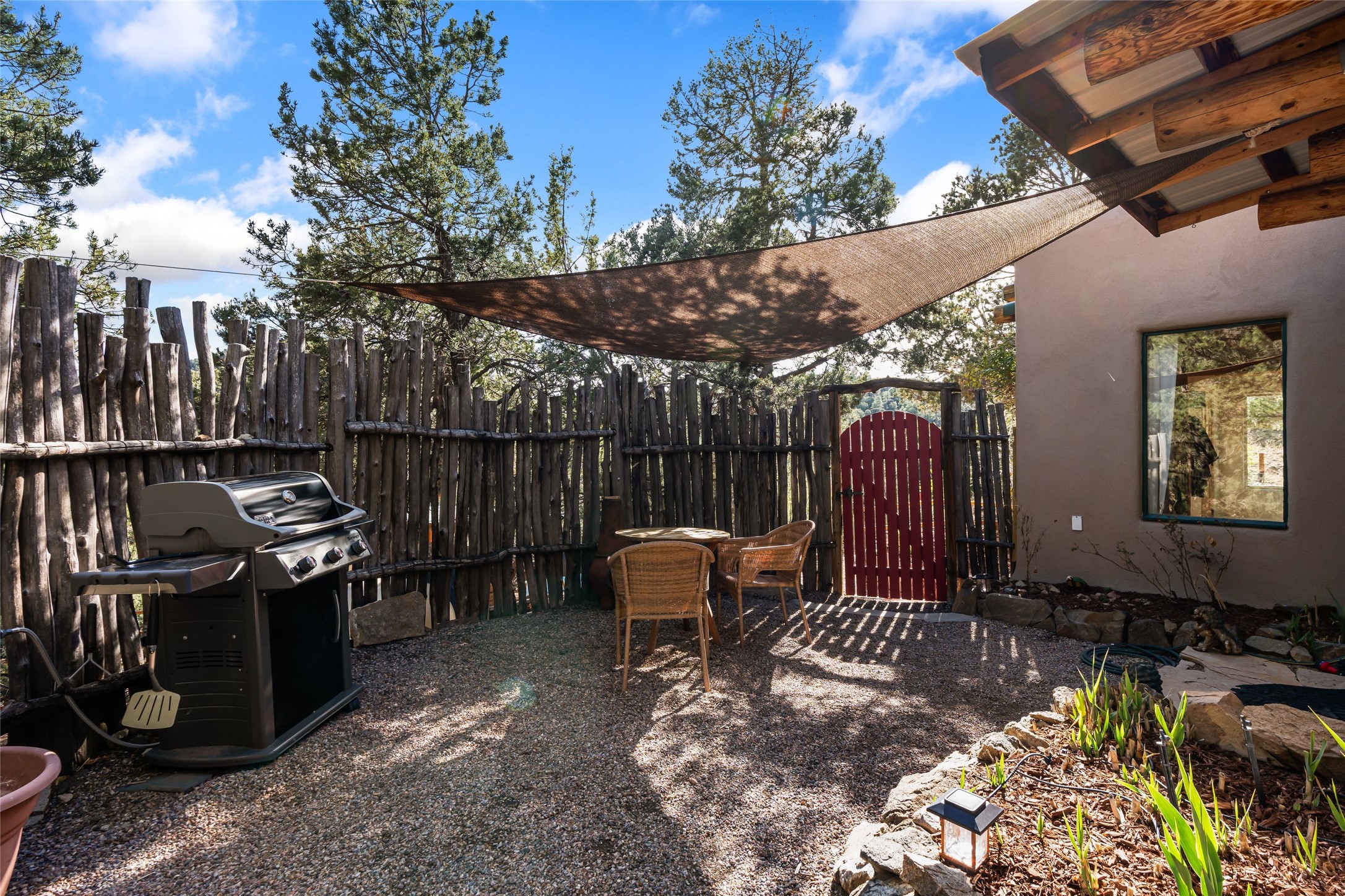 Fairy tale setting for this much loved home tucked into the woods AND offering exceptionally beautiful panoramic long views. Gorgeous wall of sophisticated rock work and beautifully maintained gardens welcome you. This home is a warm, traditional, updated and upbeat treasure. The home is two story with an expansive mountain view from the living room which offers traditional vigas and a wood burning fireplace and opens into the dining area and kitchen for an open concept with a walled courtyard easily accessible from dining/kitchen area. Lower level has one bedroom, full bath, living room,kitchen,dining room,walled courtyard. Upstairs has 2 bedrooms with 3/4 bath and second story has accessibility to a created exterior ground level sitting area with big views. Main bedroom offers a fireplace, expansive closet and walled exterior deck with inspiring mountain views. Drip system in place. Septic system in 2016. Nest system operating home functions including drip system. Over the recent years, the owners have updated appliances, replaced windows/doors, maintained roof, created level useable exterior areas, and completed new stucco in 2025. There is a storage shed for odds and ends. No garage. The property has street facing automatic gate for privacy. One acre with a private well. 5 miles from Zia Road. We welcome you to come visit!