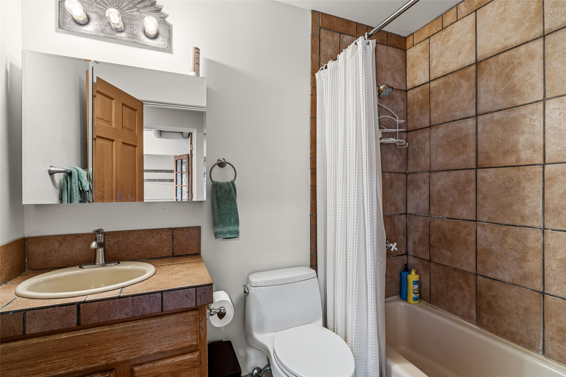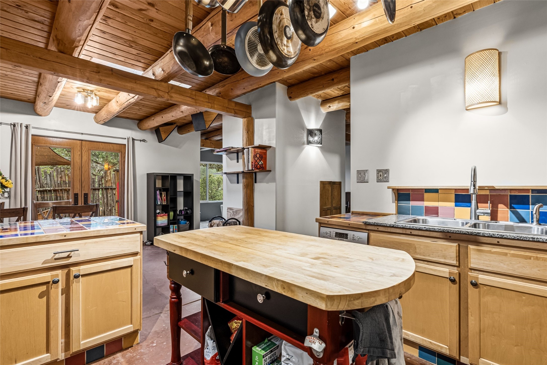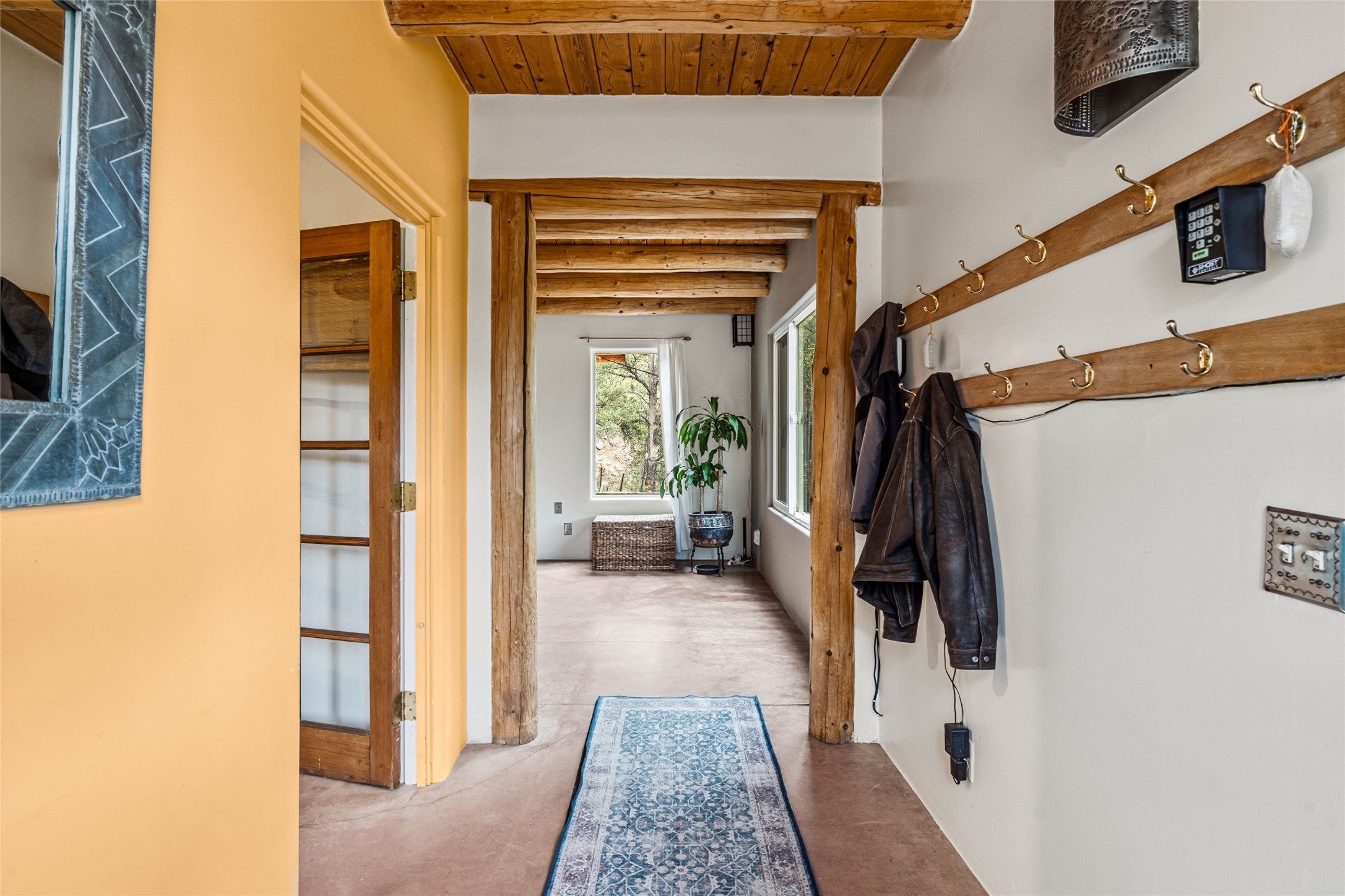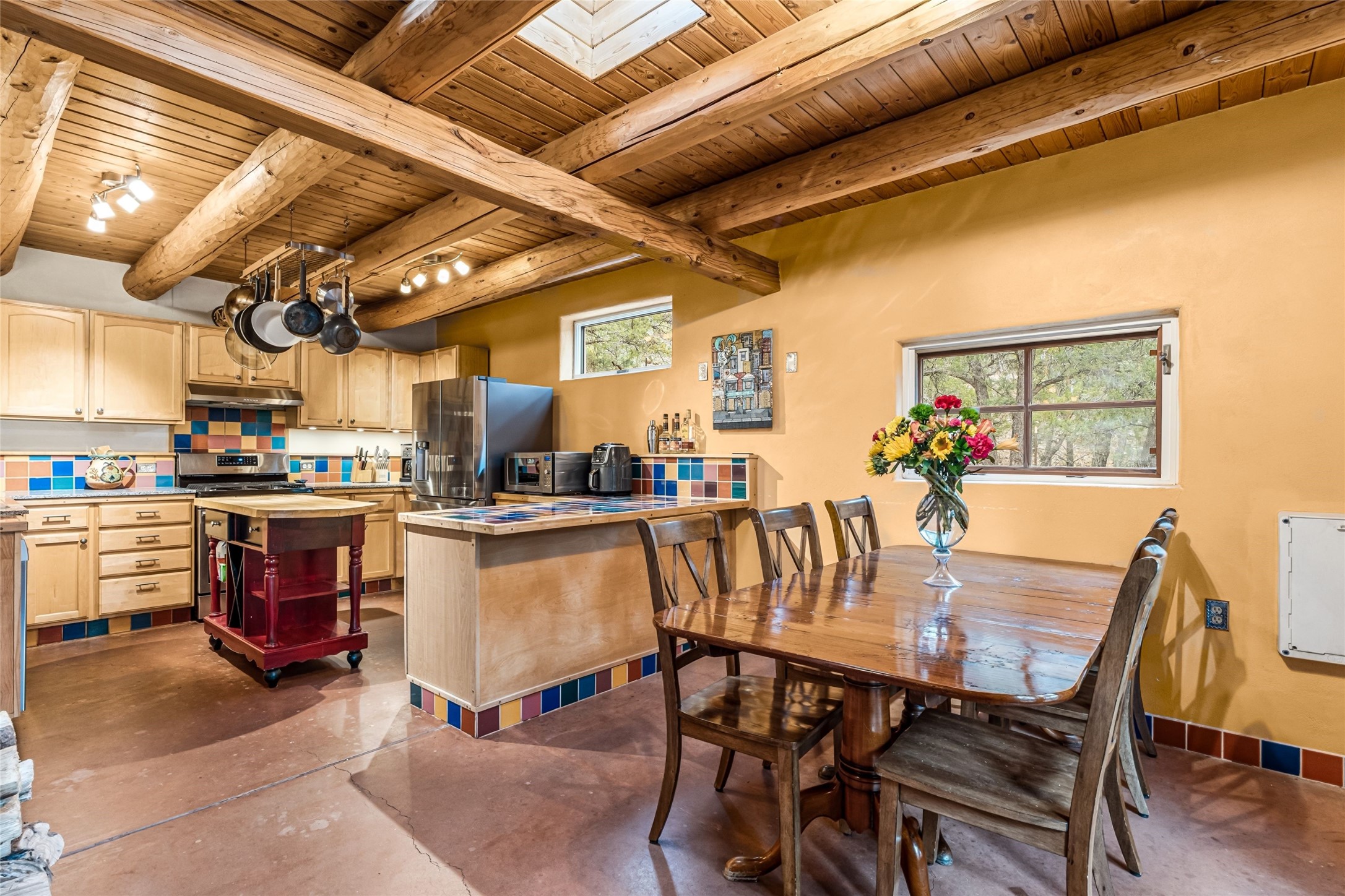 Fairy tale setting for this much loved home tucked into the woods AND offering exceptionally beautiful panoramic long views. Gorgeous wall of sophisticated rock work and beautifully maintained gardens welcome you. This home is a warm, traditional, updated and upbeat treasure. The home is two story with an expansive mountain view from the living room which offers traditional vigas and a wood burning fireplace and opens into the dining area and kitchen for an open concept with a walled courtyard easily accessible from dining/kitchen area. Lower level has one bedroom, full bath, living room,kitchen,dining room,walled courtyard. Upstairs has 2 bedrooms with 3/4 bath and second story has accessibility to a created exterior ground level sitting area with big views. Main bedroom offers a fireplace, expansive closet and walled exterior deck with inspiring mountain views. Drip system in place. Septic system in 2016. Nest system operating home functions including drip system. Over the recent years, the owners have updated appliances, replaced windows/doors, maintained roof, created level useable exterior areas, and completed new stucco in 2025. There is a storage shed for odds and ends. No garage. The property has street facing automatic gate for privacy. One acre with a private well. 5 miles from Zia Road. We welcome you to come visit!